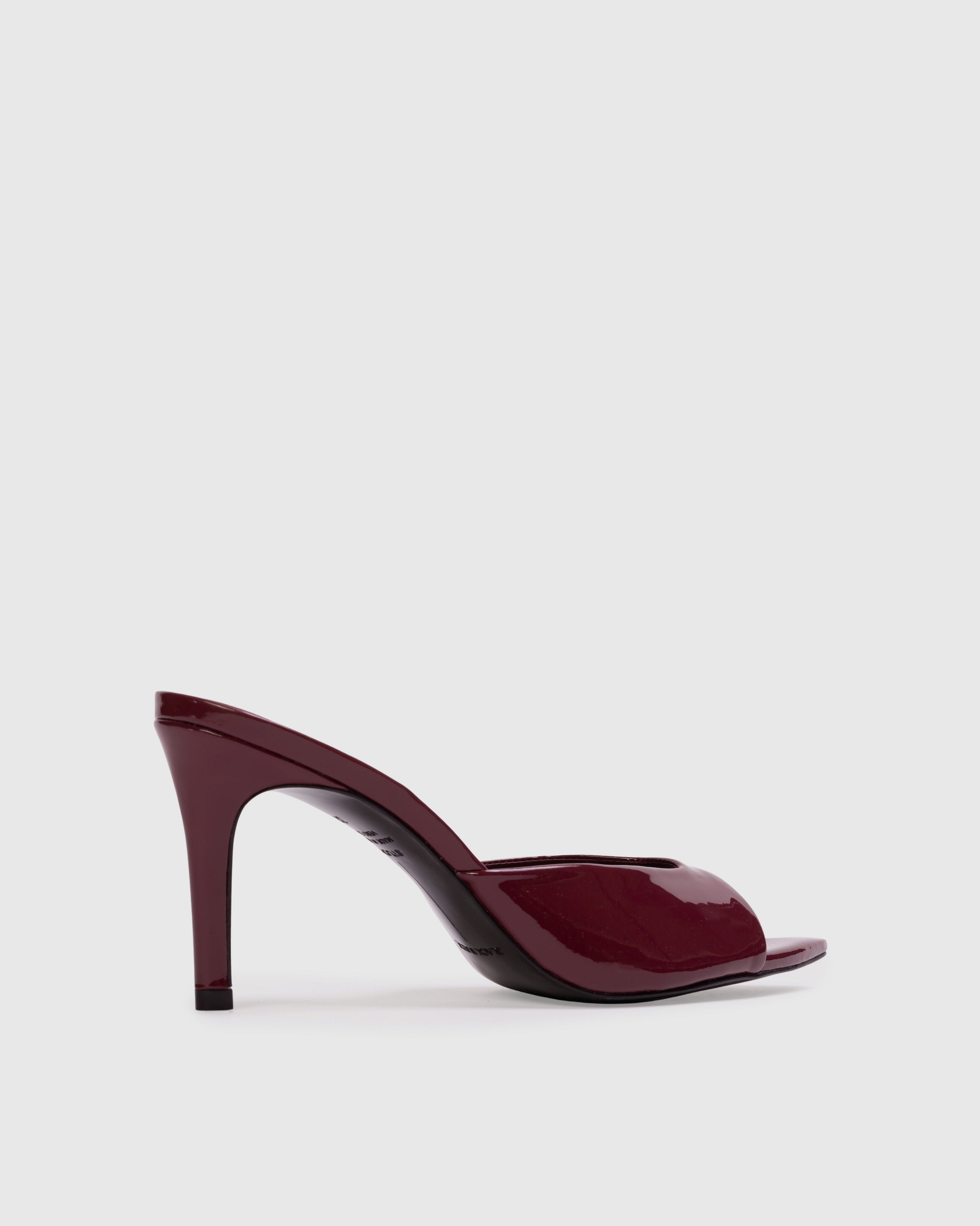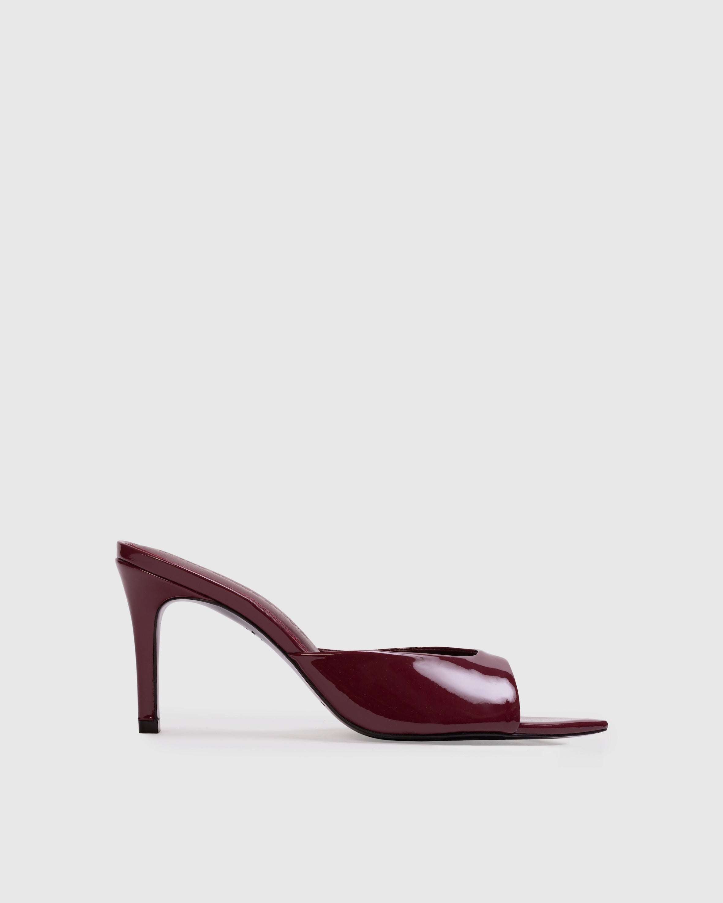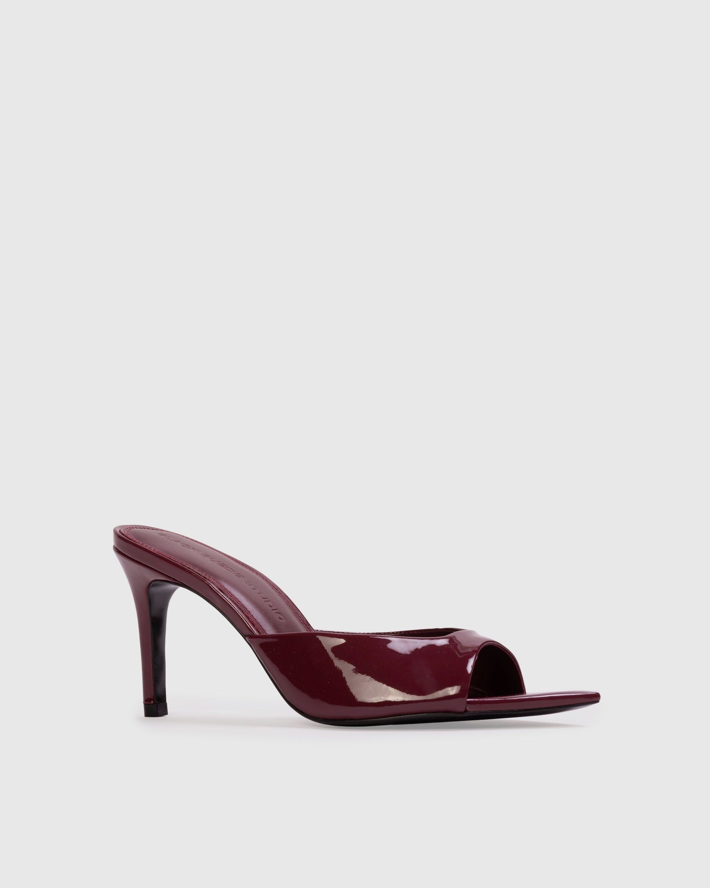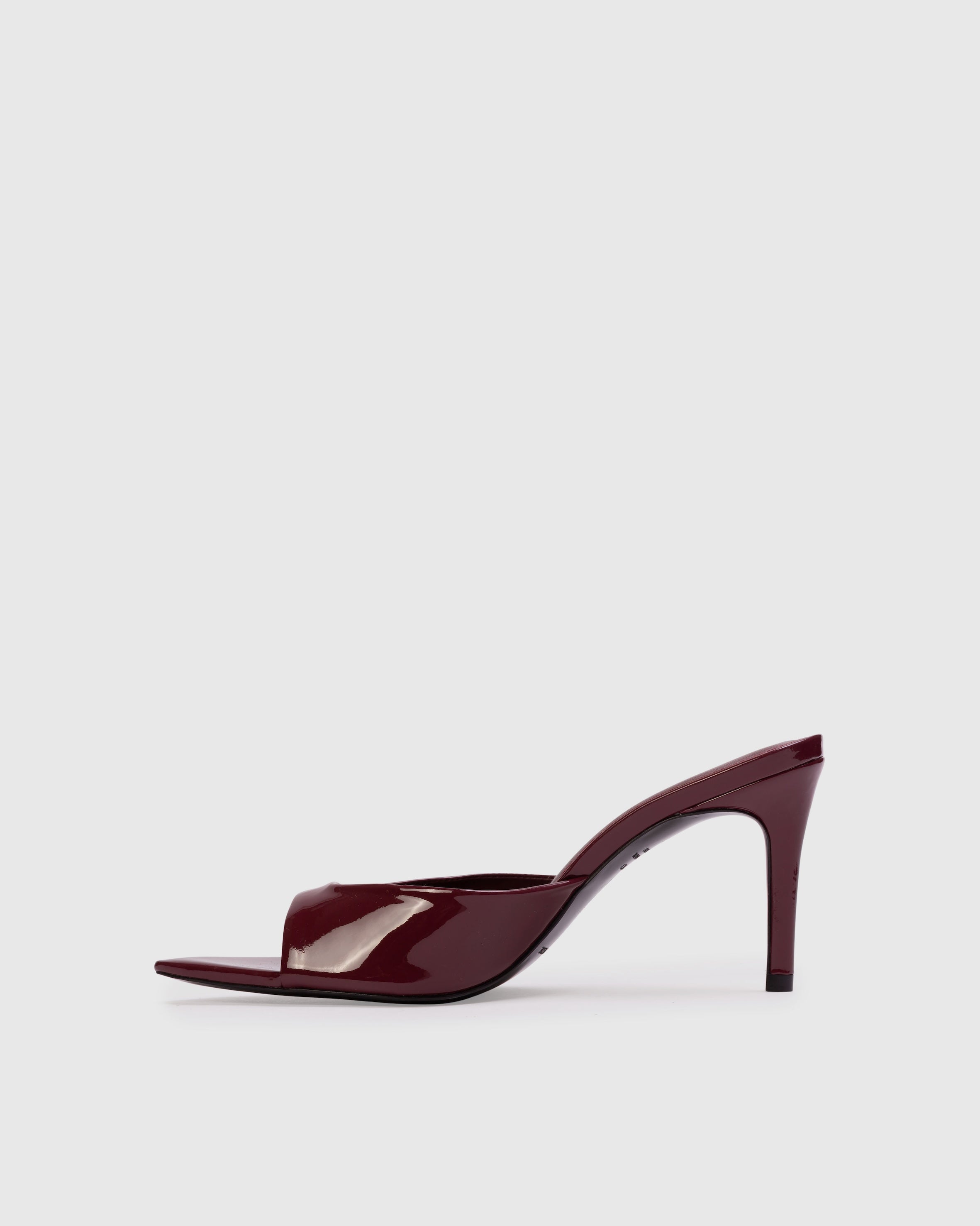 Pointy toe slipper mule, set on a straight high heel. Made with patent finished leather.
