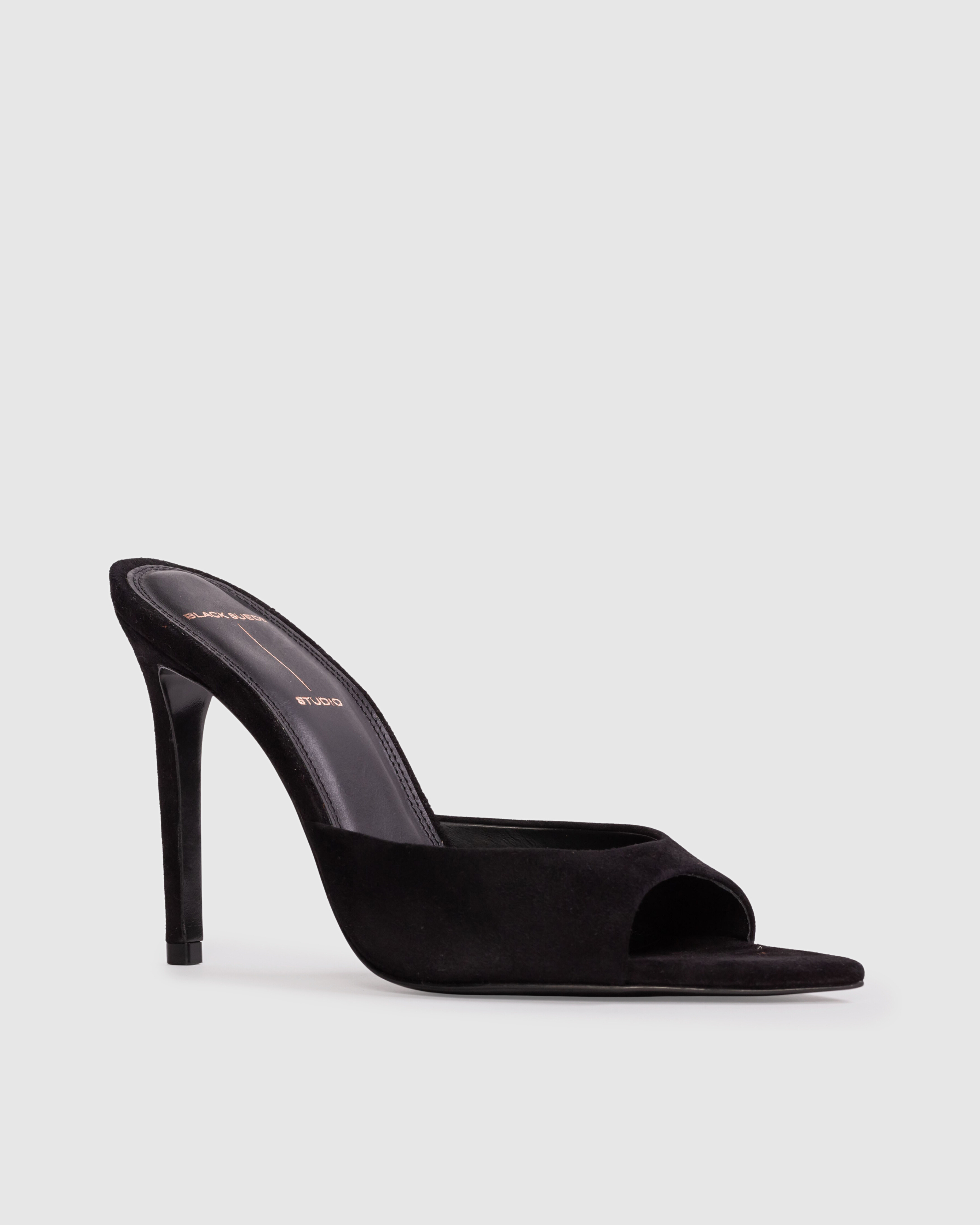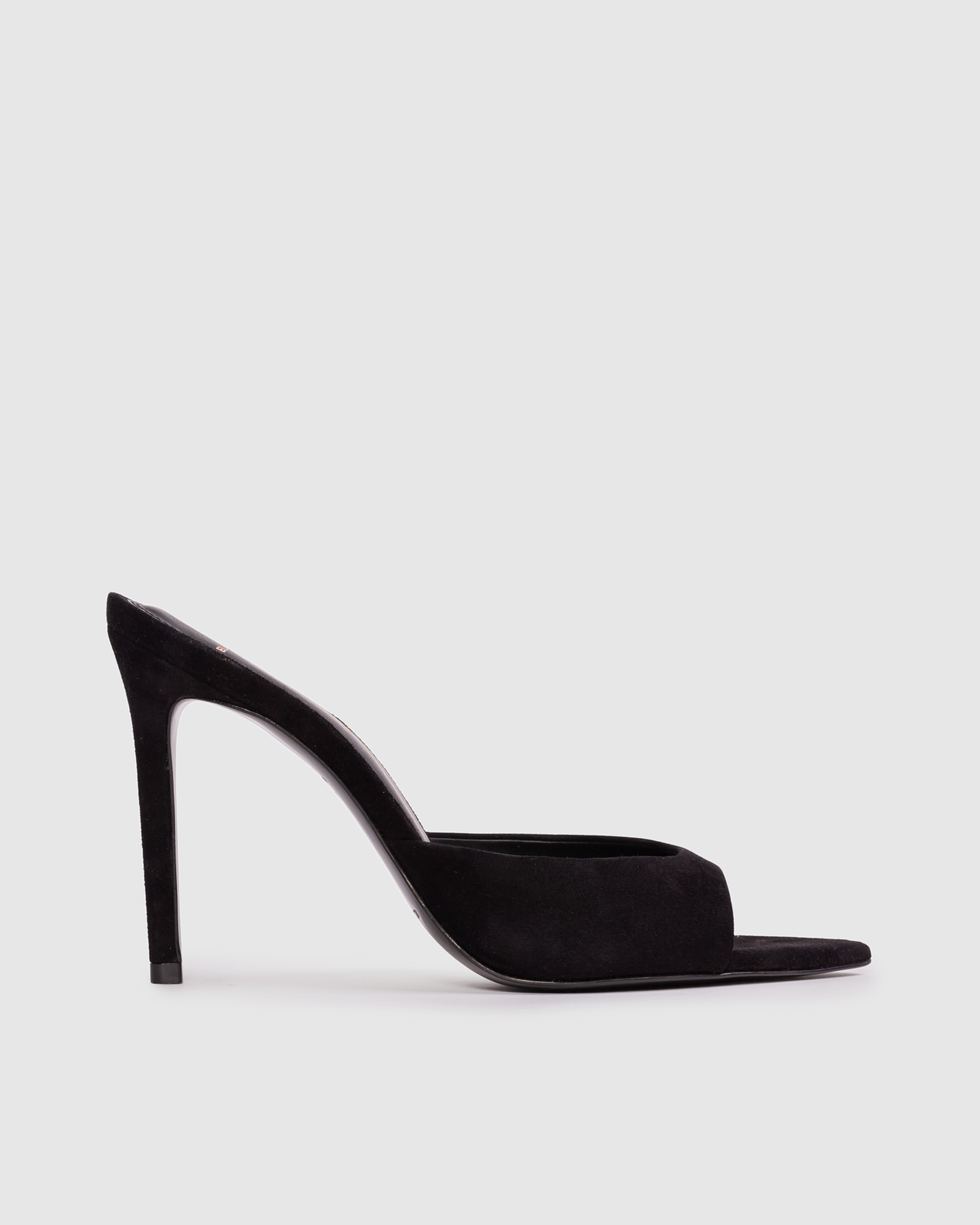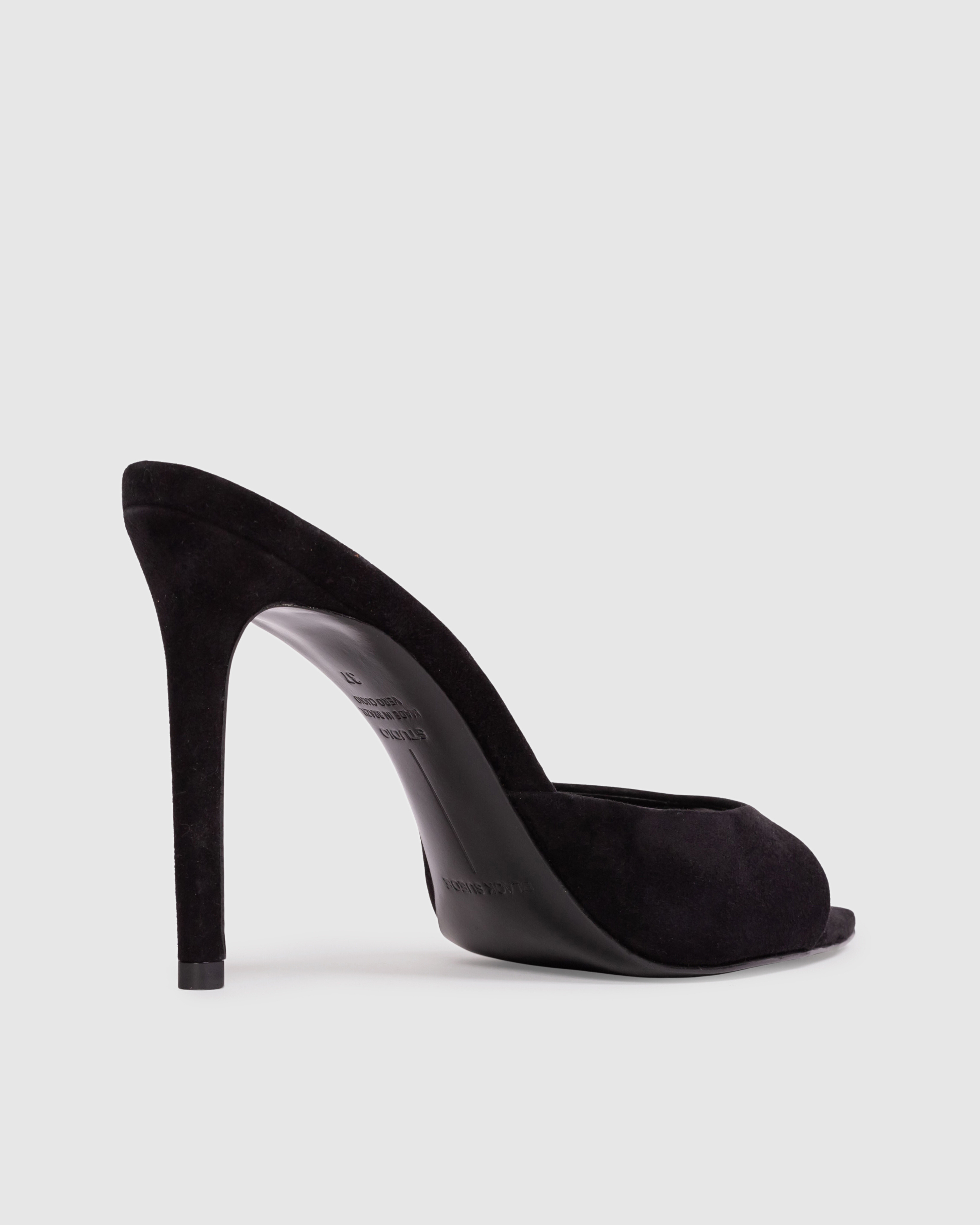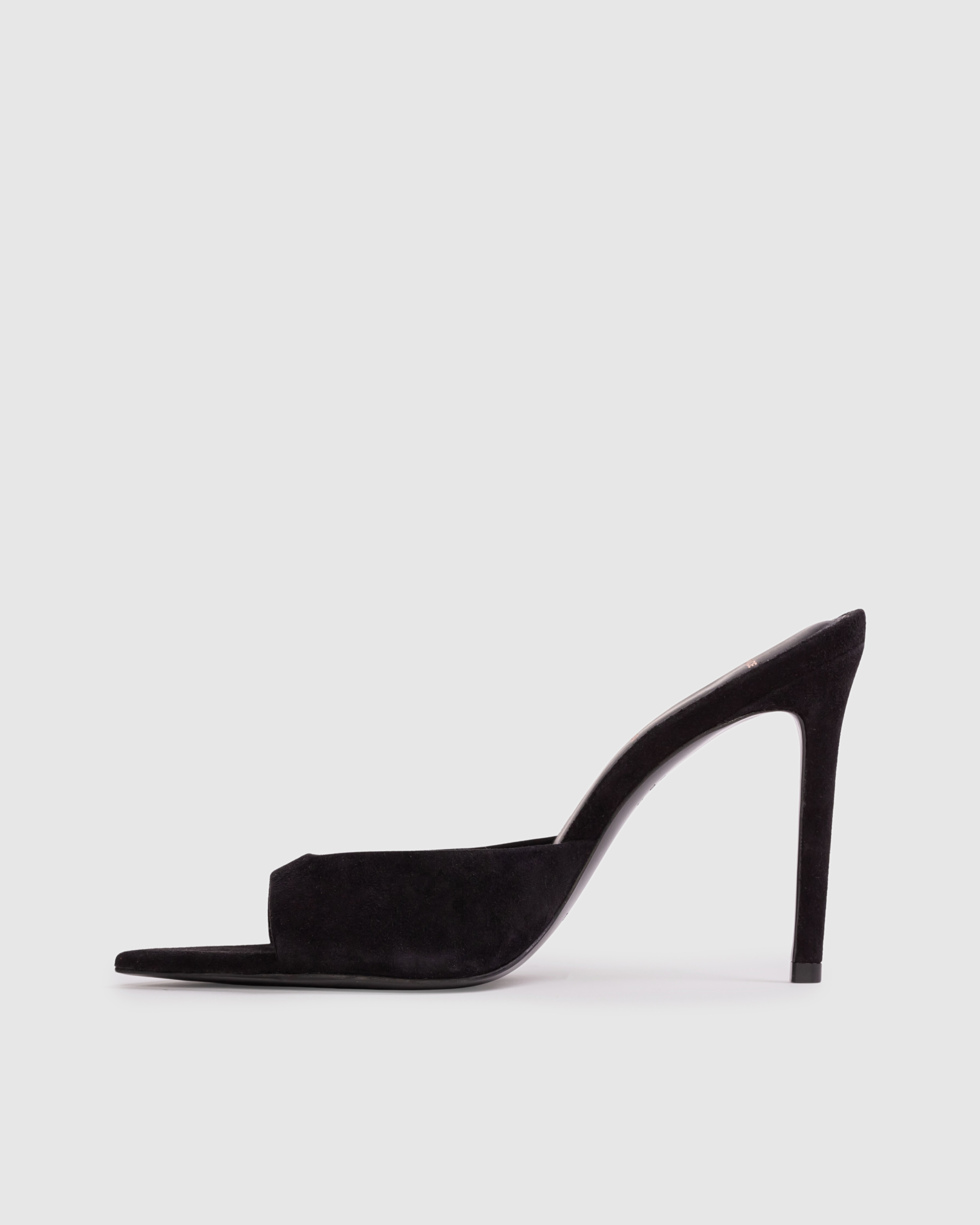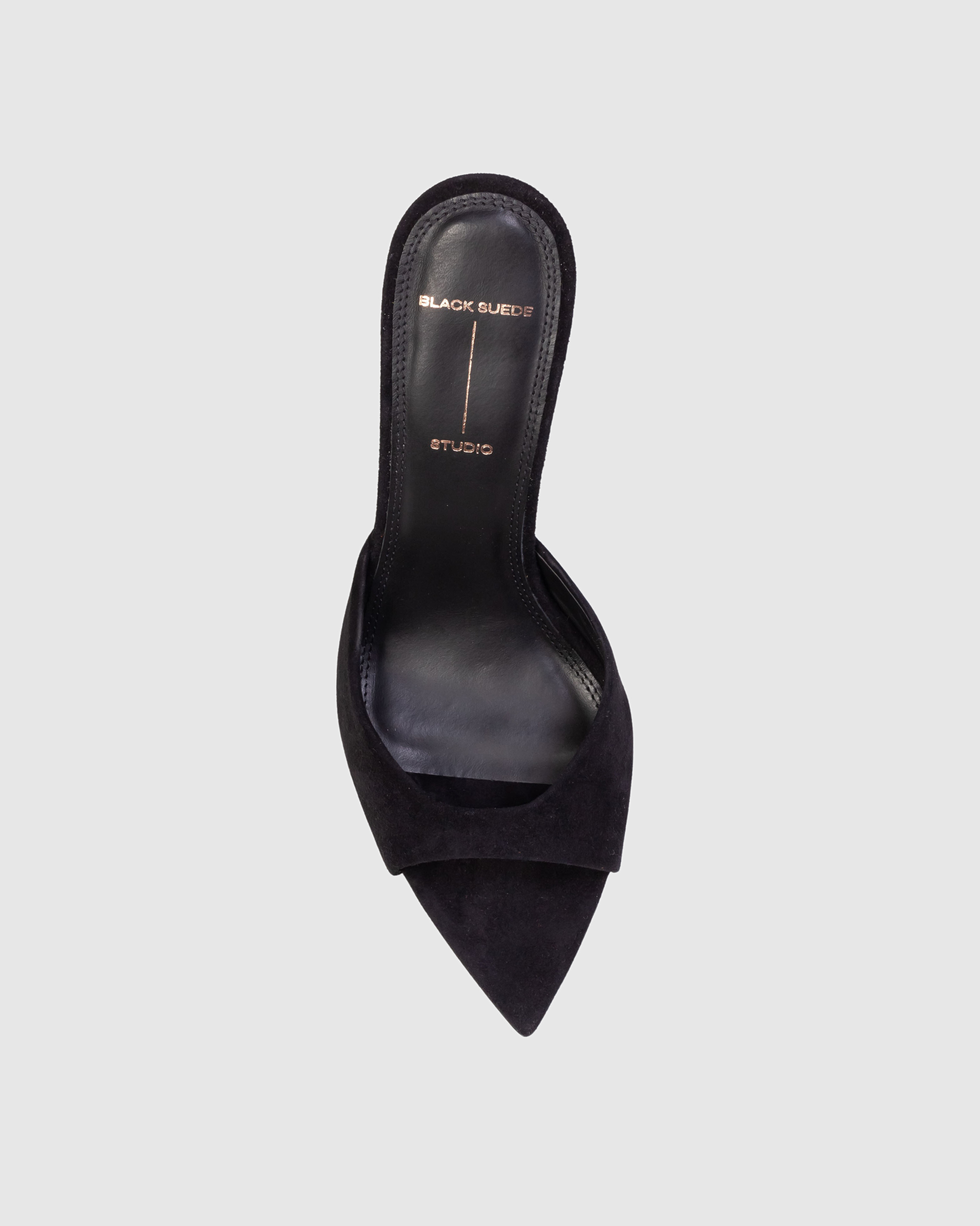 Pointy toe slipper mule, set on a straight stiletto heel. Made with brushed kid suede.