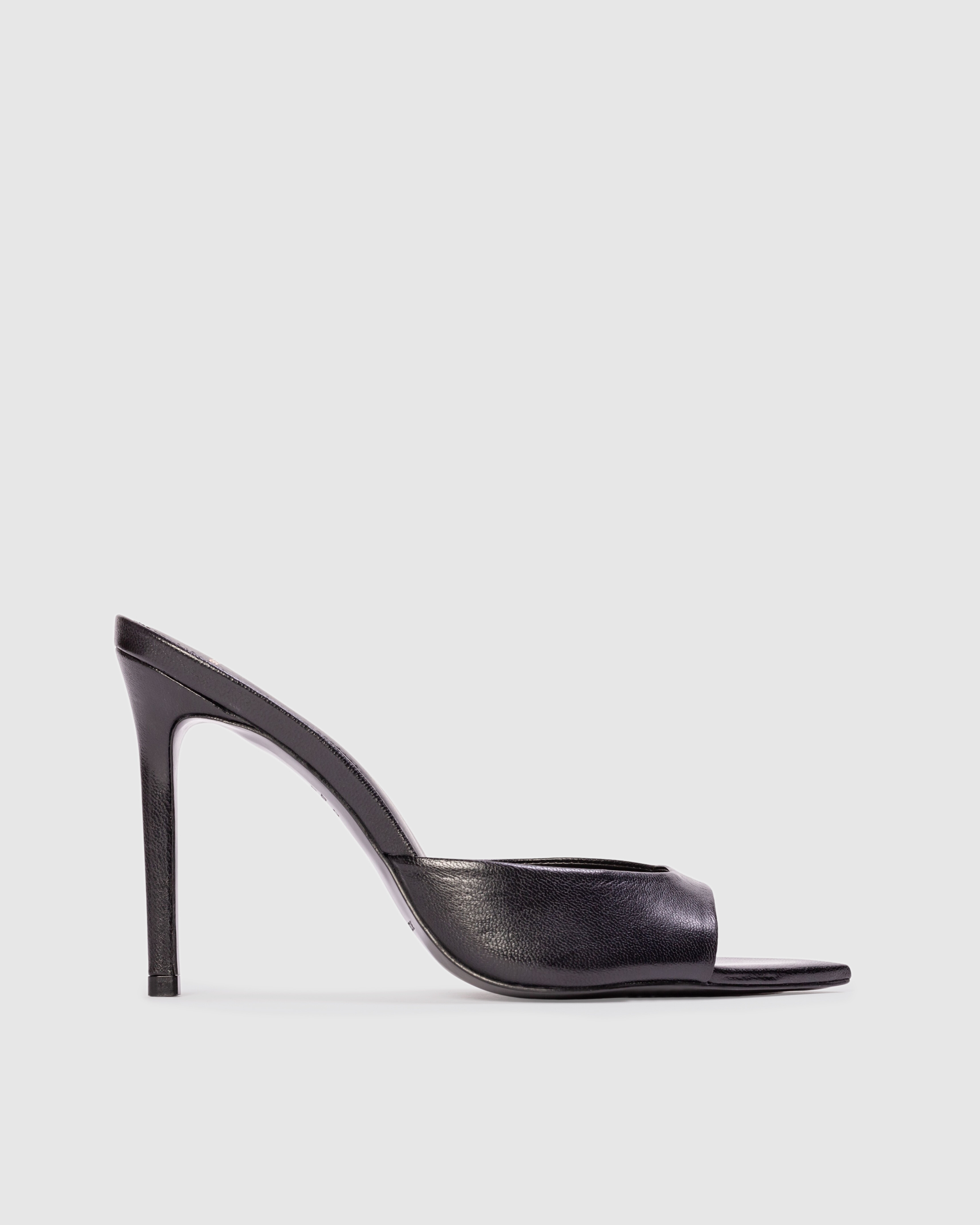 Pointy toe slipper mule, set on a straight stiletto heel. Made with smooth goat leather.