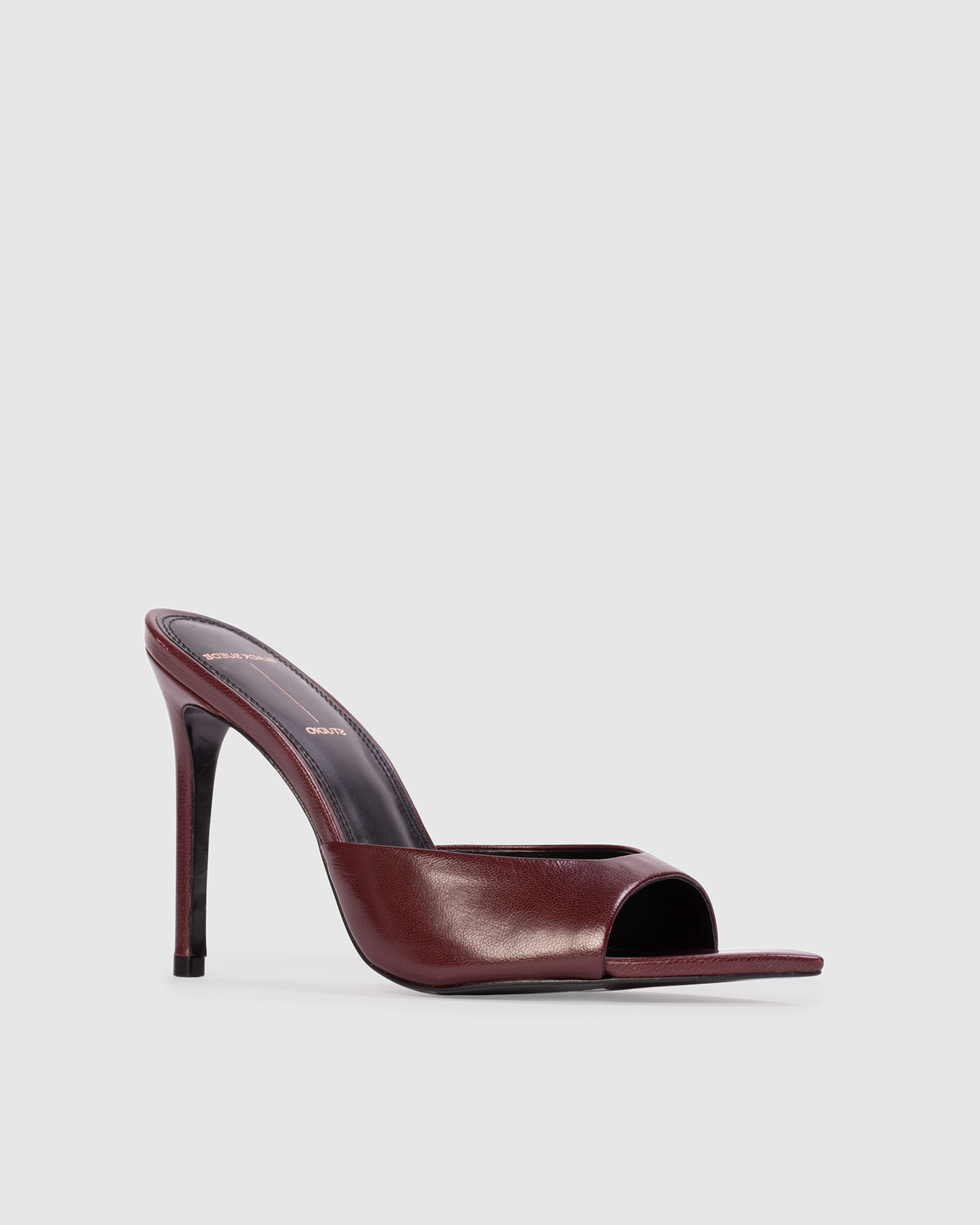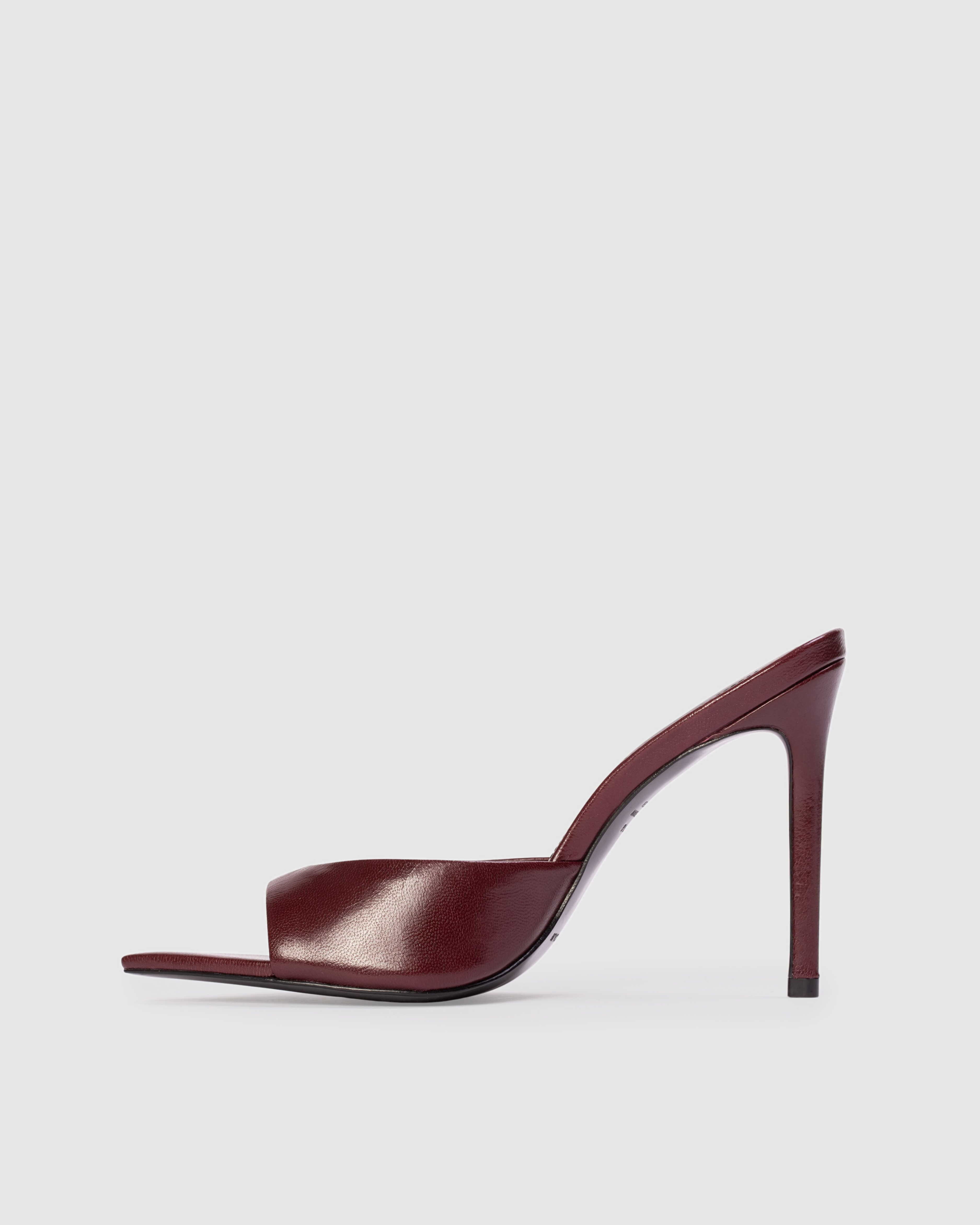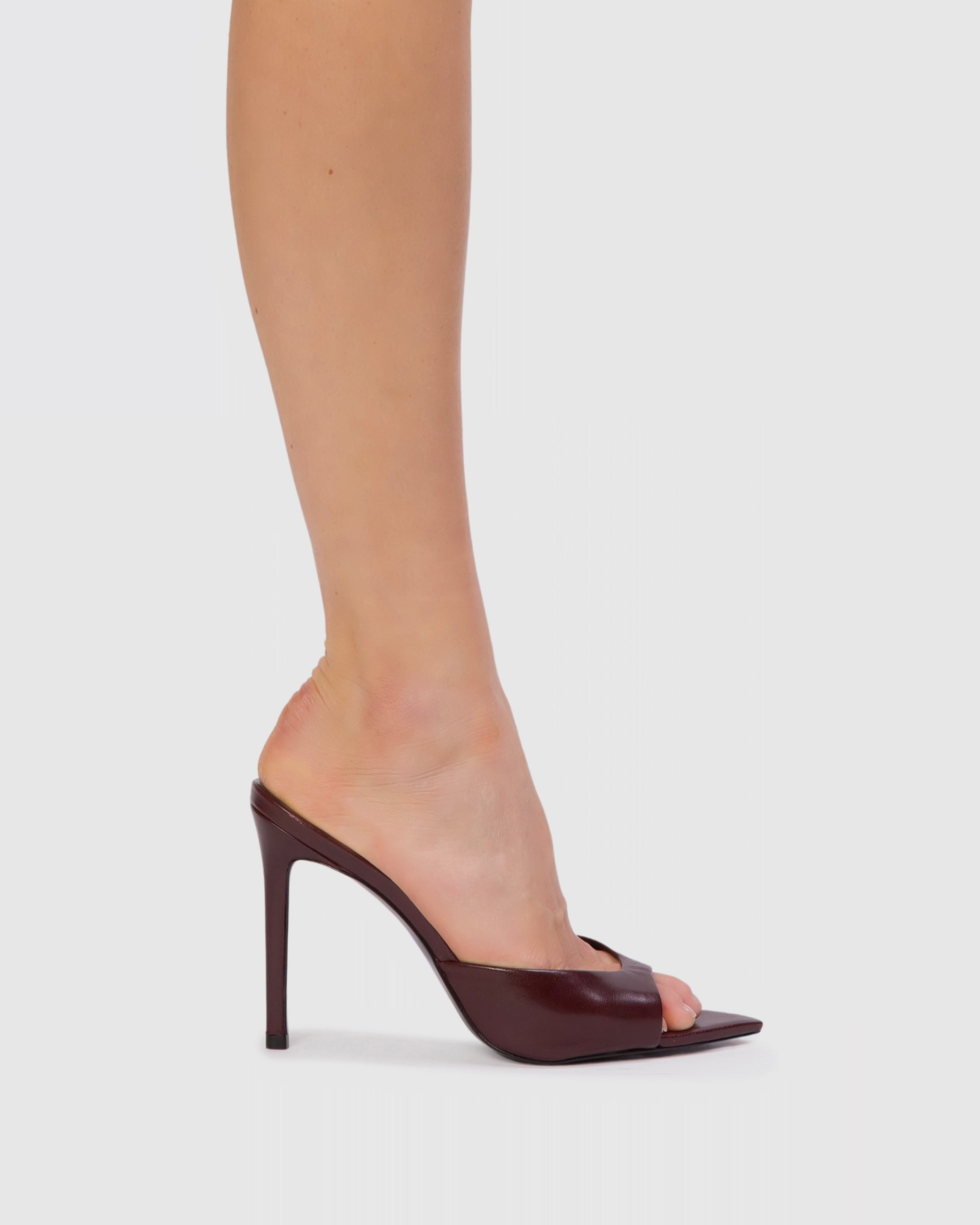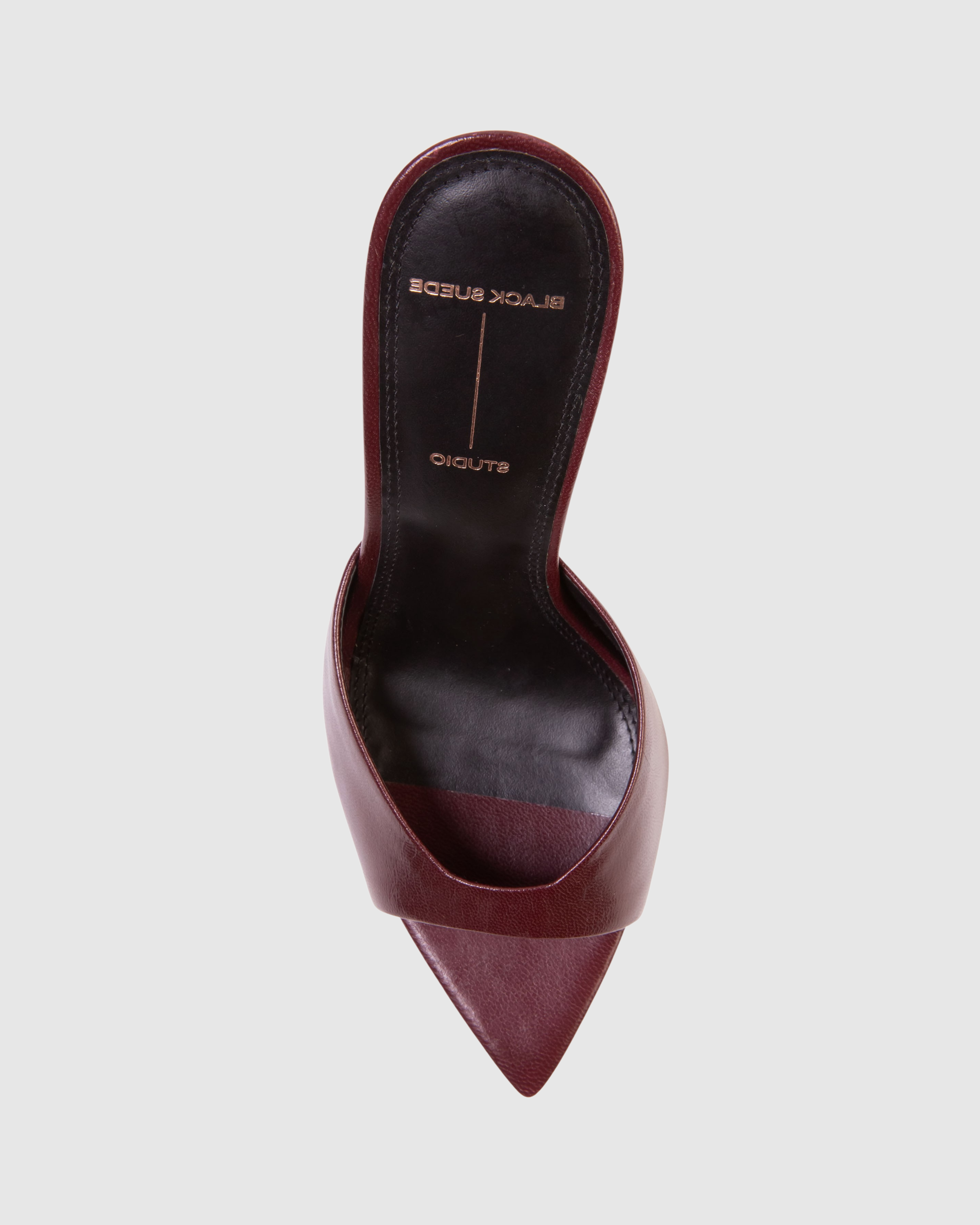 Pointy toe slipper mule, set on a straight stiletto heel. Made with smooth goat leather.