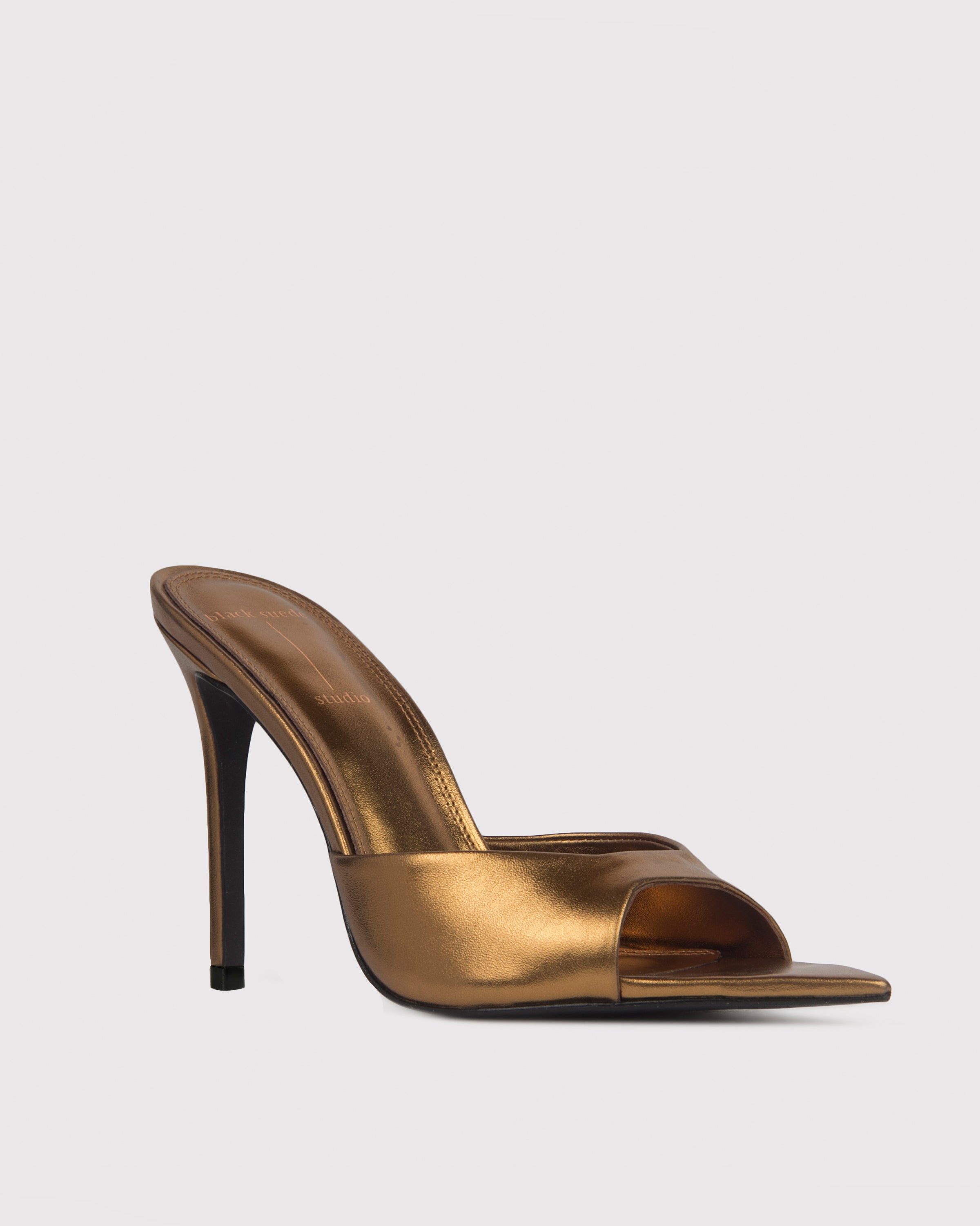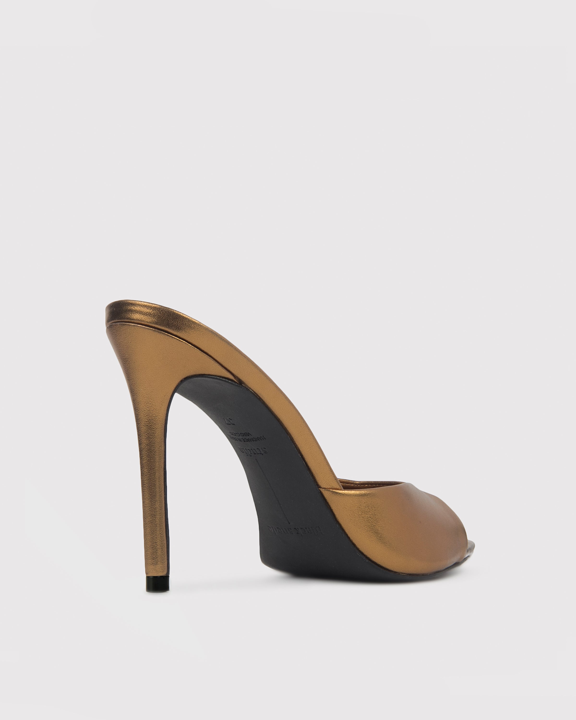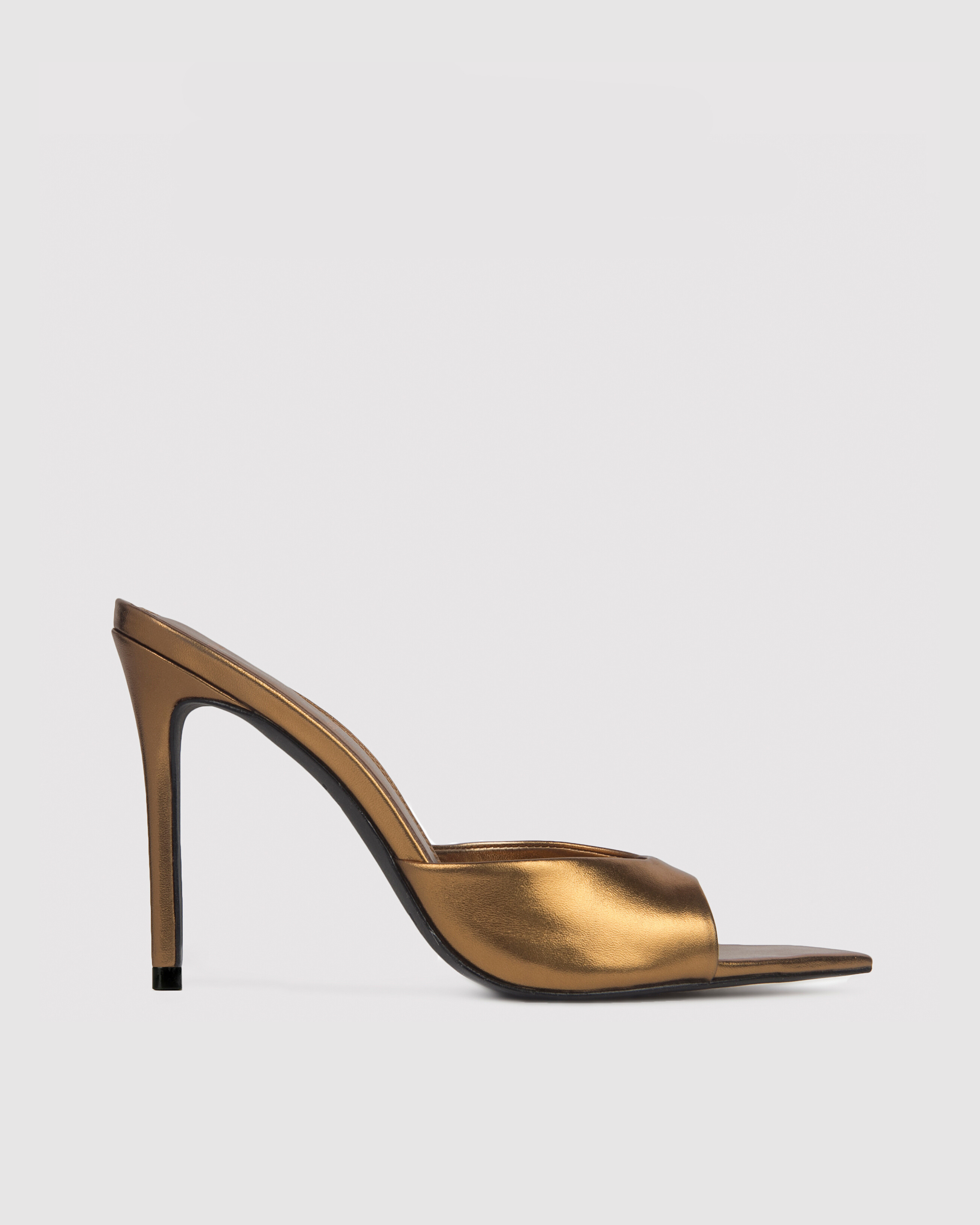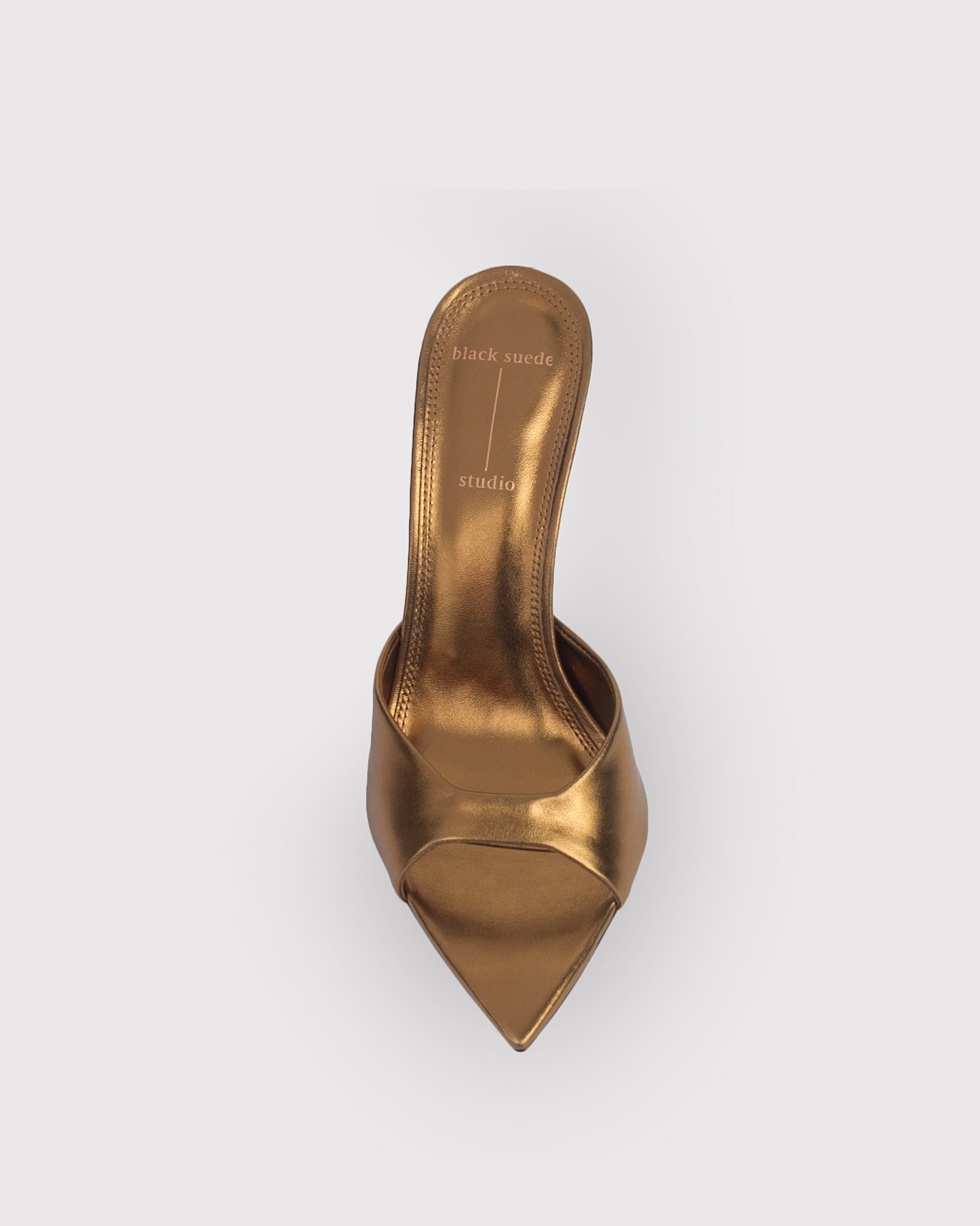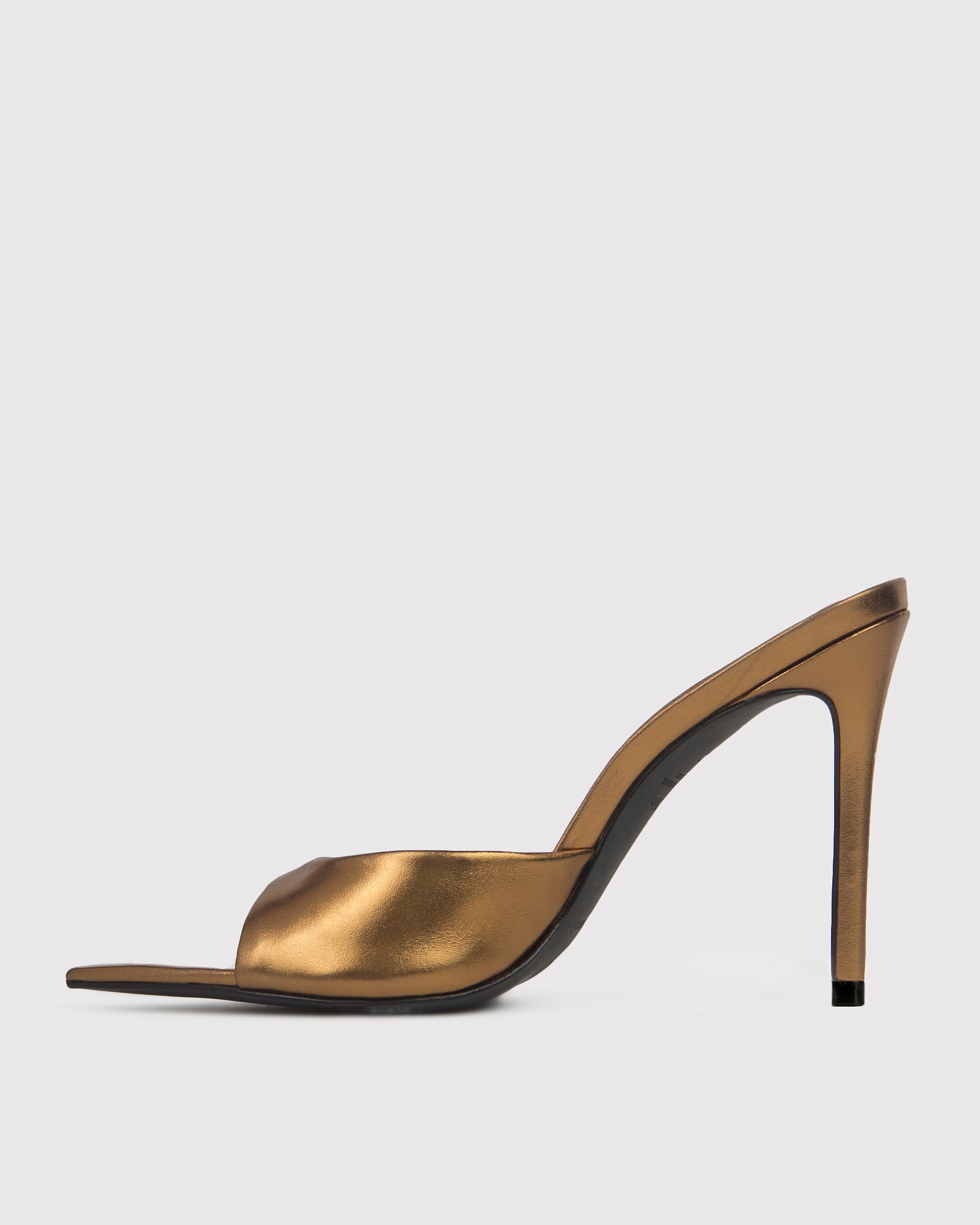 Pointy toe slipper mule, set on a straight stiletto heel. Made with smooth metallic leather.