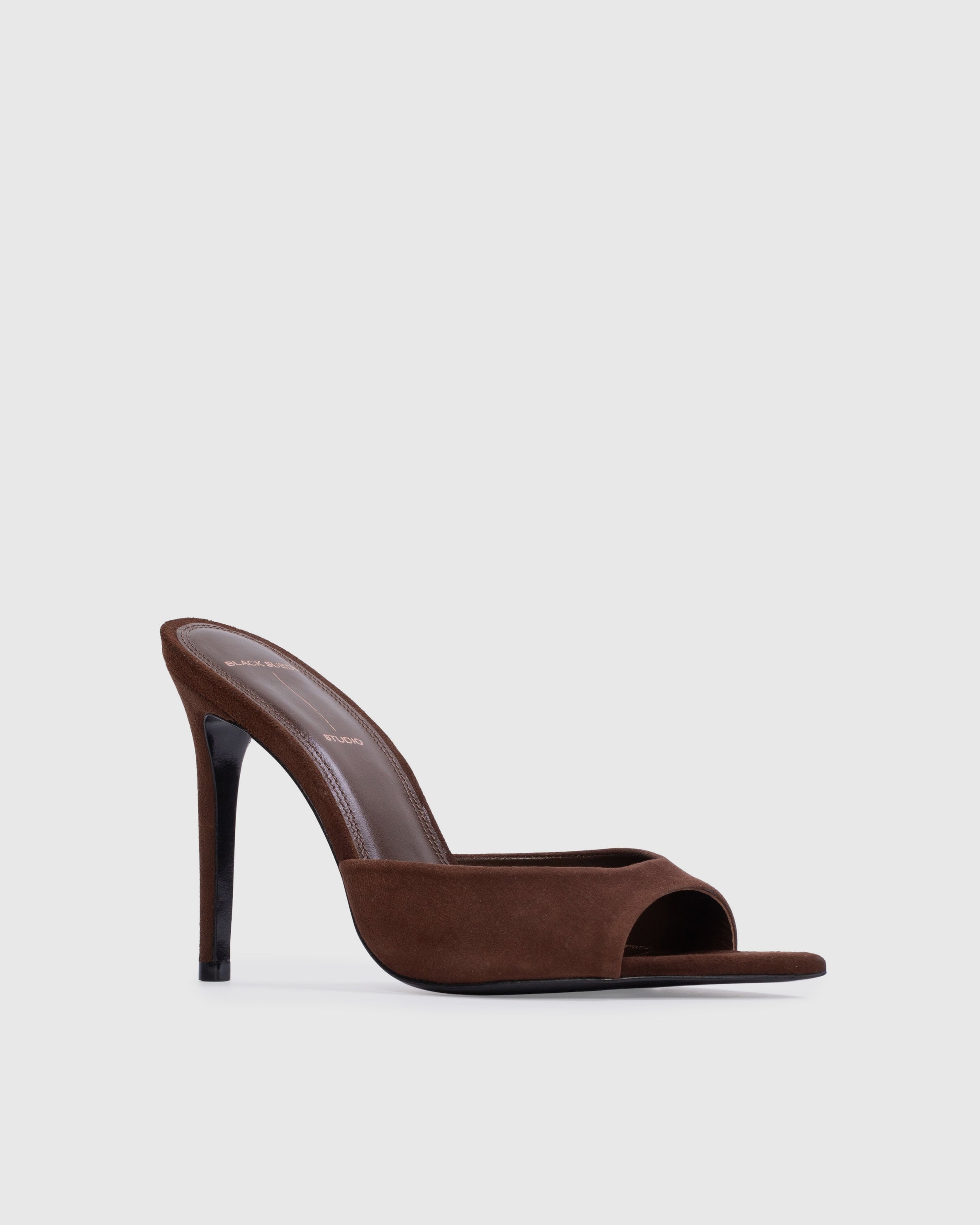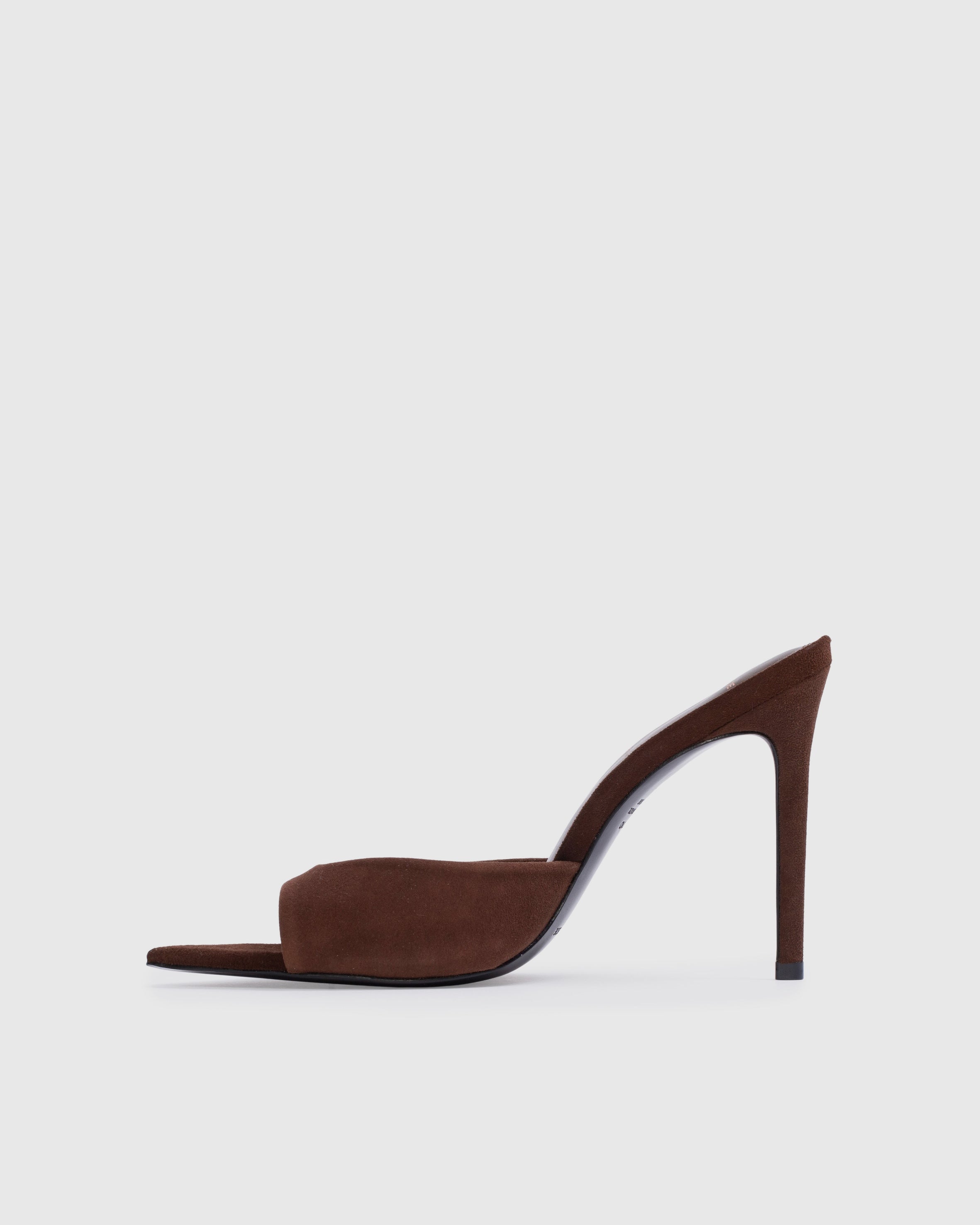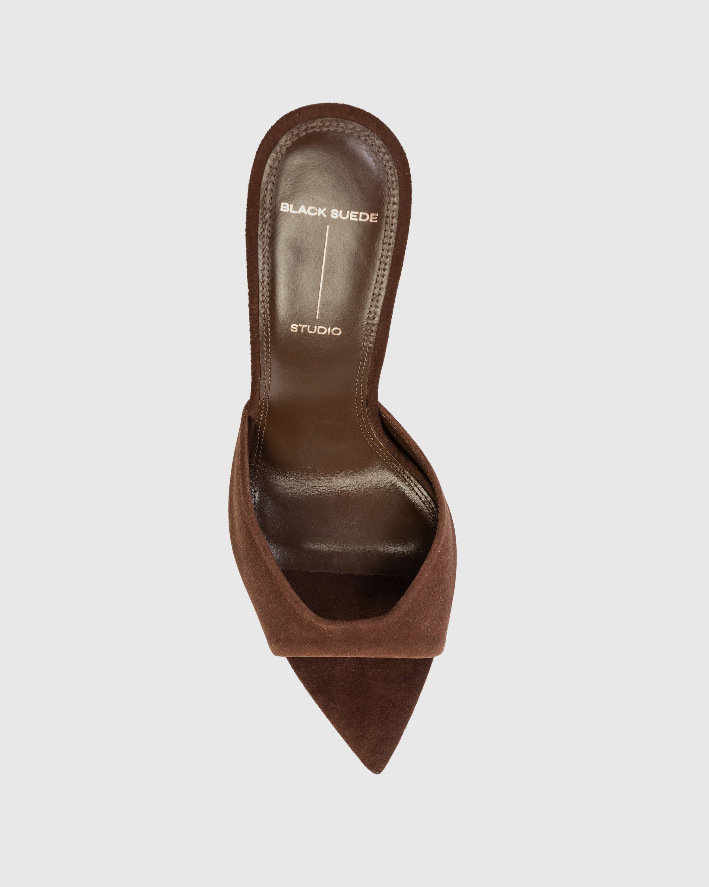 Pointy toe slipper mule, set on a straight stiletto heel. Made with brushed kid suede.