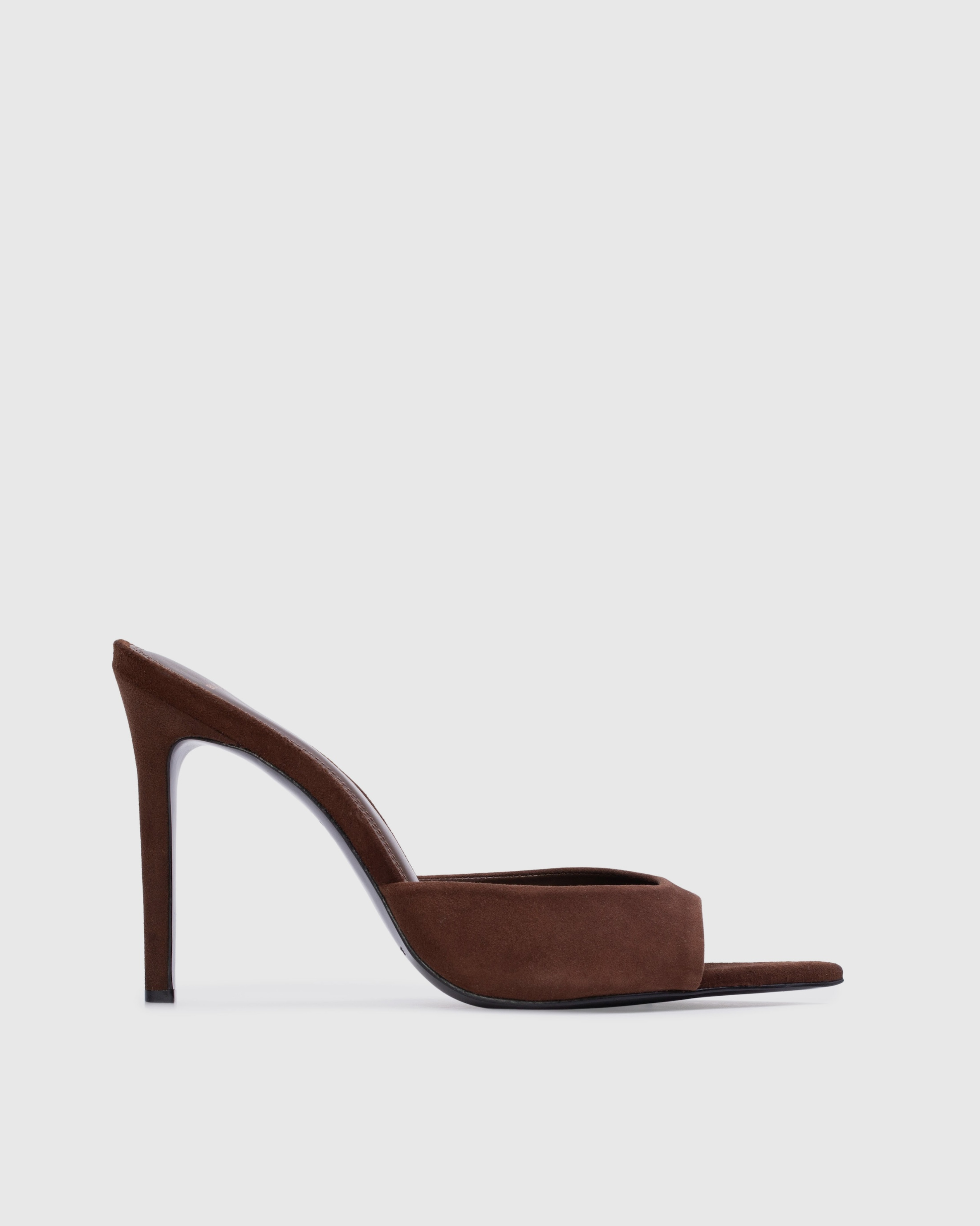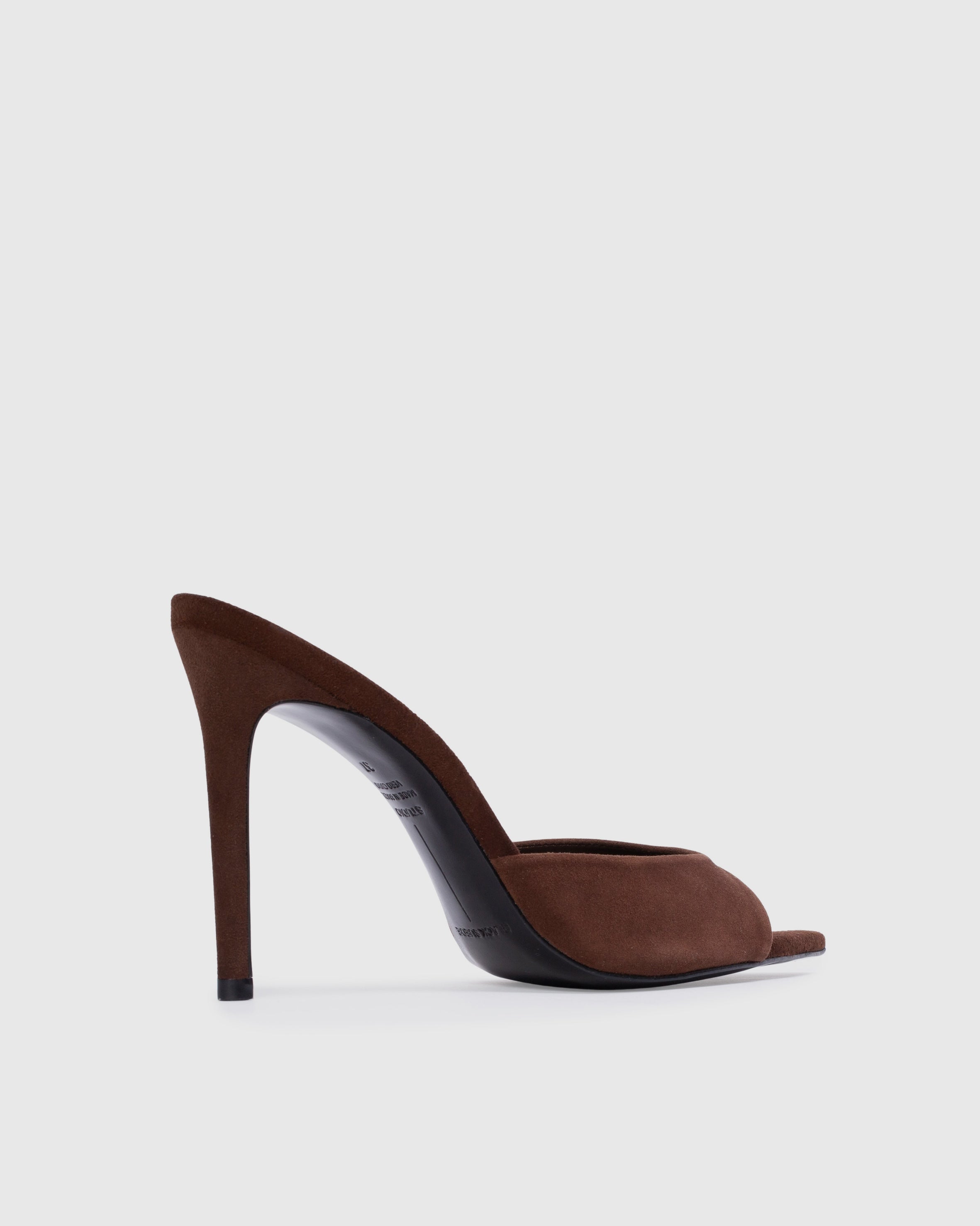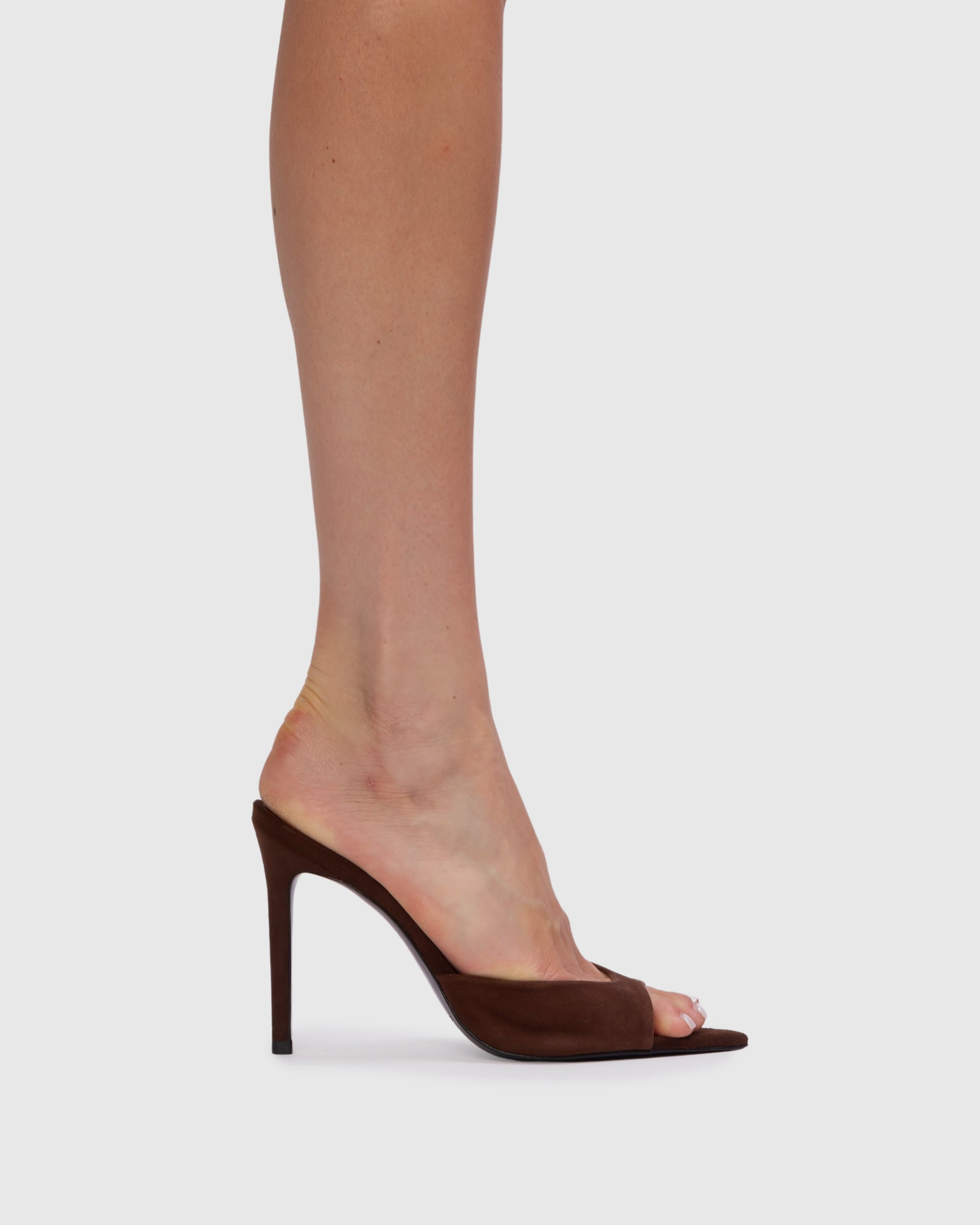 Pointy toe slipper mule, set on a straight stiletto heel. Made with brushed kid suede.