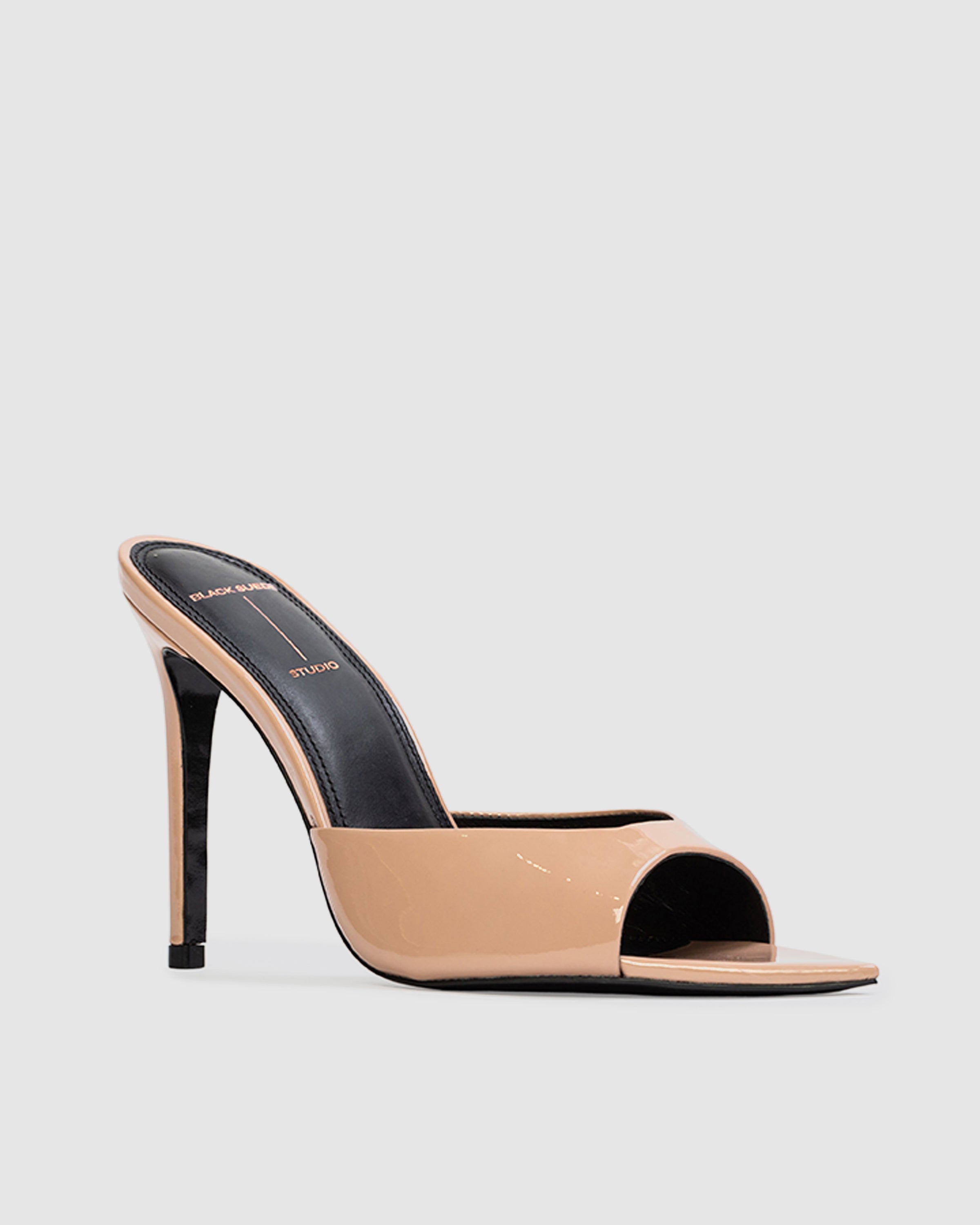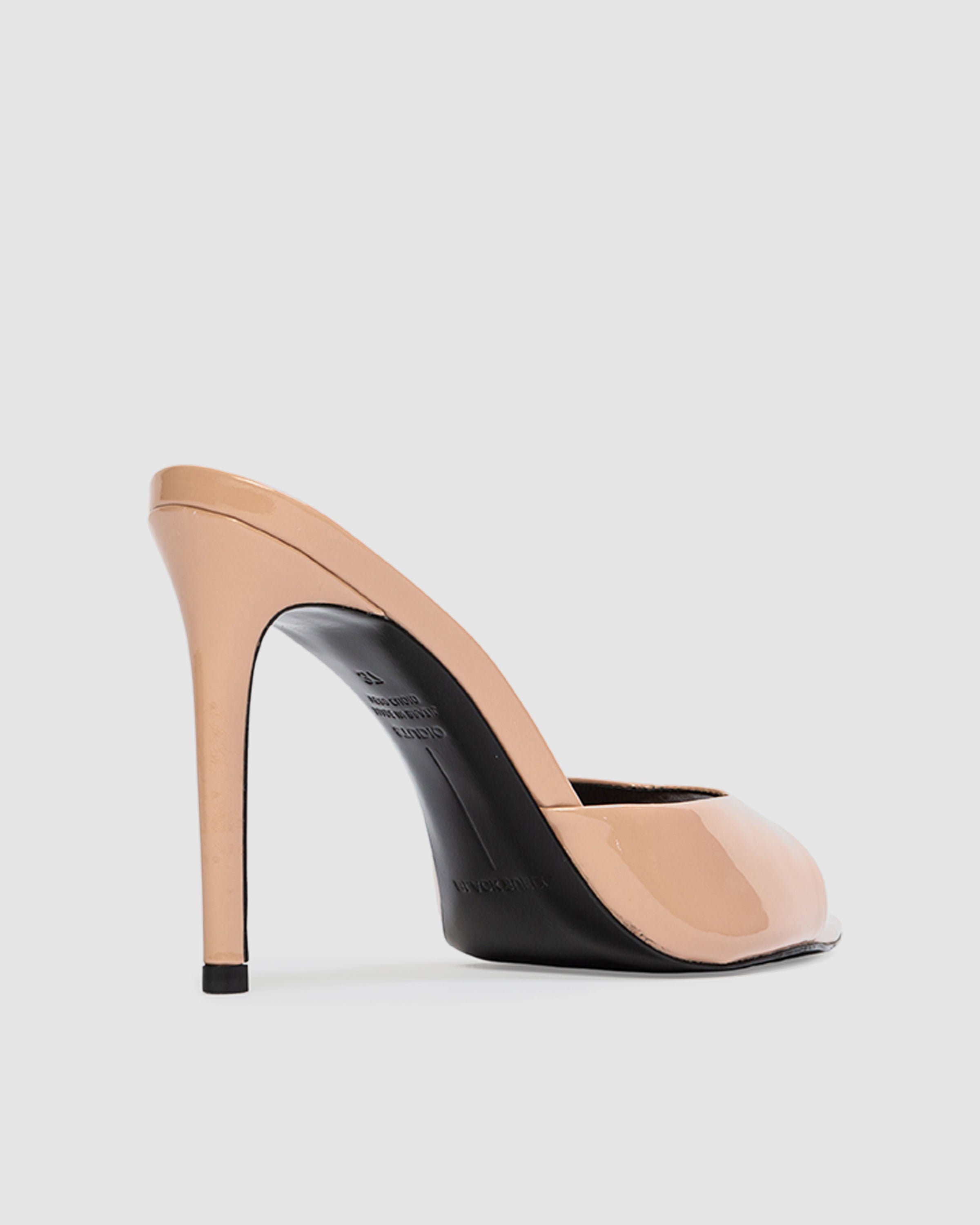 Pointy toe slipper mule, set on a straight stiletto heel. Made with smooth patent finished leather.
