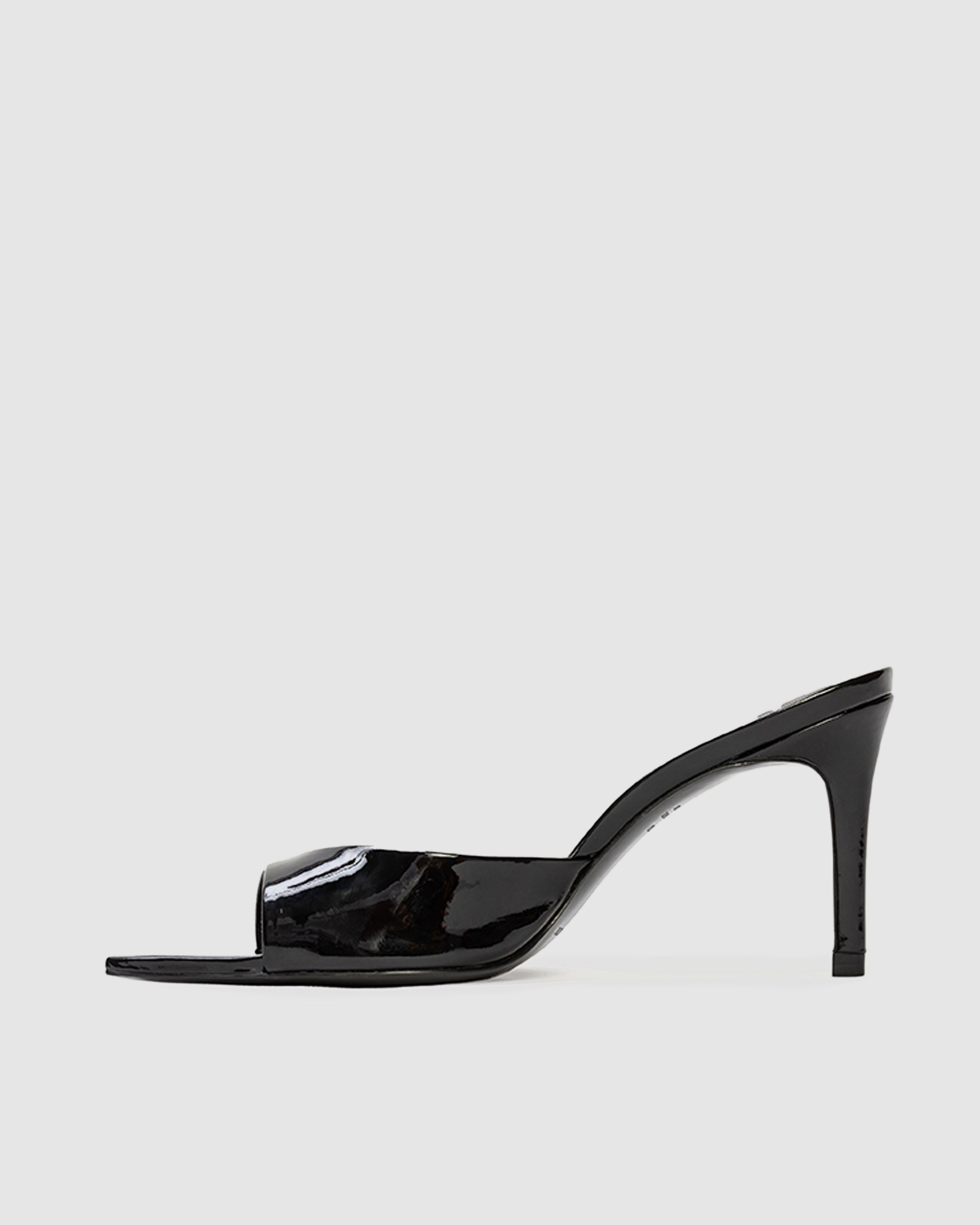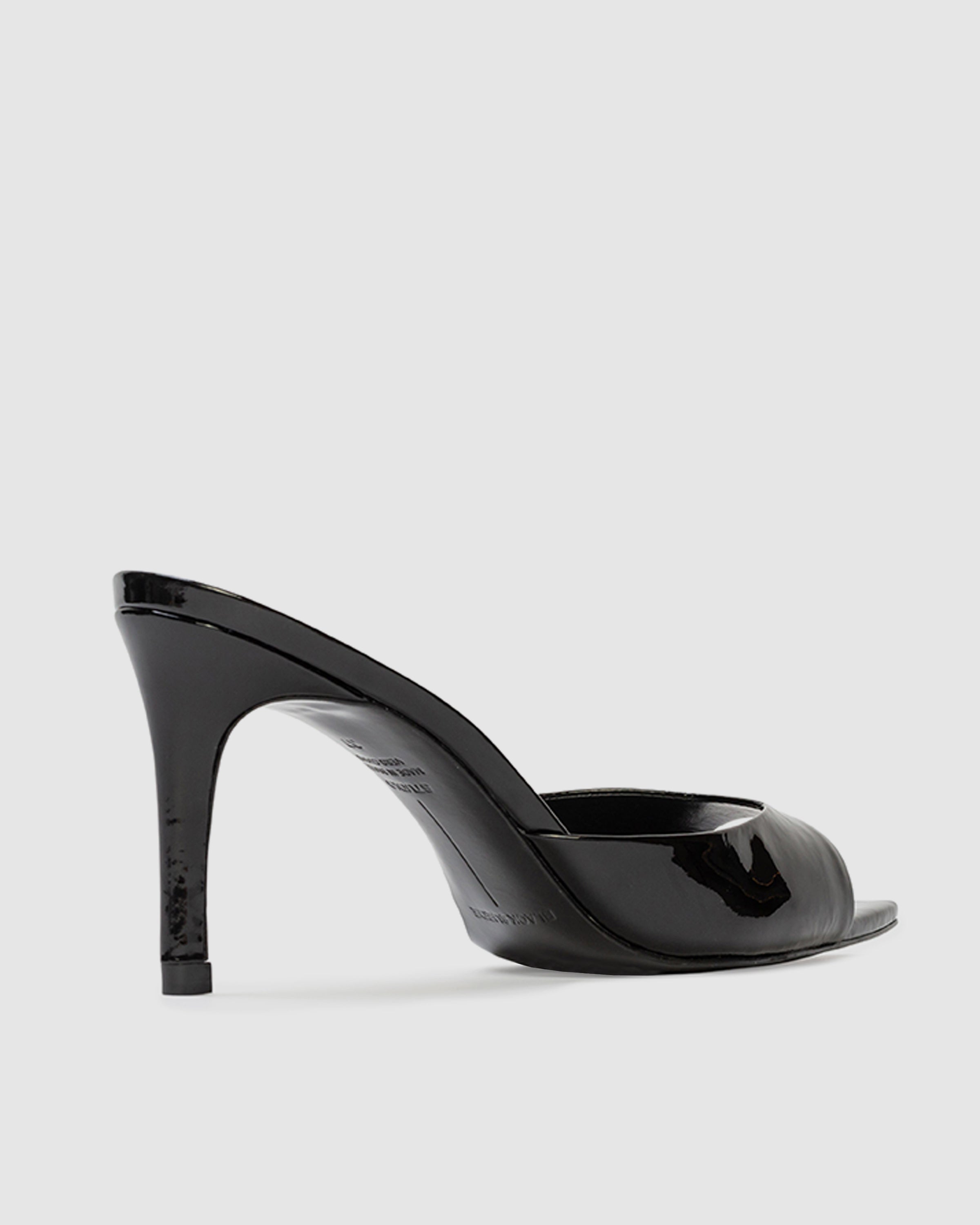 Pointy toe slipper mule, set on a straight high heel. Made with patent finished leather.