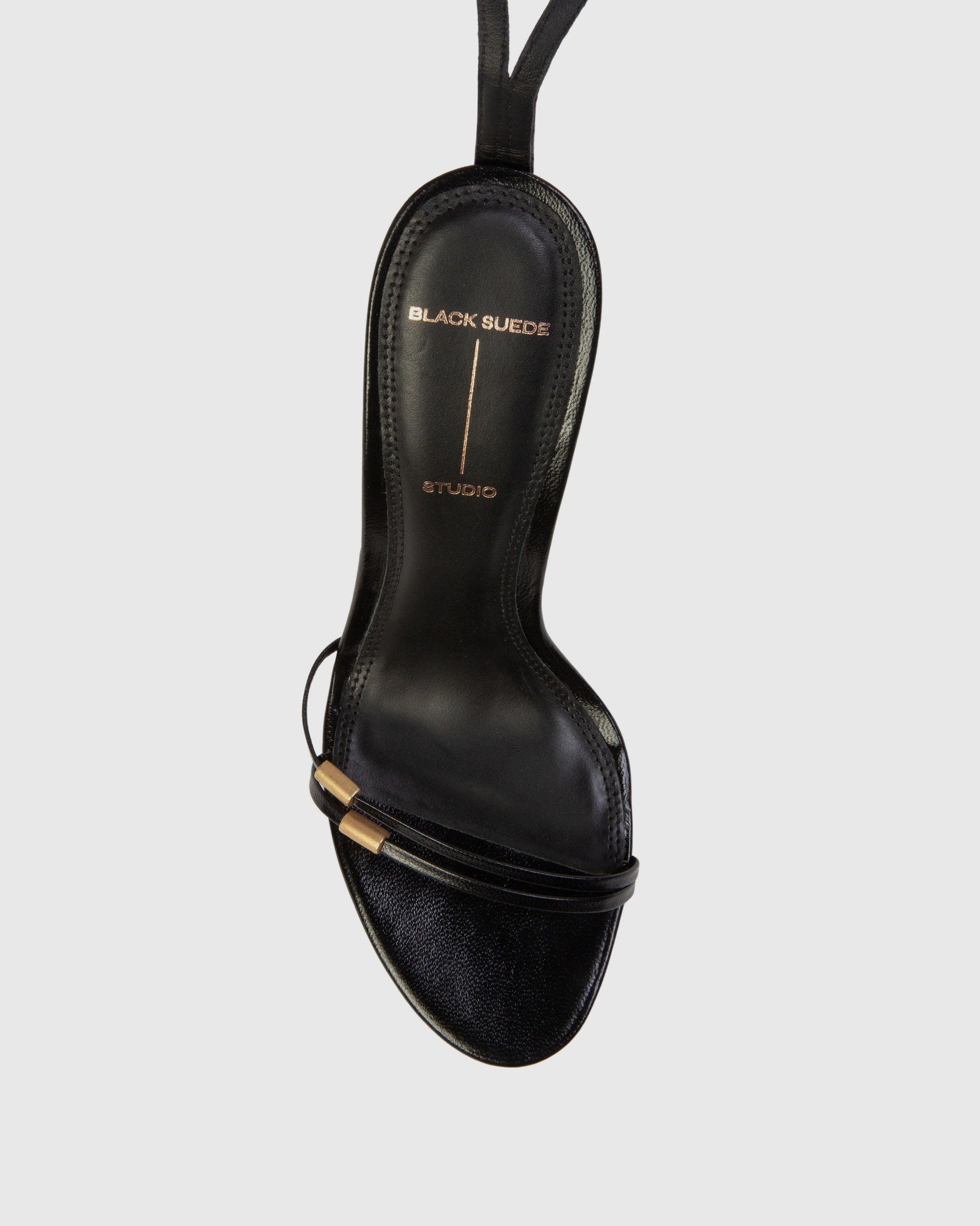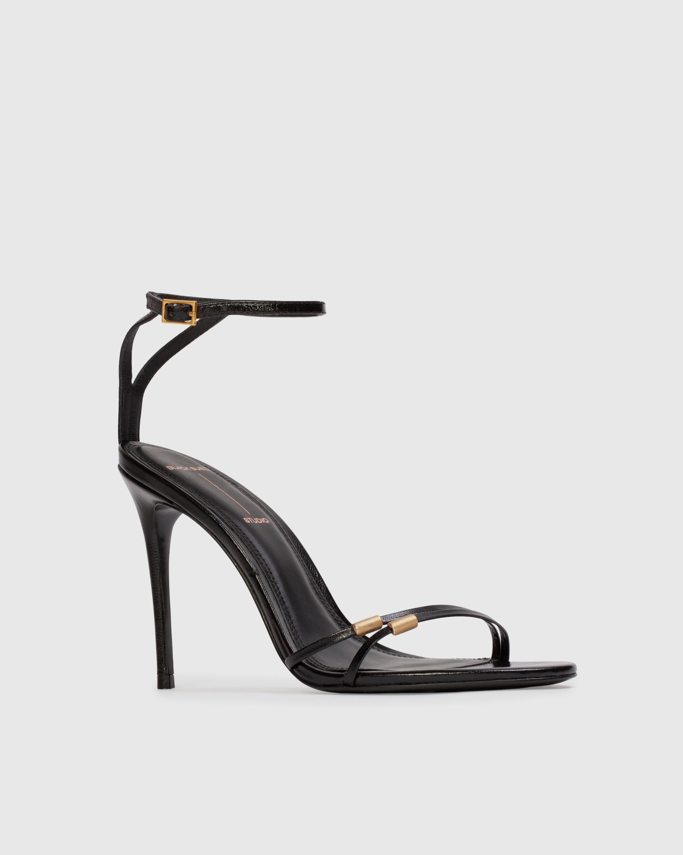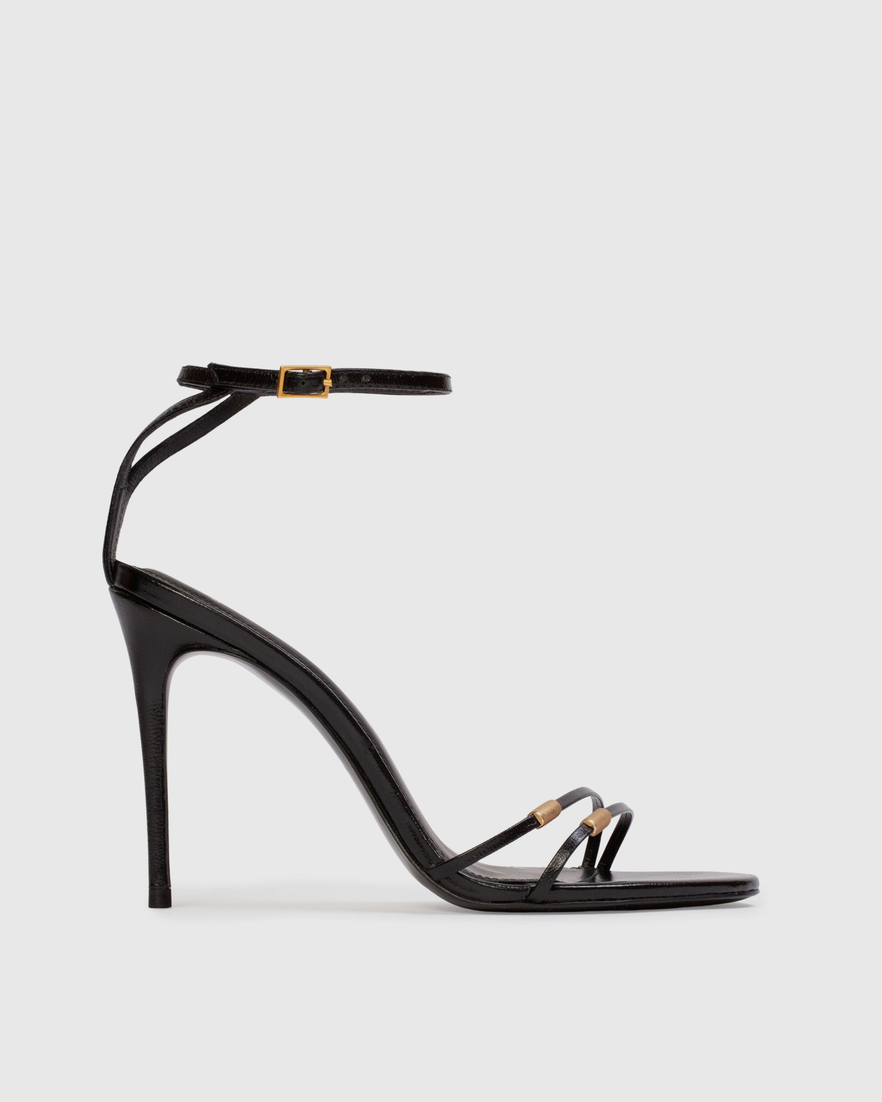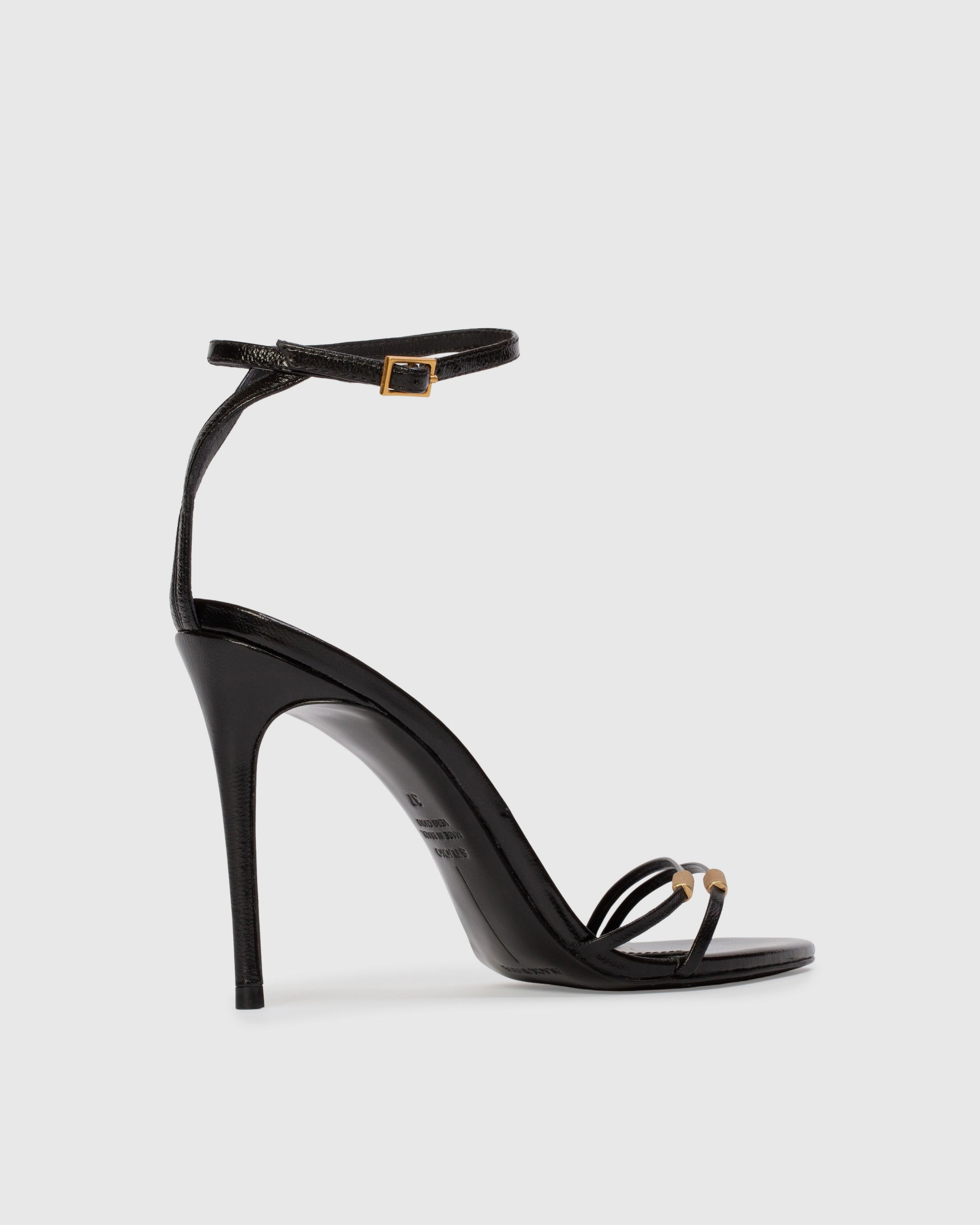 round toe sandal with brushed gold bean studs, set on a stiletto pin heel.