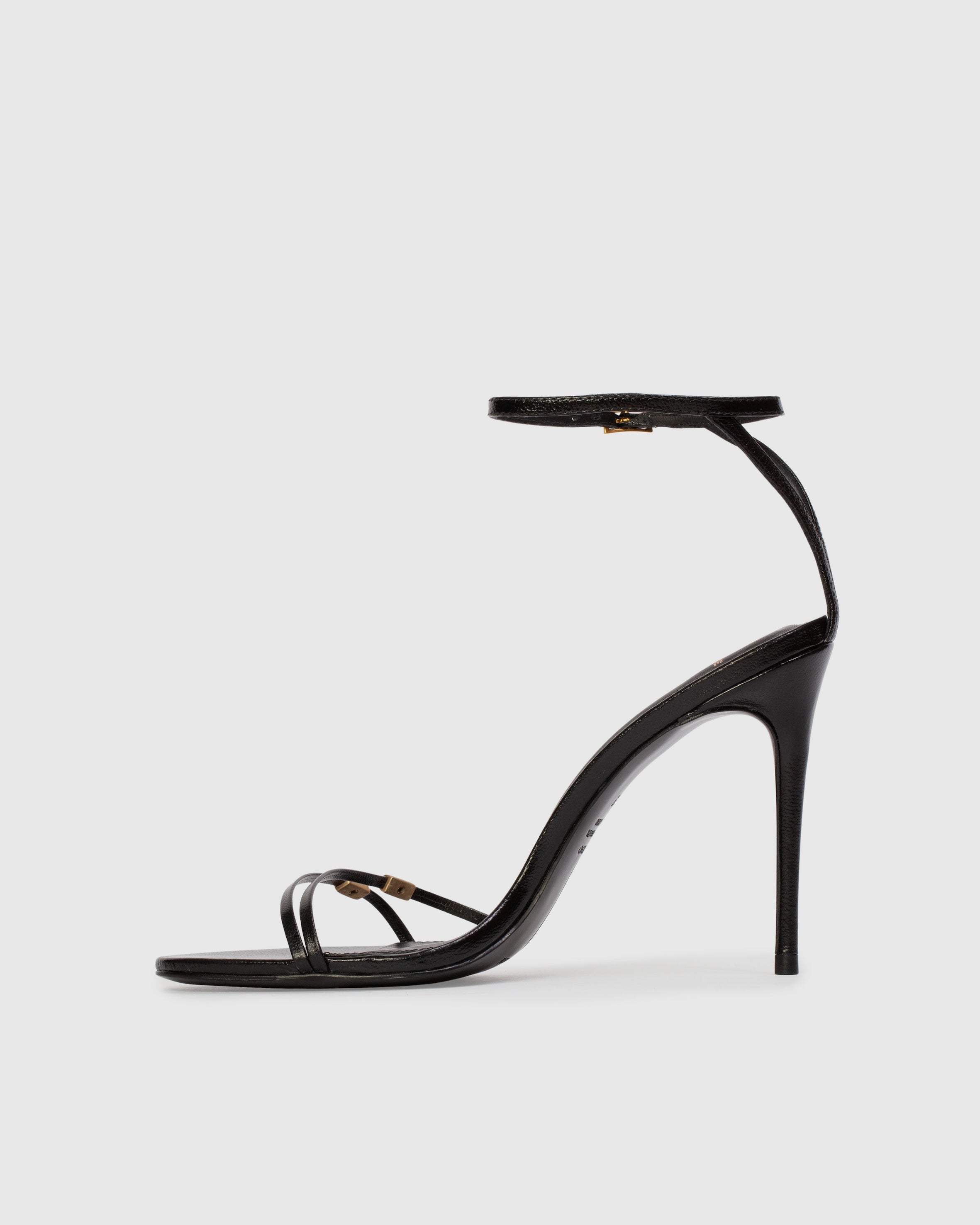 round toe sandal with brushed gold bean studs, set on a stiletto pin heel. made with goat leather.