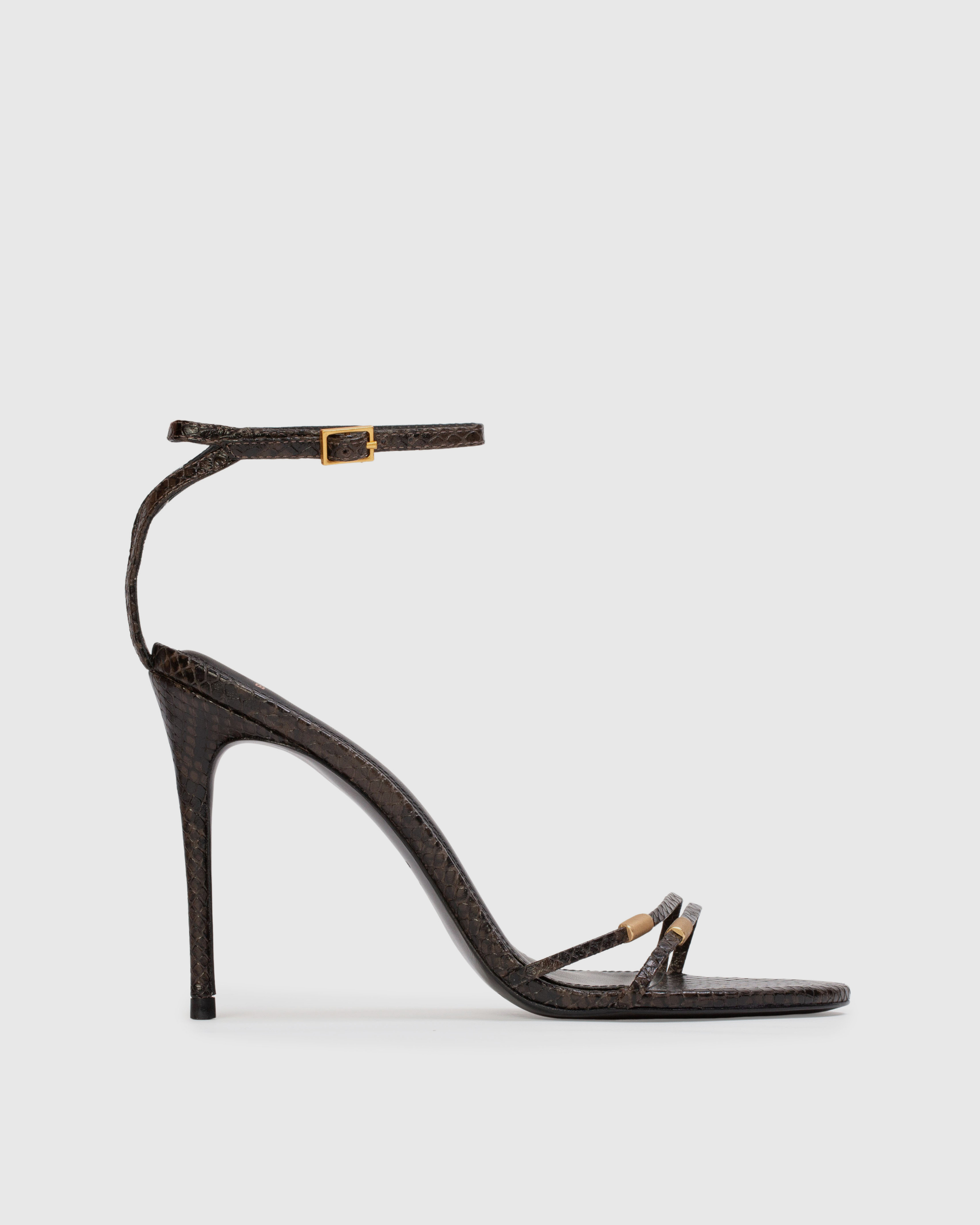 round toe sandal with brushed gold bean studs, set on a stiletto pin heel. made with printed snake leather.