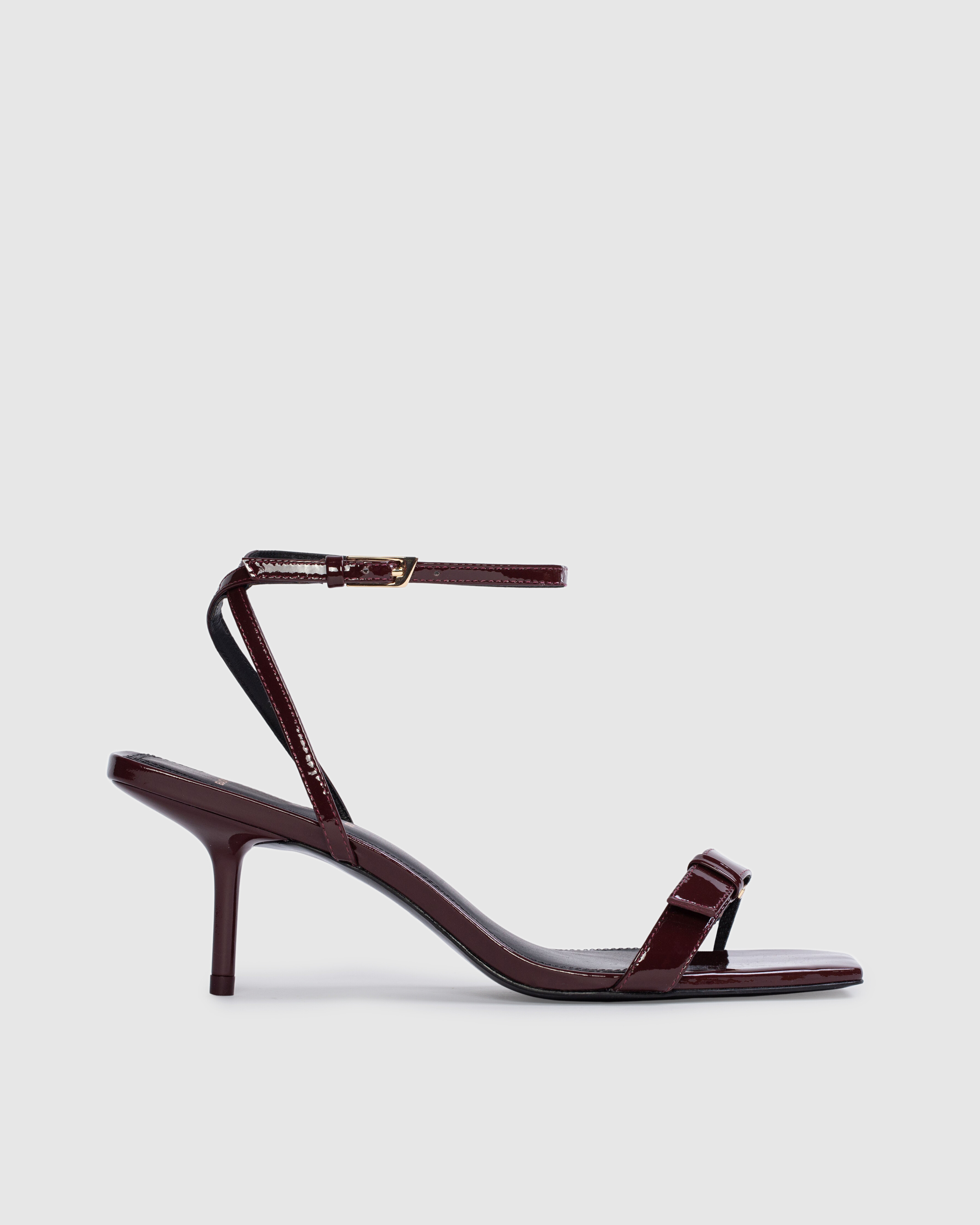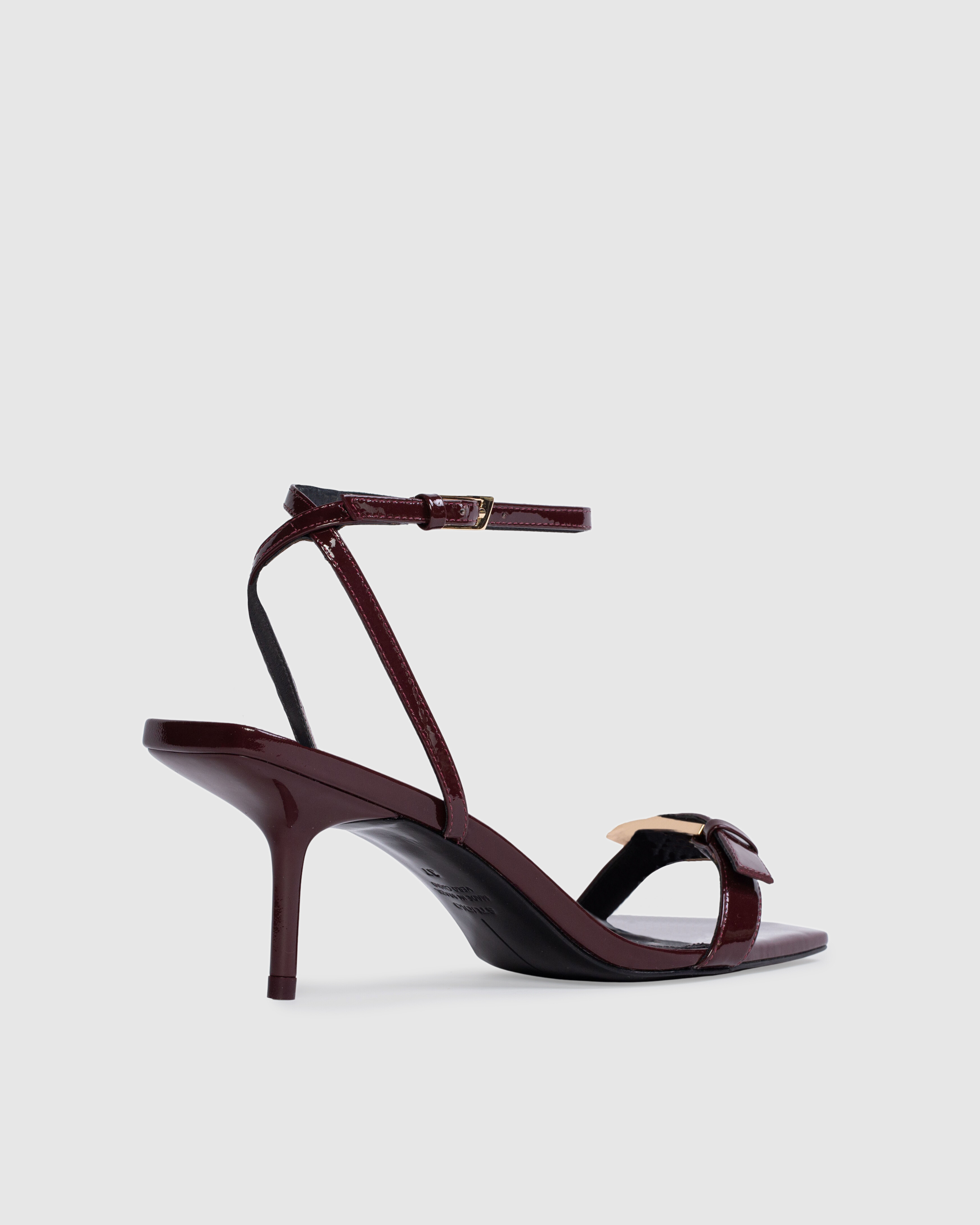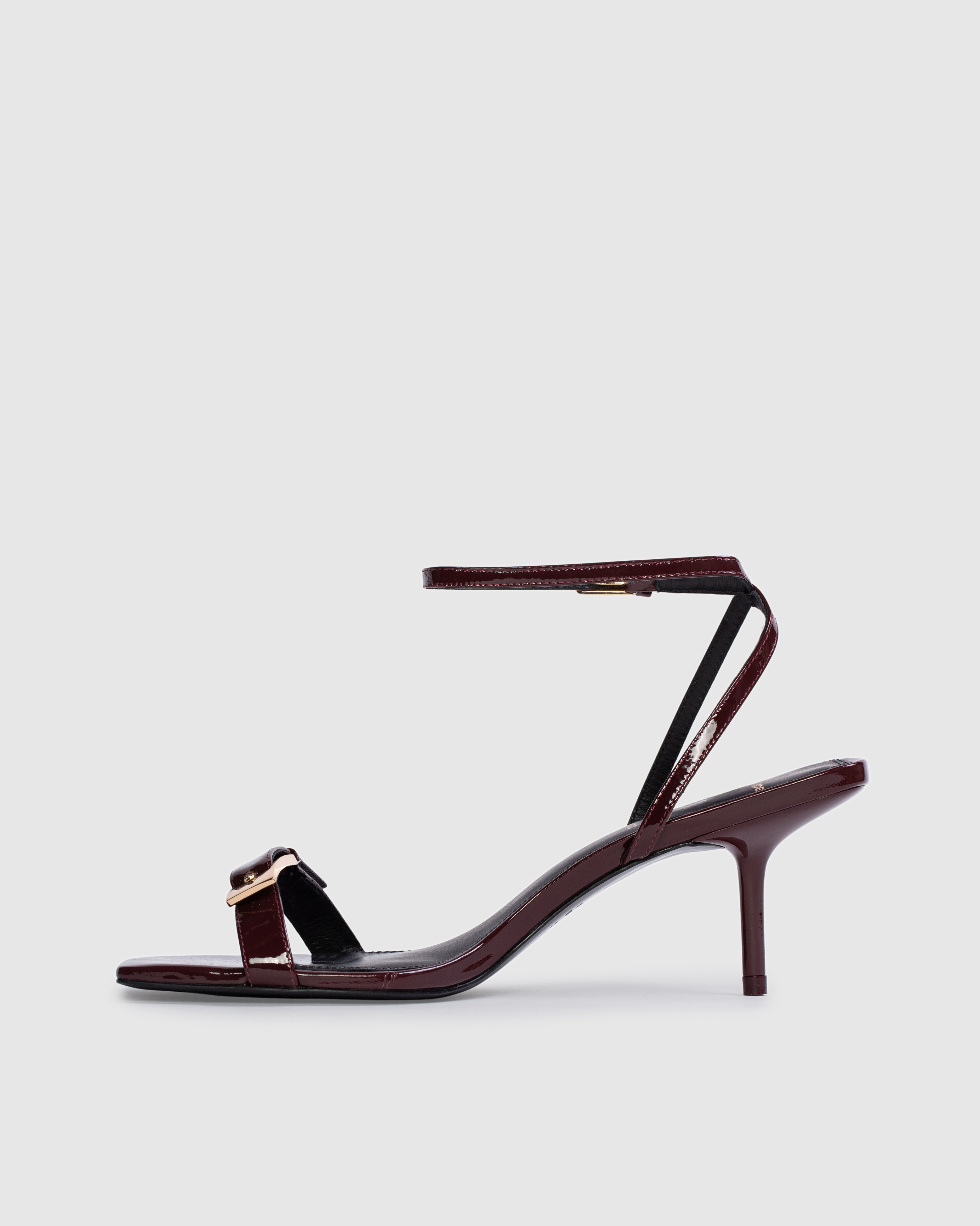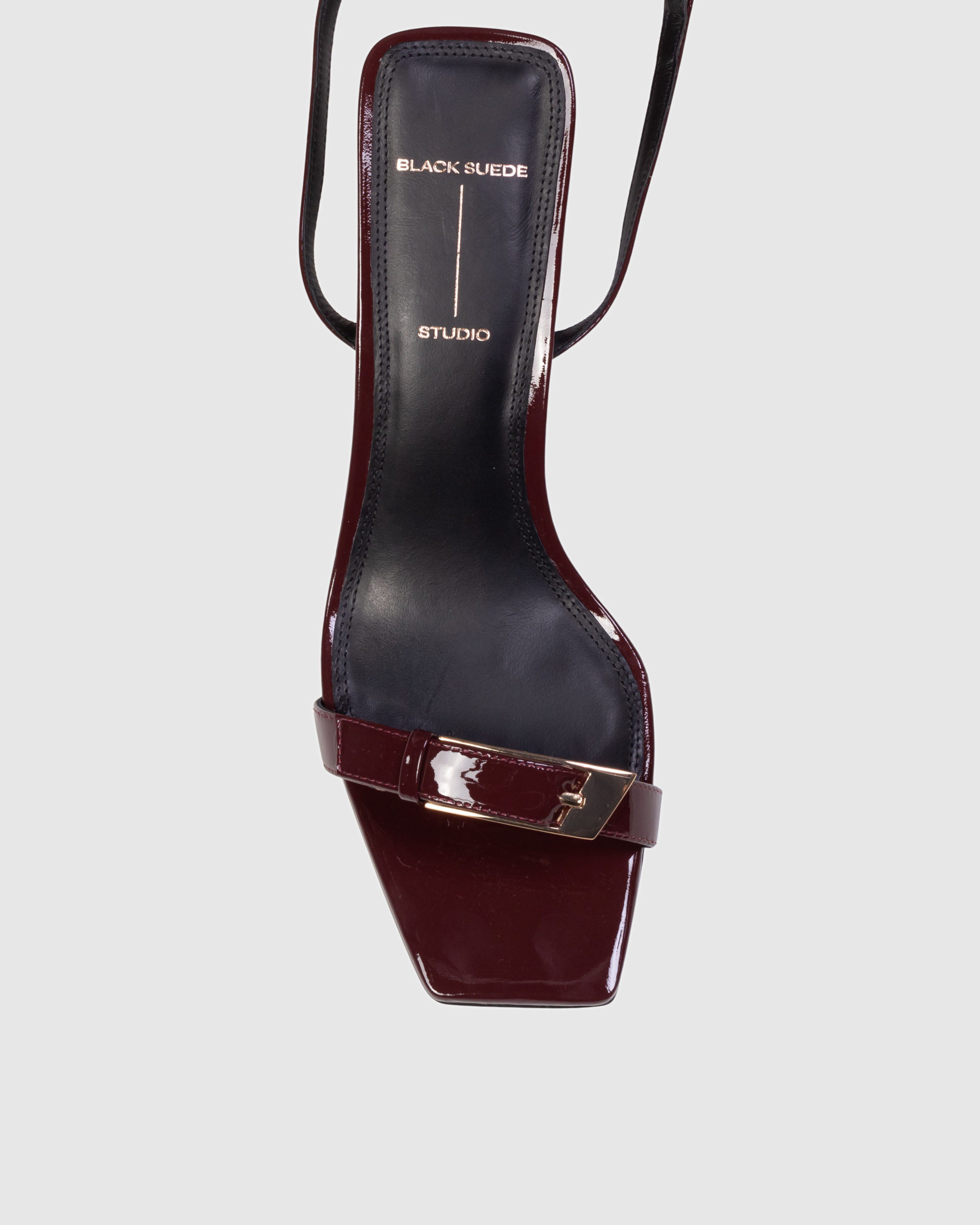 Square toe sandal with large slanted buckle, set on a set in kitten heel. Made with smooth patent leather.