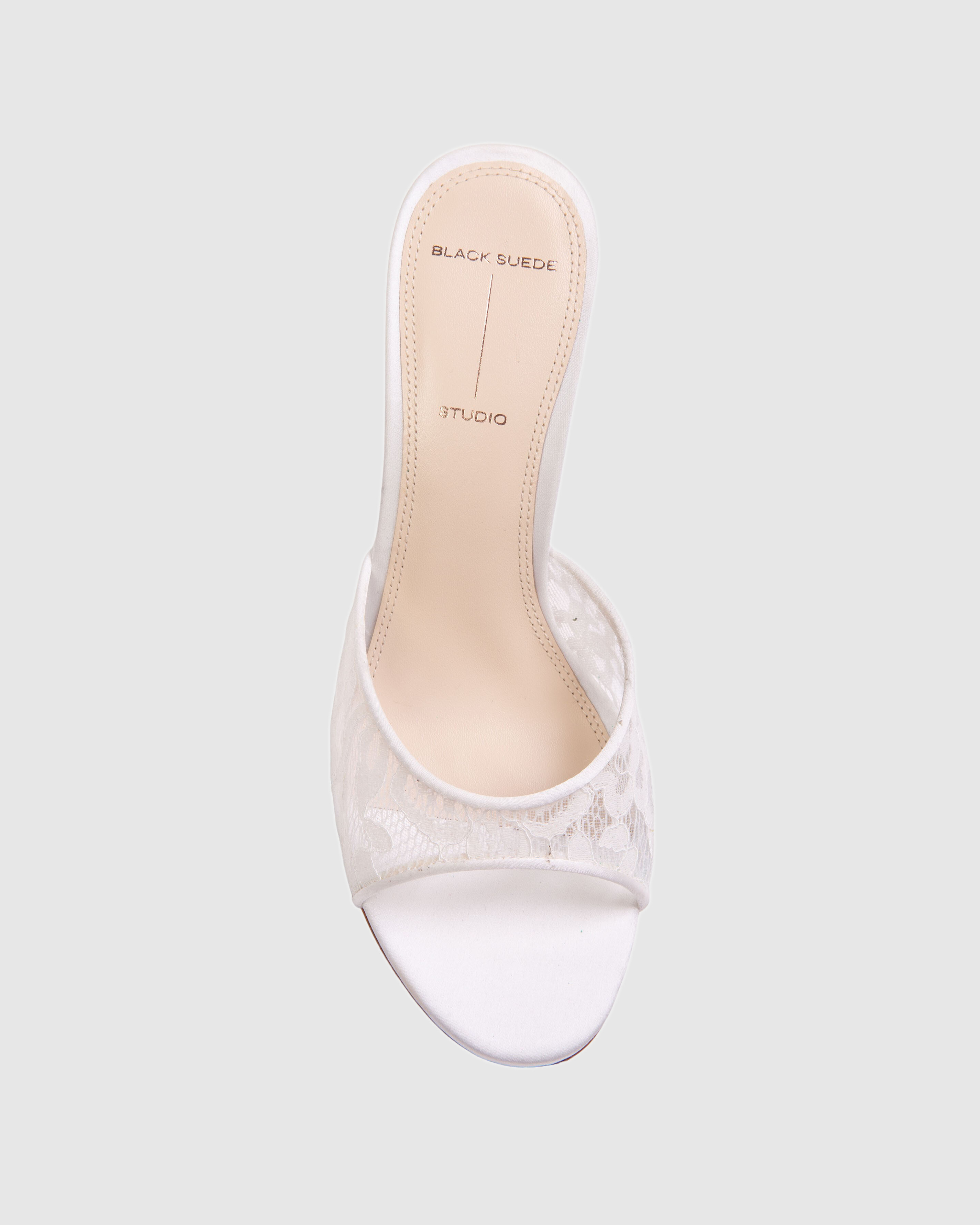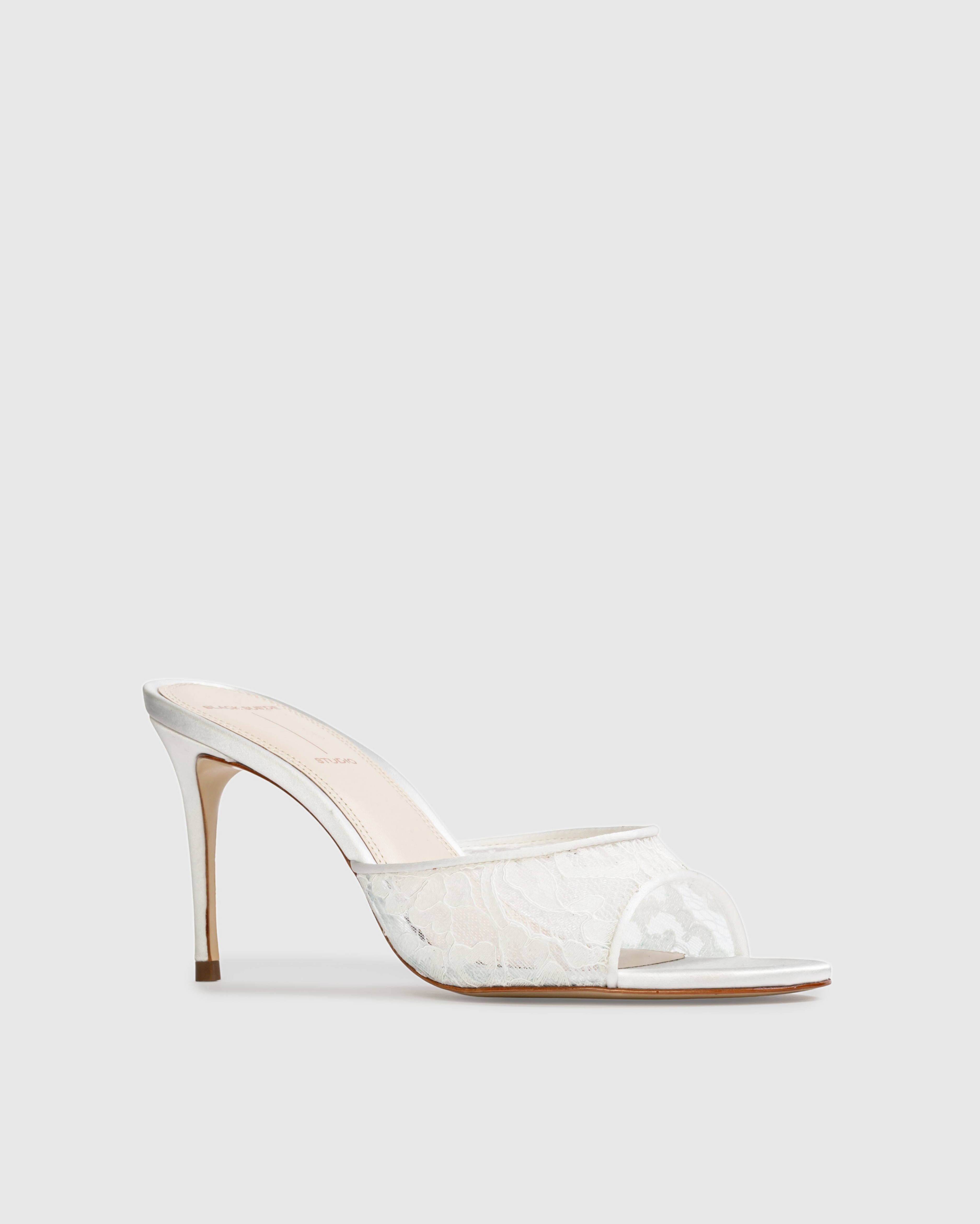 angled snip toe lace mule, set on a high pin heel. Made with lace and satin crepe.