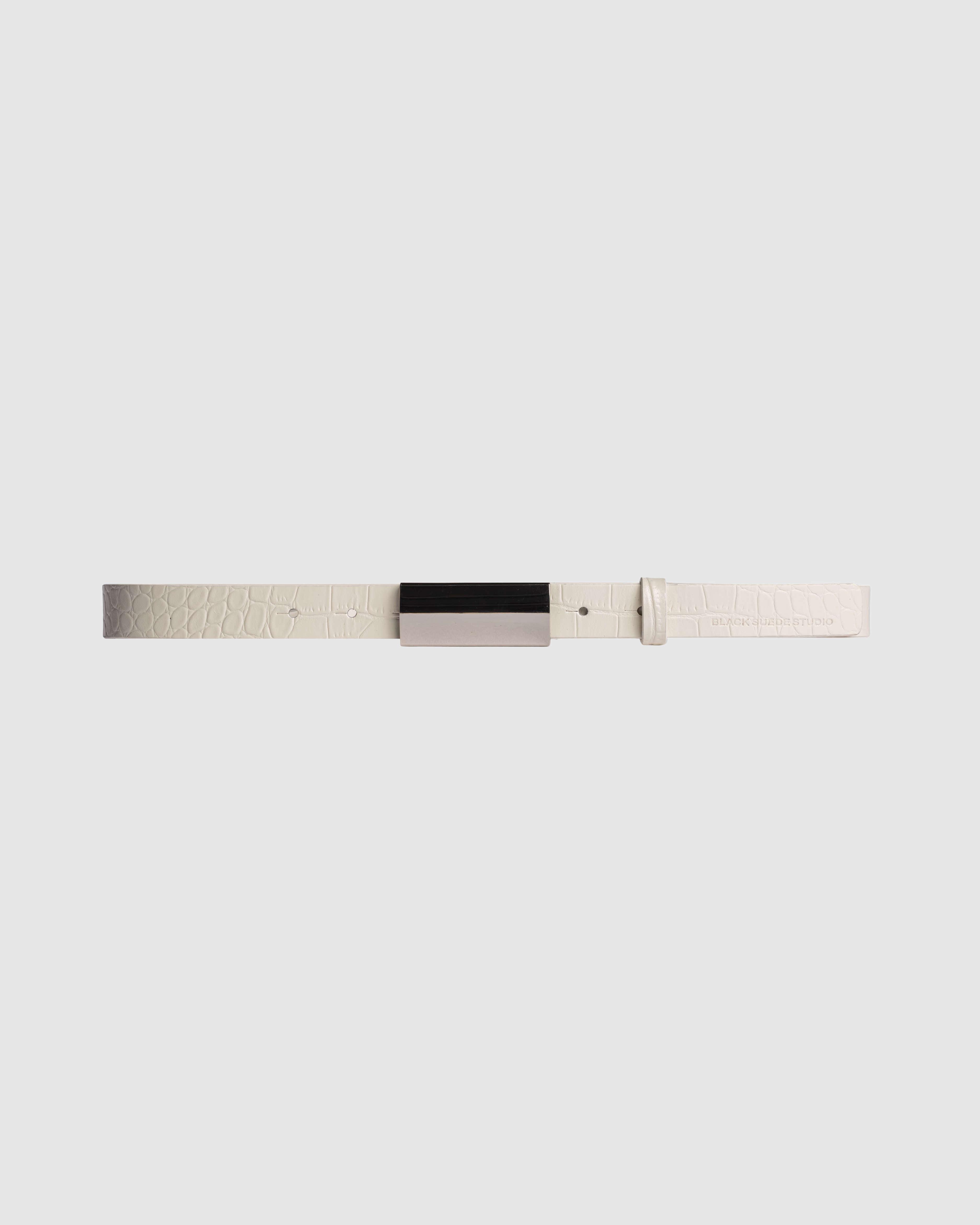 Silver plated brass rectangle buckle. Secured on a premium croc printed leather.