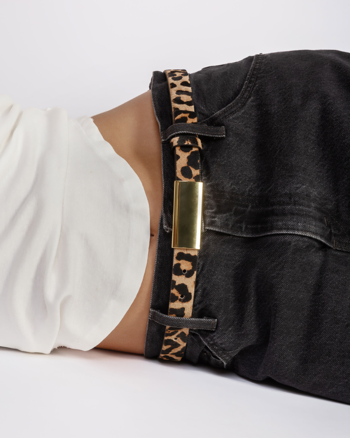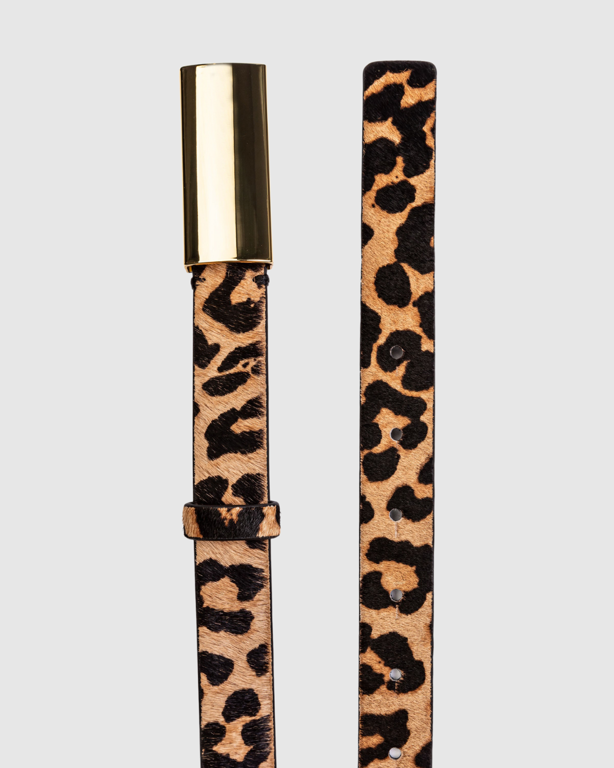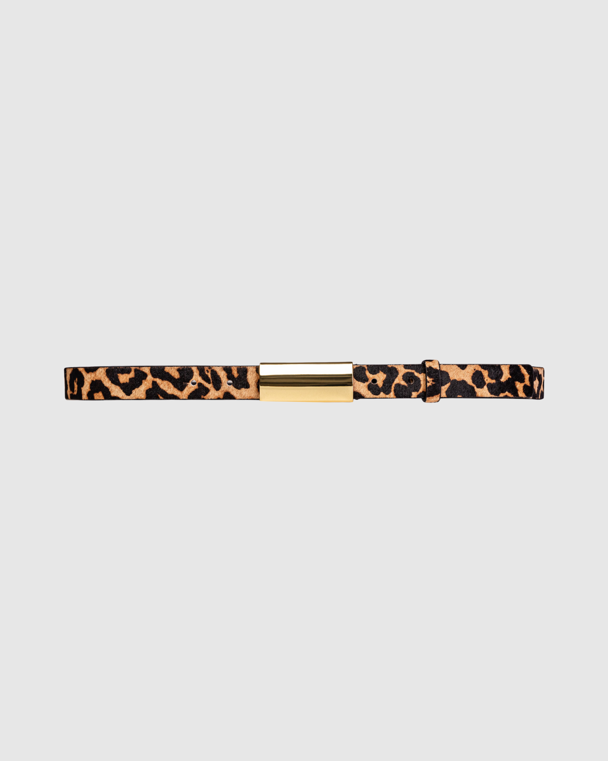 gold plated brass rectangle buckle.Secured on a leopard pony hair strap.
