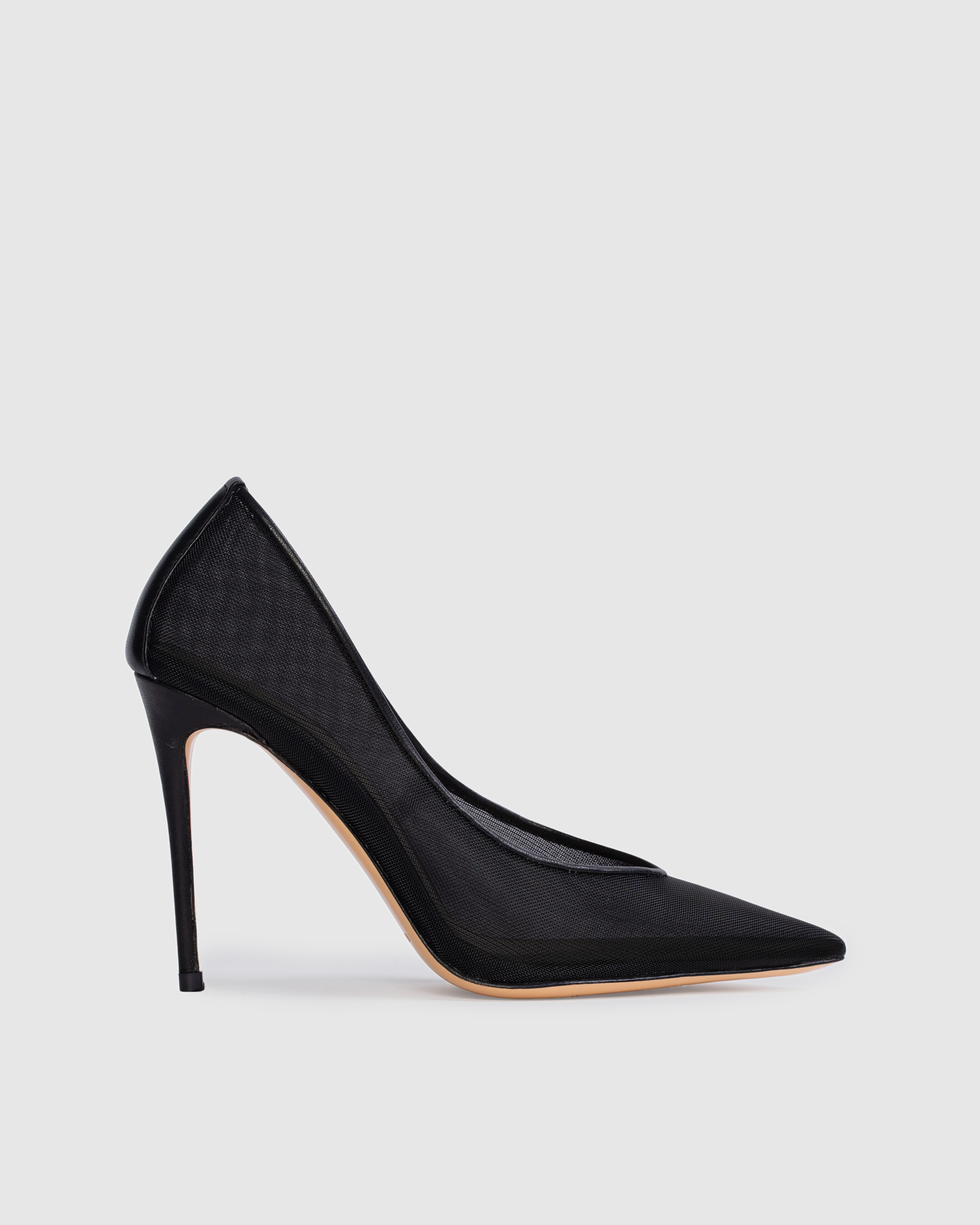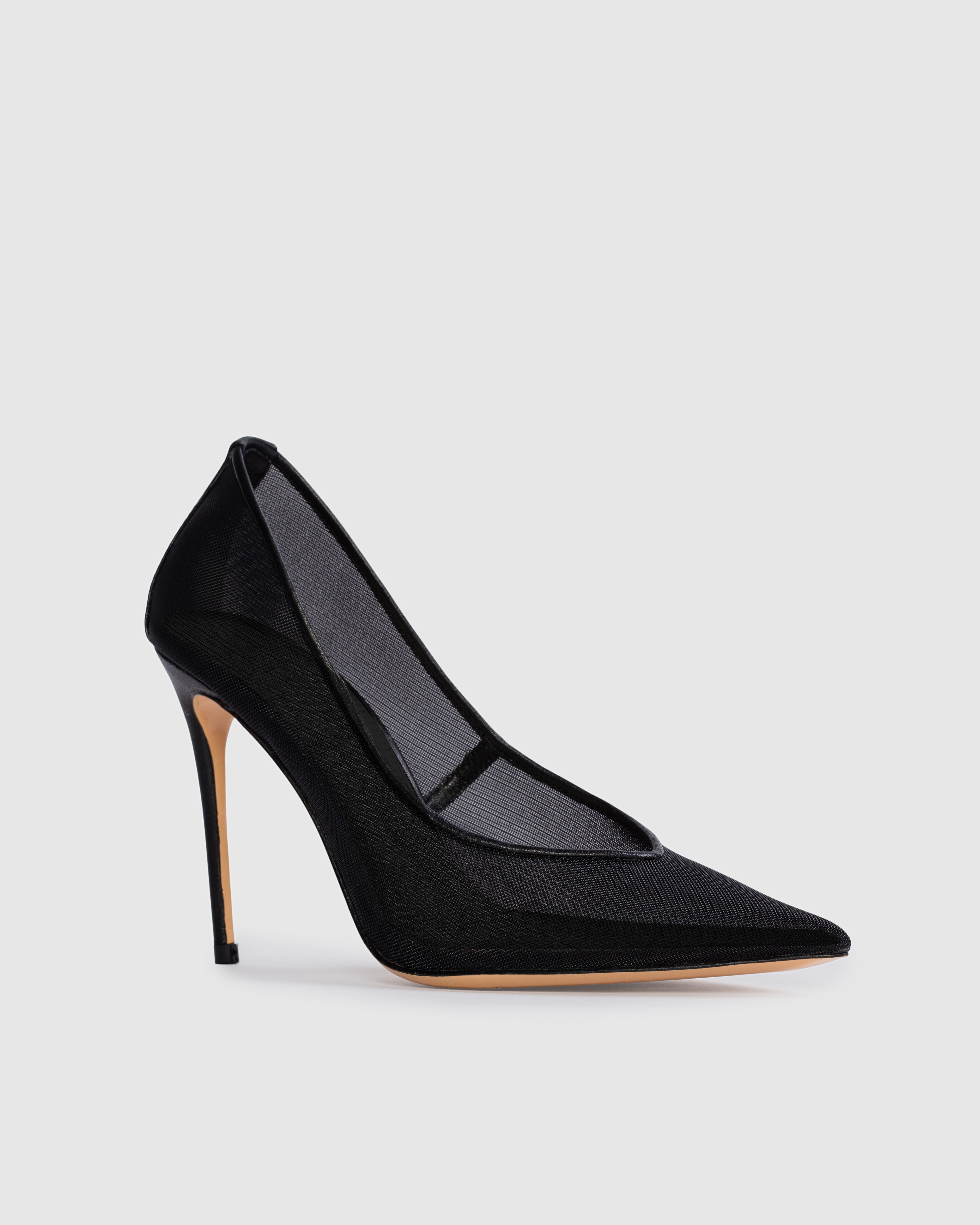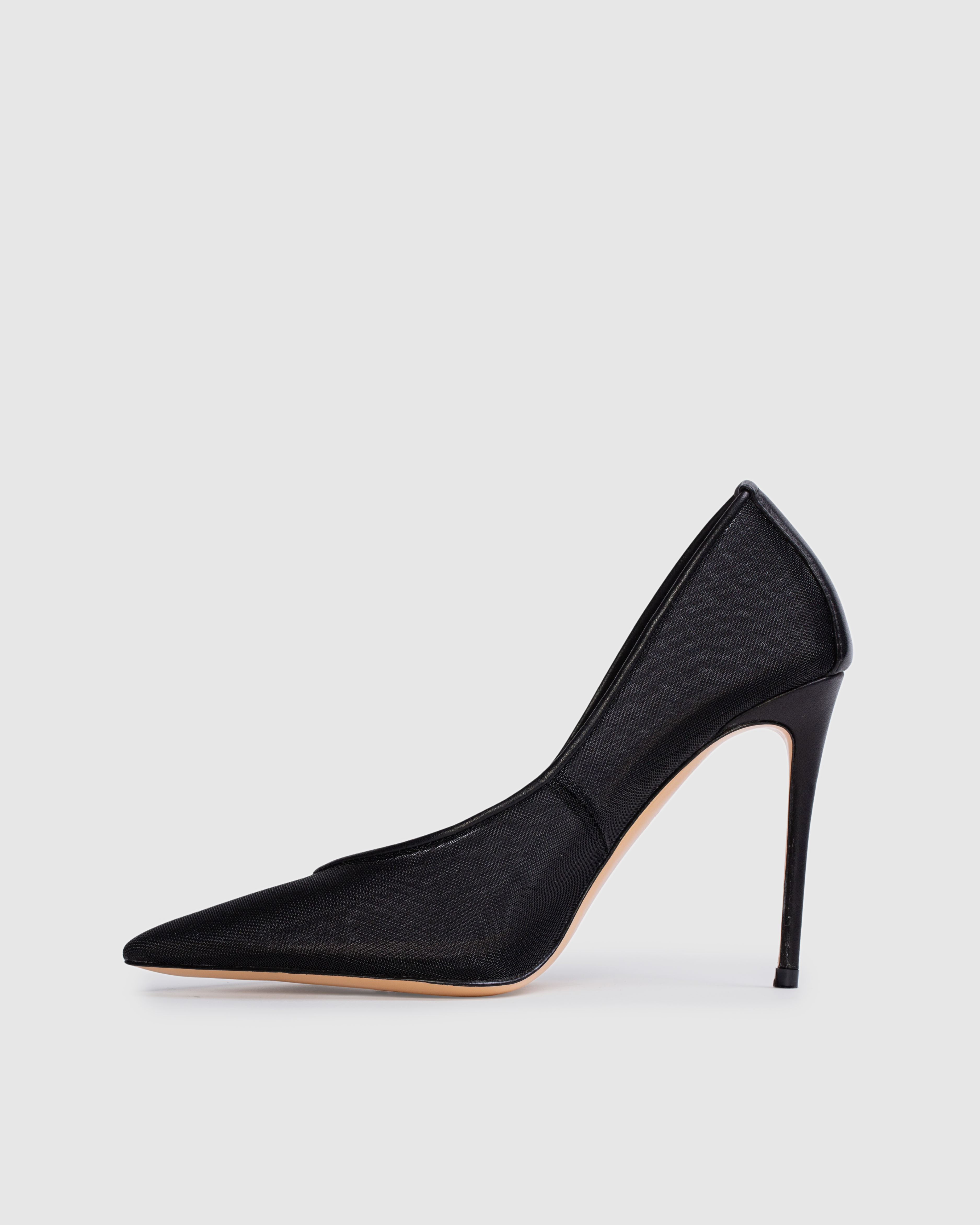 Pointy toe mesh pump, set on a stiletto pin heel. Made with mesh and smooth buffed leather.