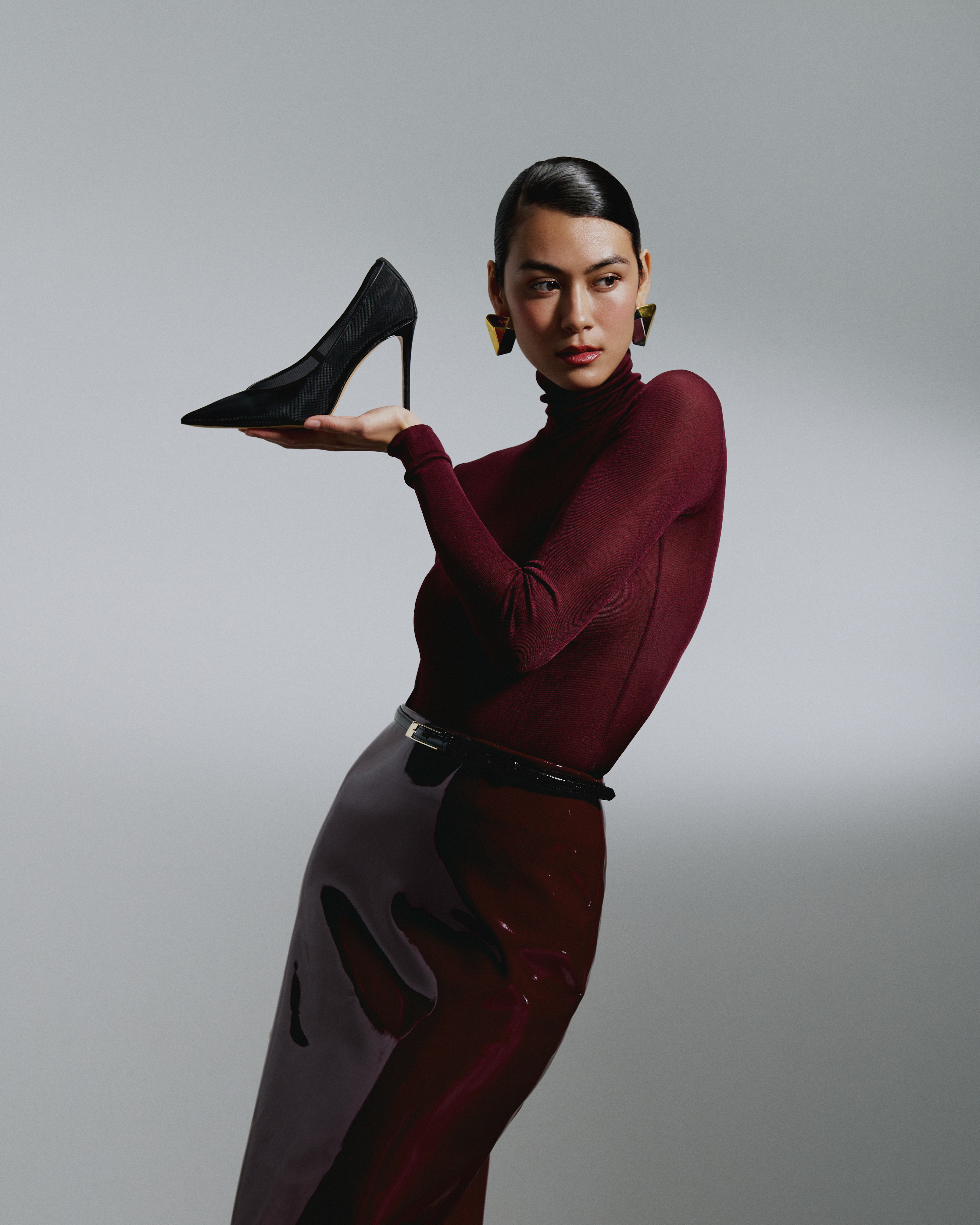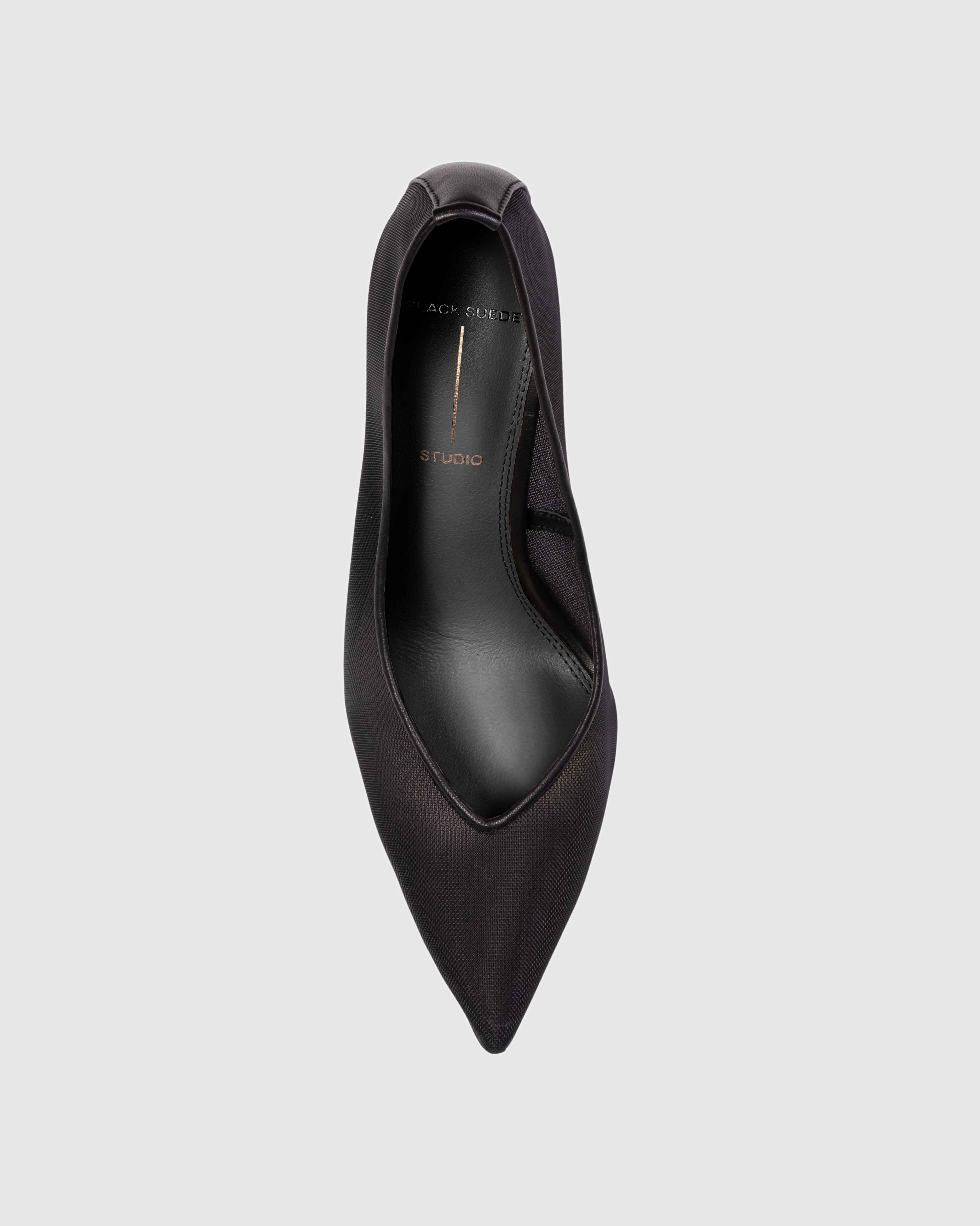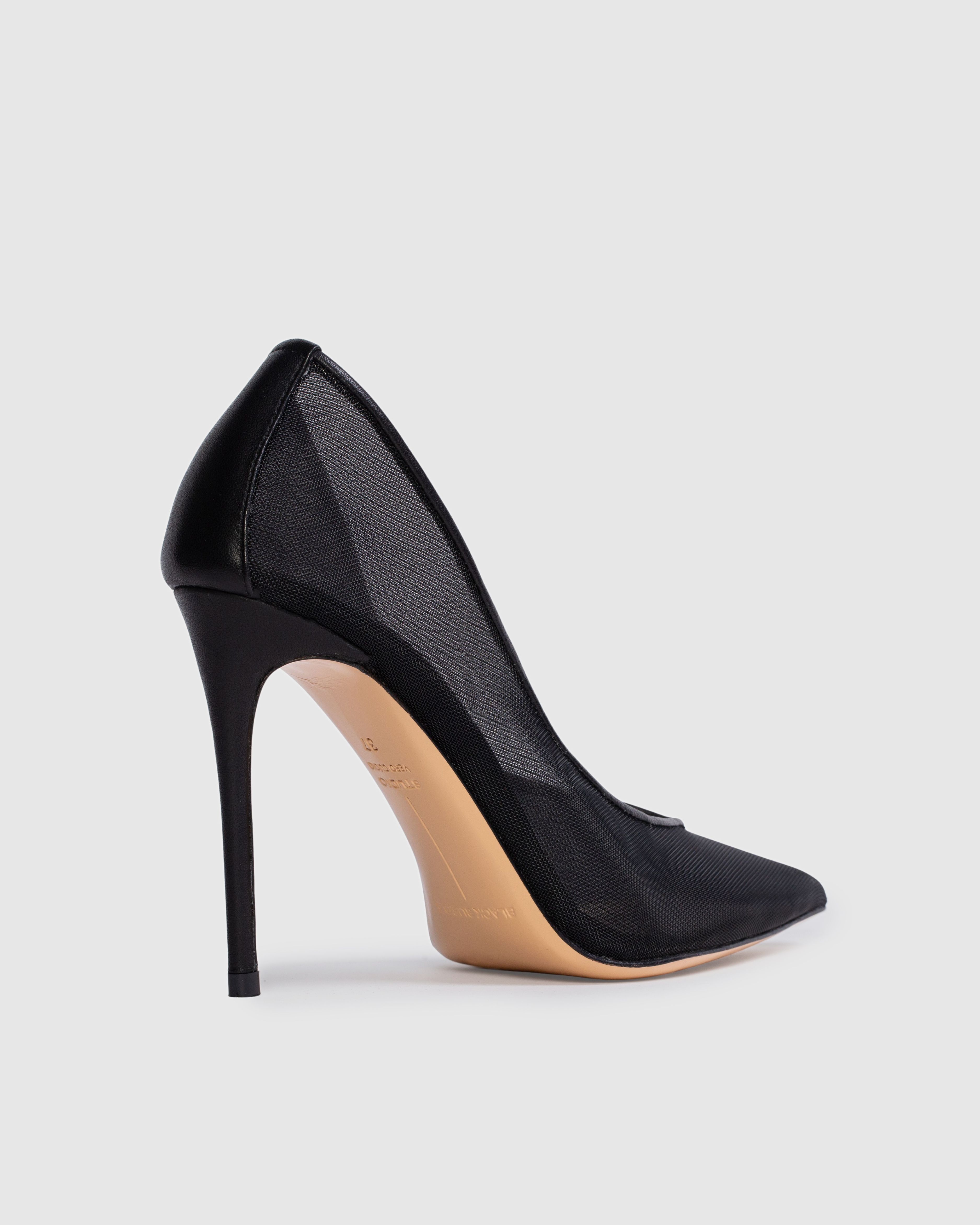 Pointy toe mesh pump, set on a stiletto pin heel. Made with mesh and smooth buffed leather.