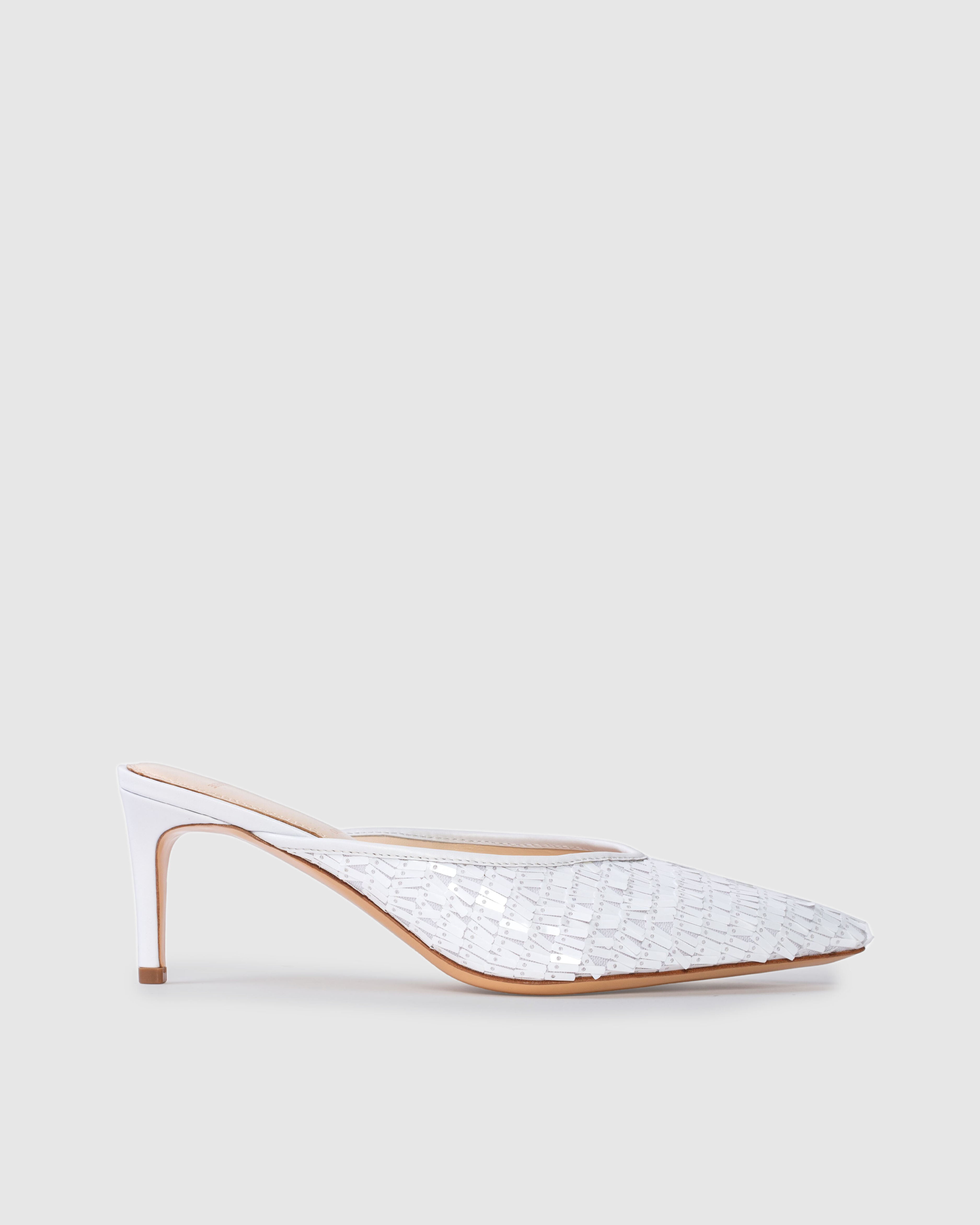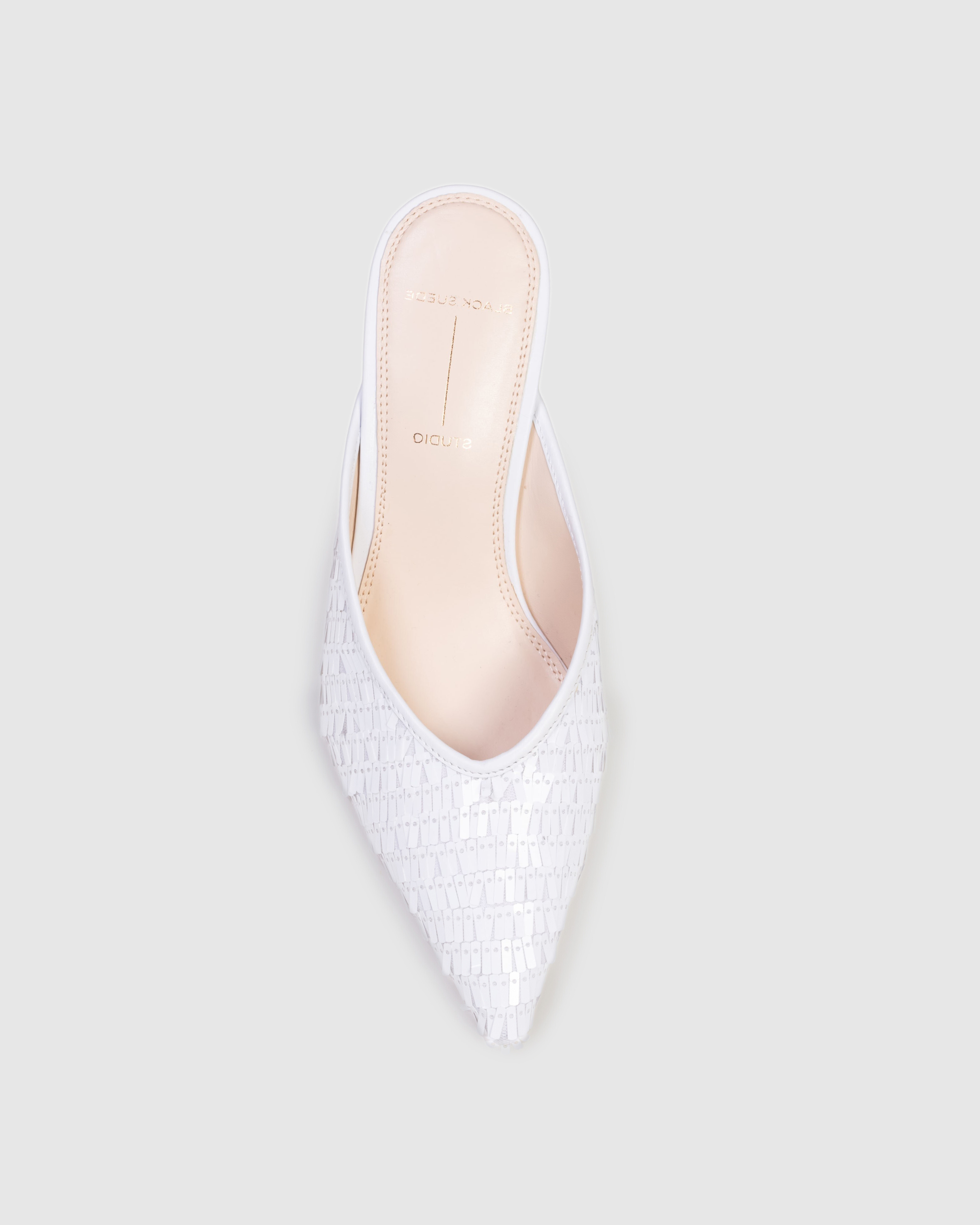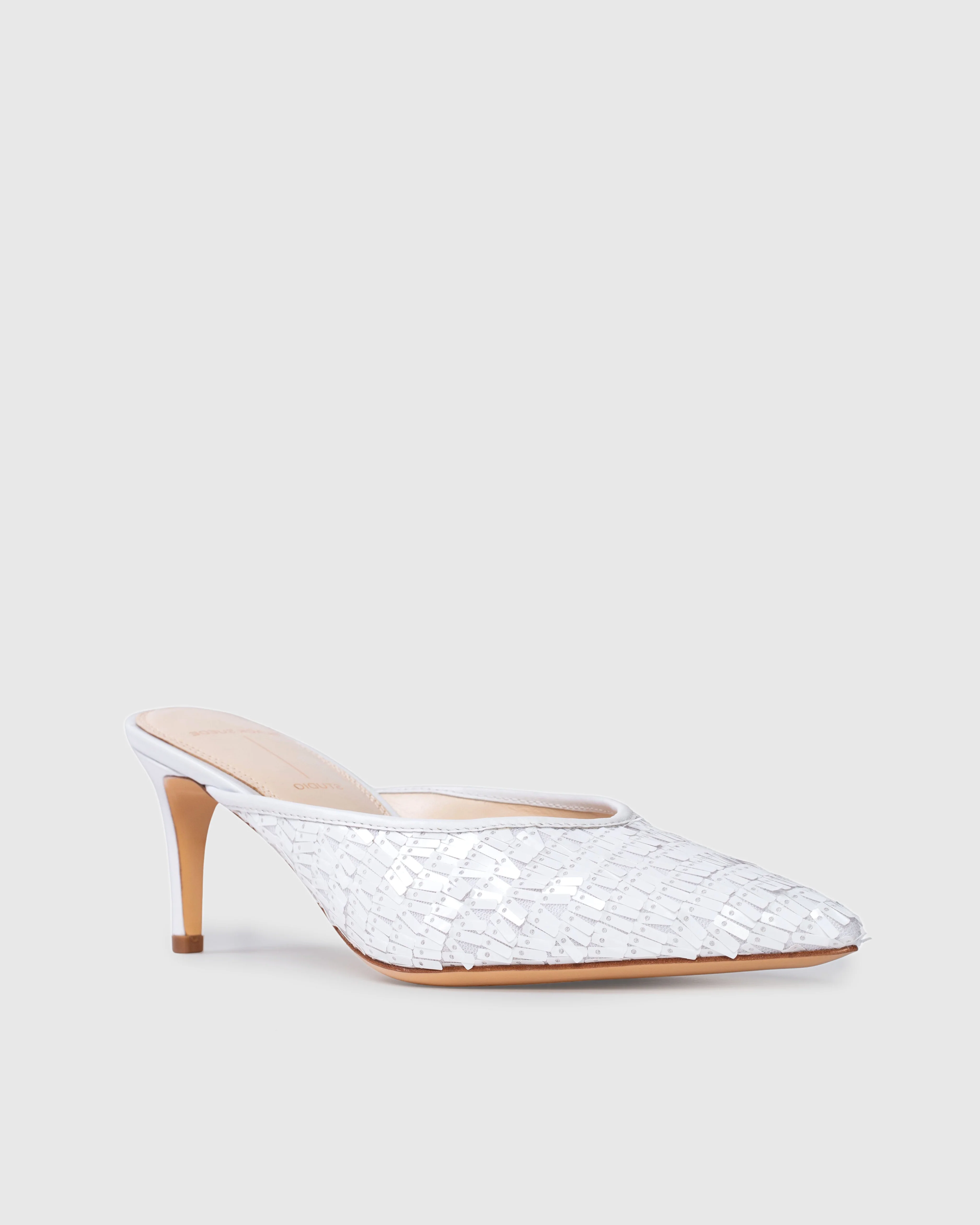 Pointy toe sequined slip on mule, set on a staright kitten heel. Made with mesh and smooth buffed leather.