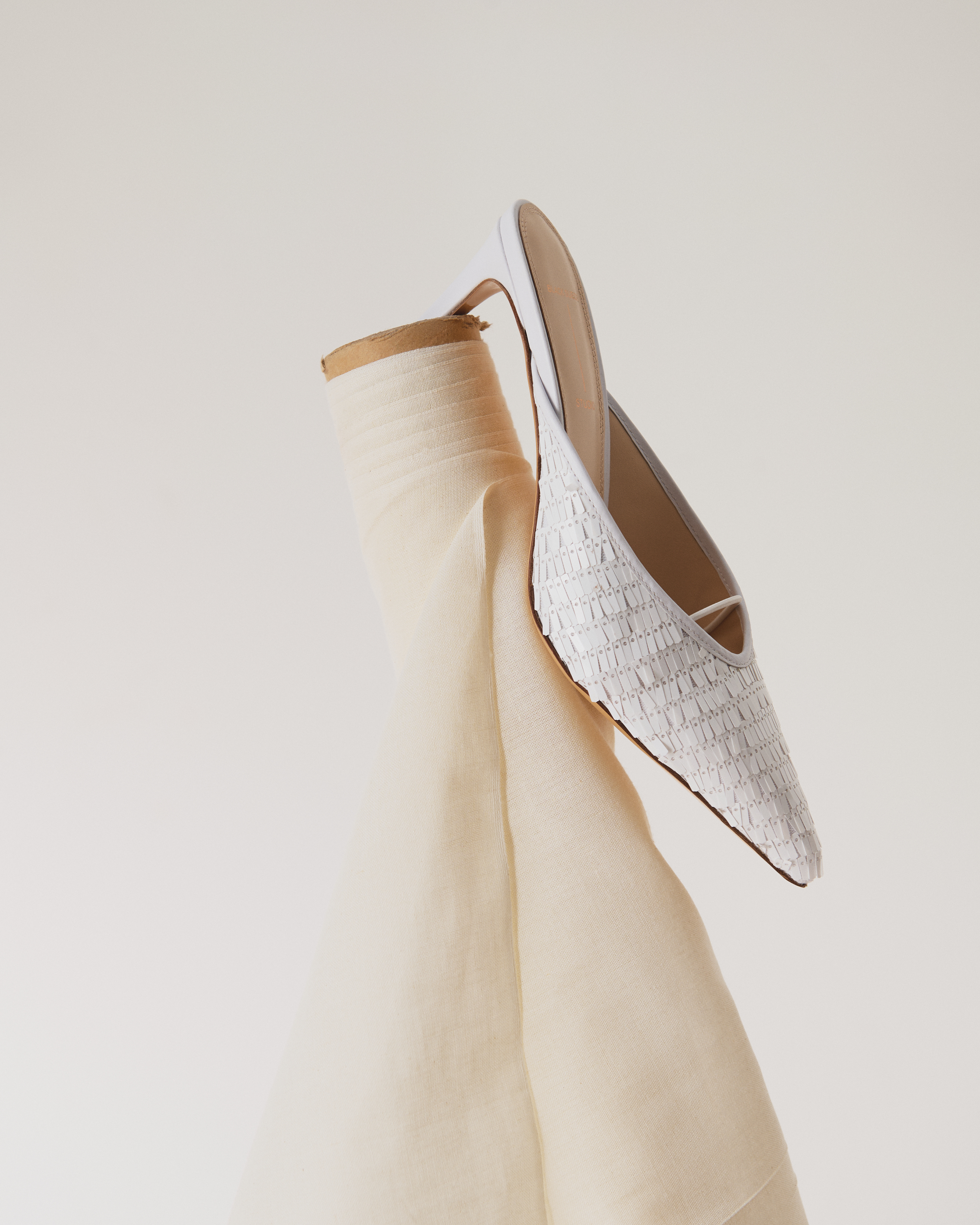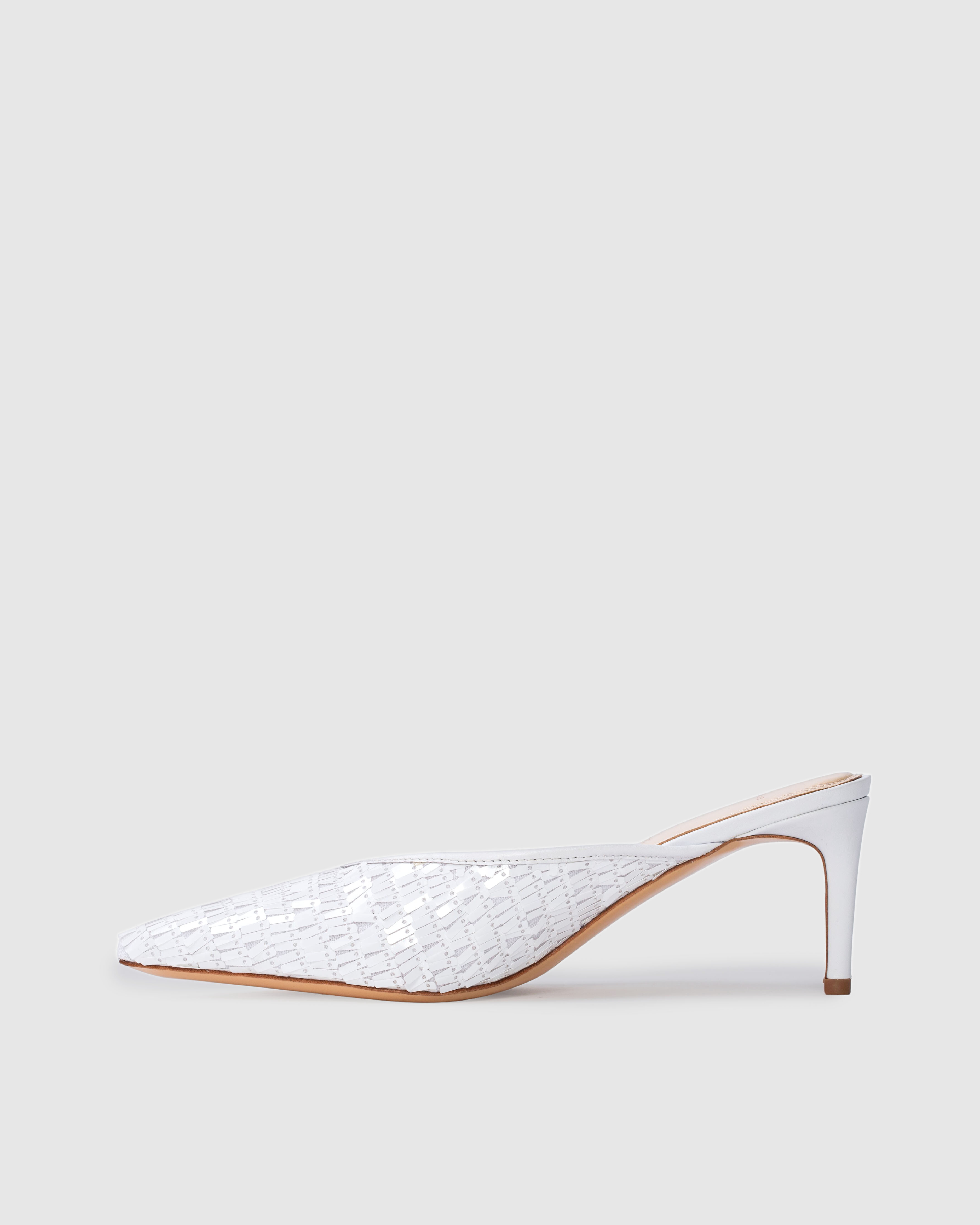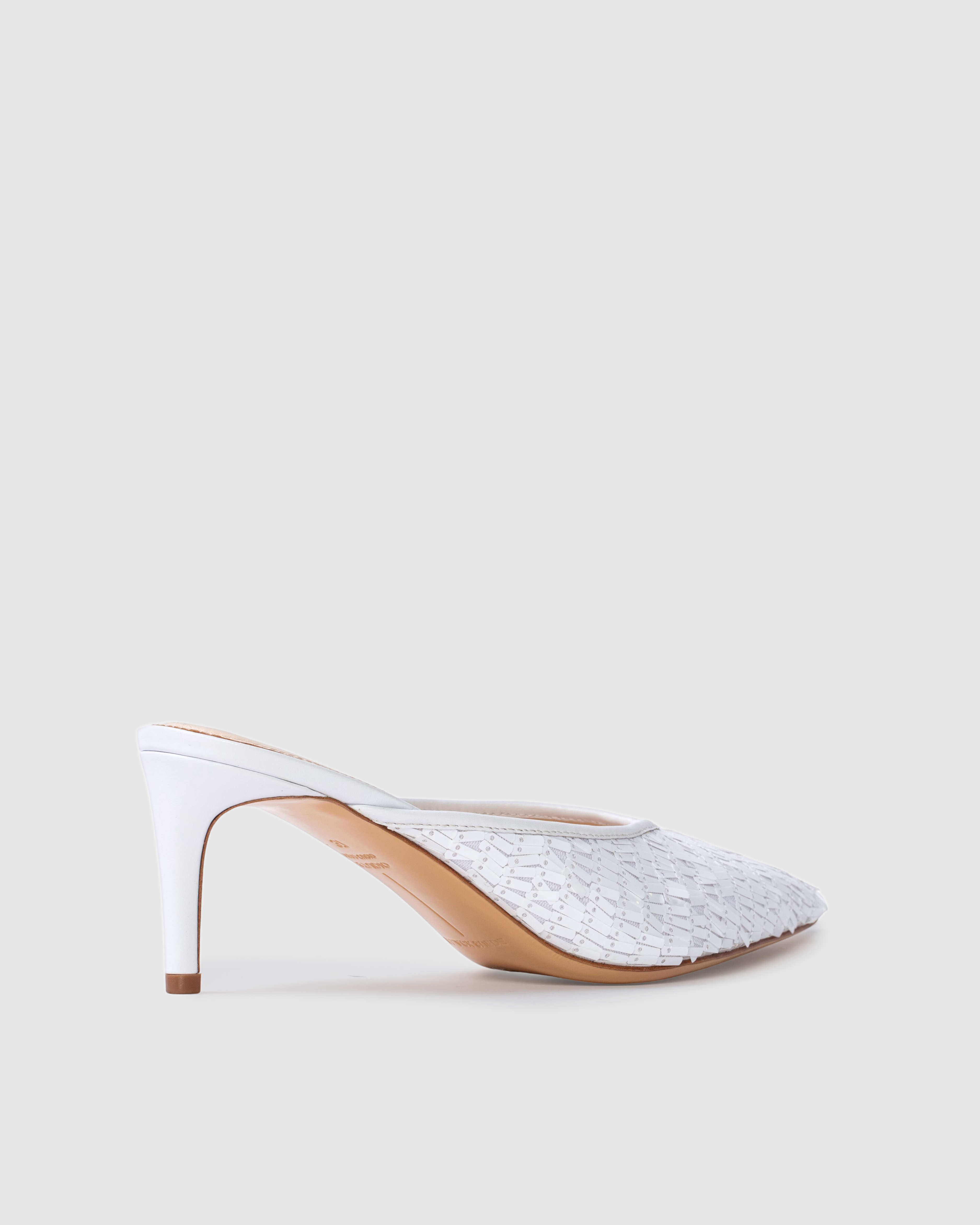 Pointy toe sequined slip on mule, set on a staright kitten heel. Made with mesh and smooth buffed leather.