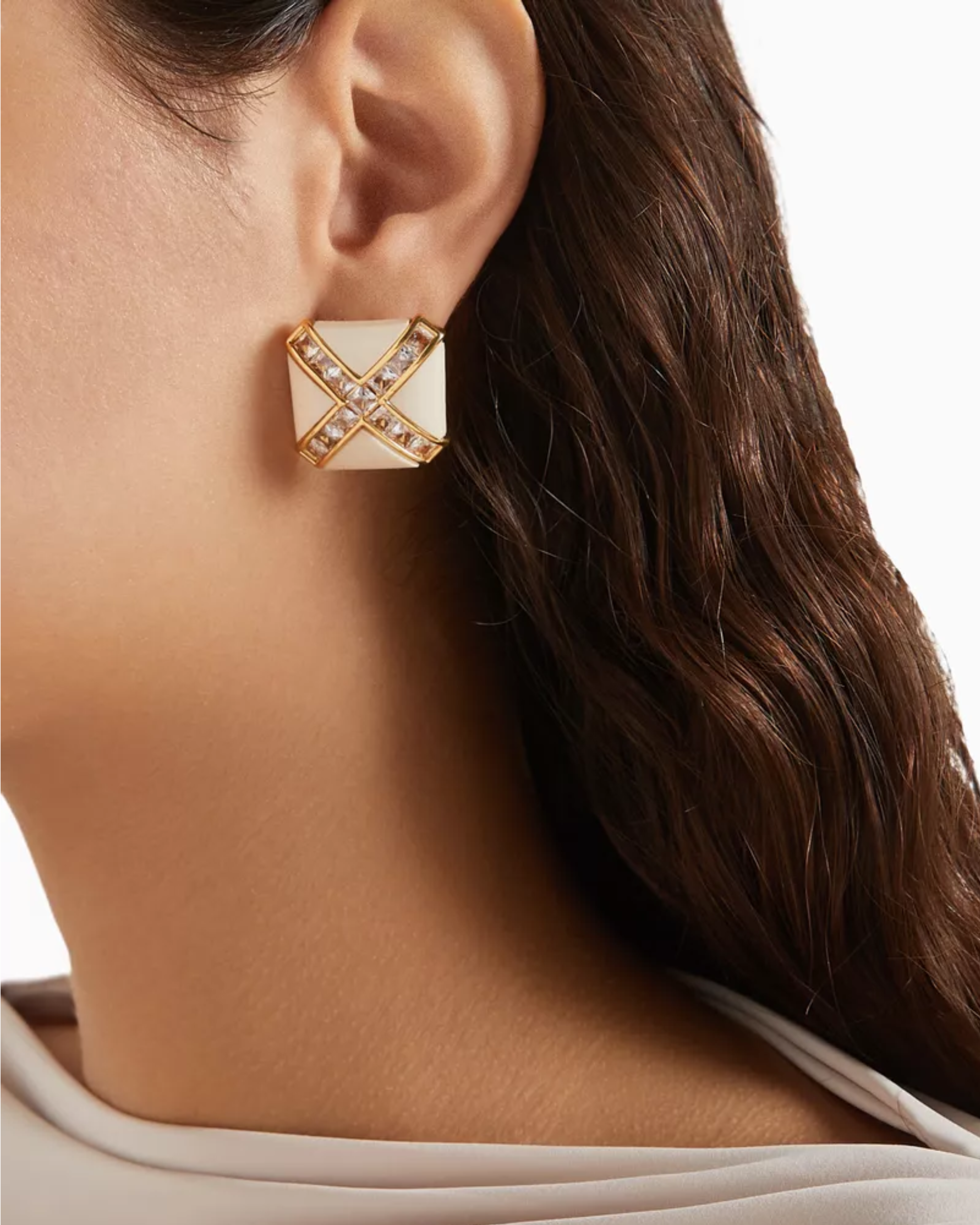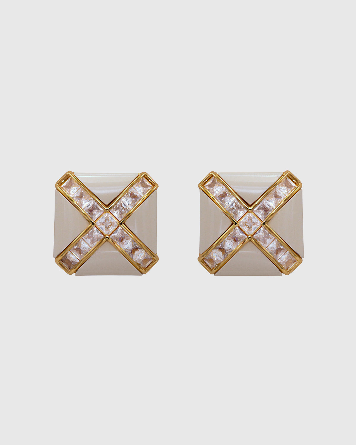 Set of square shaped resin and gold earrings with crystal stones. Made with premium 18k gold-plated brass.