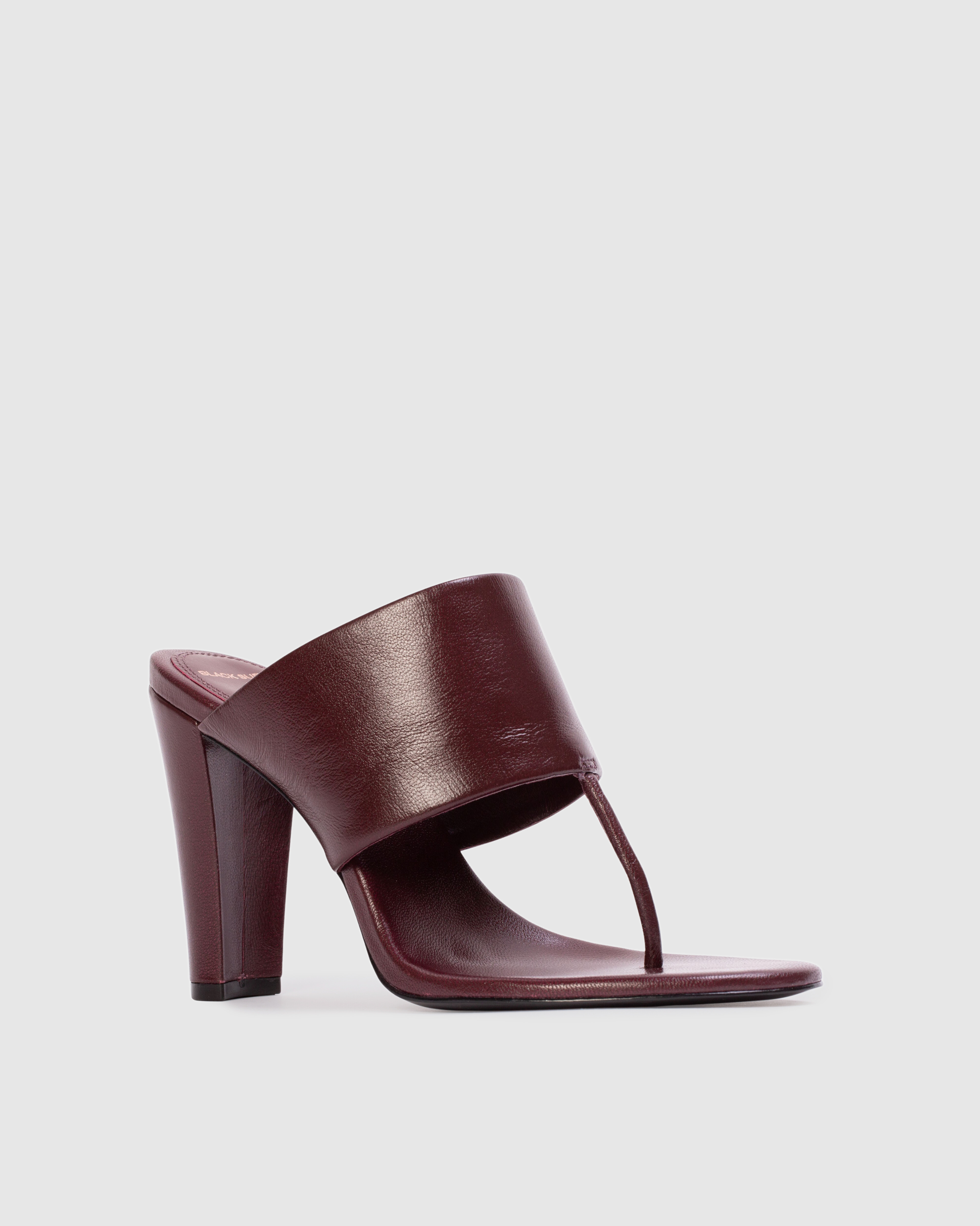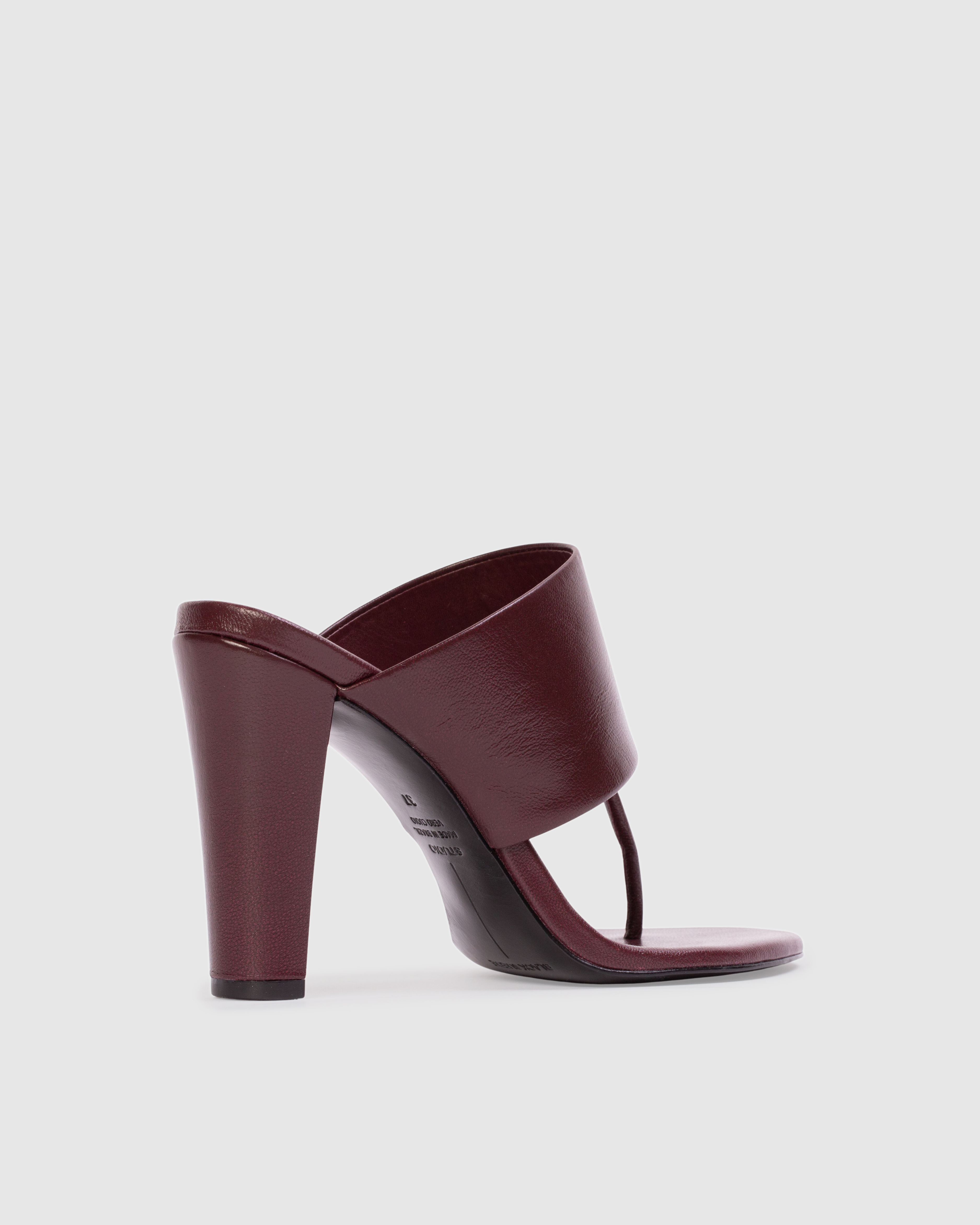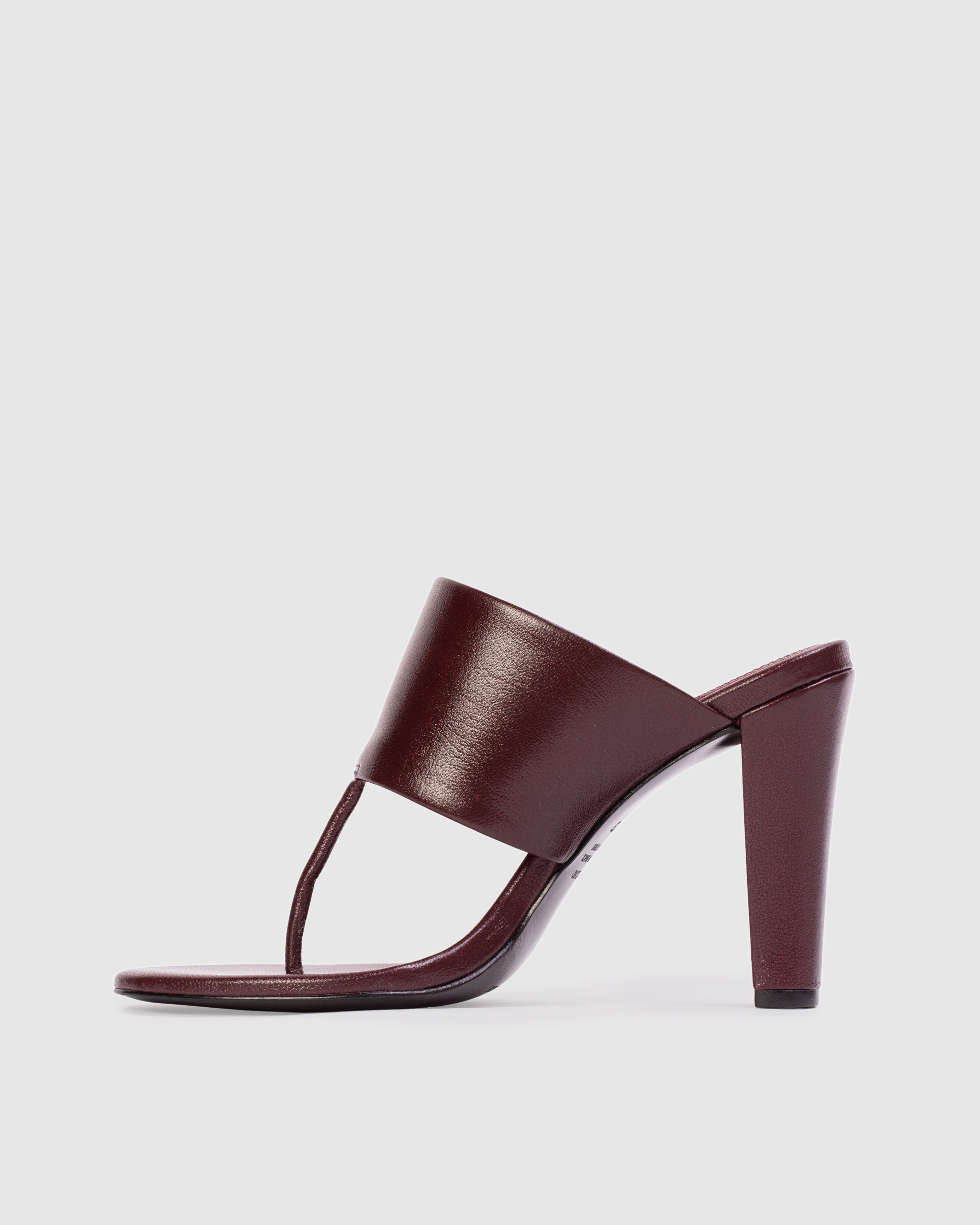 Round toe tong mule, set on a sleek structured block heel. Made with smooth goat leather.