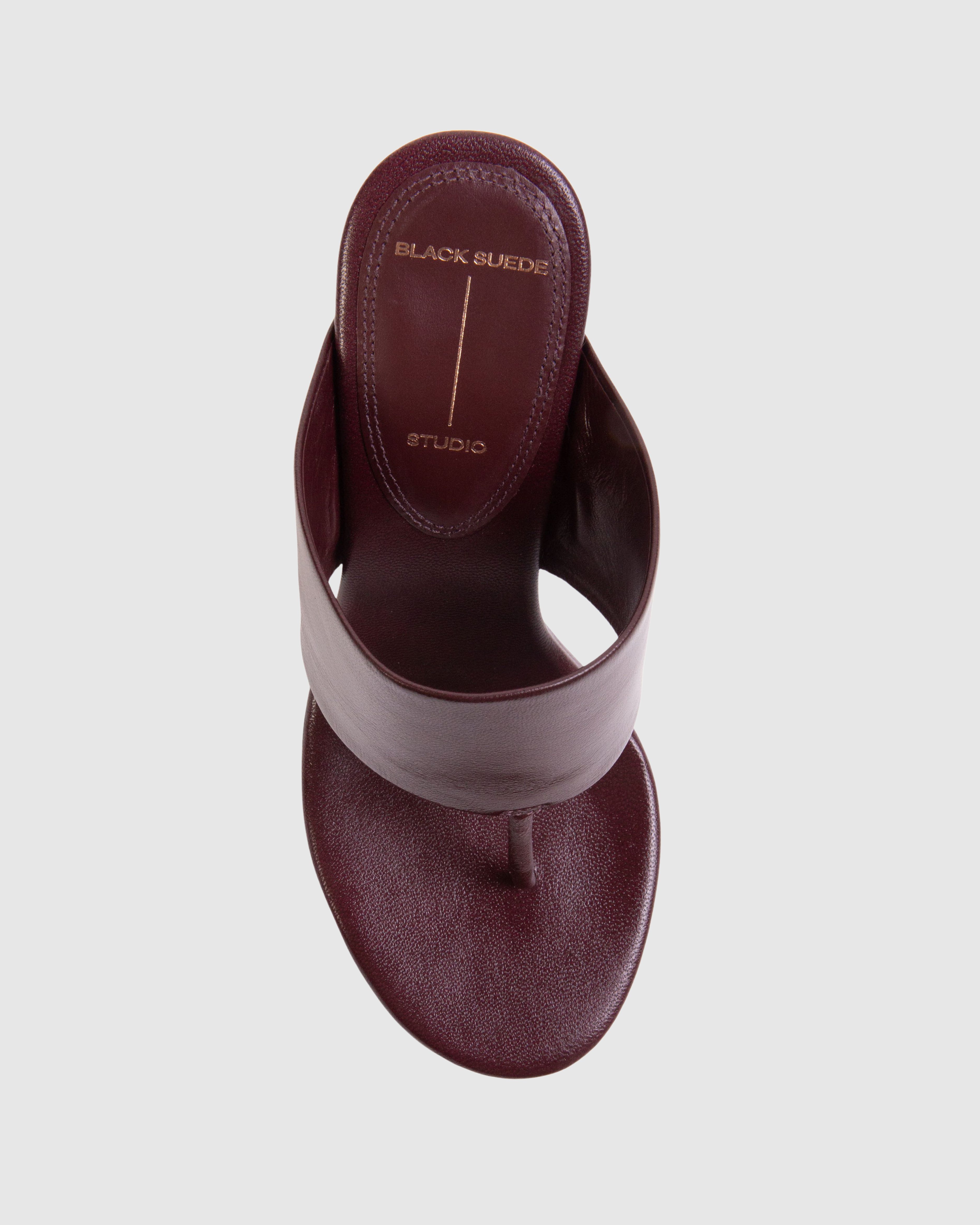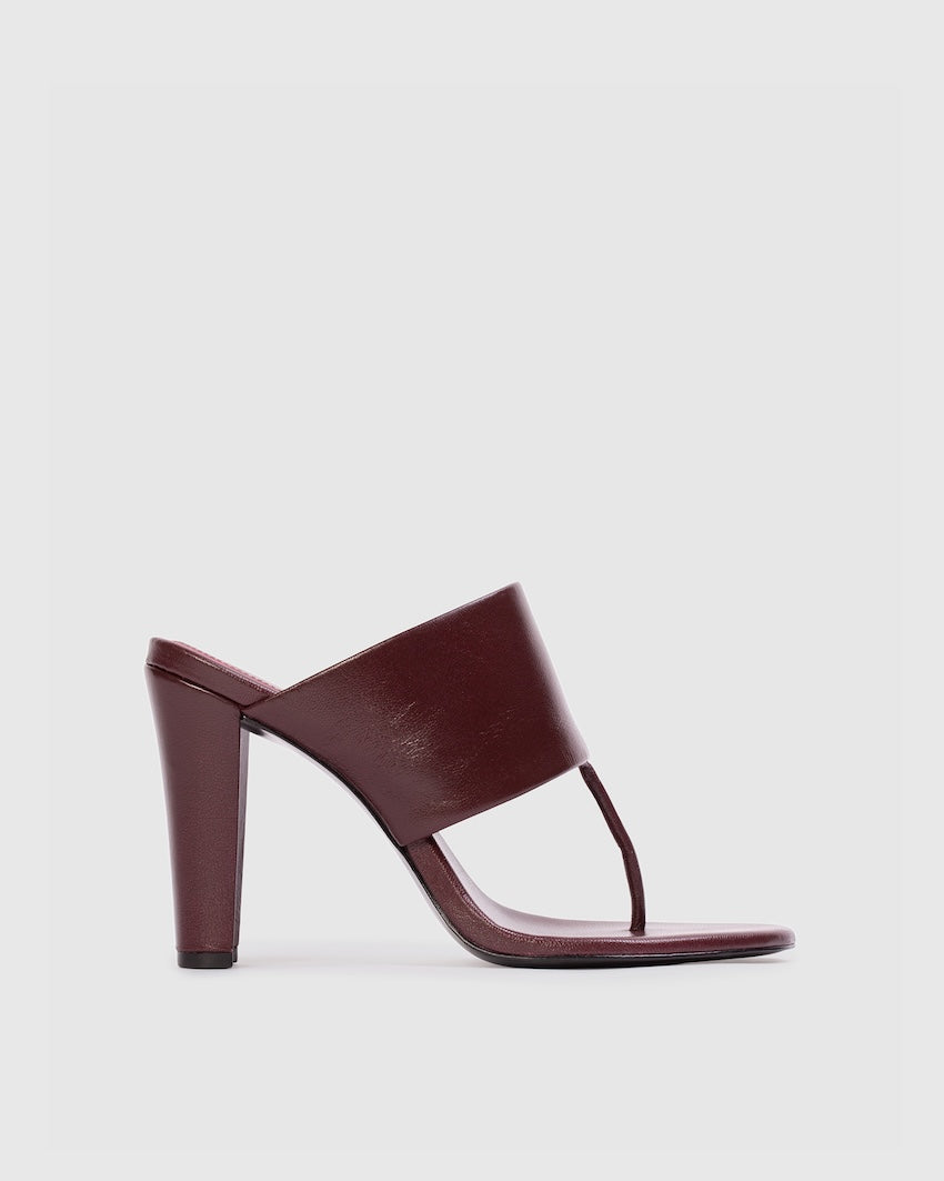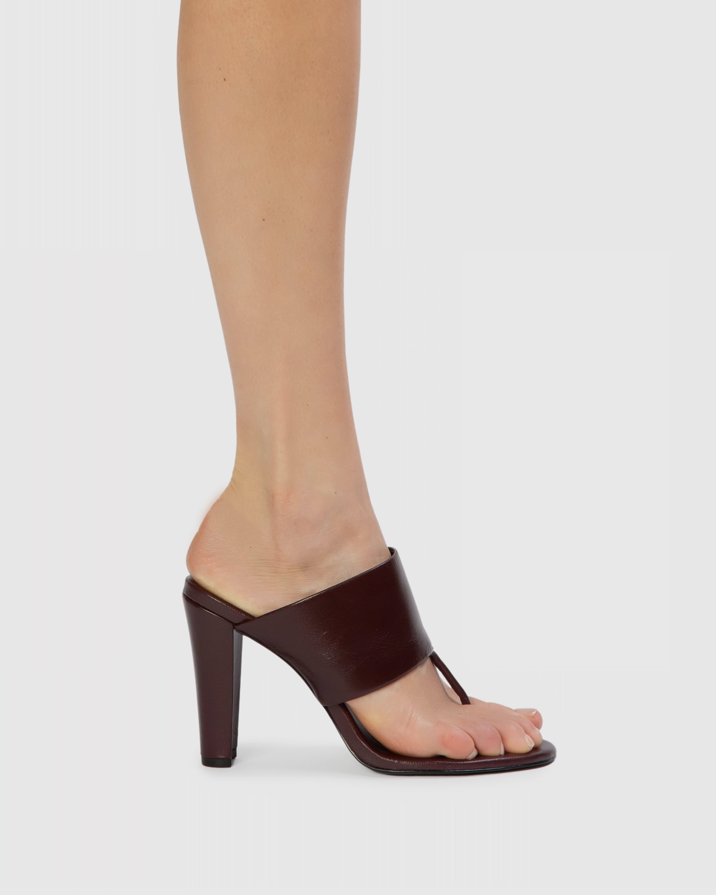 Round toe tong mule, set on a sleek structured block heel. Made with smooth goat leather.