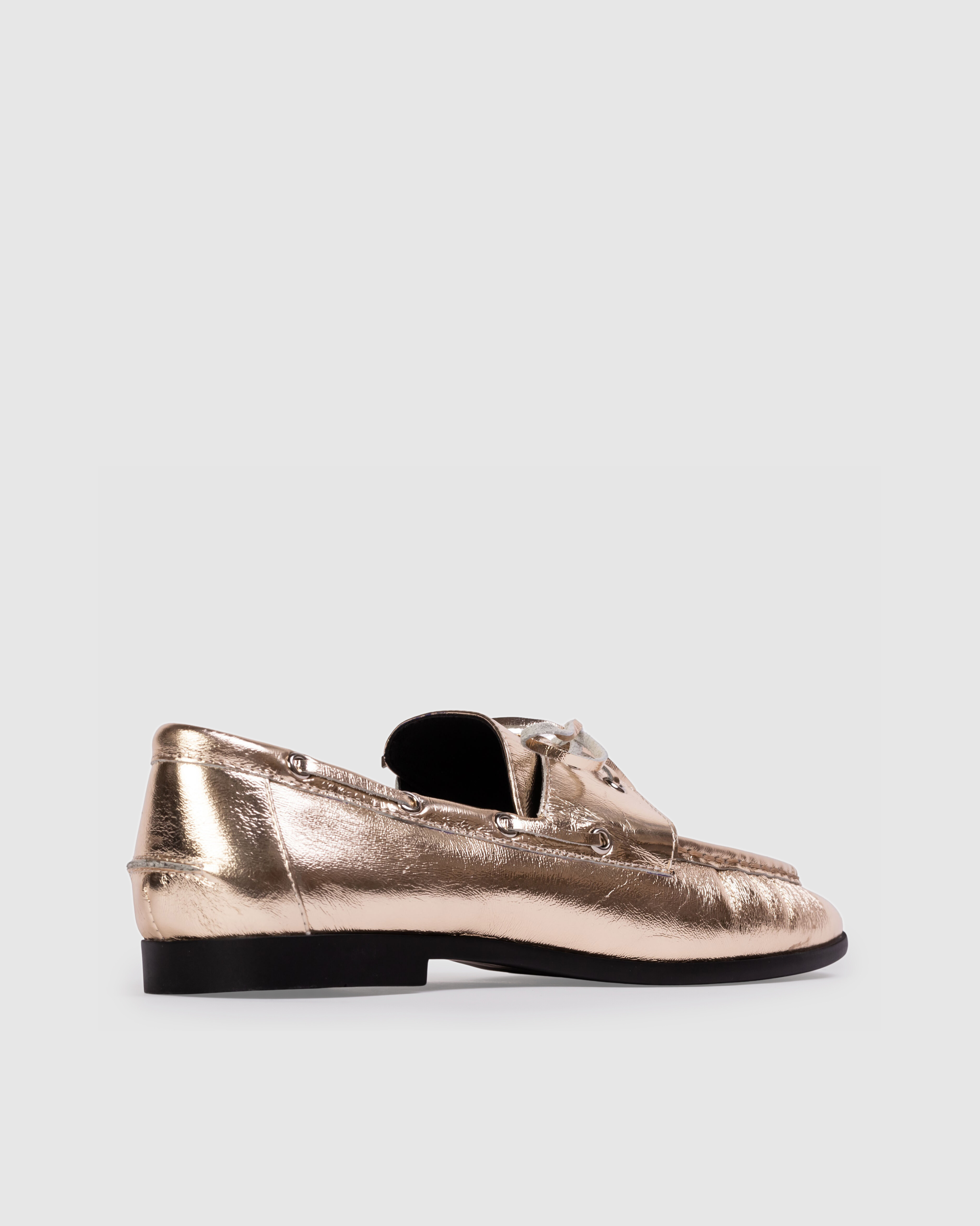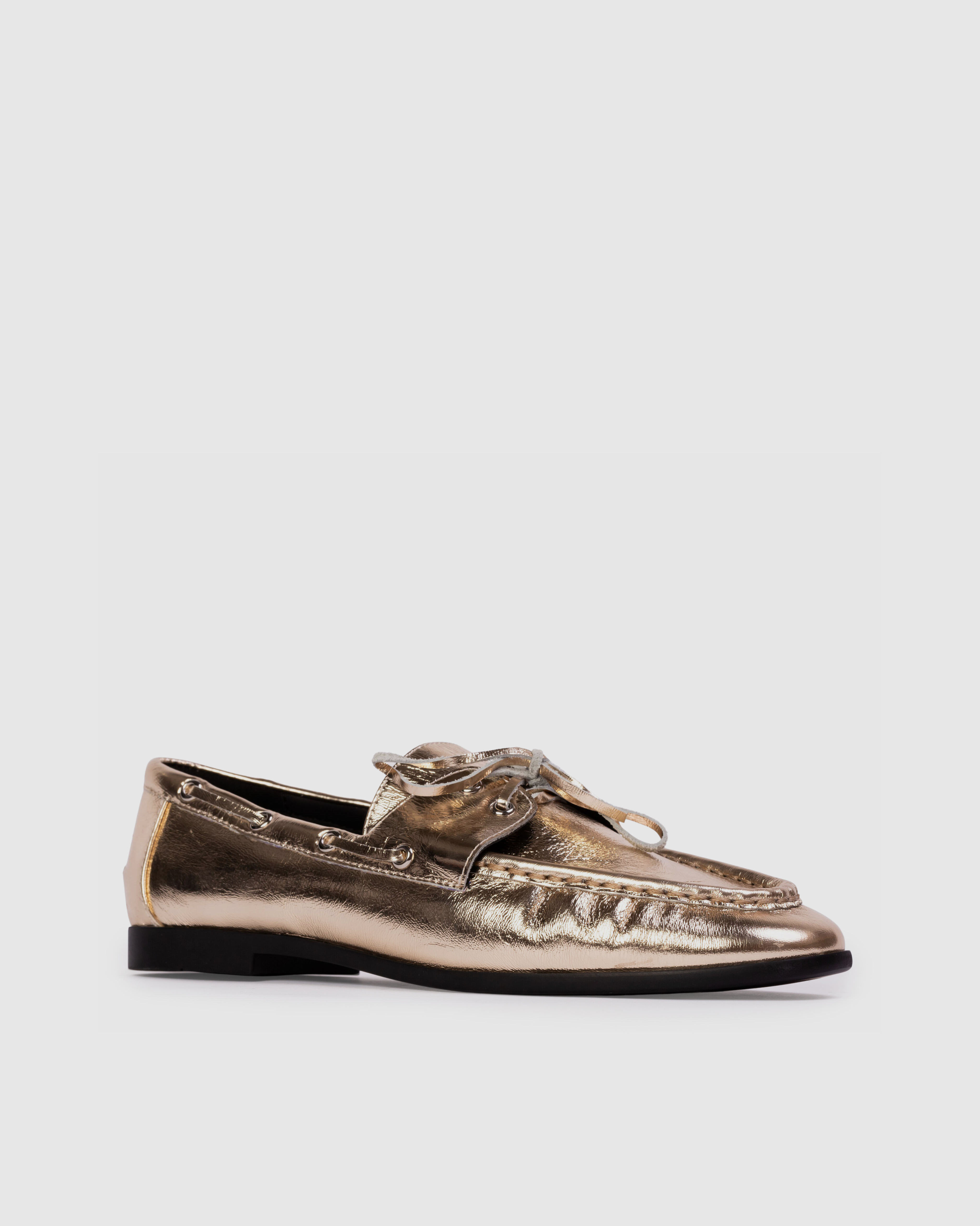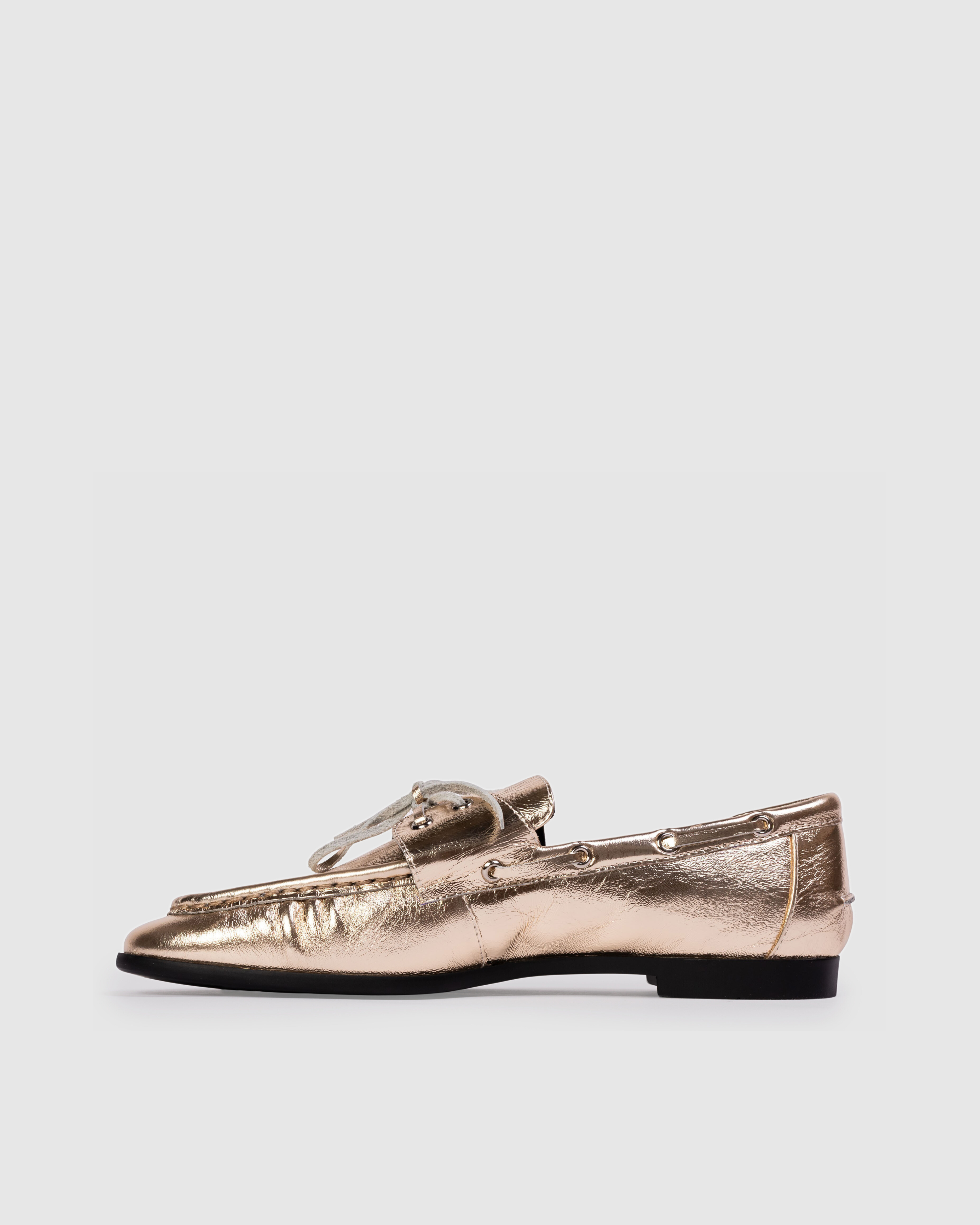 Round toe boat shoe loafer, made with crinkled calf leather.