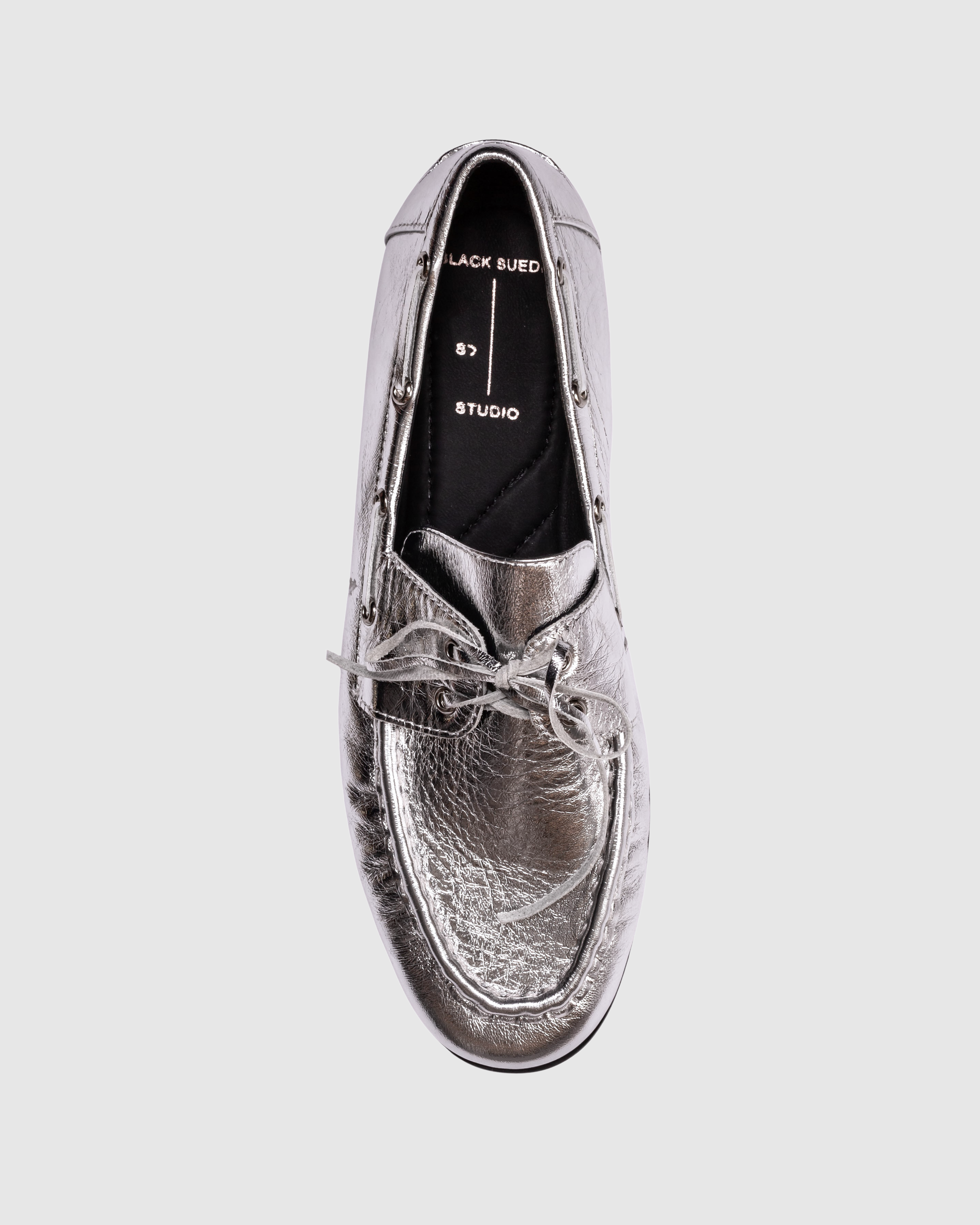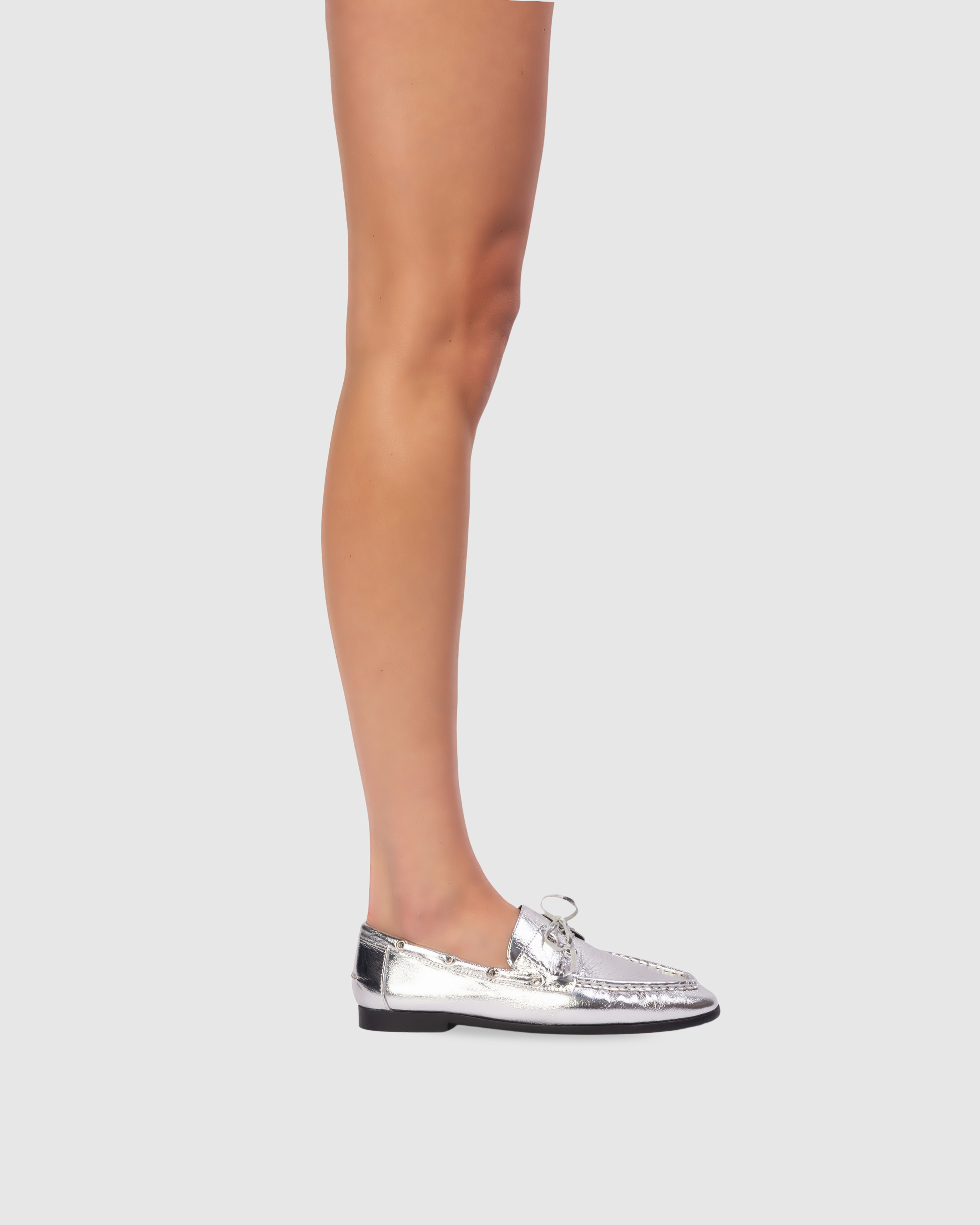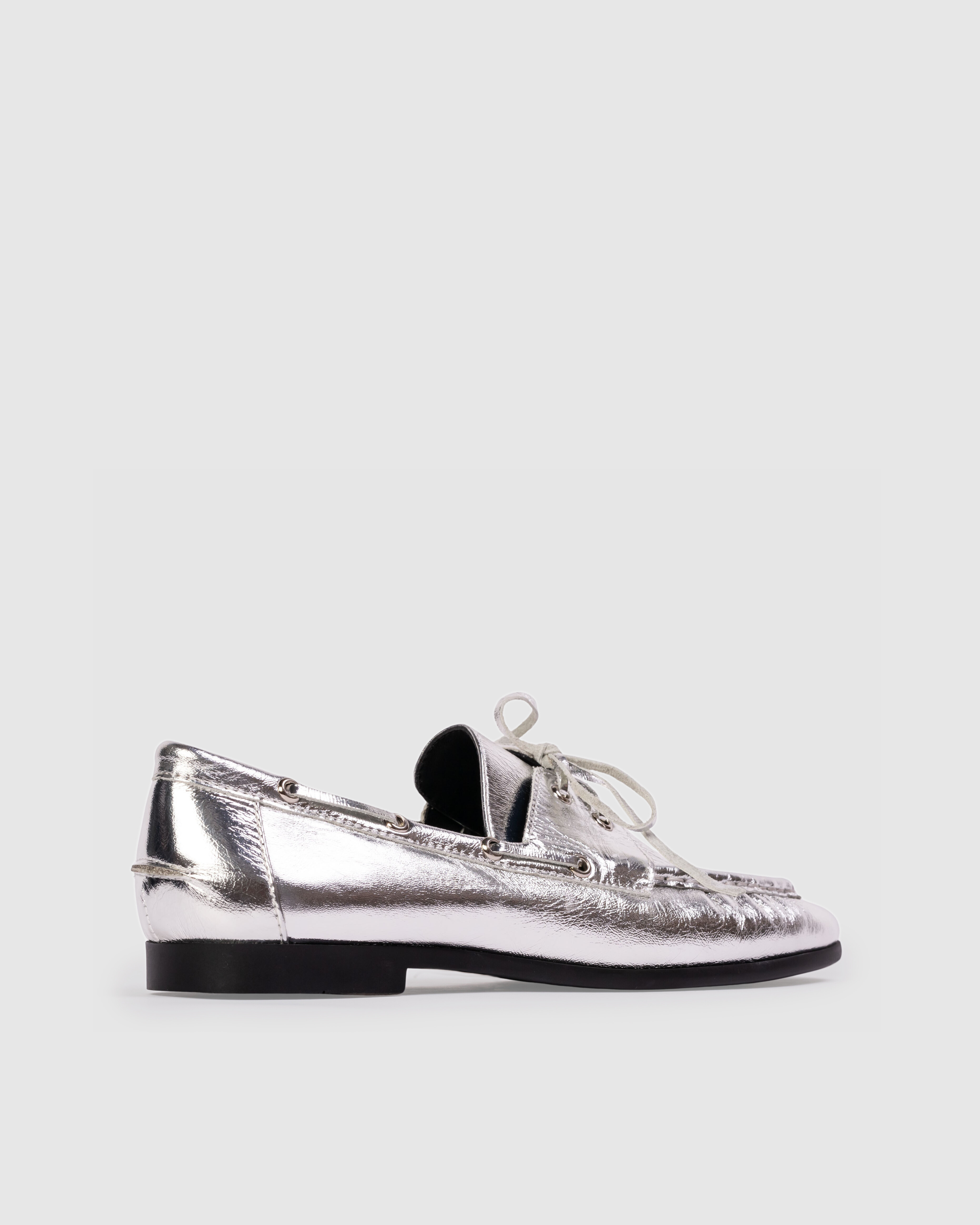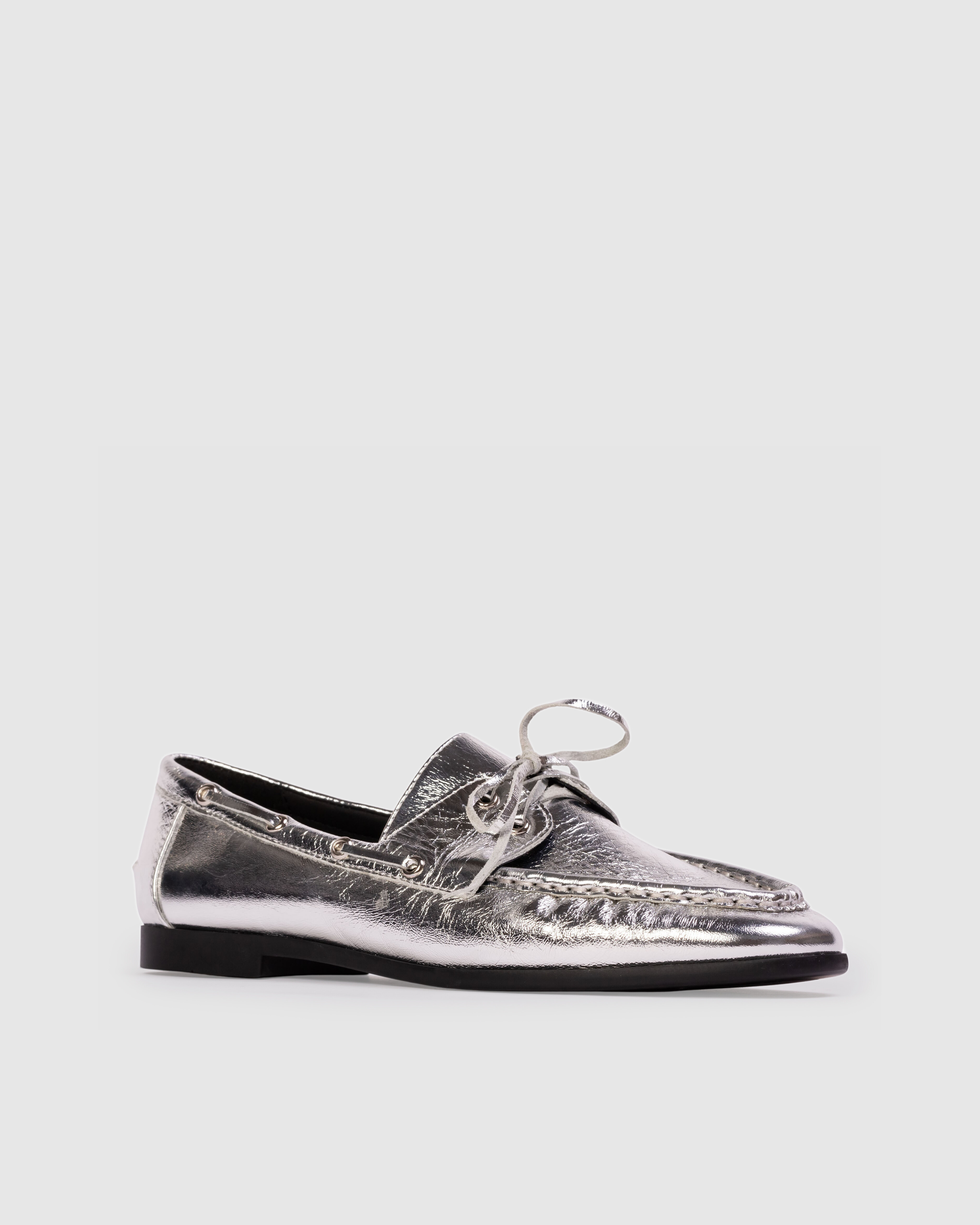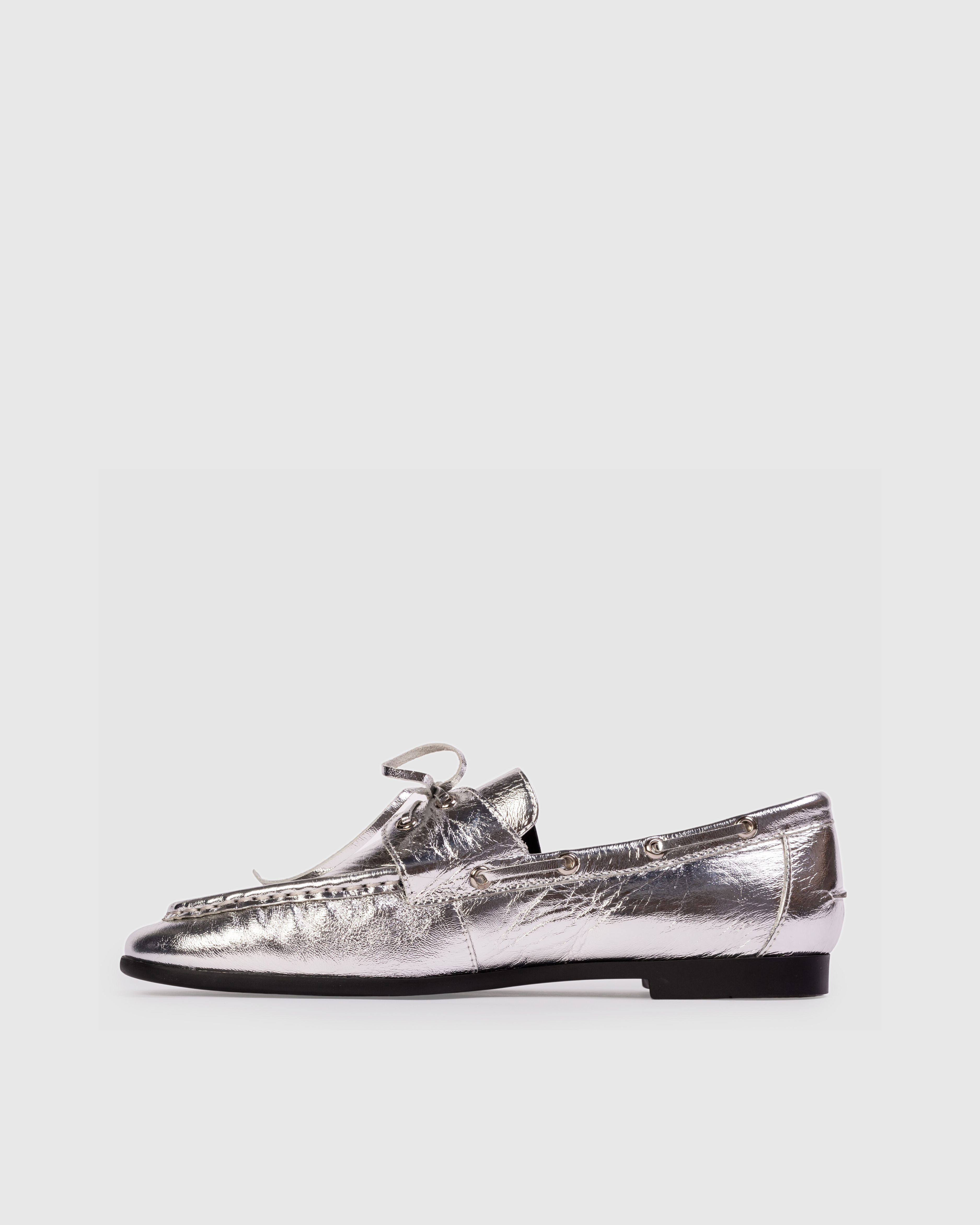 Round toe boat shoe loafer, made with crinkled calf leather.