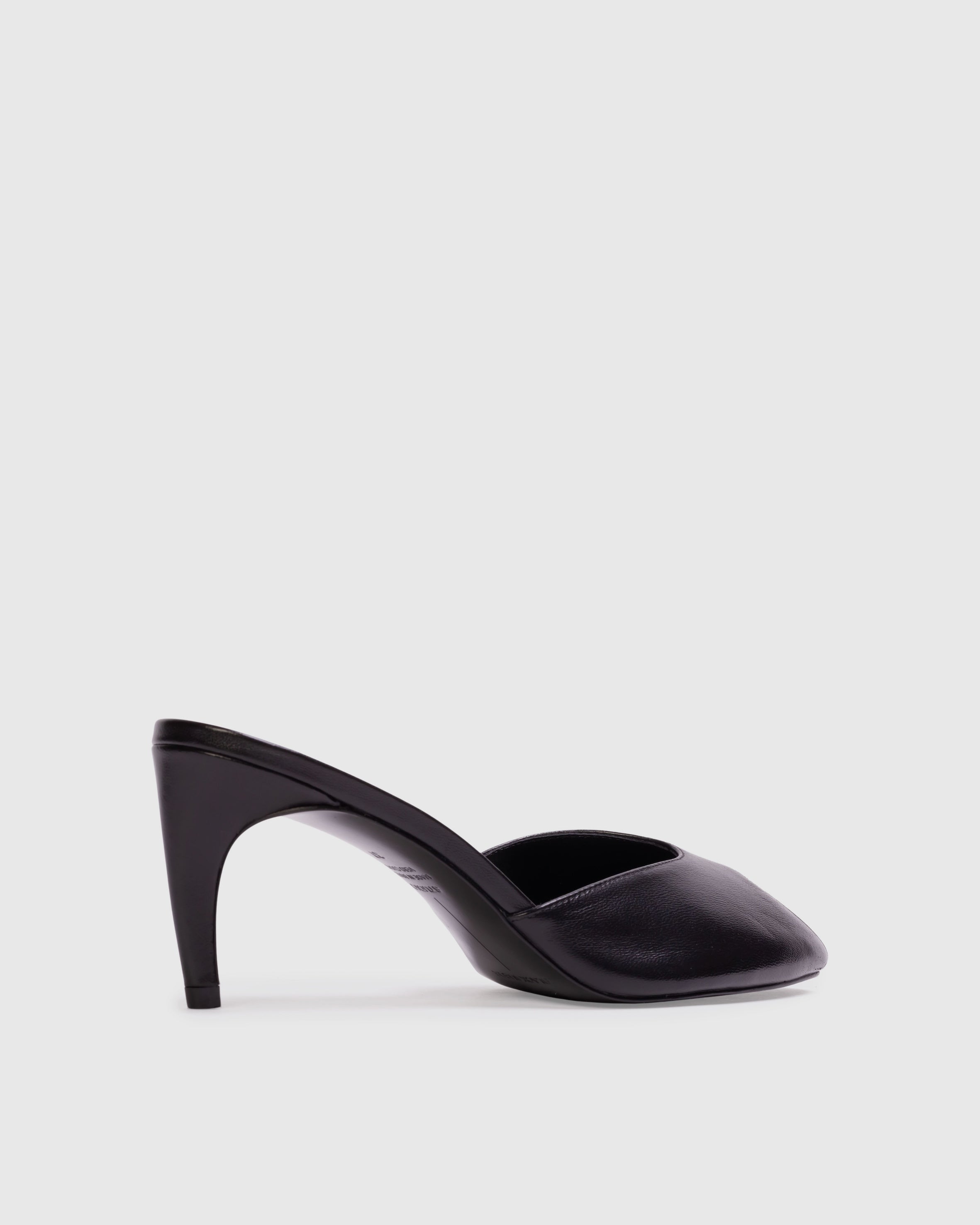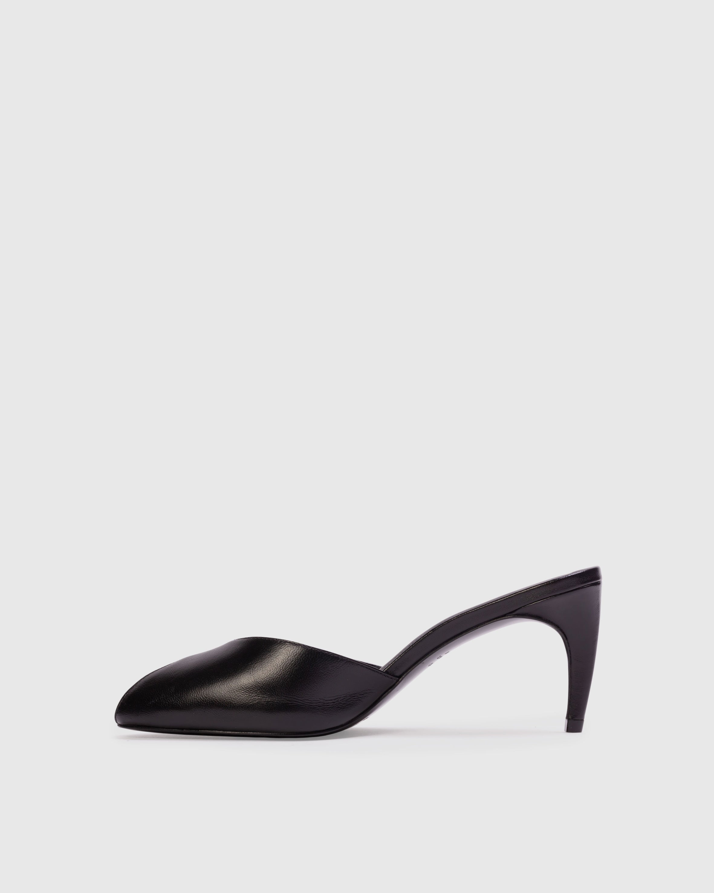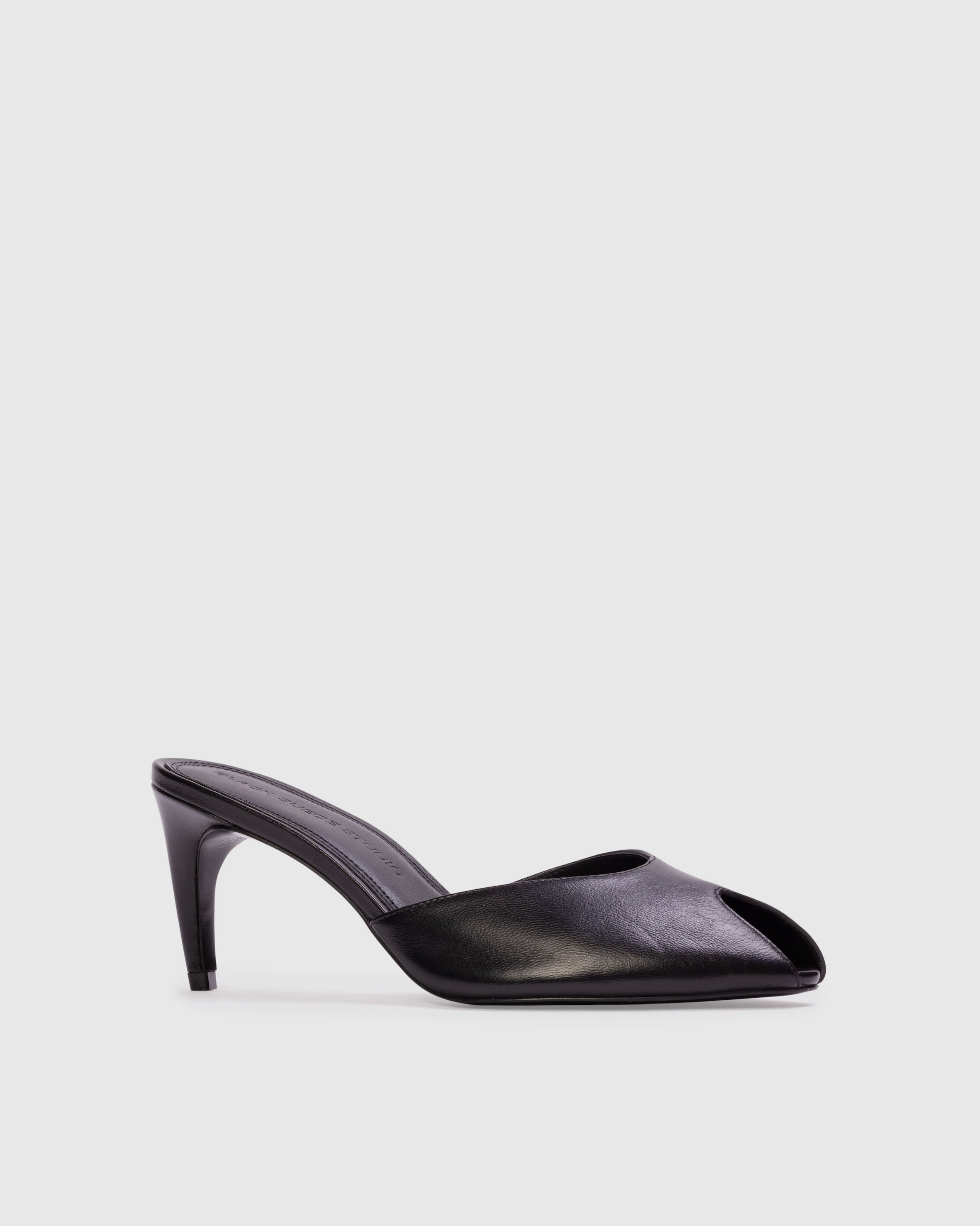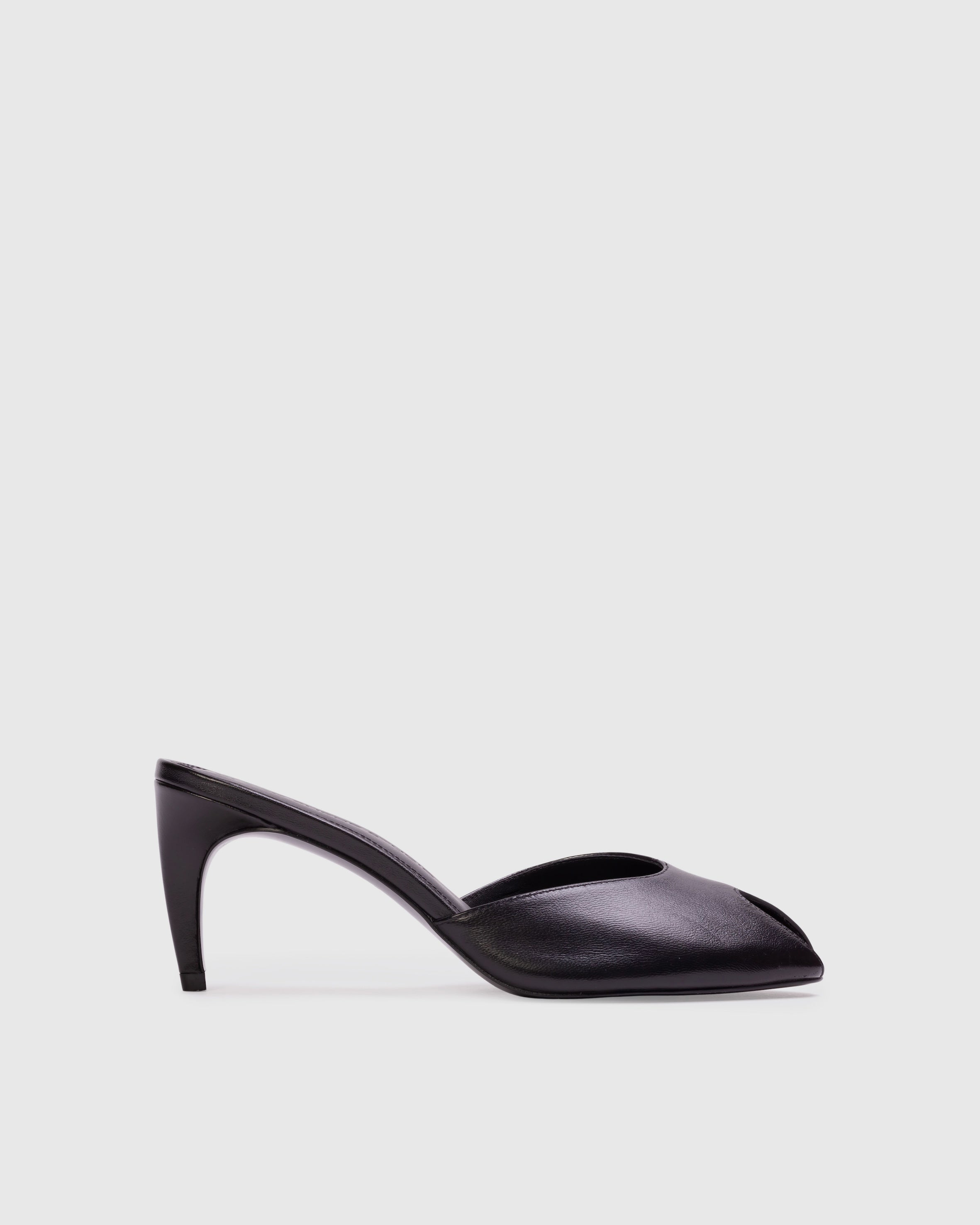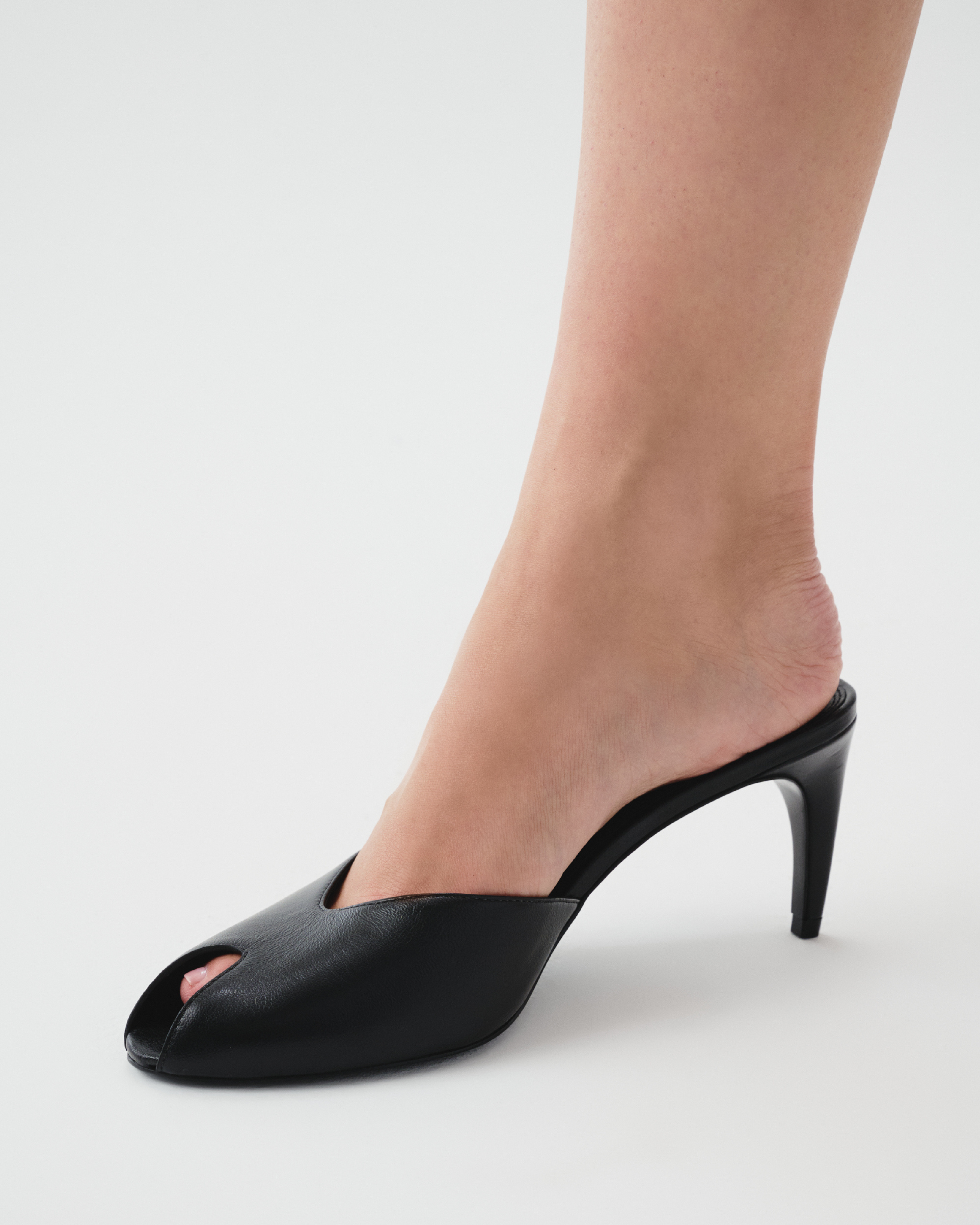 Almond peep toe mule, set on a c-curve mid heel. made with smooth buffed leather.