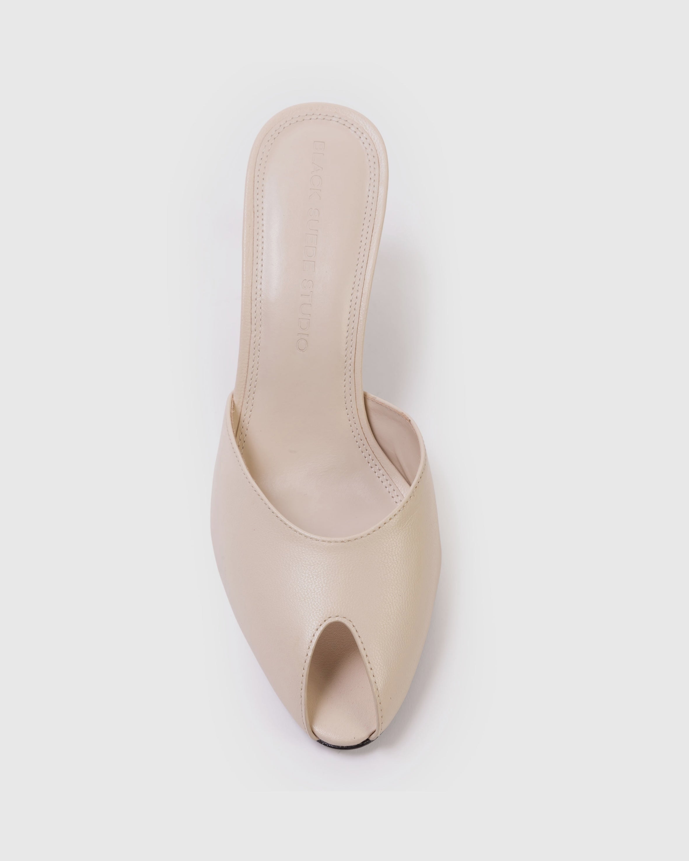 Almond peep toe mule, set on a c-curve mid heel. made with smooth buffed leather.
