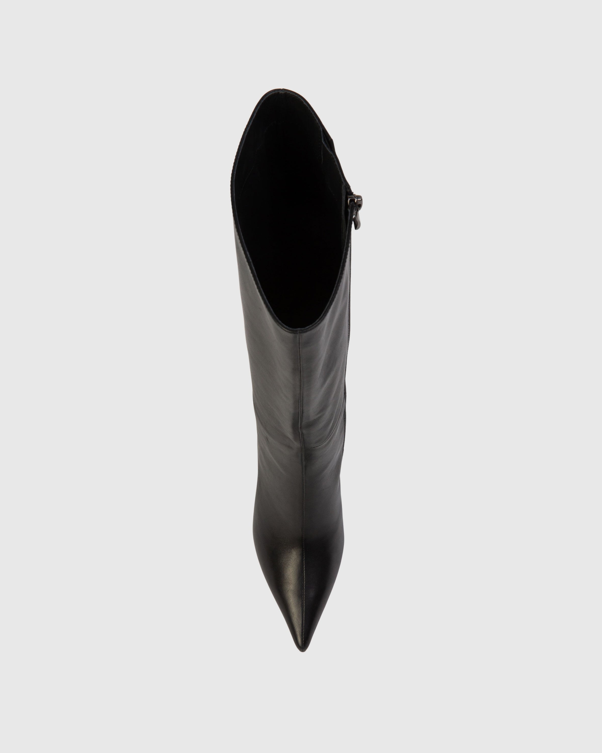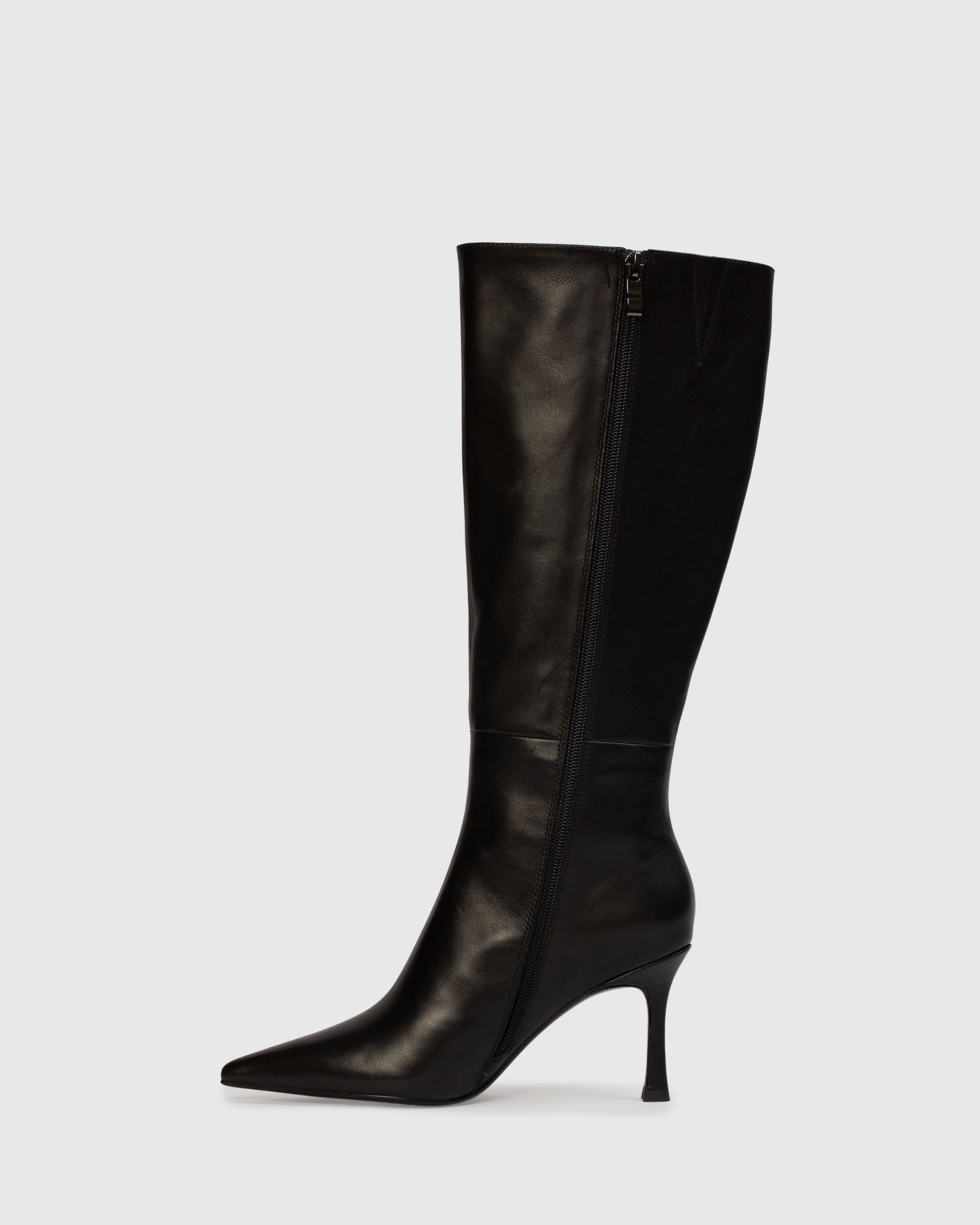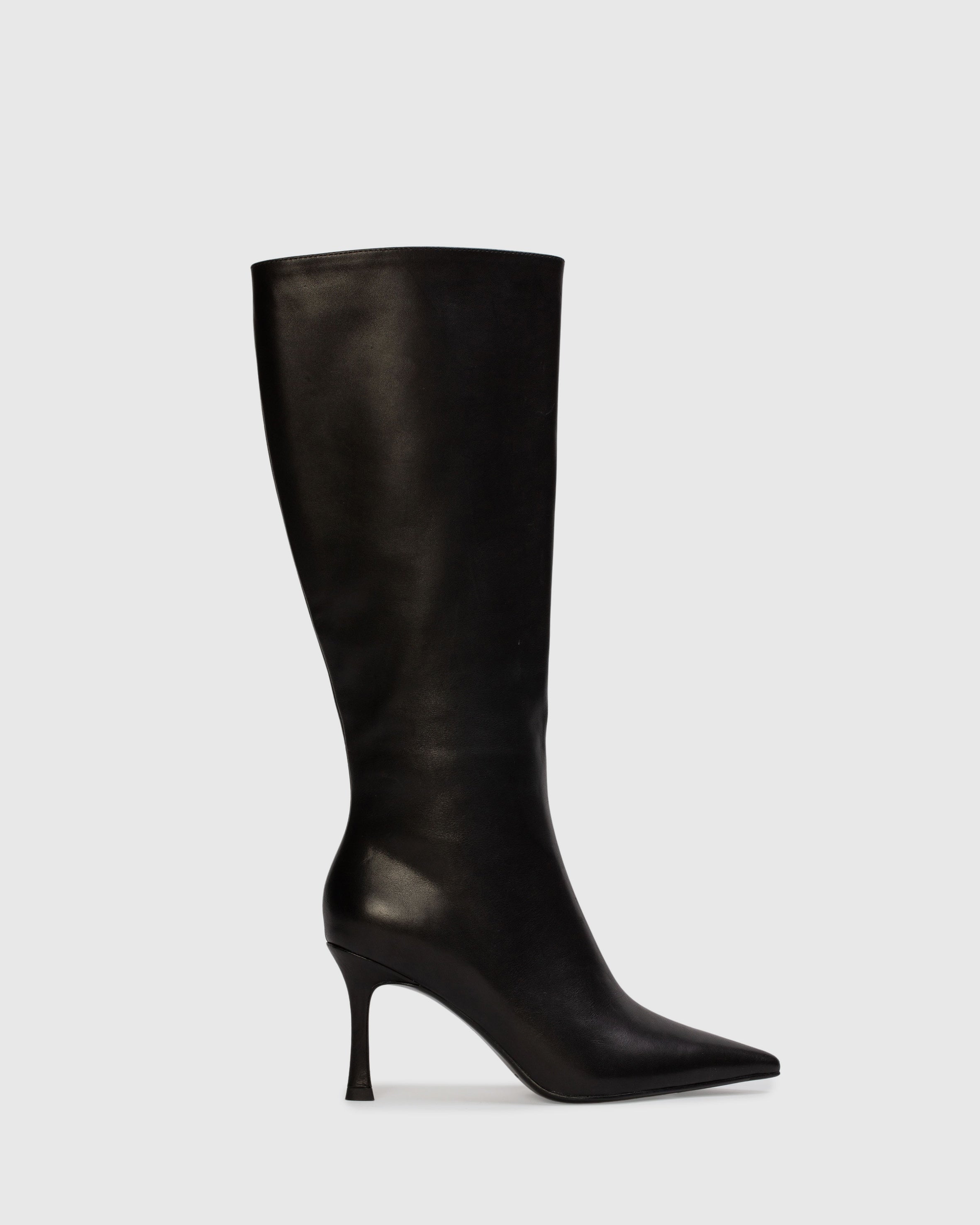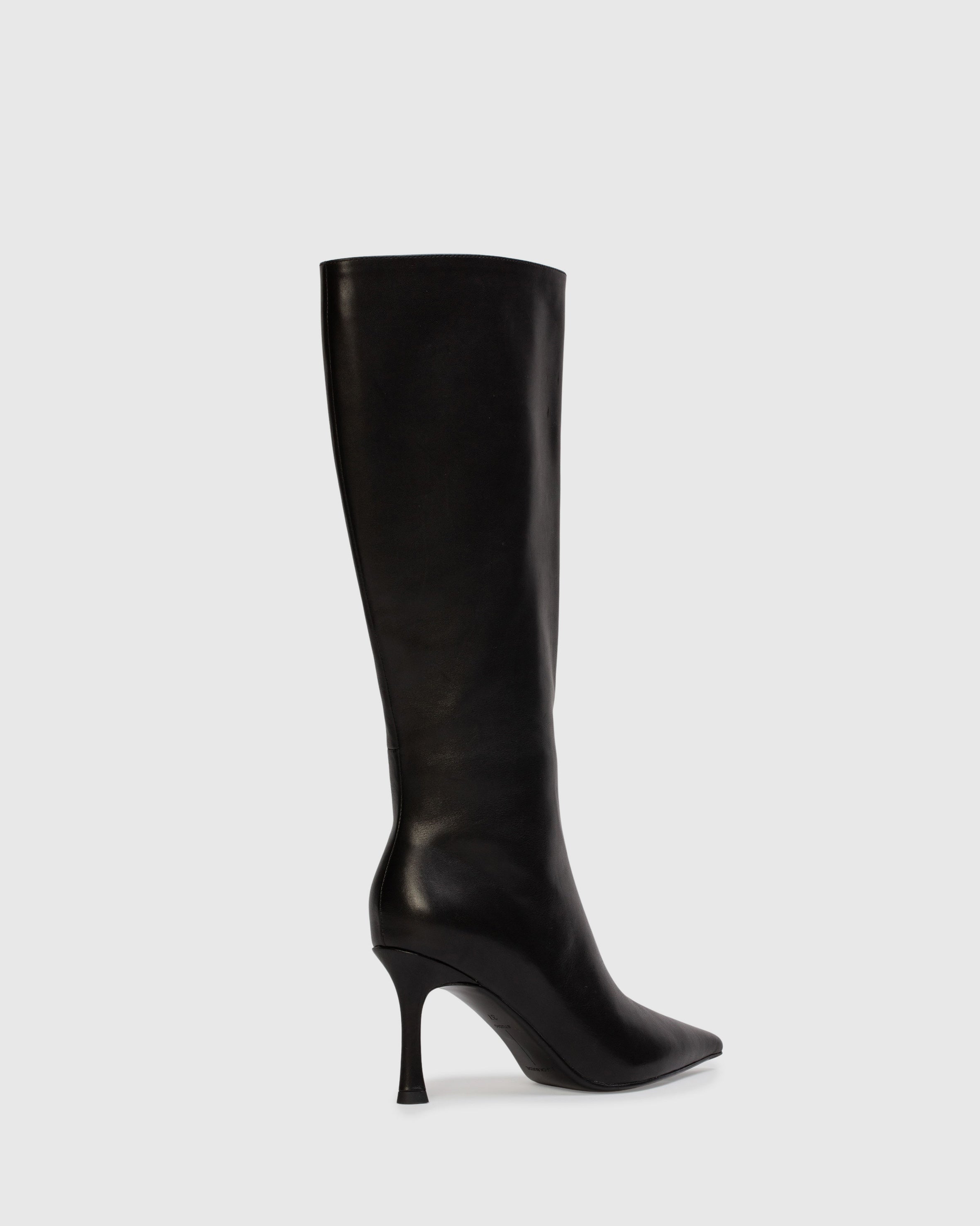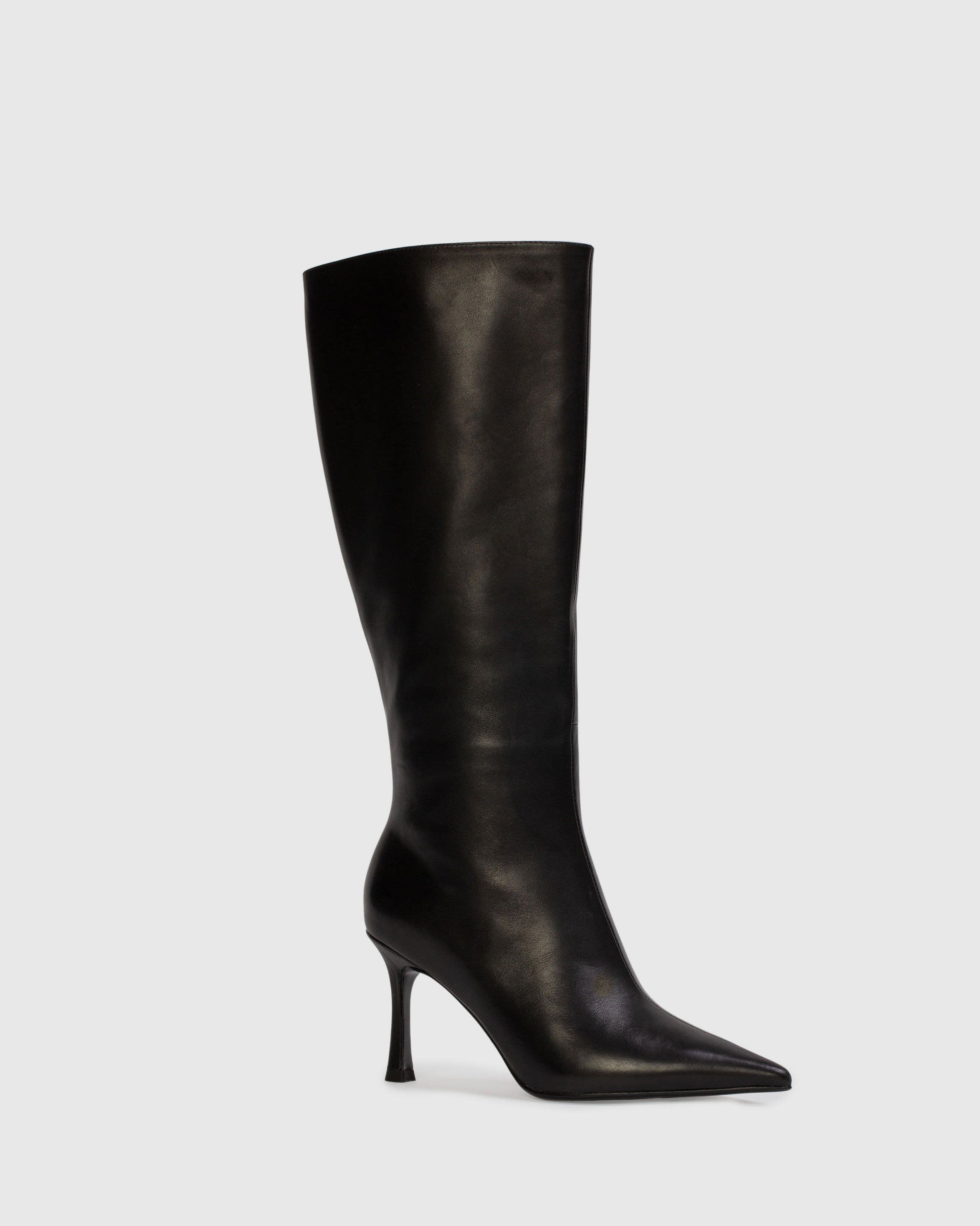 Pointy toe classic below the pull-on boot, set on a traditional high heel. Made with smooth buffed leather.