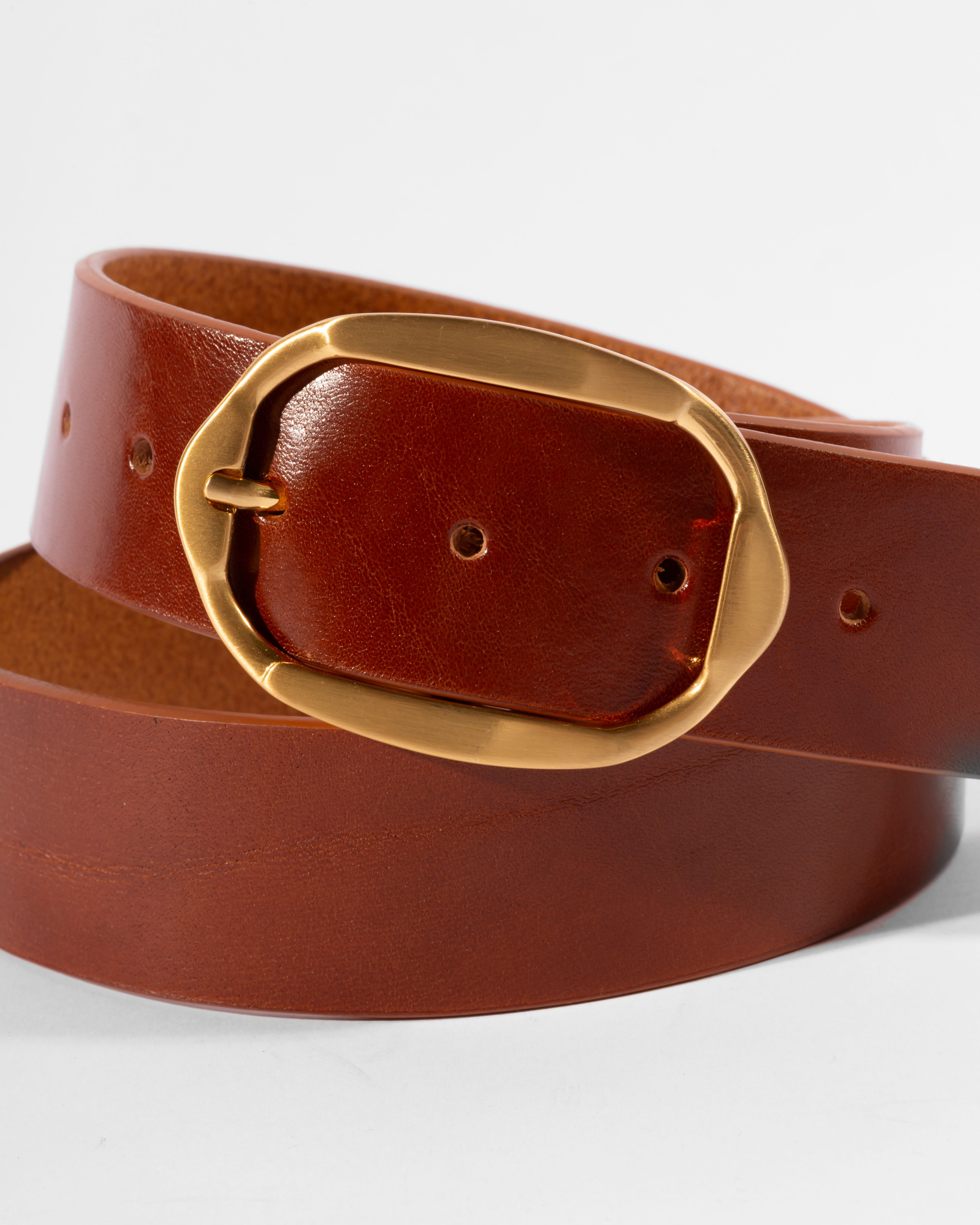 18k gold plated brass cylinder shaped buckle. Secured on a smooth buffed leather strap.