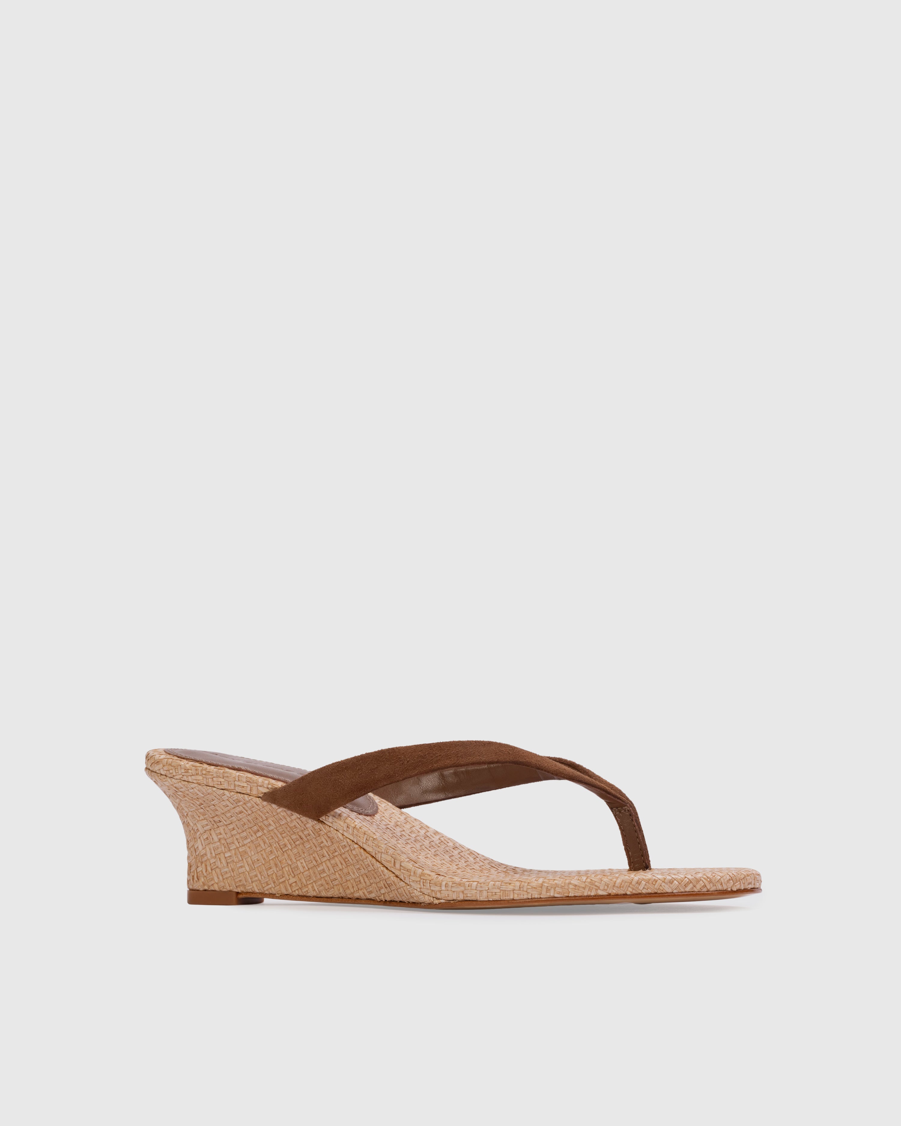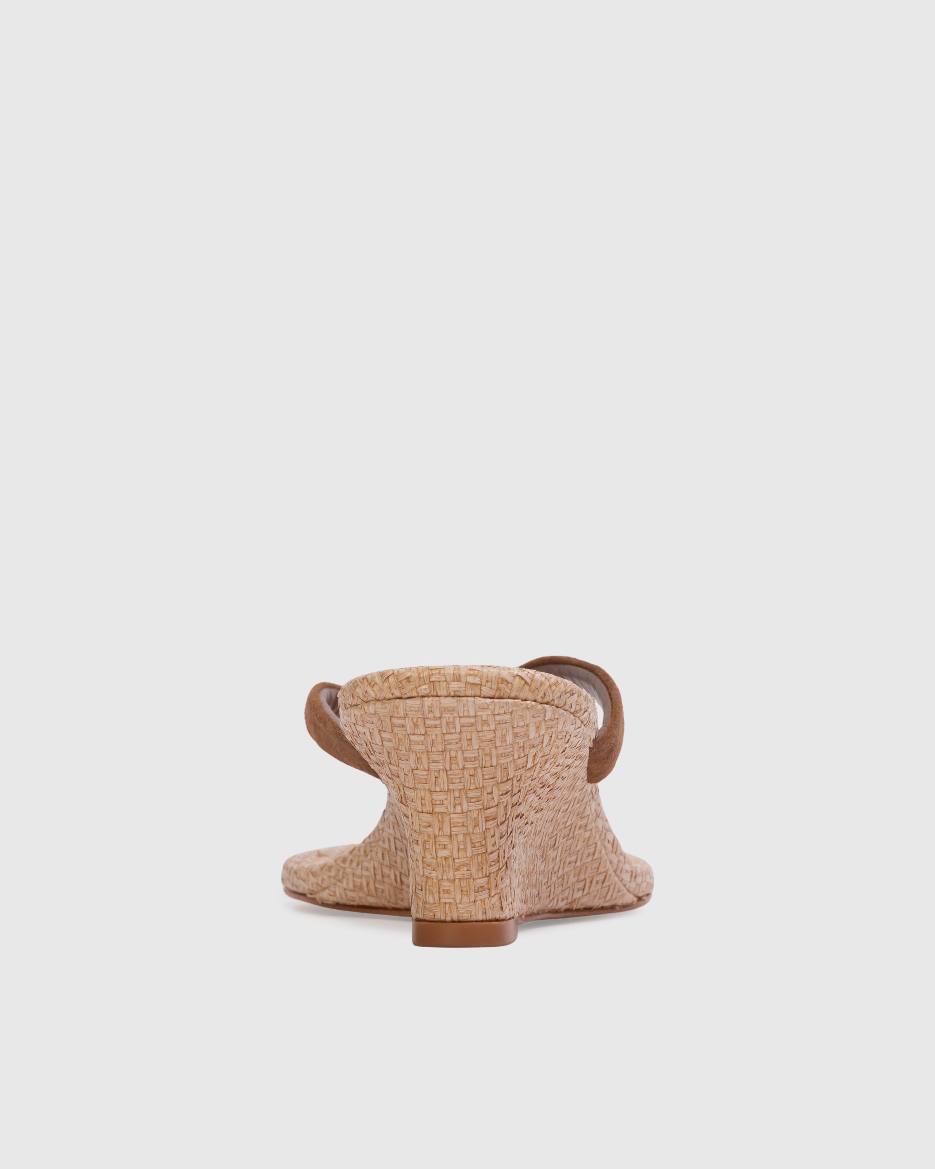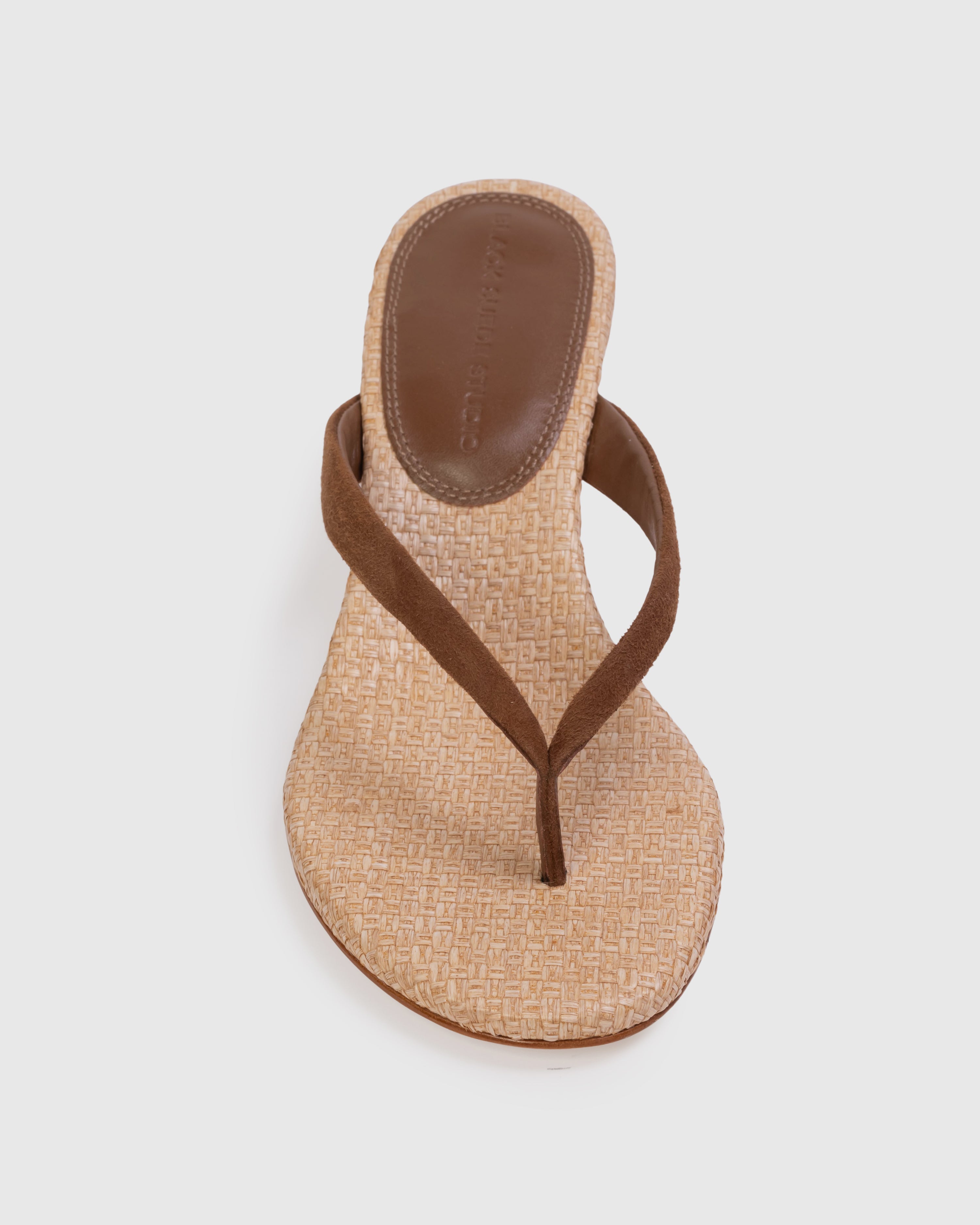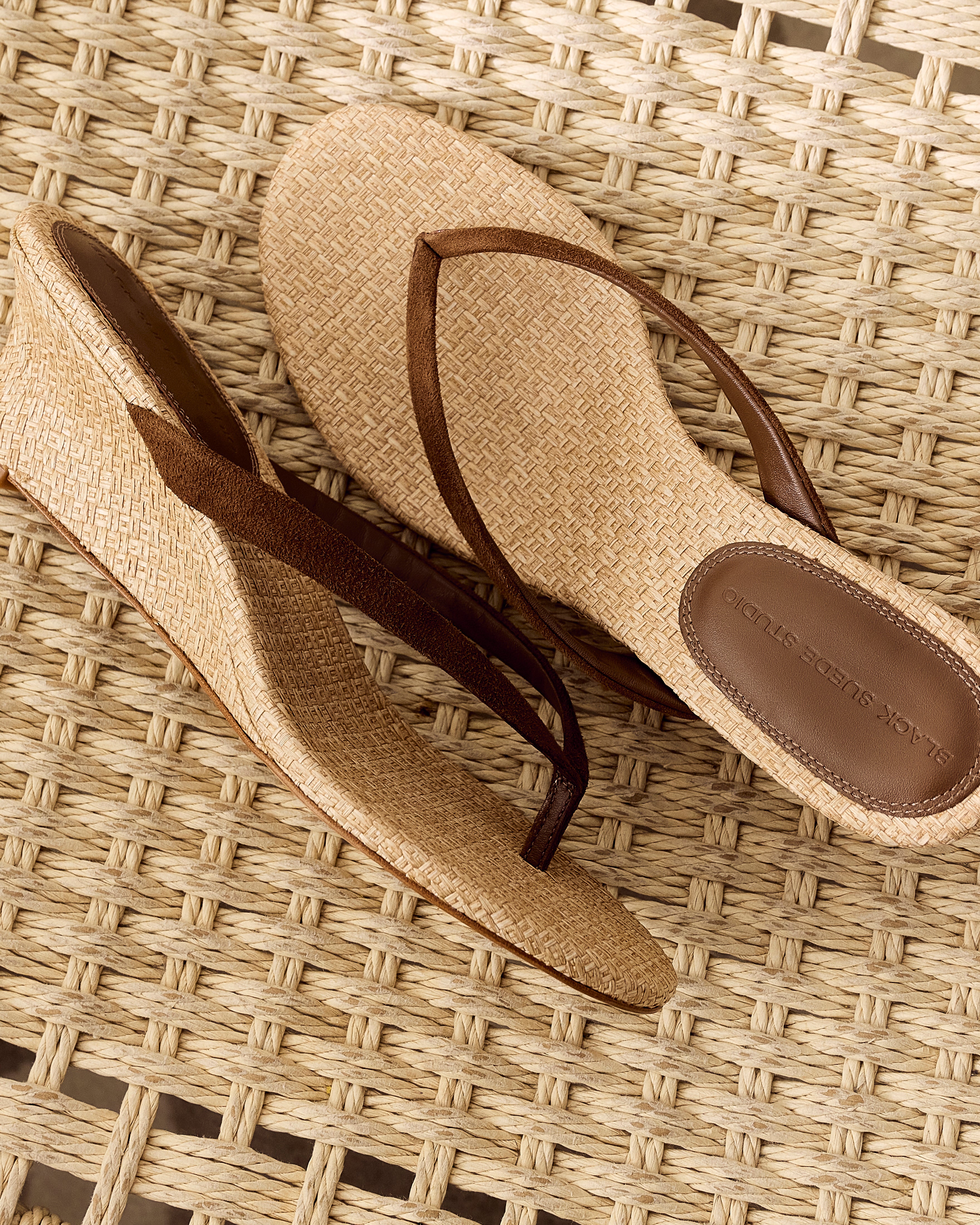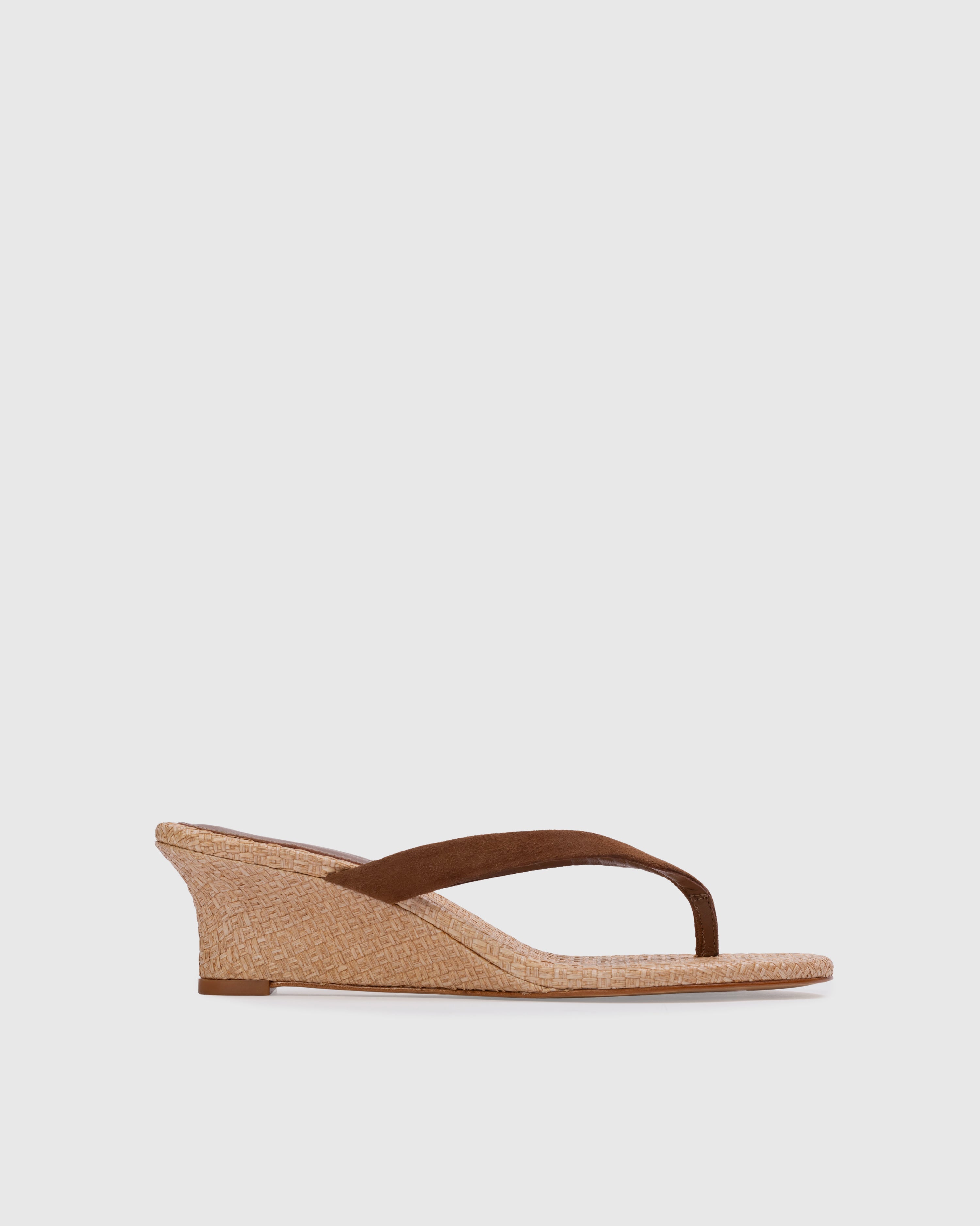 Micro wedge thong mule, set on minimalist curved wedge. Made with raffia and brushed kid suede.