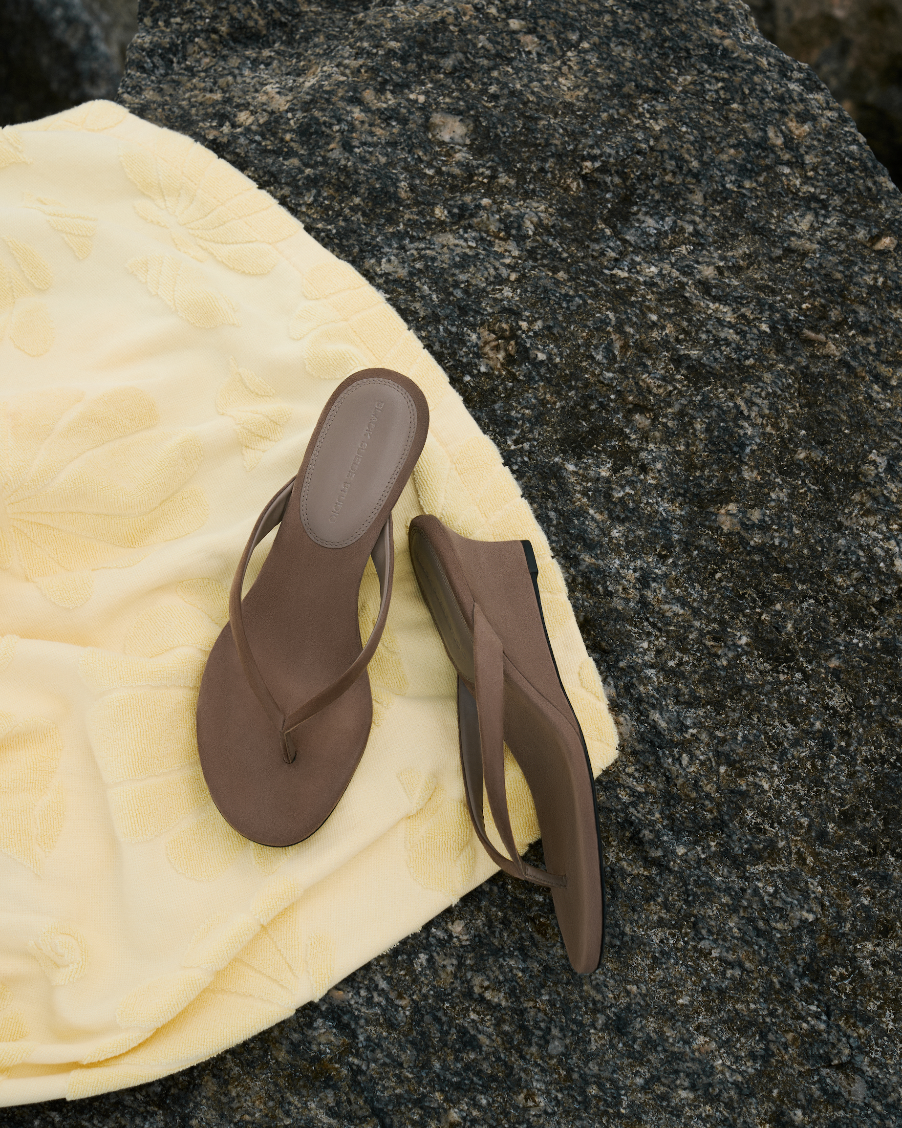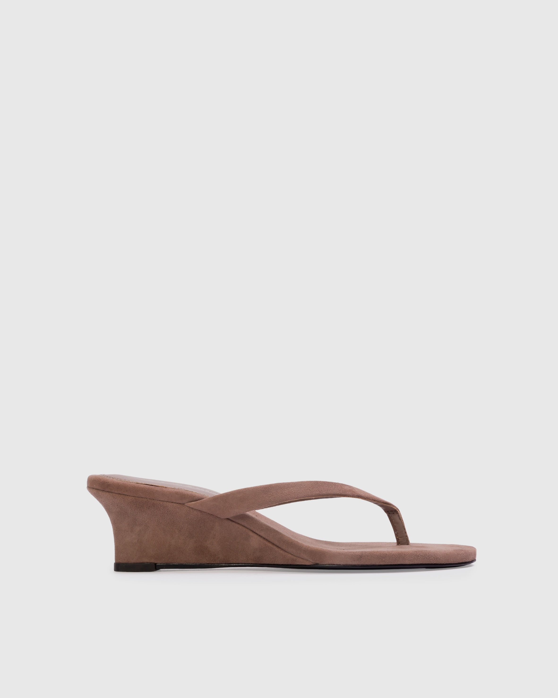 Micro wedge thong mule, set on minimalist curved wedge. Made with brushed kid suede.