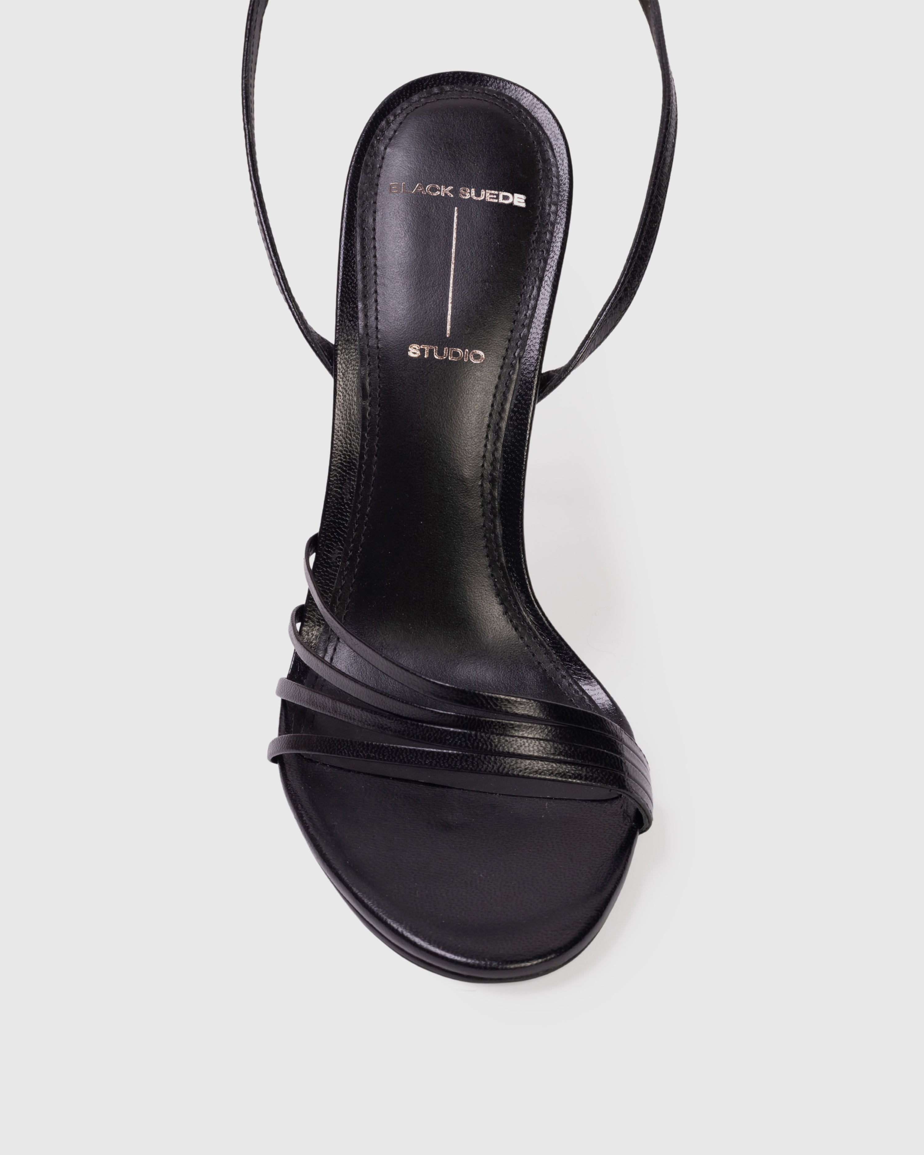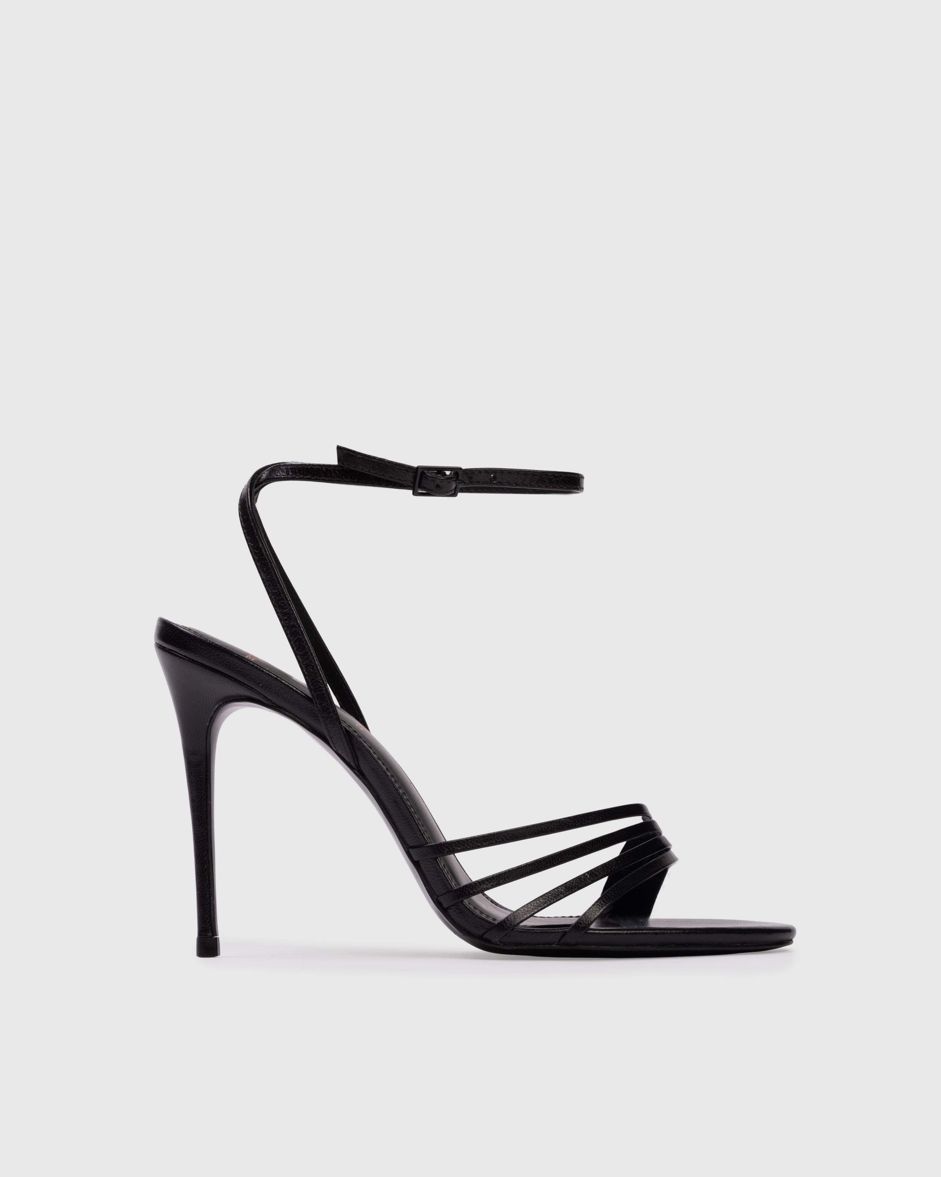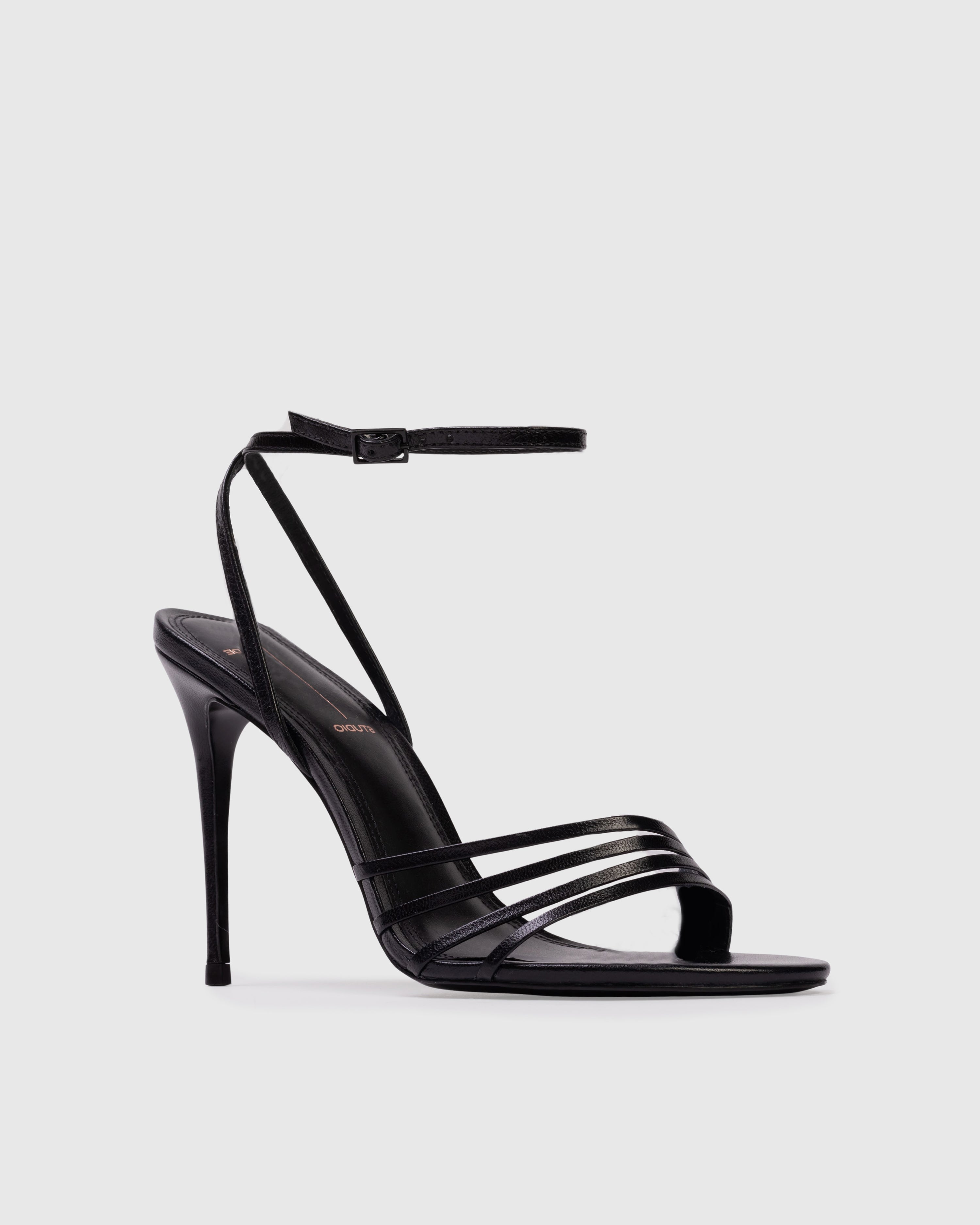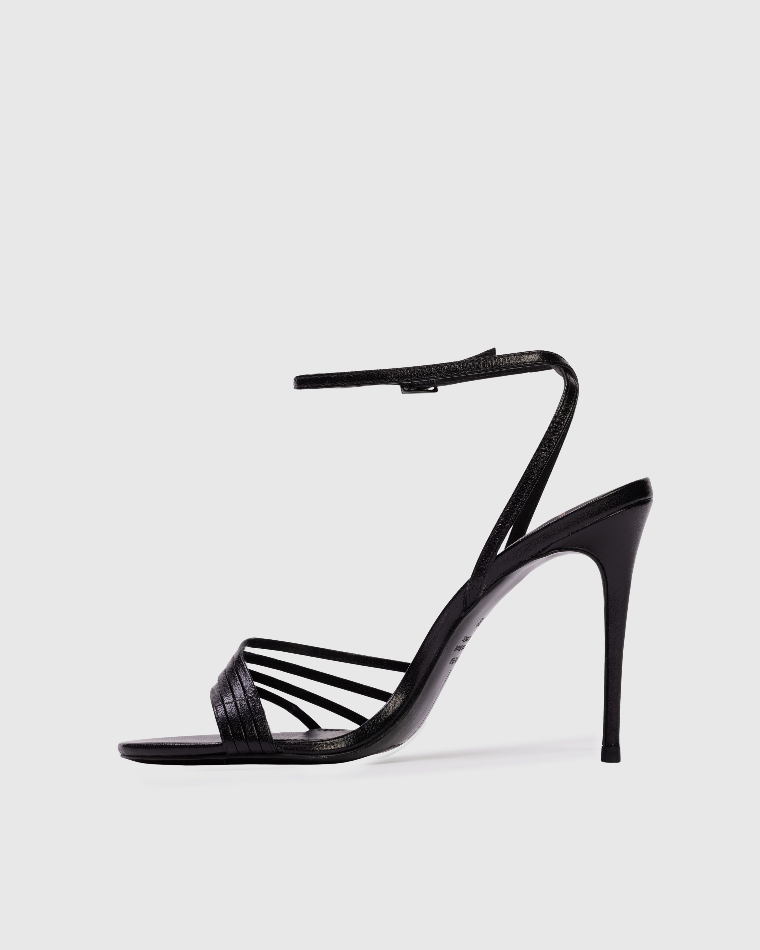 round toe multi-strap sandal, set on a stiletto pin heel. made with smooth buffed leather.