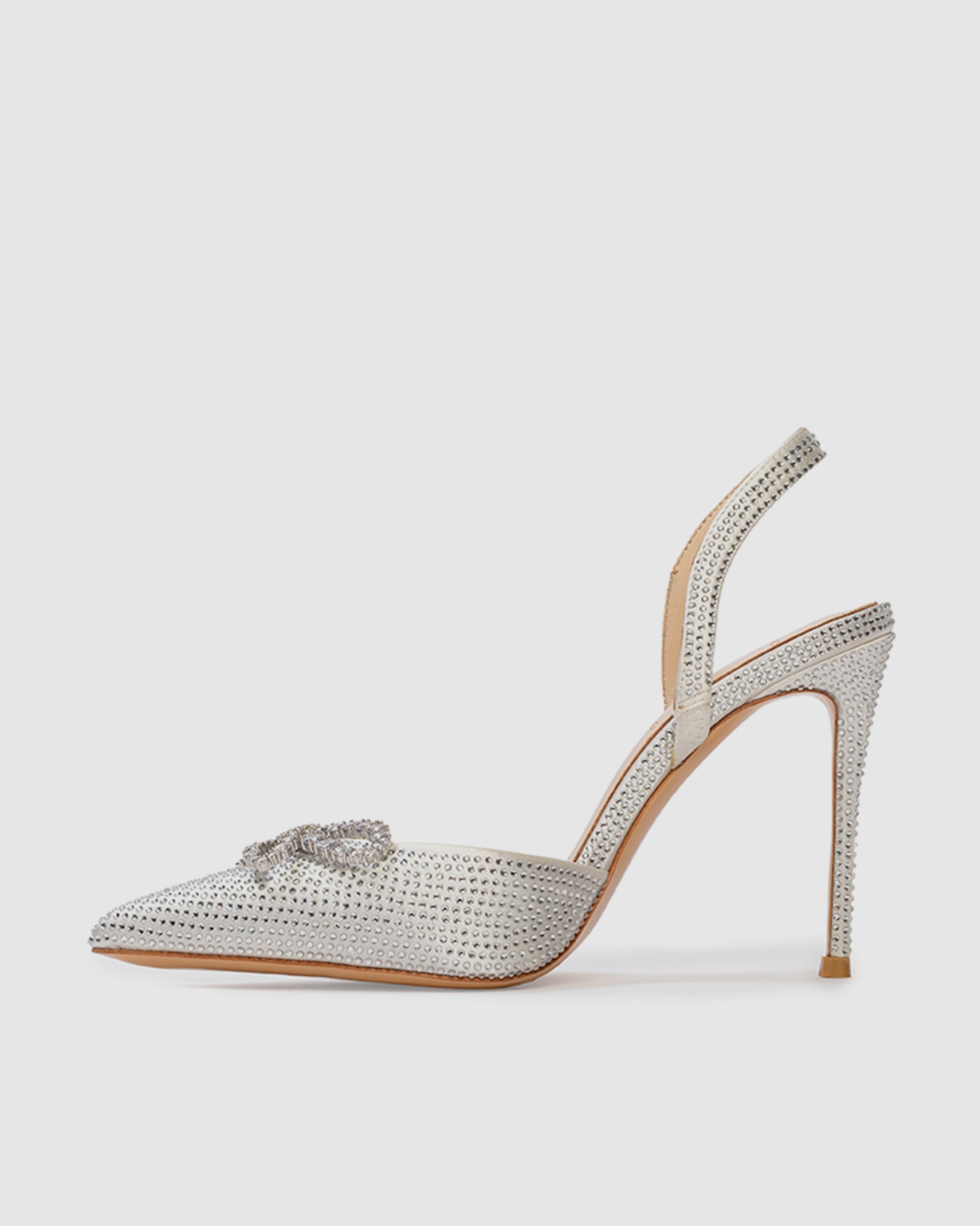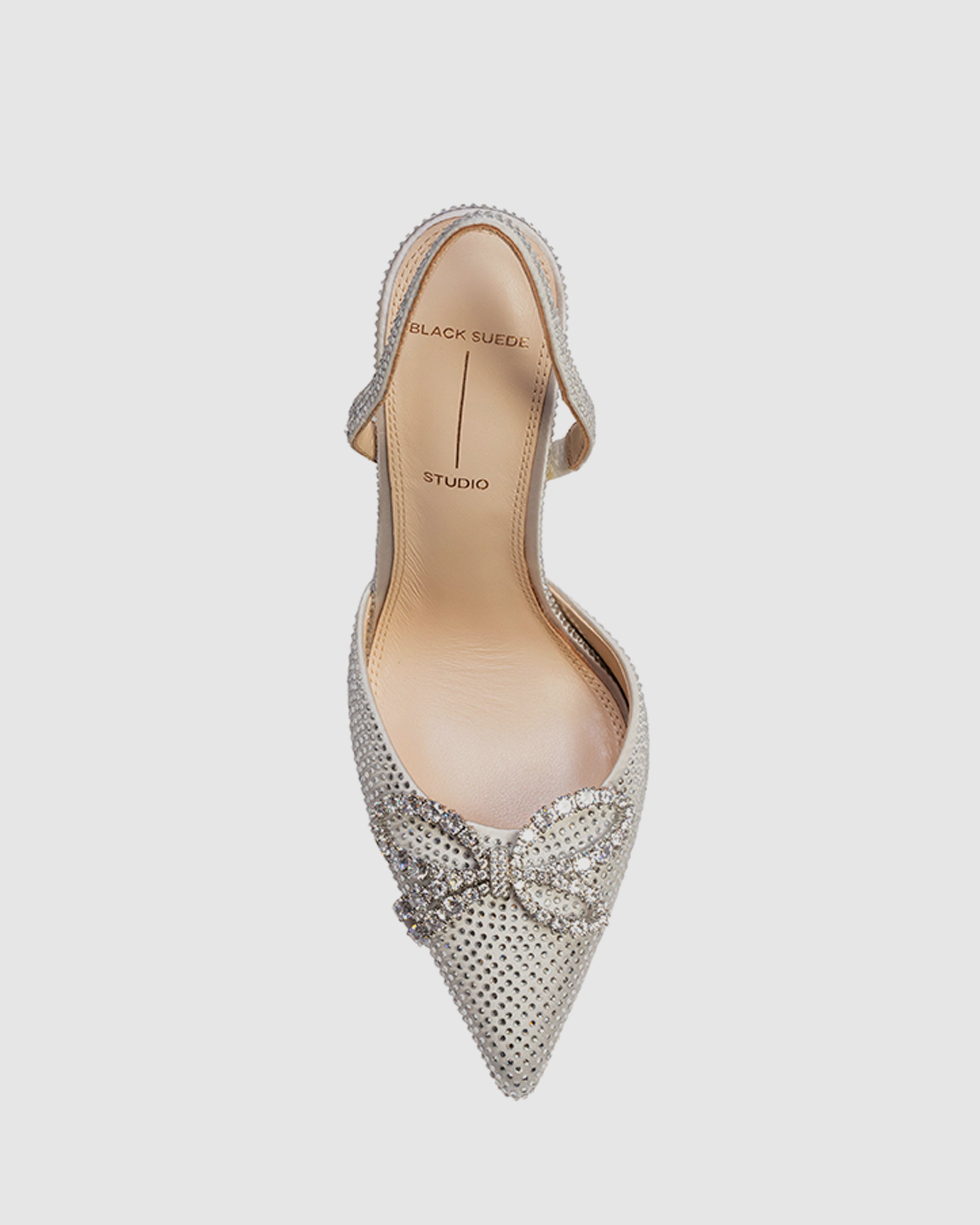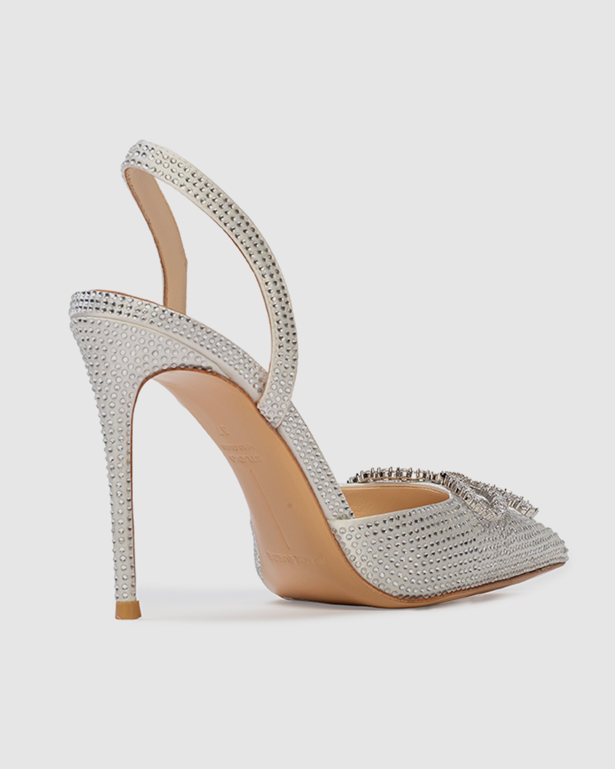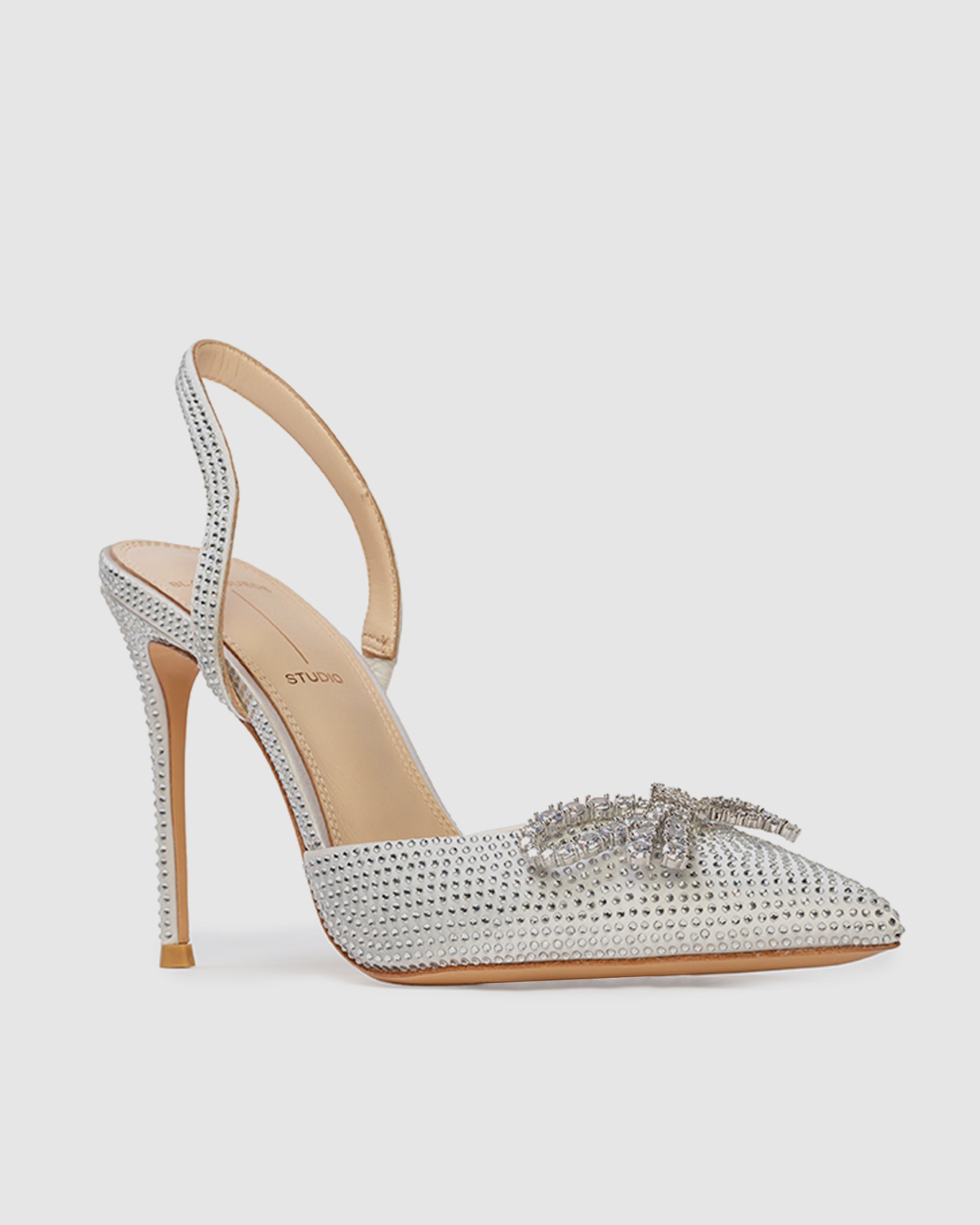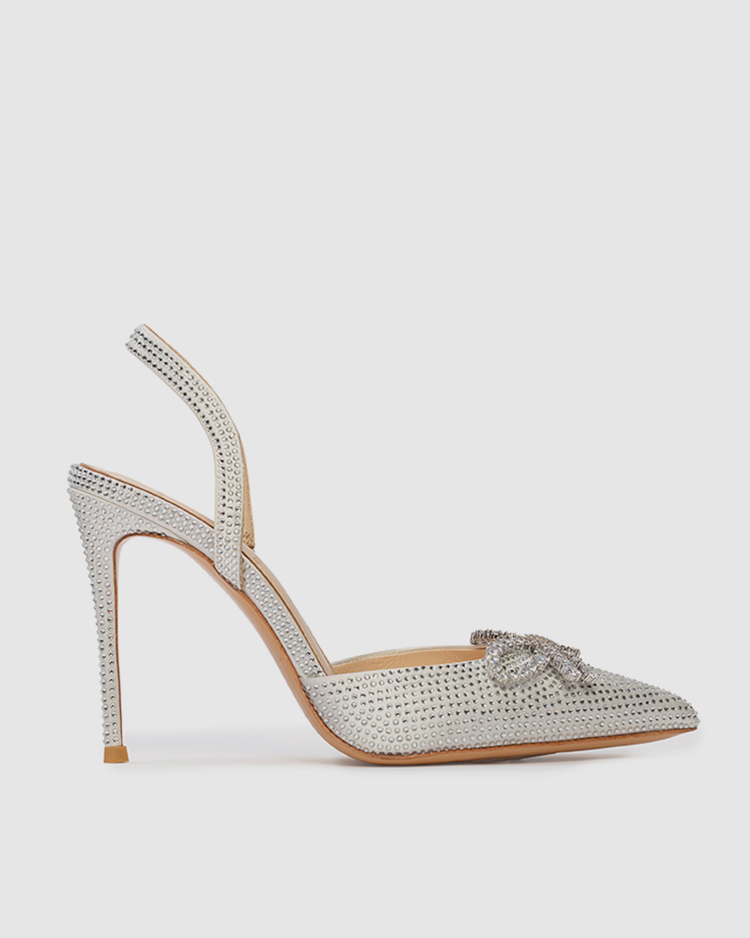 Pointy toe sling back pump with crystal embellished bow ornament, set on a stiletto pin heel. Made with satin crepe.