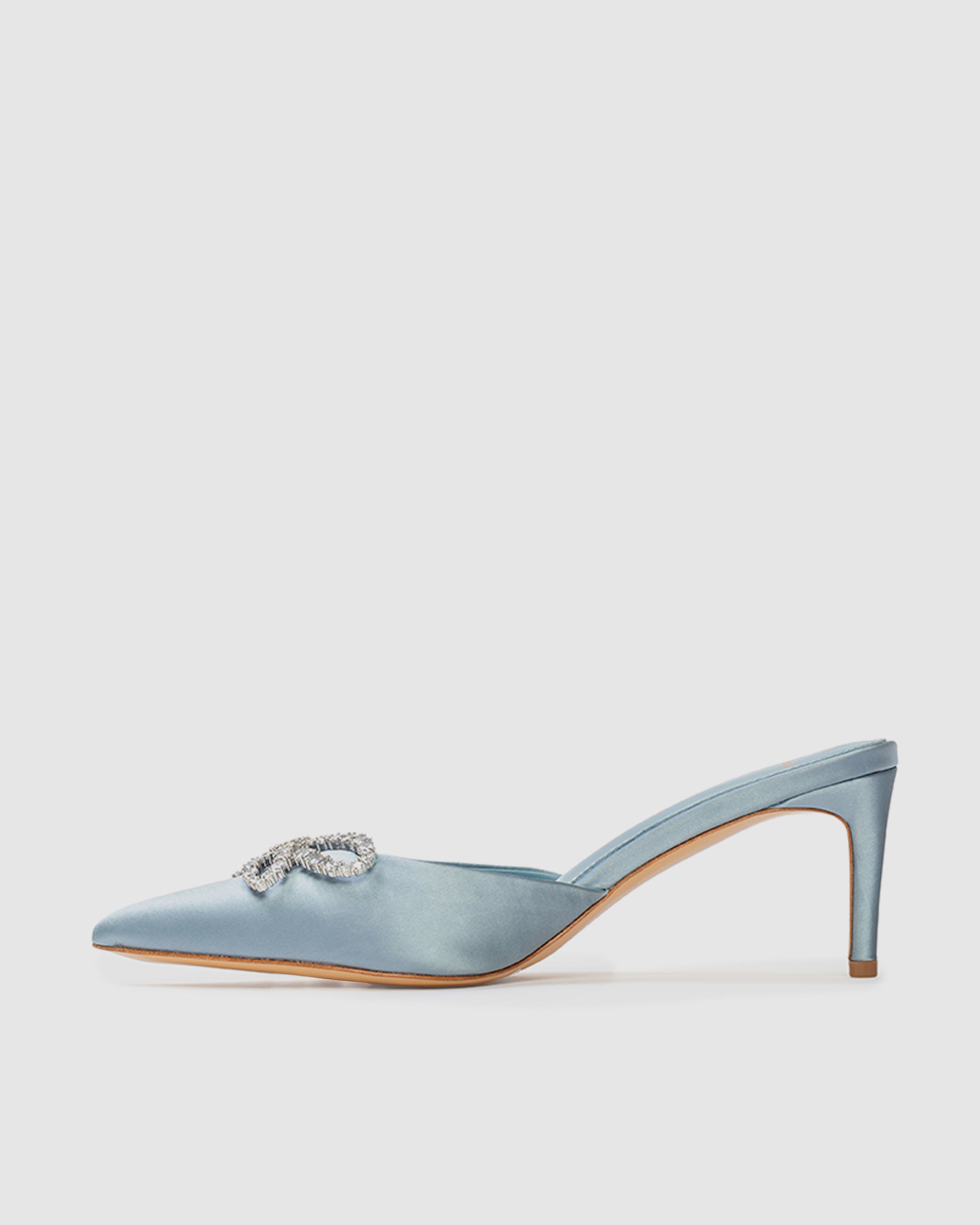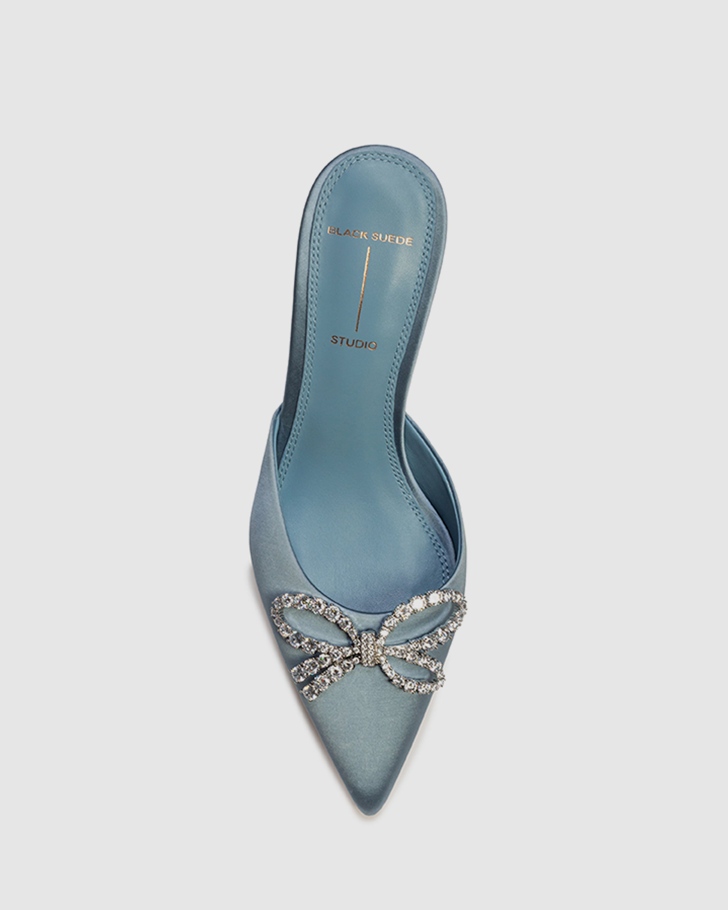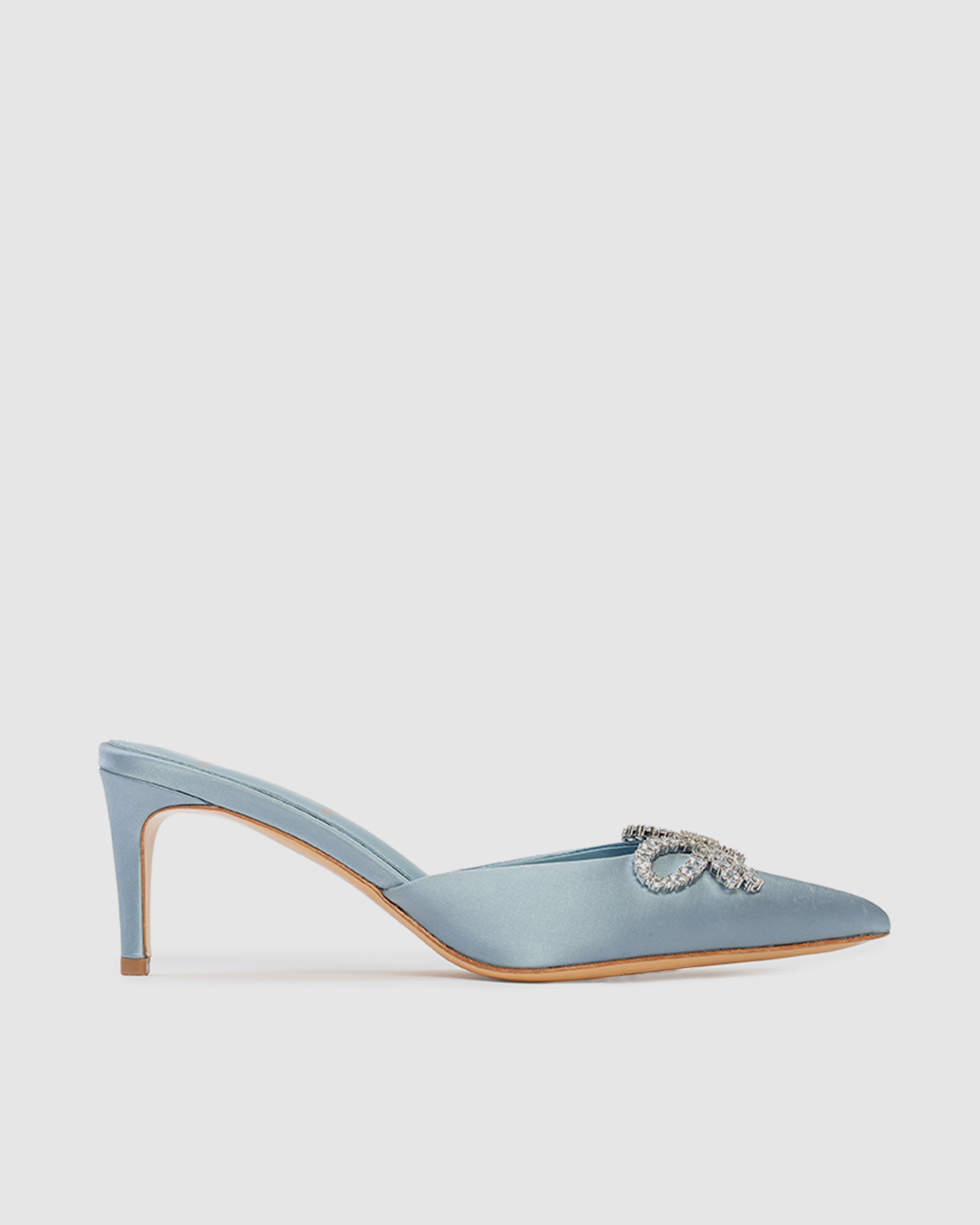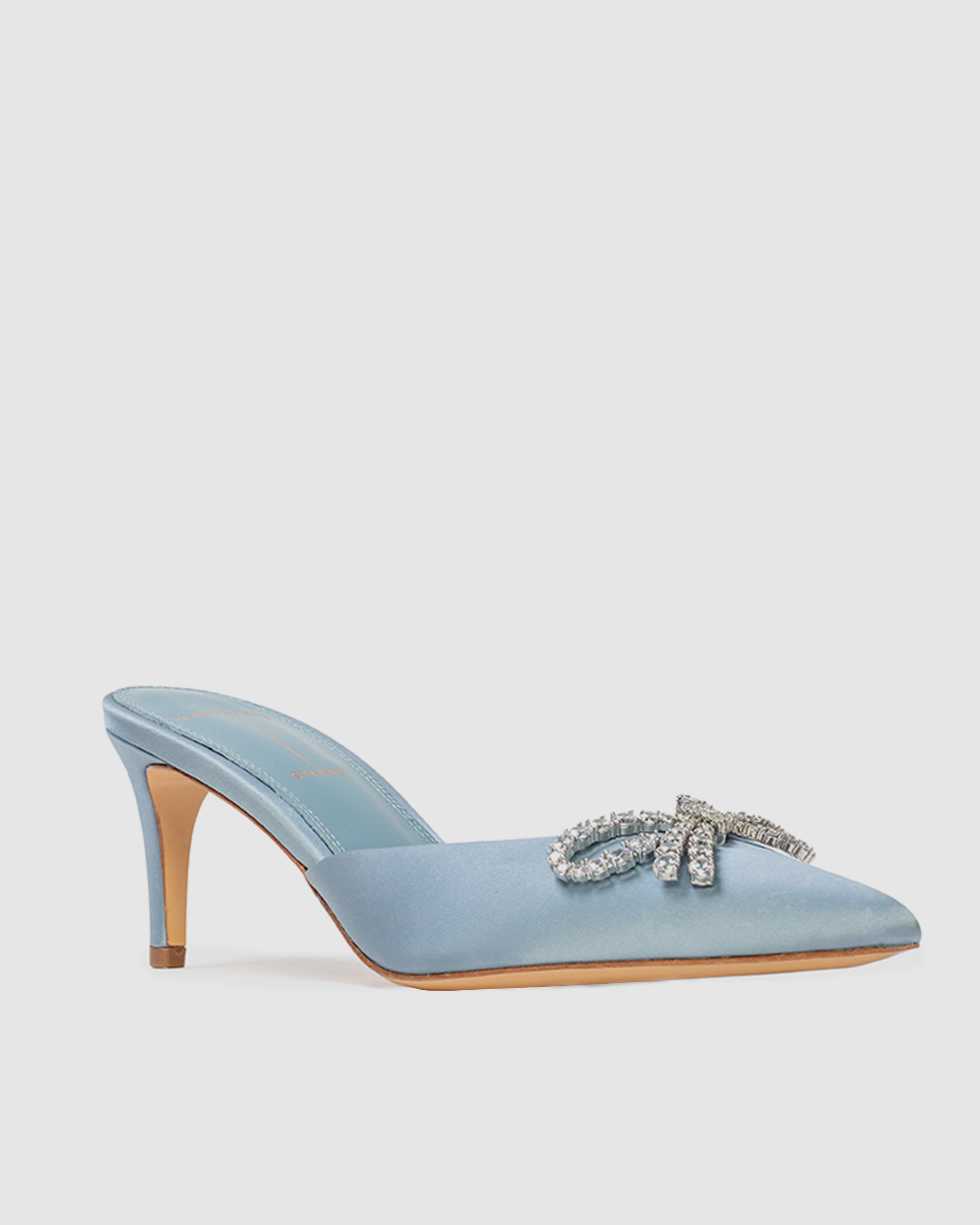 Pointy toe slip on mule with crystal embellished bow ornament, set on a straight mid heel. Made with satin crepe.