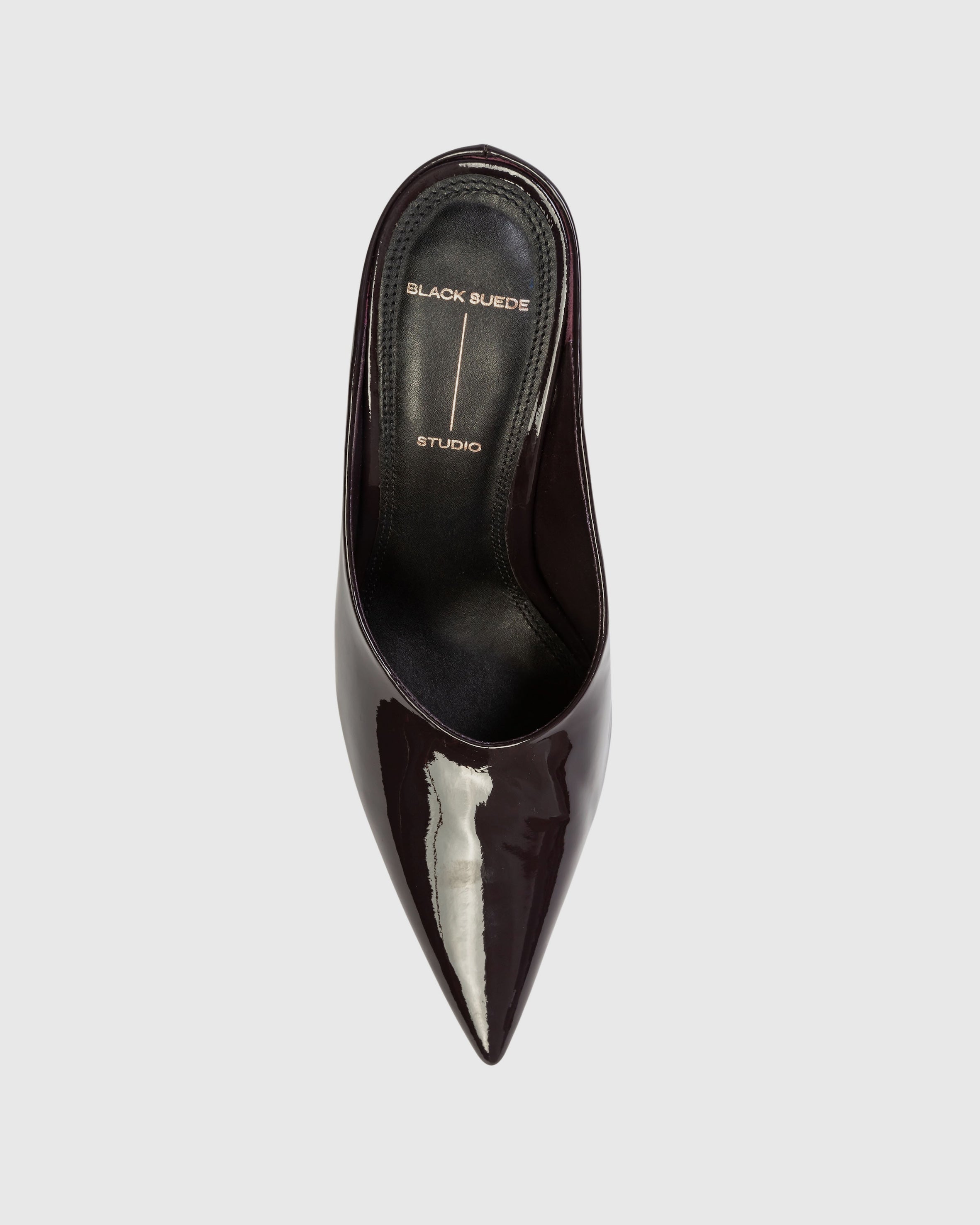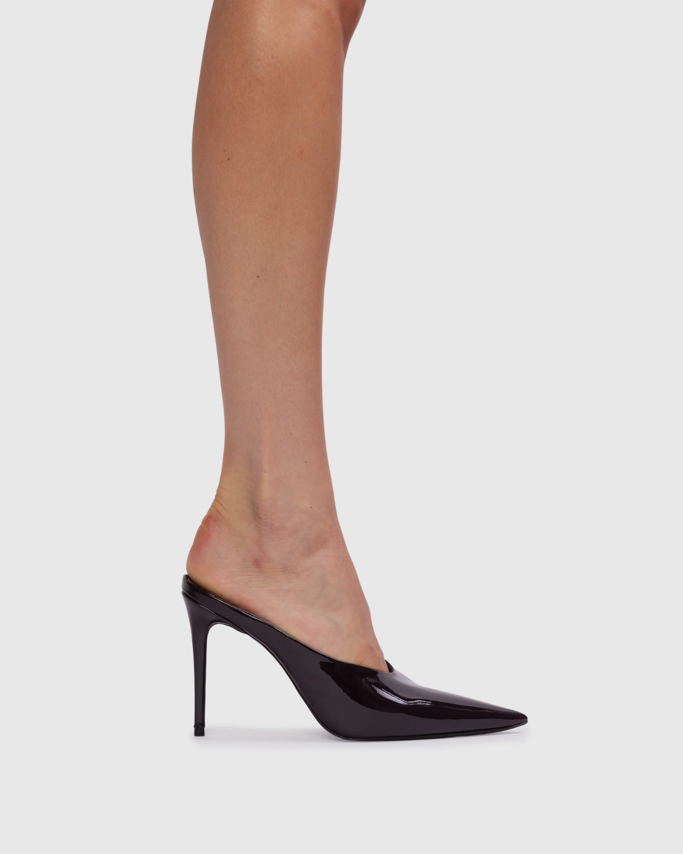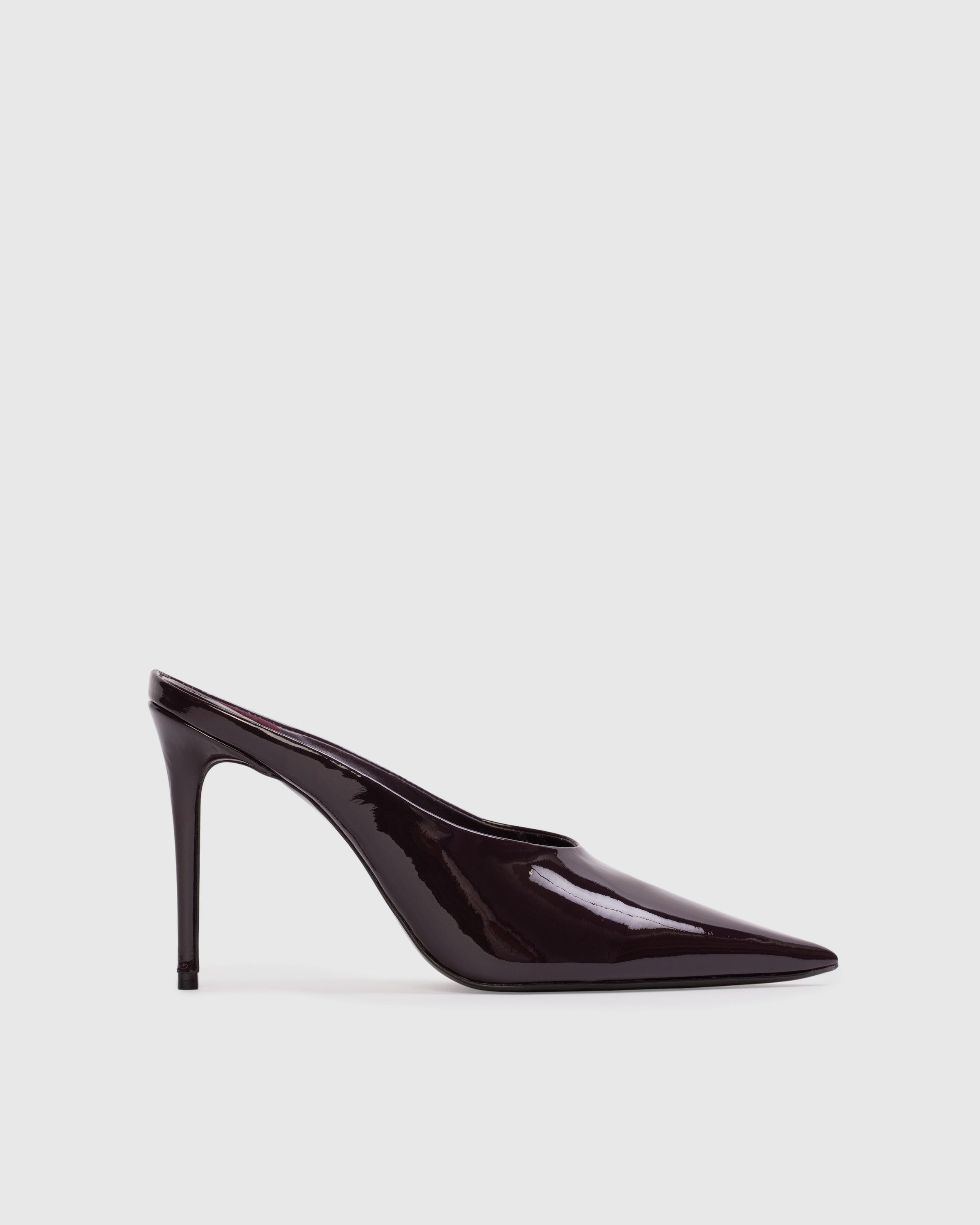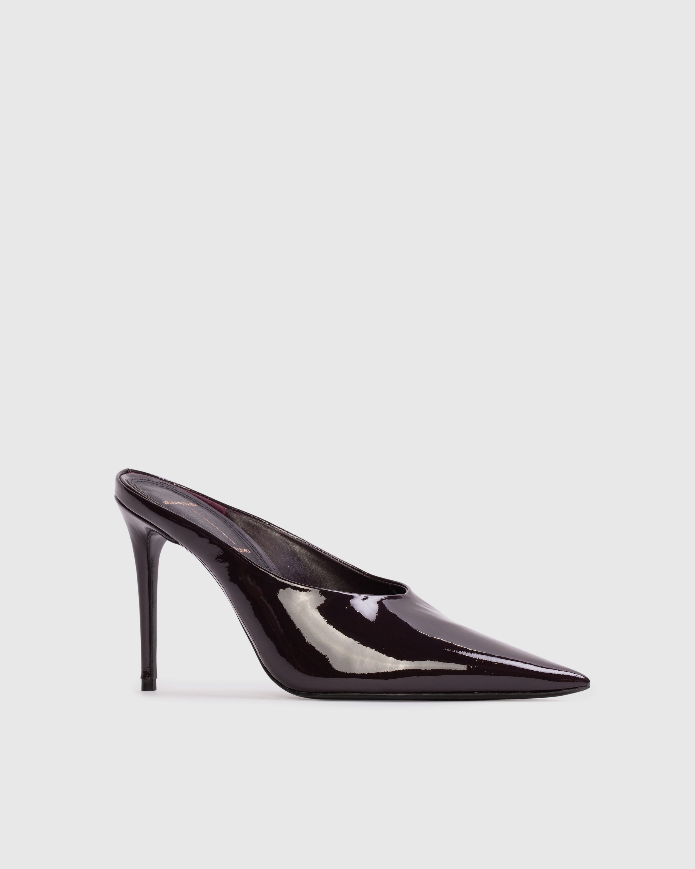 pointy toe chocked-up mule, set on a pin stiletto heel. Made with smooth patent finished leather.