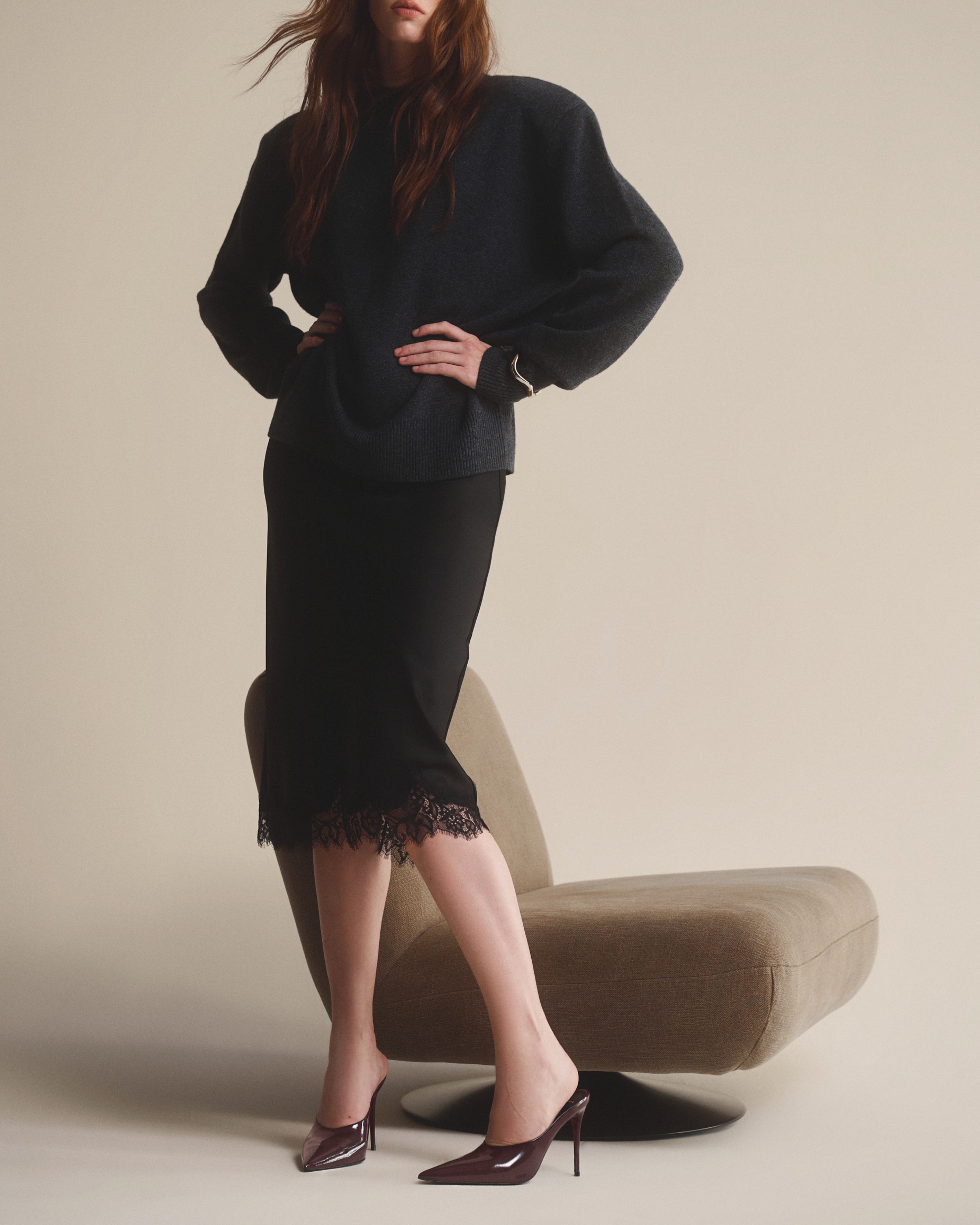 pointy toe chocked-up mule, set on a pin stiletto heel.