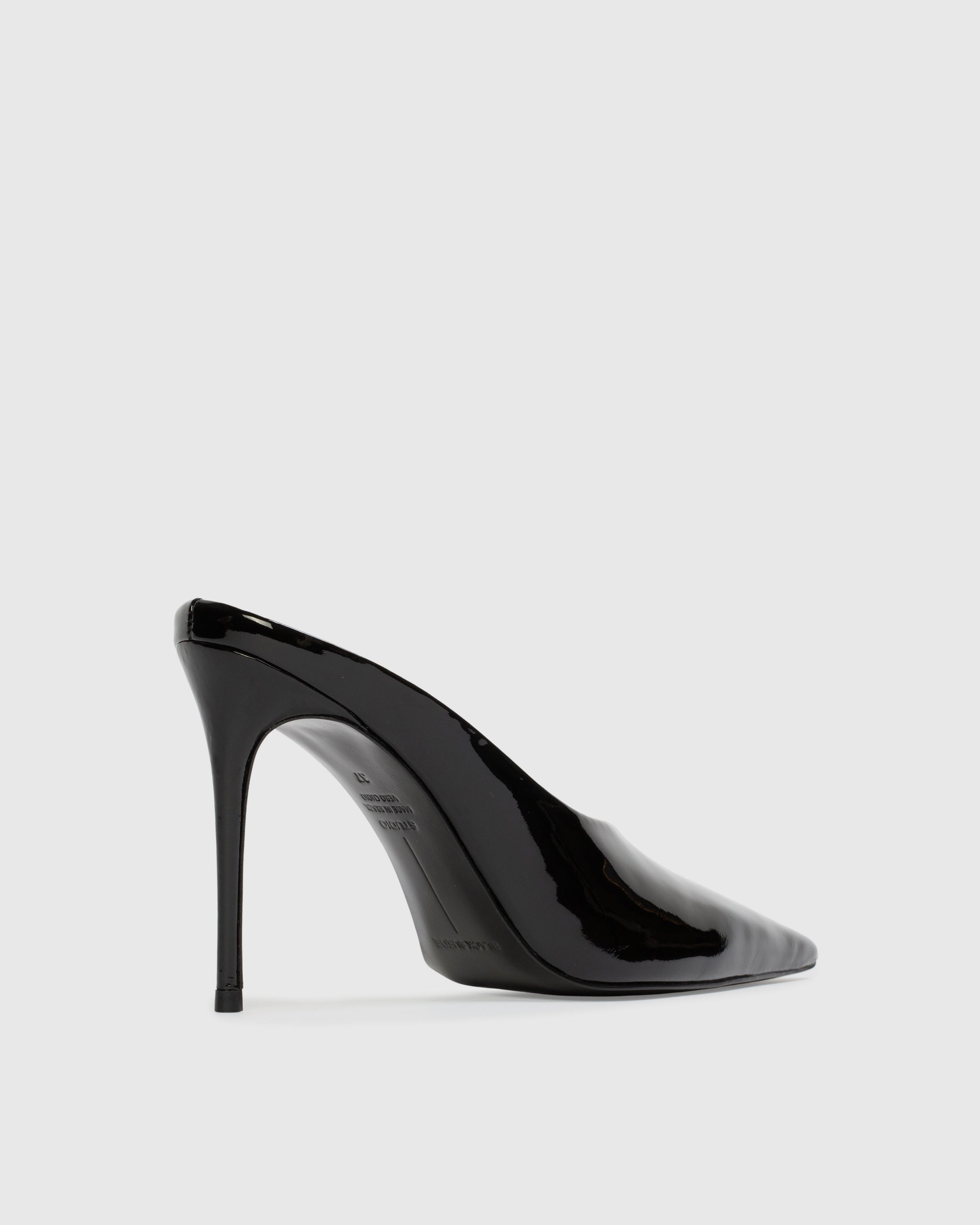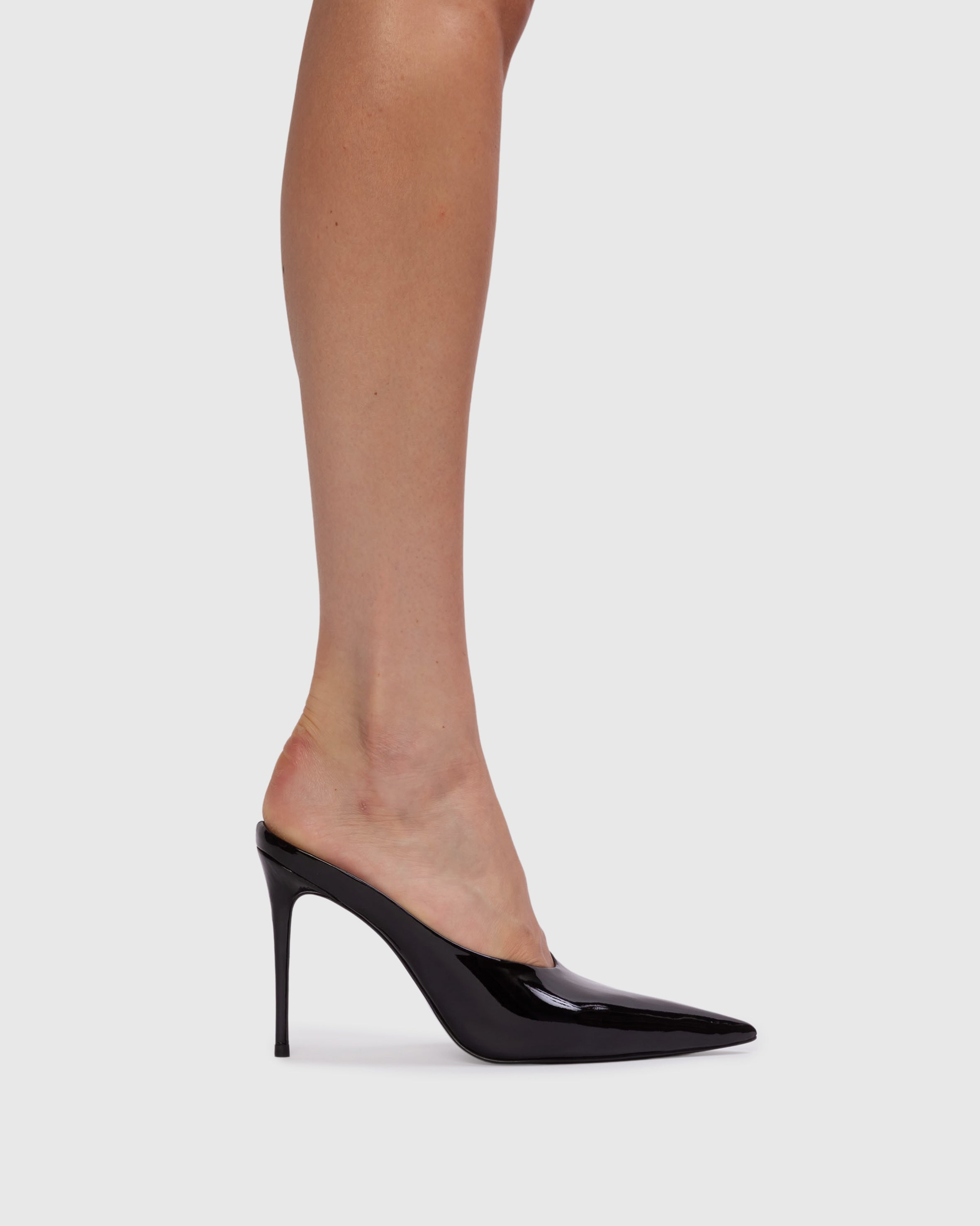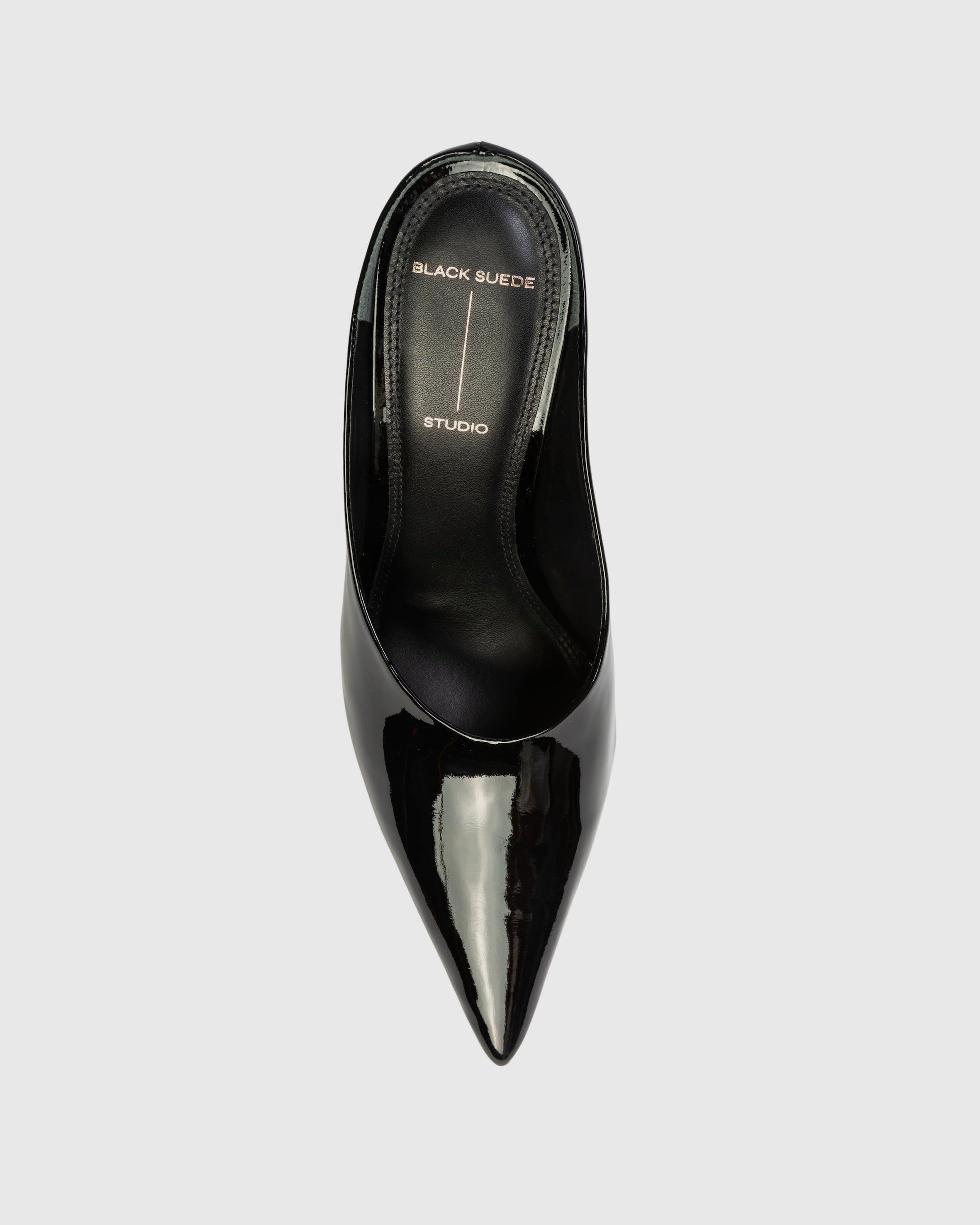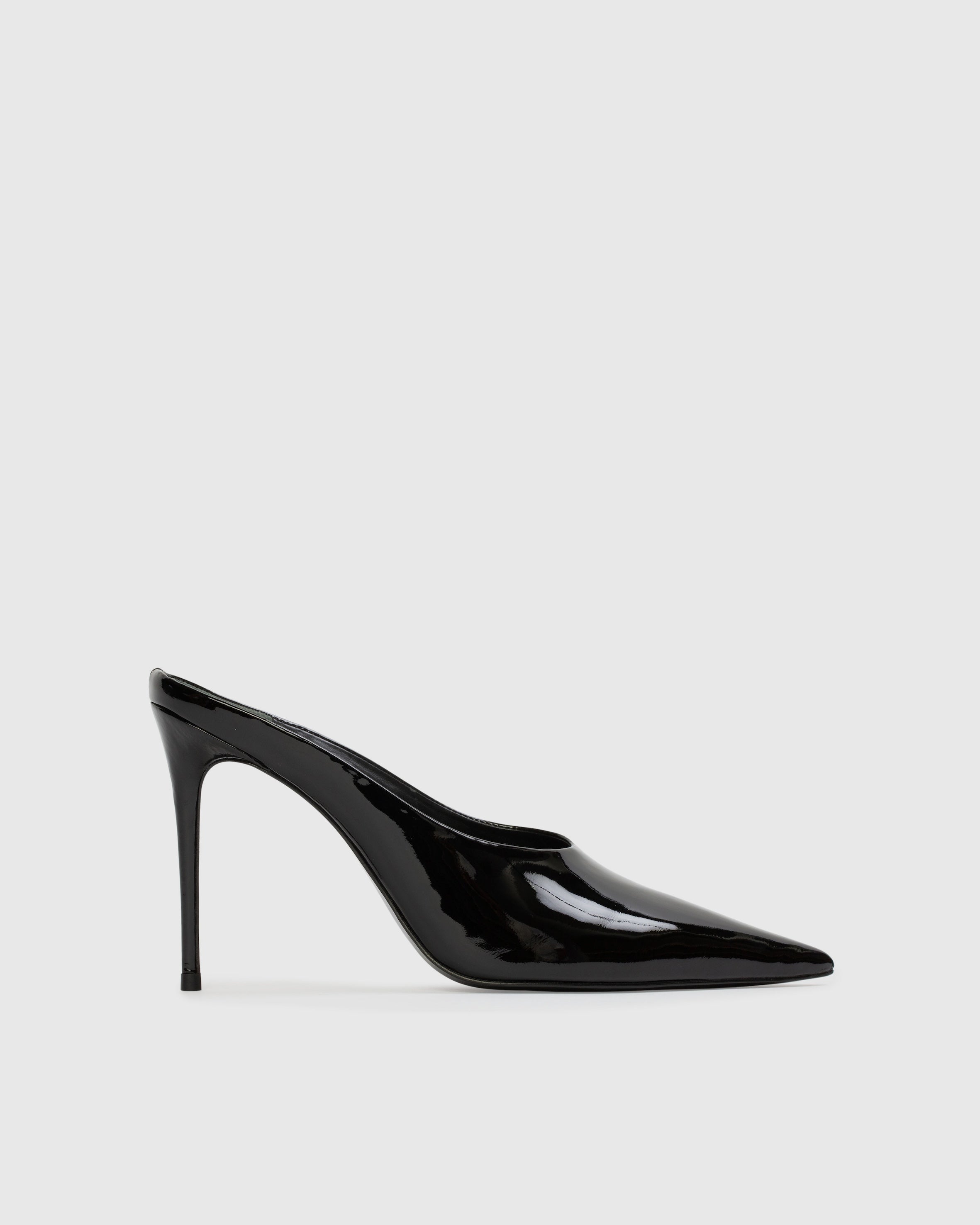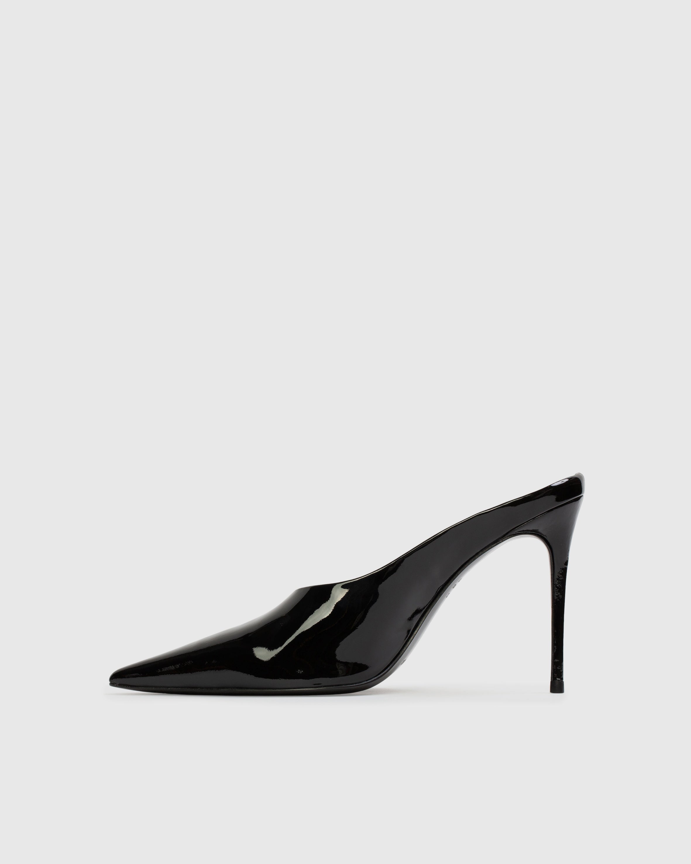 pointy toe chocked-up mule, set on a pin stiletto heel. Made with smooth patent finished leather.