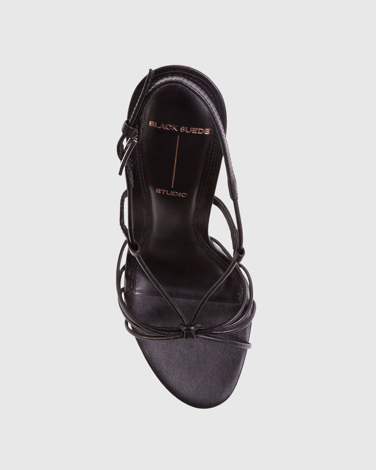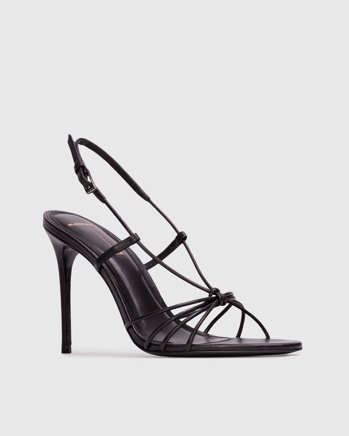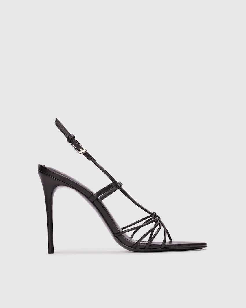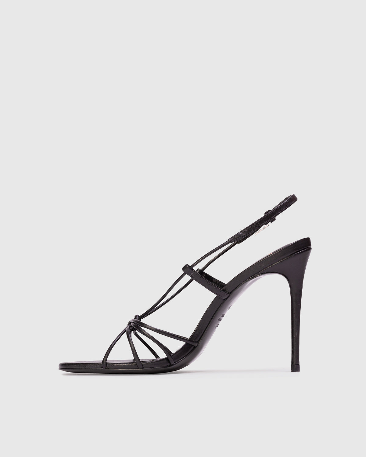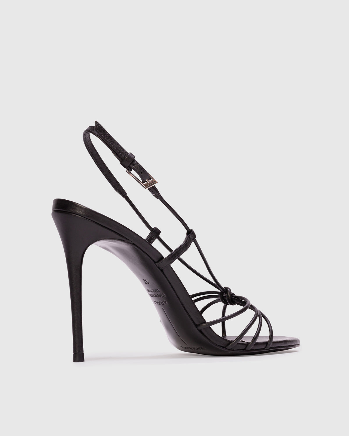 Round toe strappy knot sandal, set on a stiletto pin heel. Made with smooth buffed leather.
