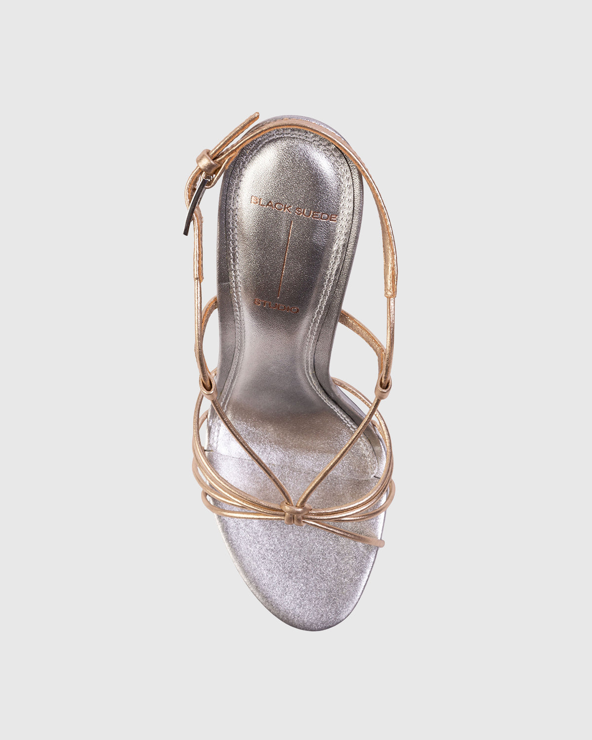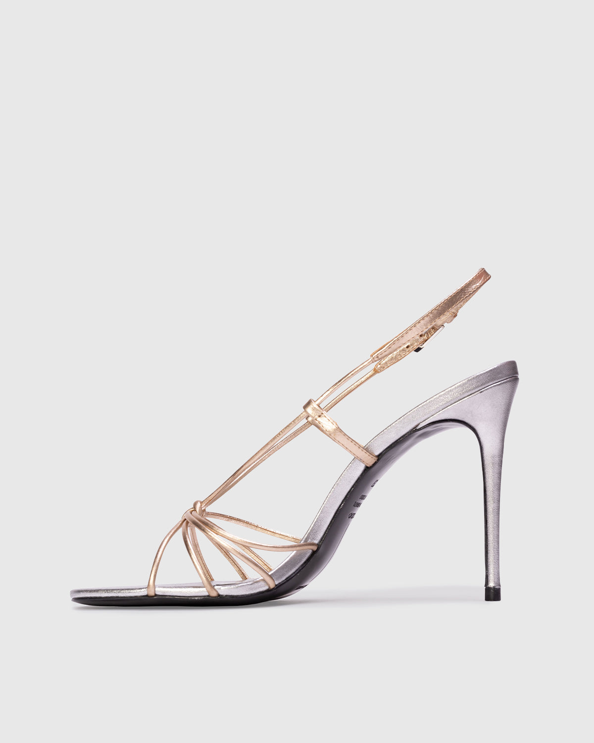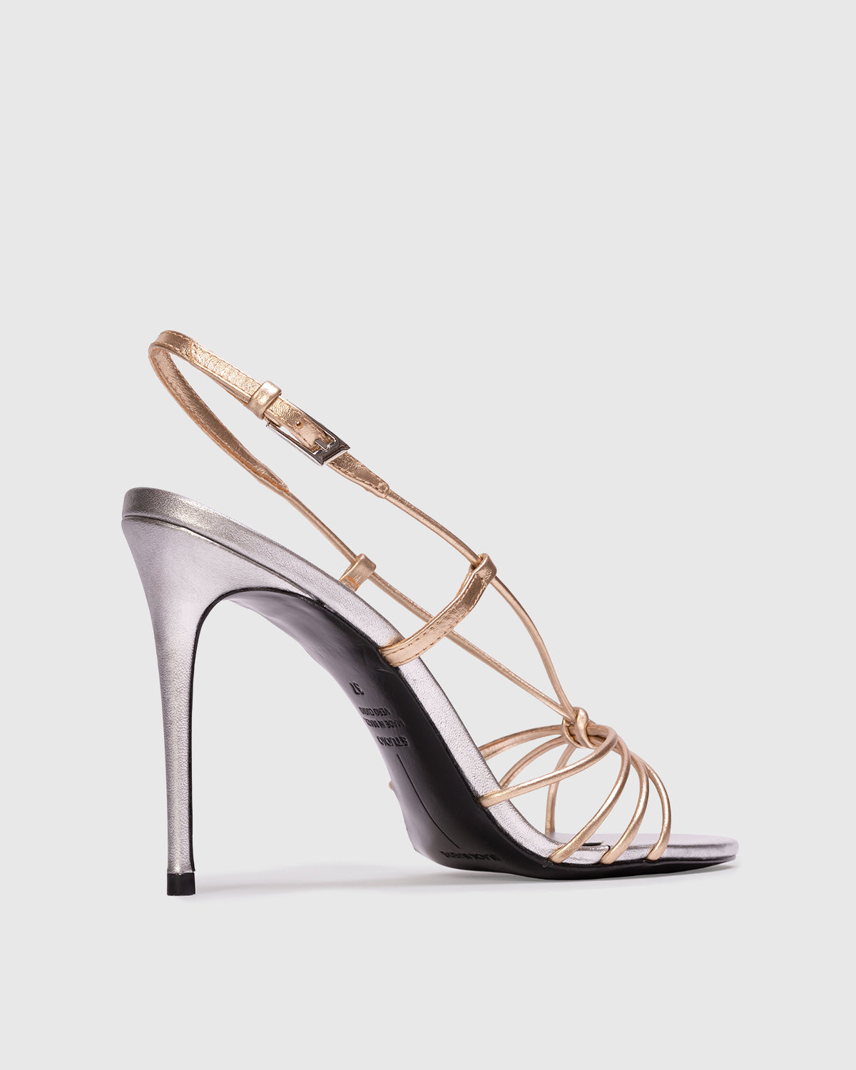 Round toe strappy knot sandal, set on a stiletto pin heel. Made with metallic finished leather.