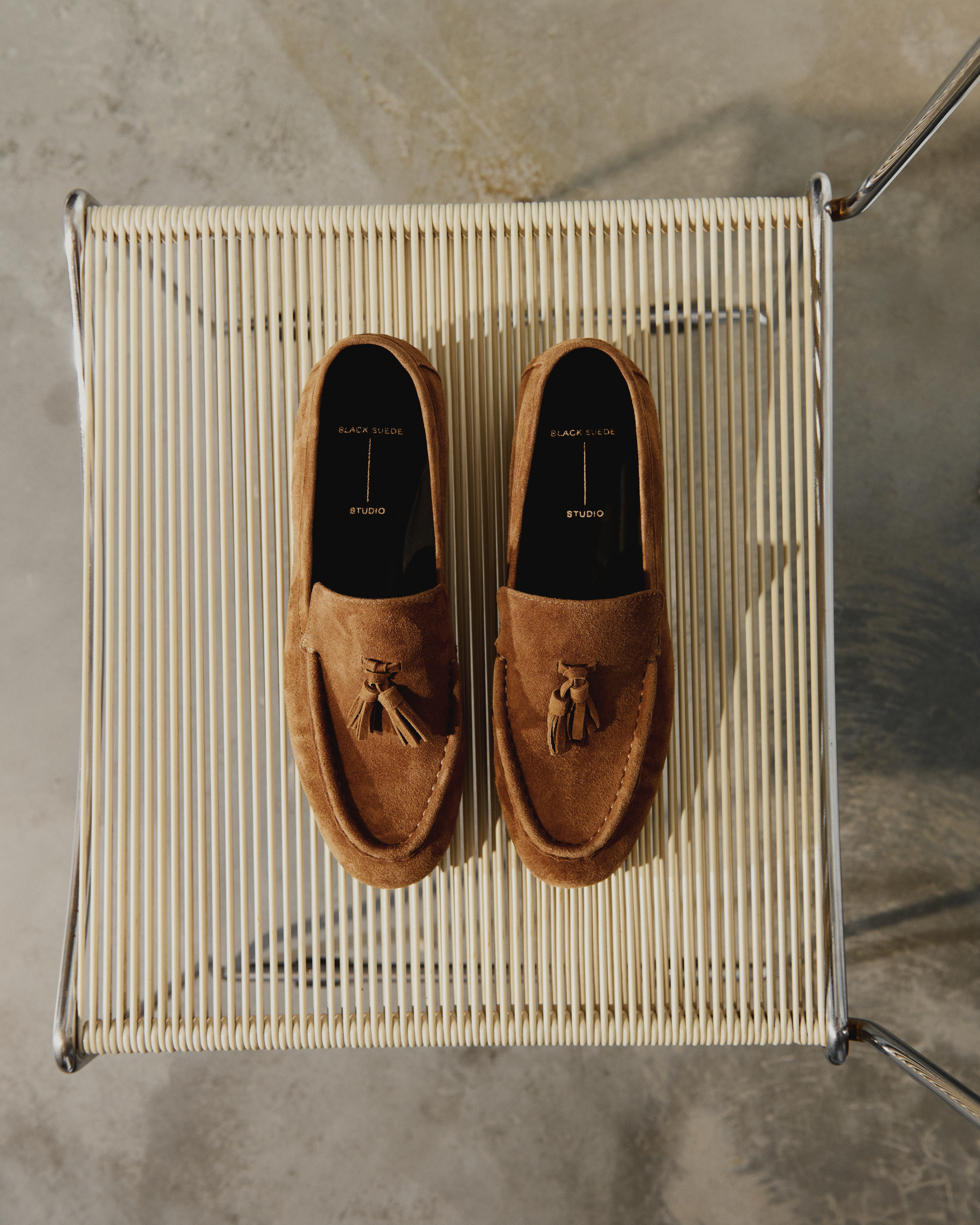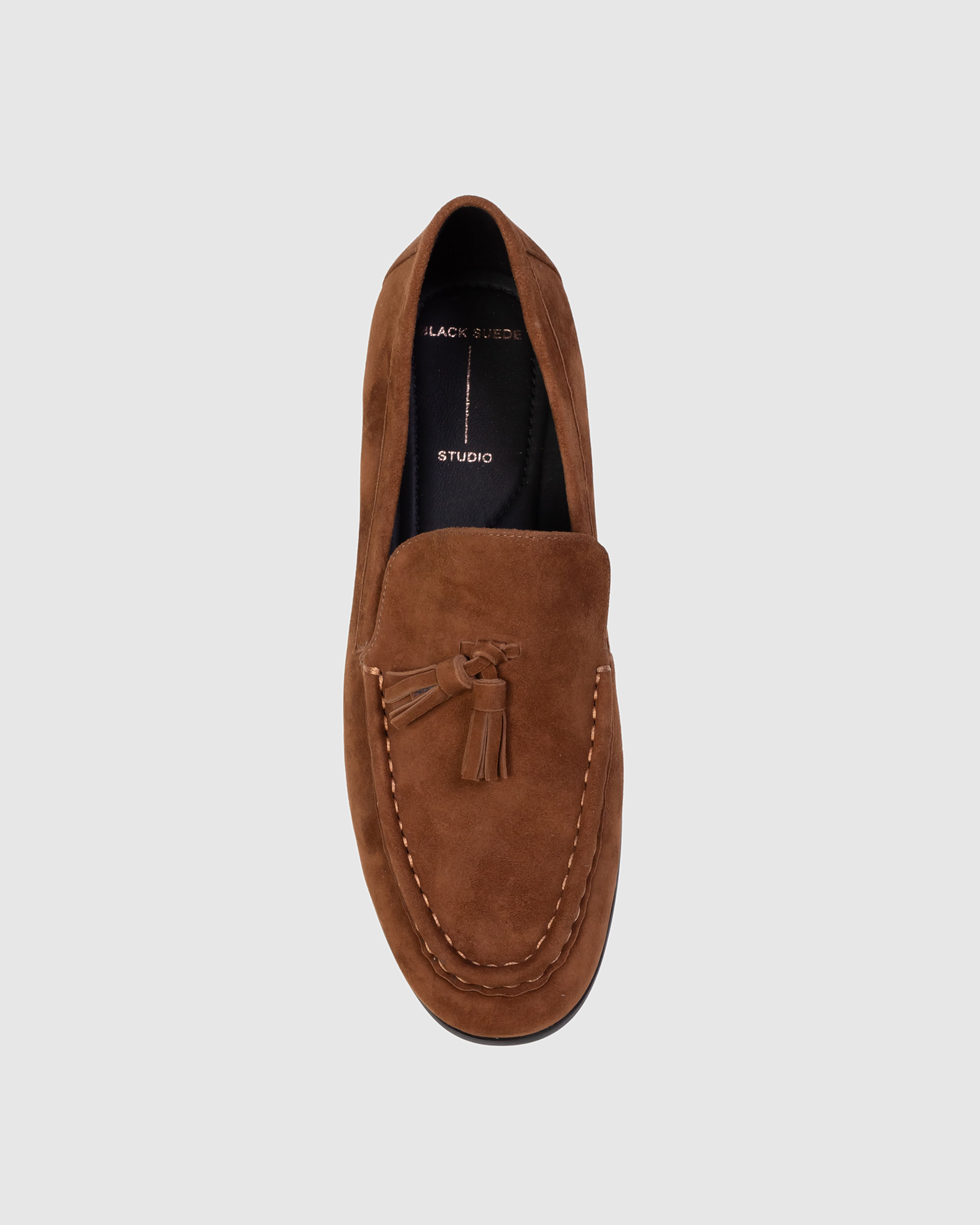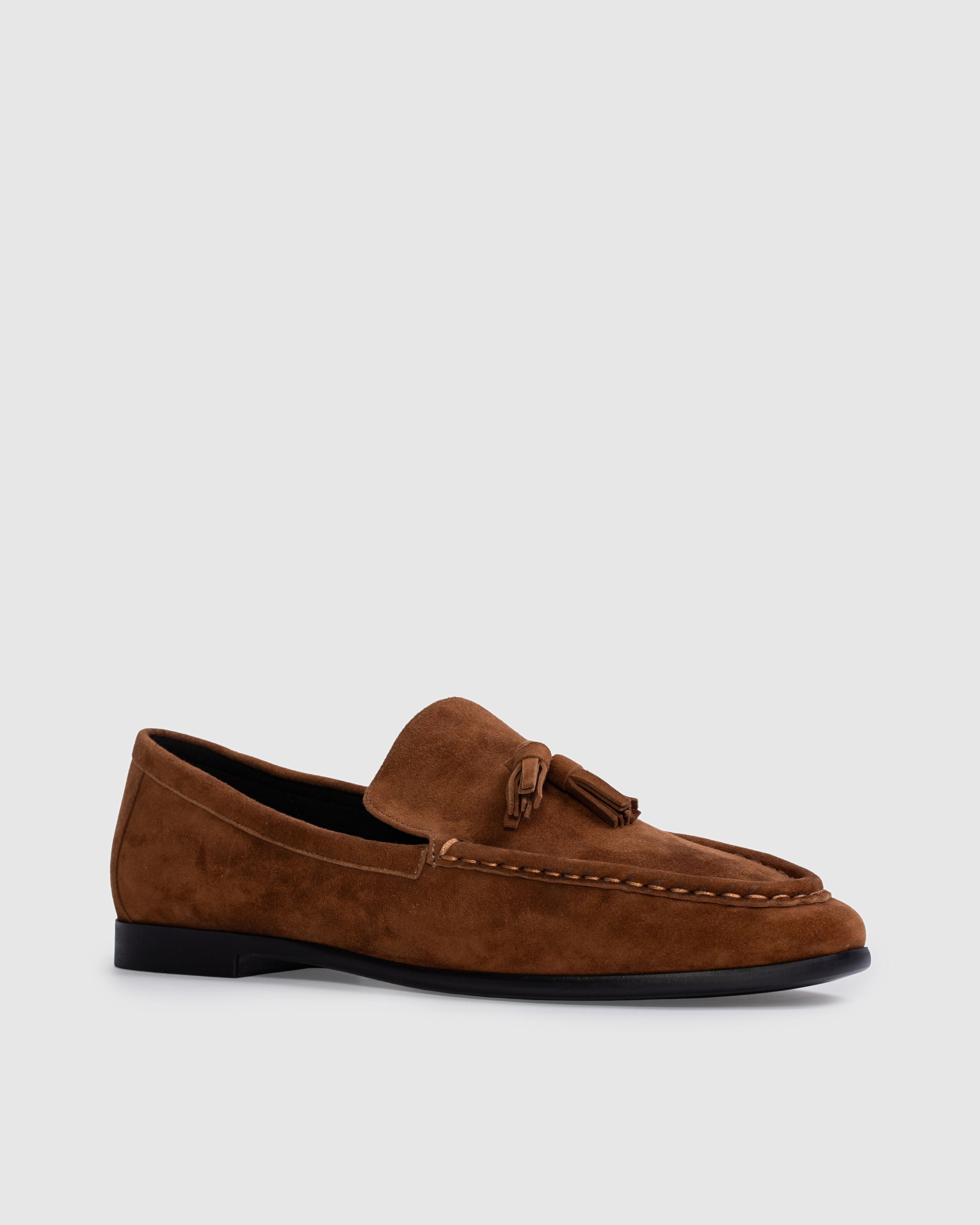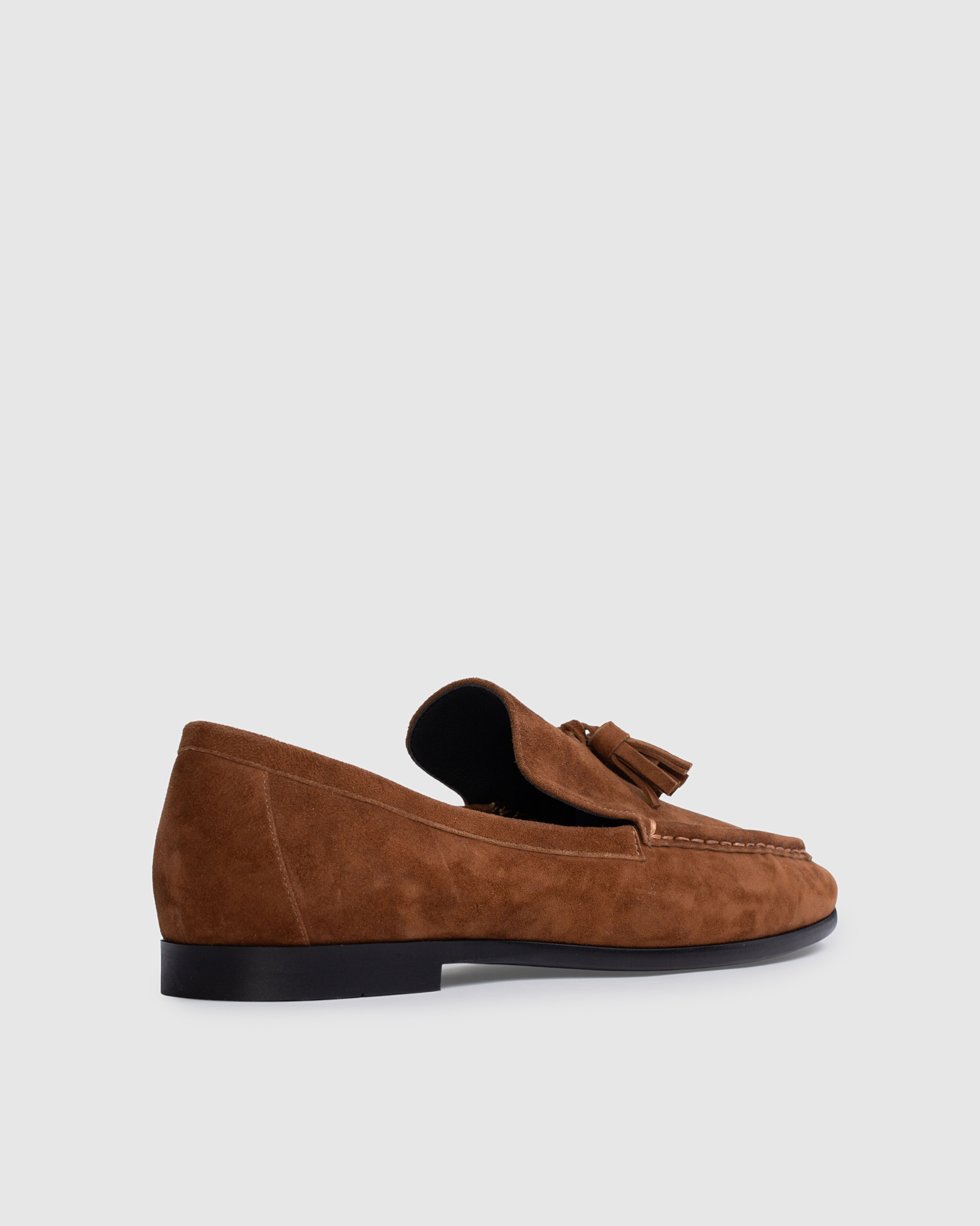 Classic loafer with fringe tassel, made with brushed kid suede.