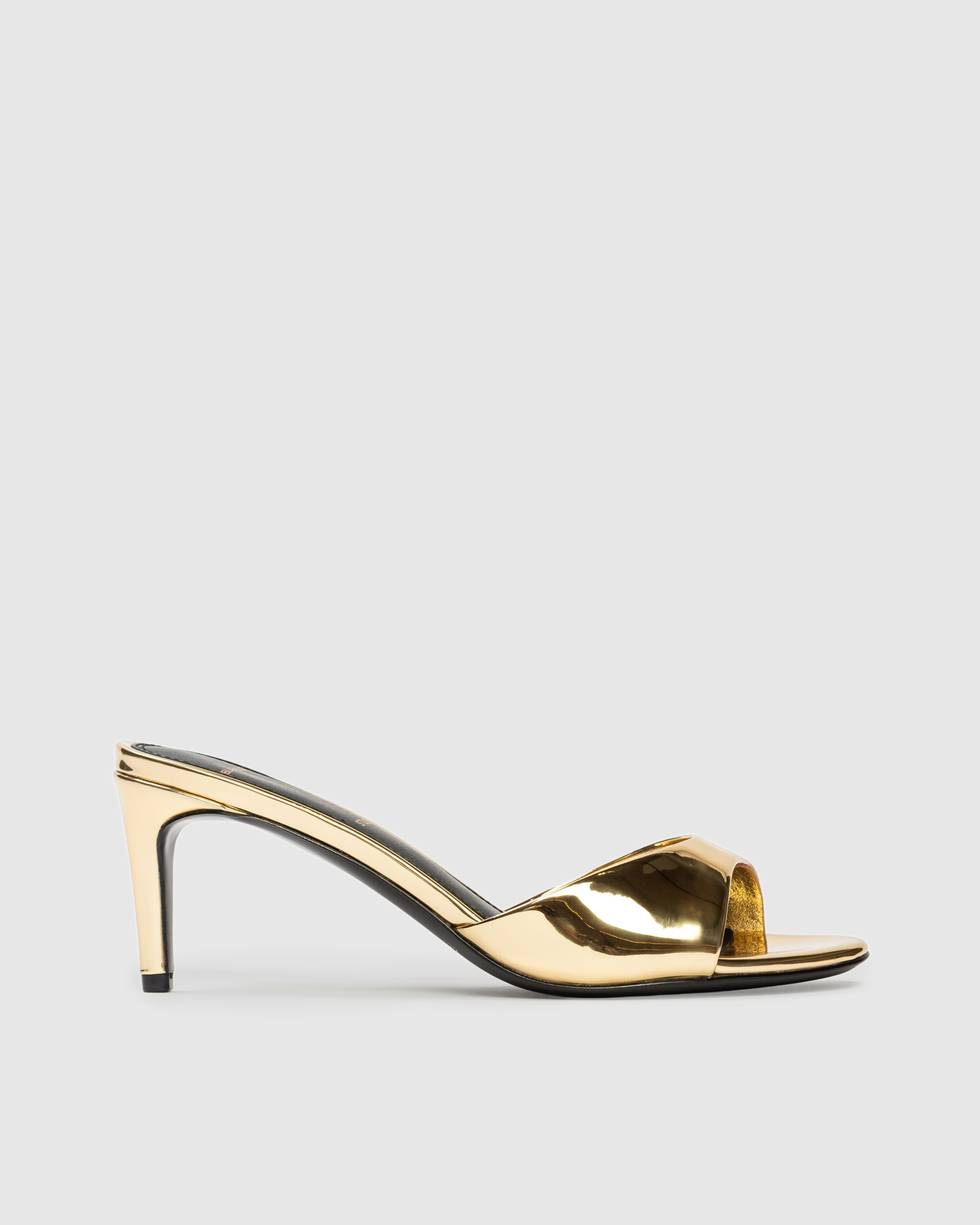 Round toe slipper mule, set on a straight mid heel. Made with mirror metallic finished leather.