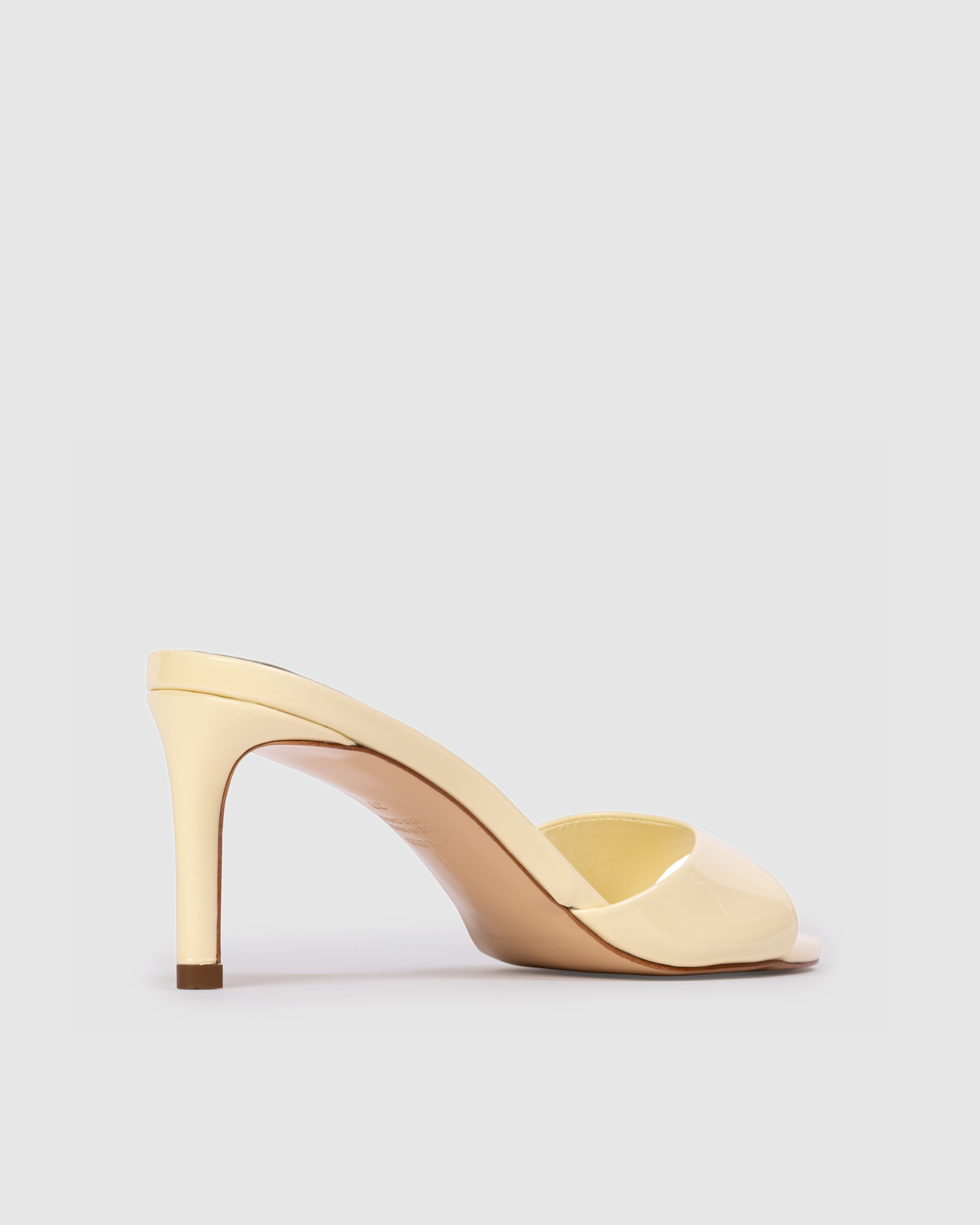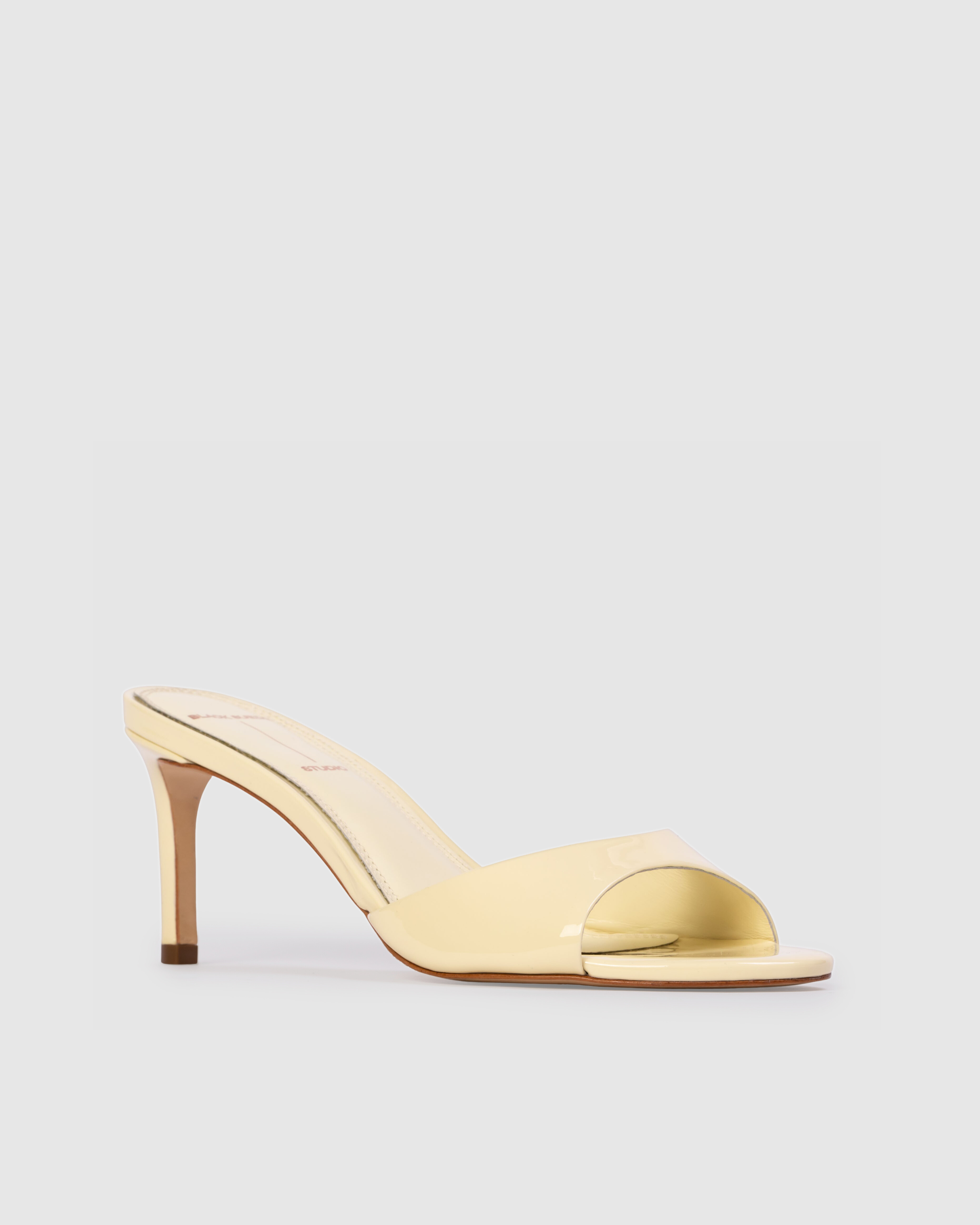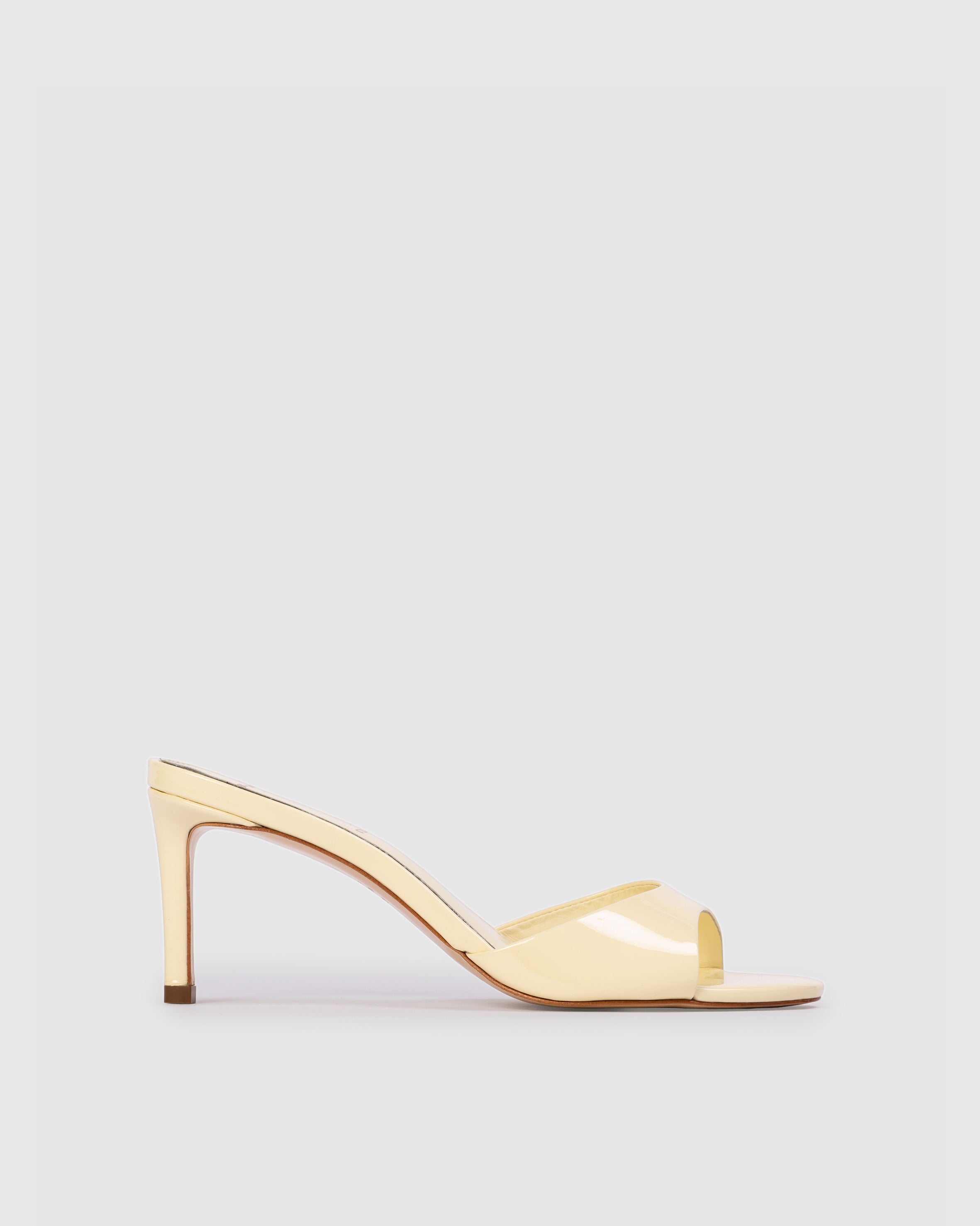 Round toe slipper mule, set on a straight mid heel. Made with smooth patent finished leather.