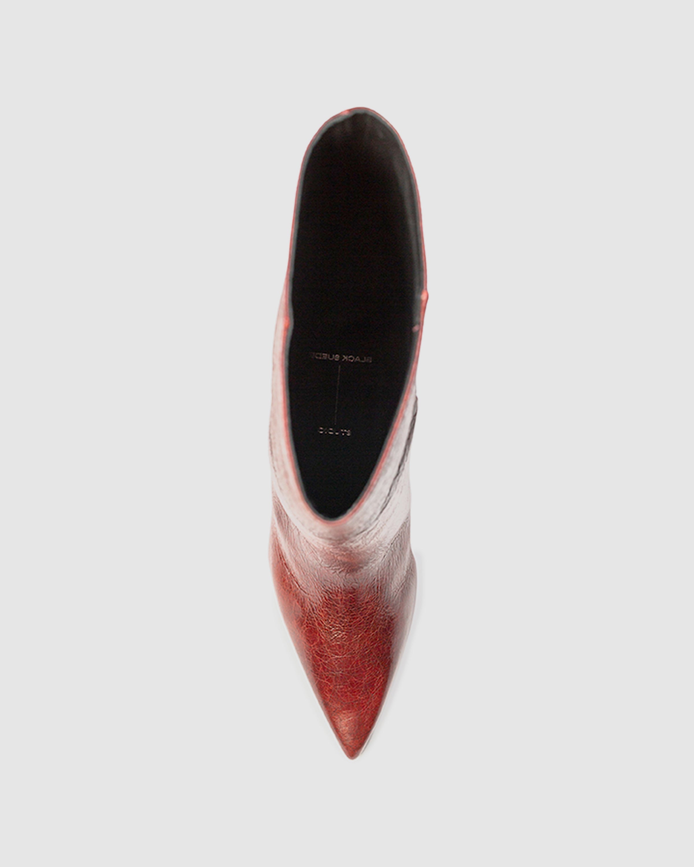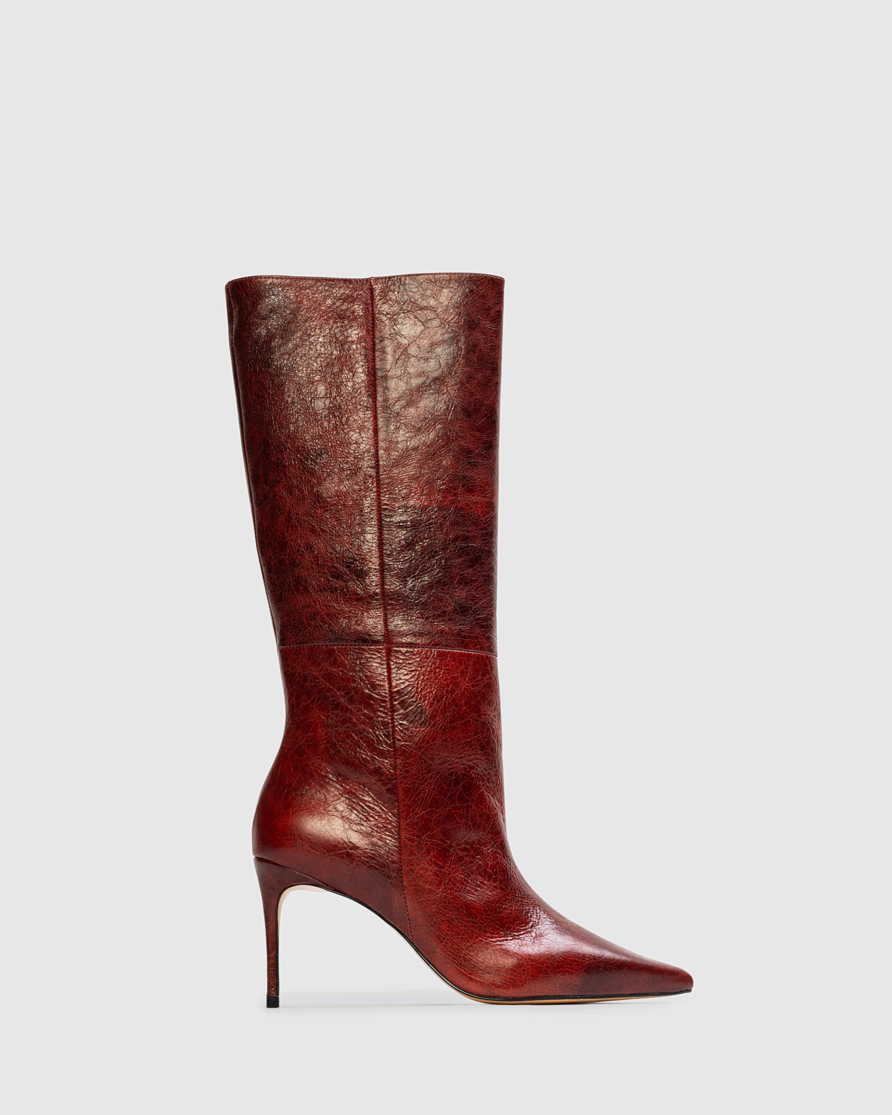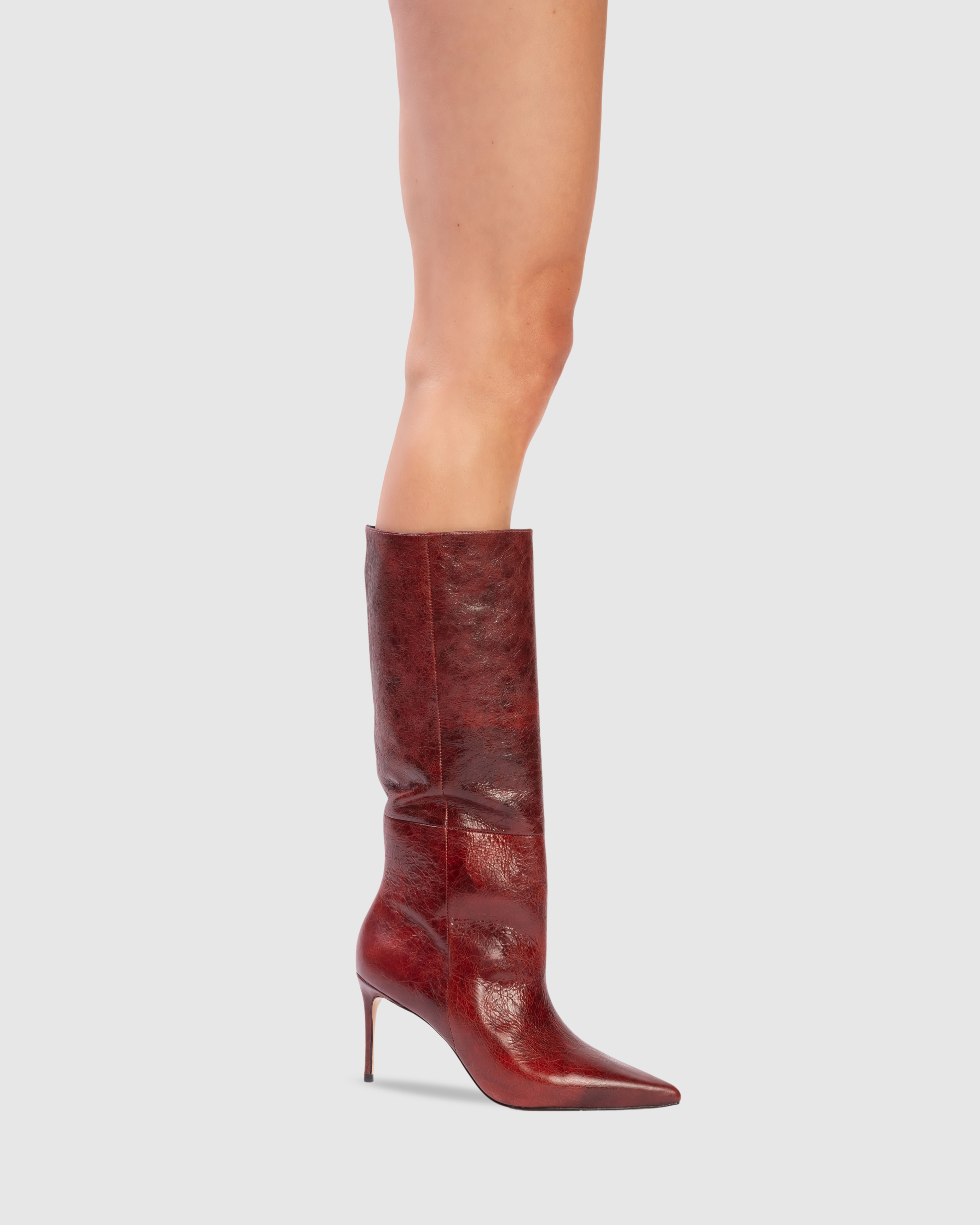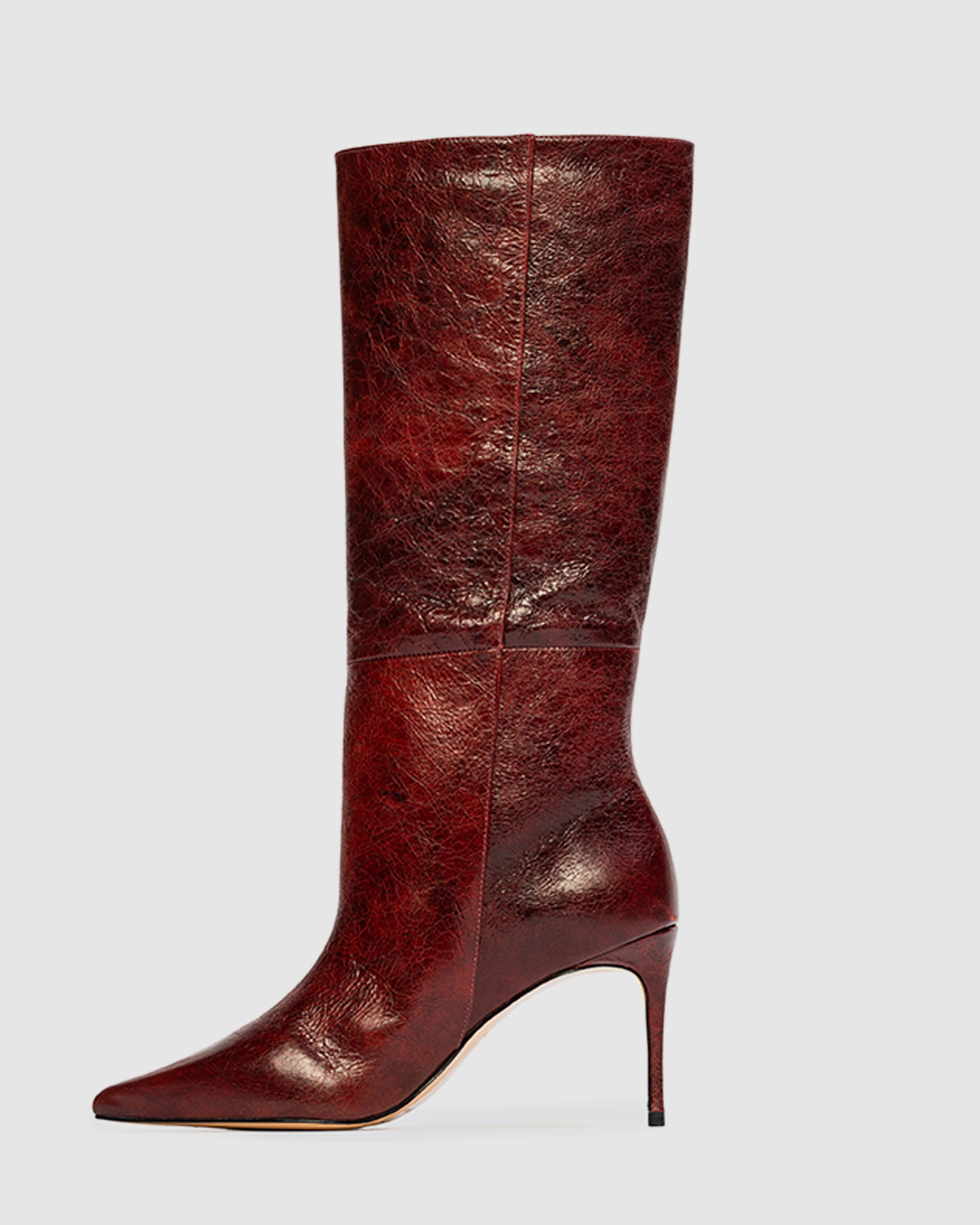 Pointy toe below the knee boot, set on a high pin heel. Made with crinkled effect leather.