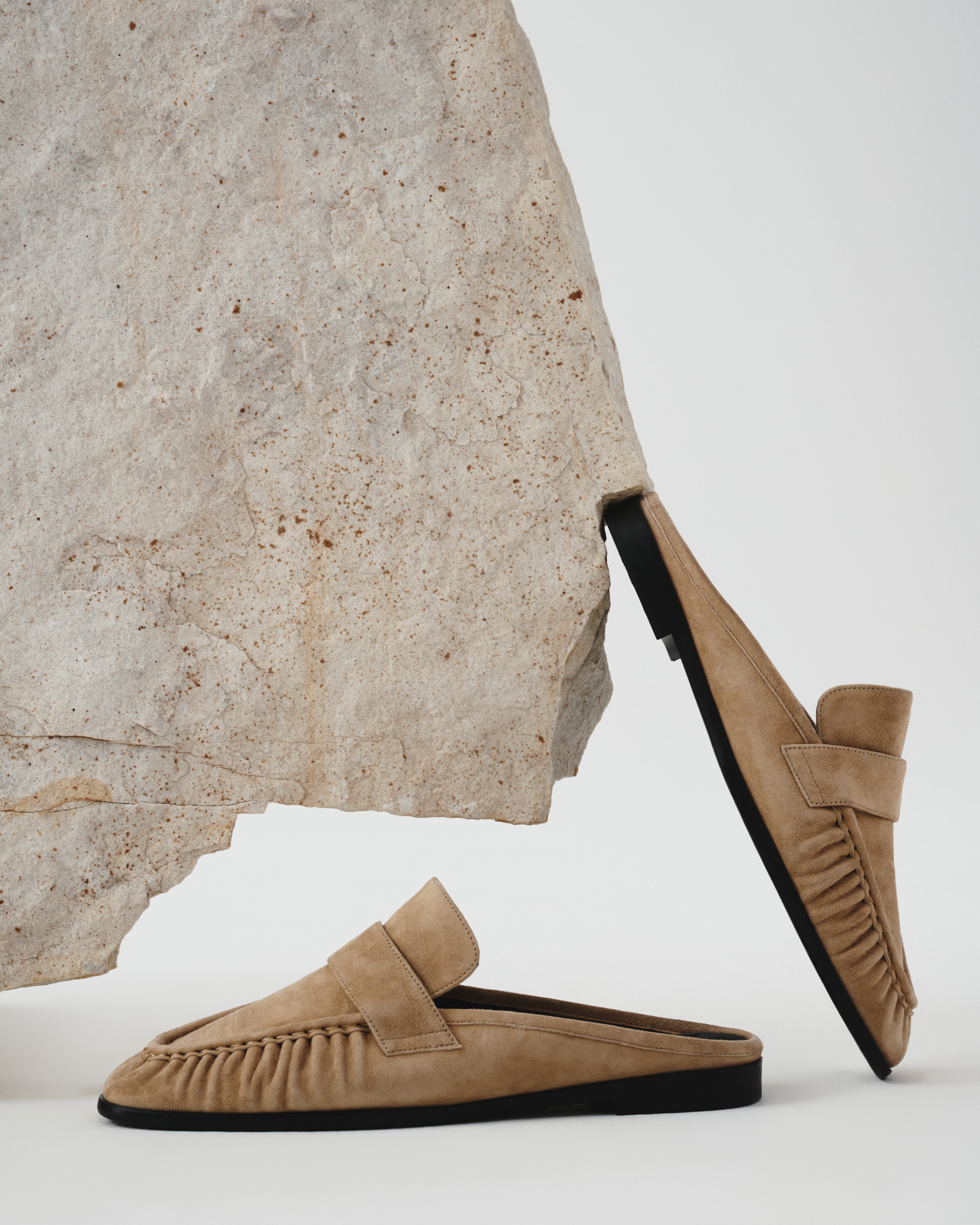 Round toe slip on loafer mule. Made with brushed kid suede.