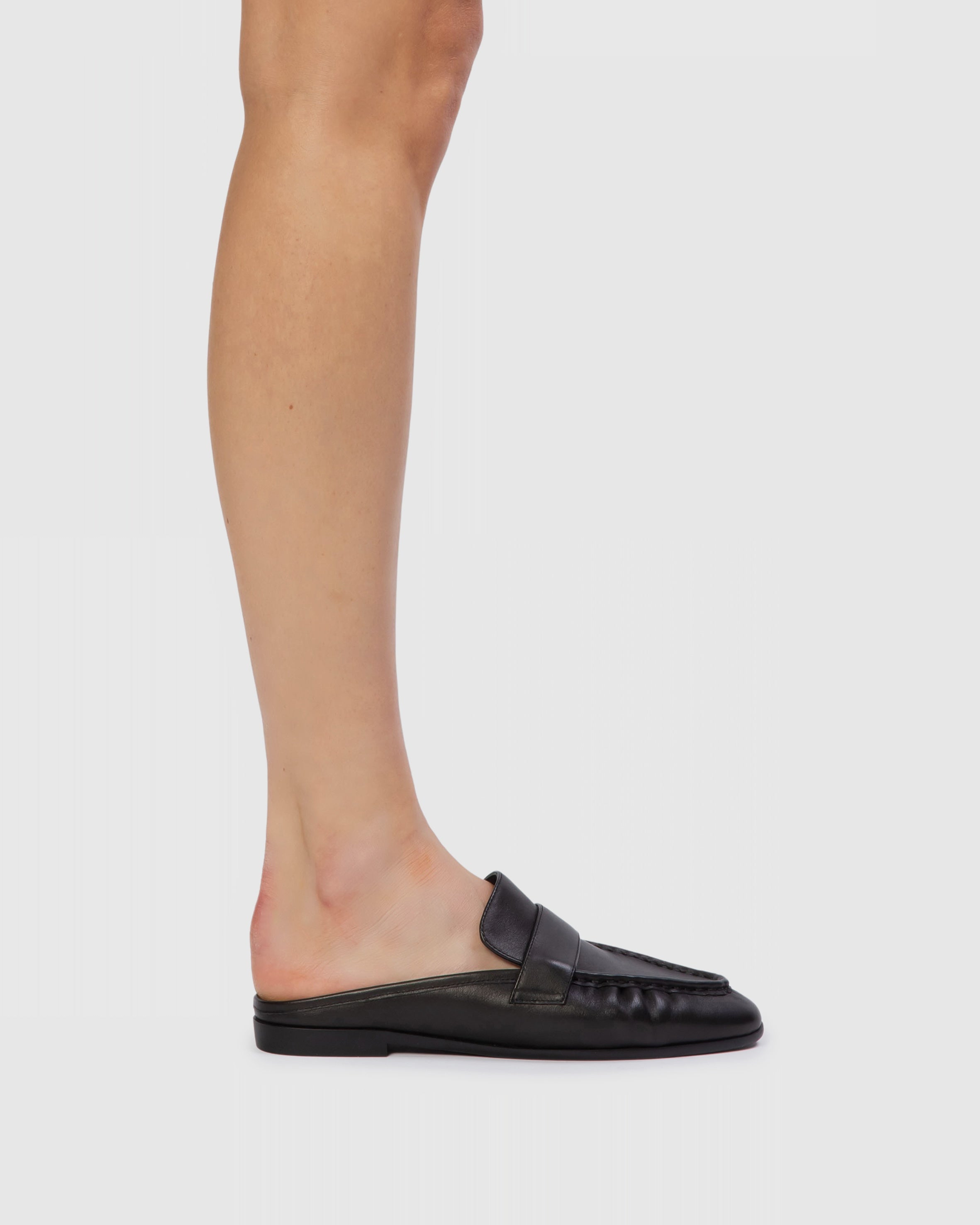 Round toe slip on loafer mule. Made with smooth buffed baby calf leather.