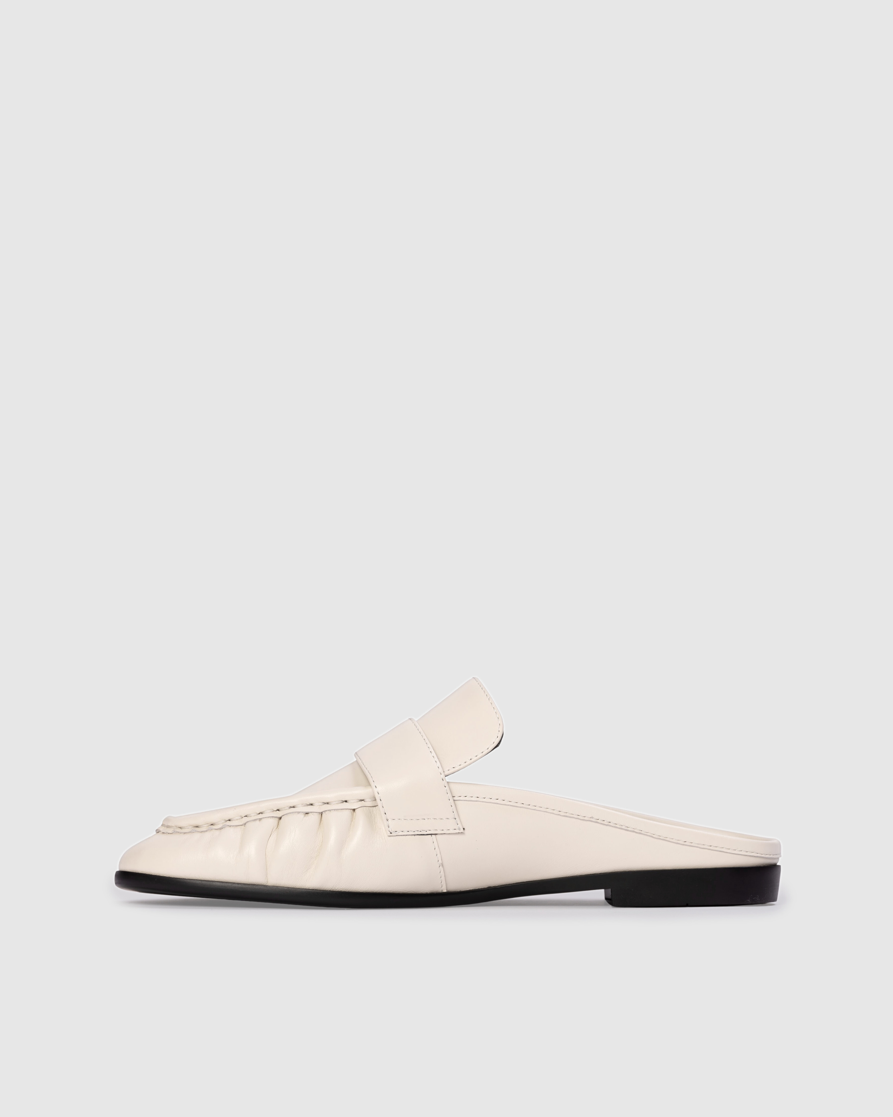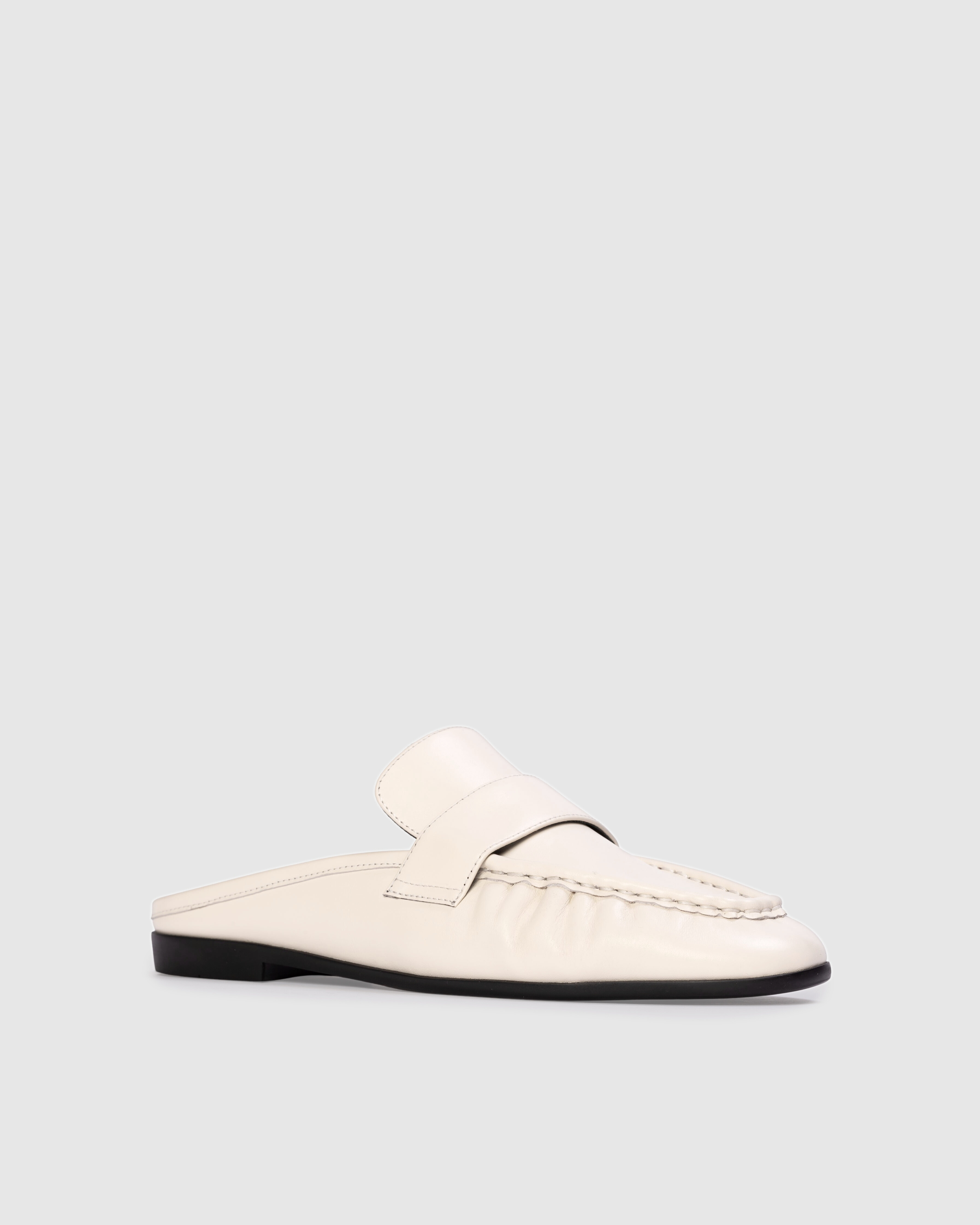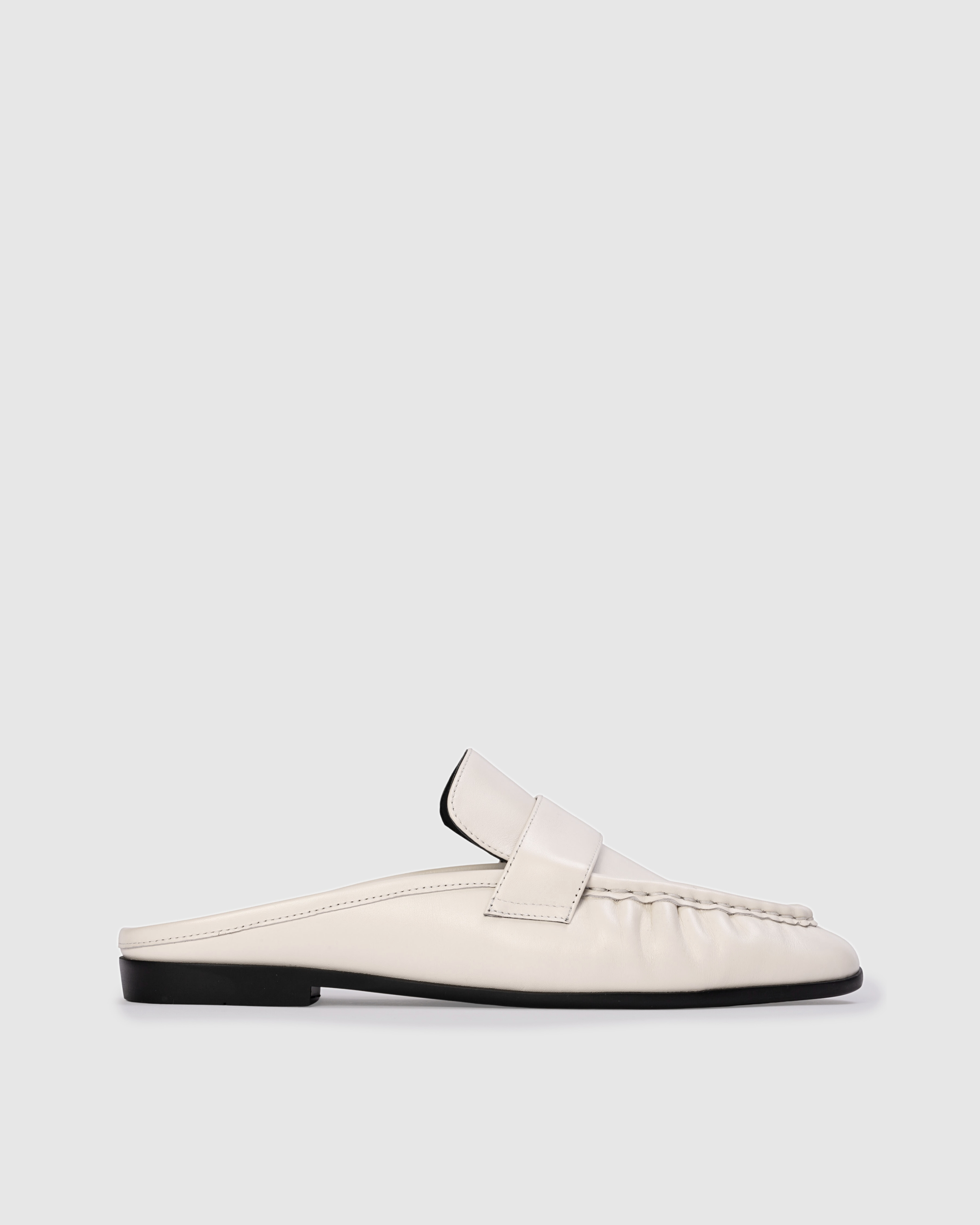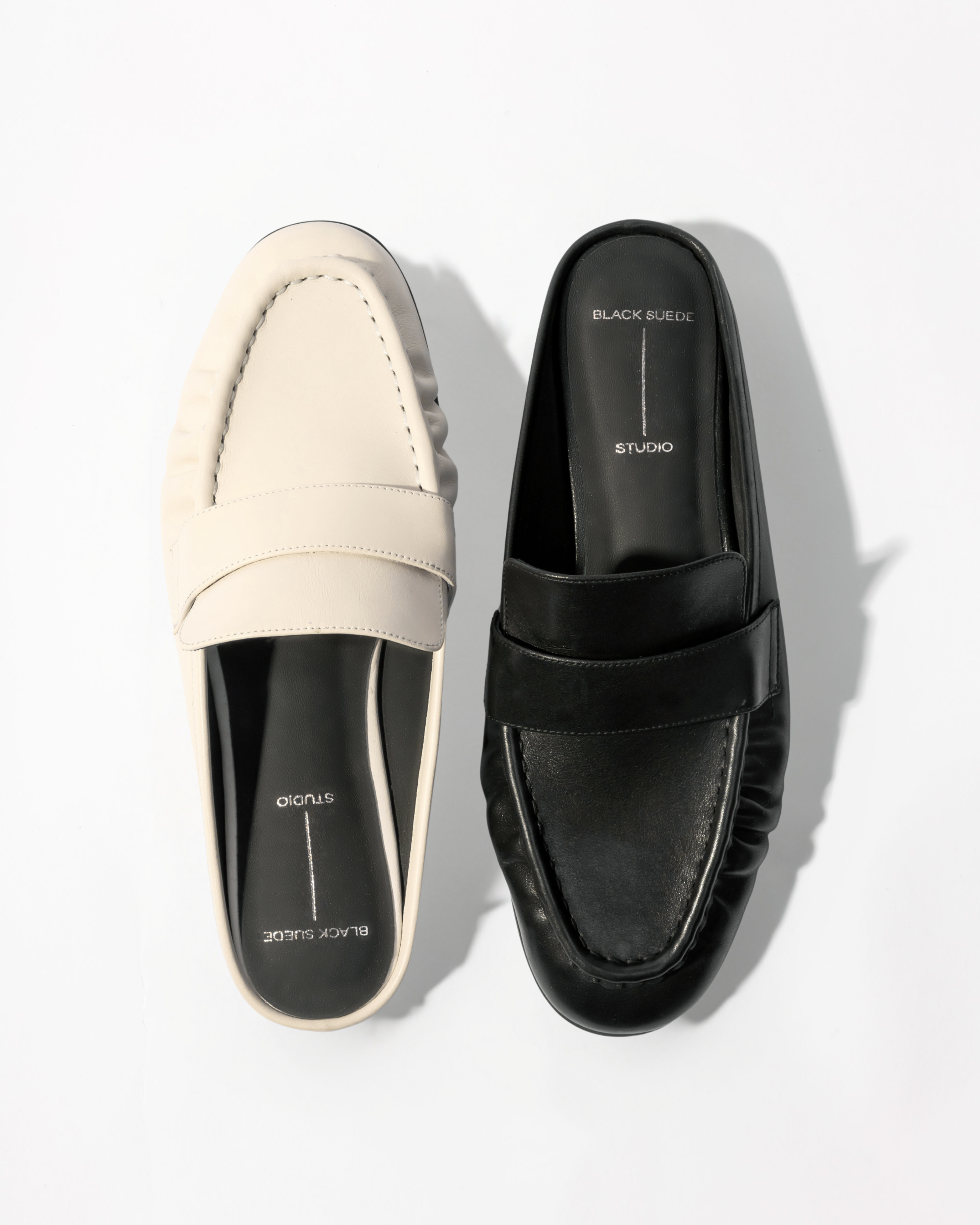 Classic round toe backless slip on loafer. Made with smooth buffed baby calf leather.