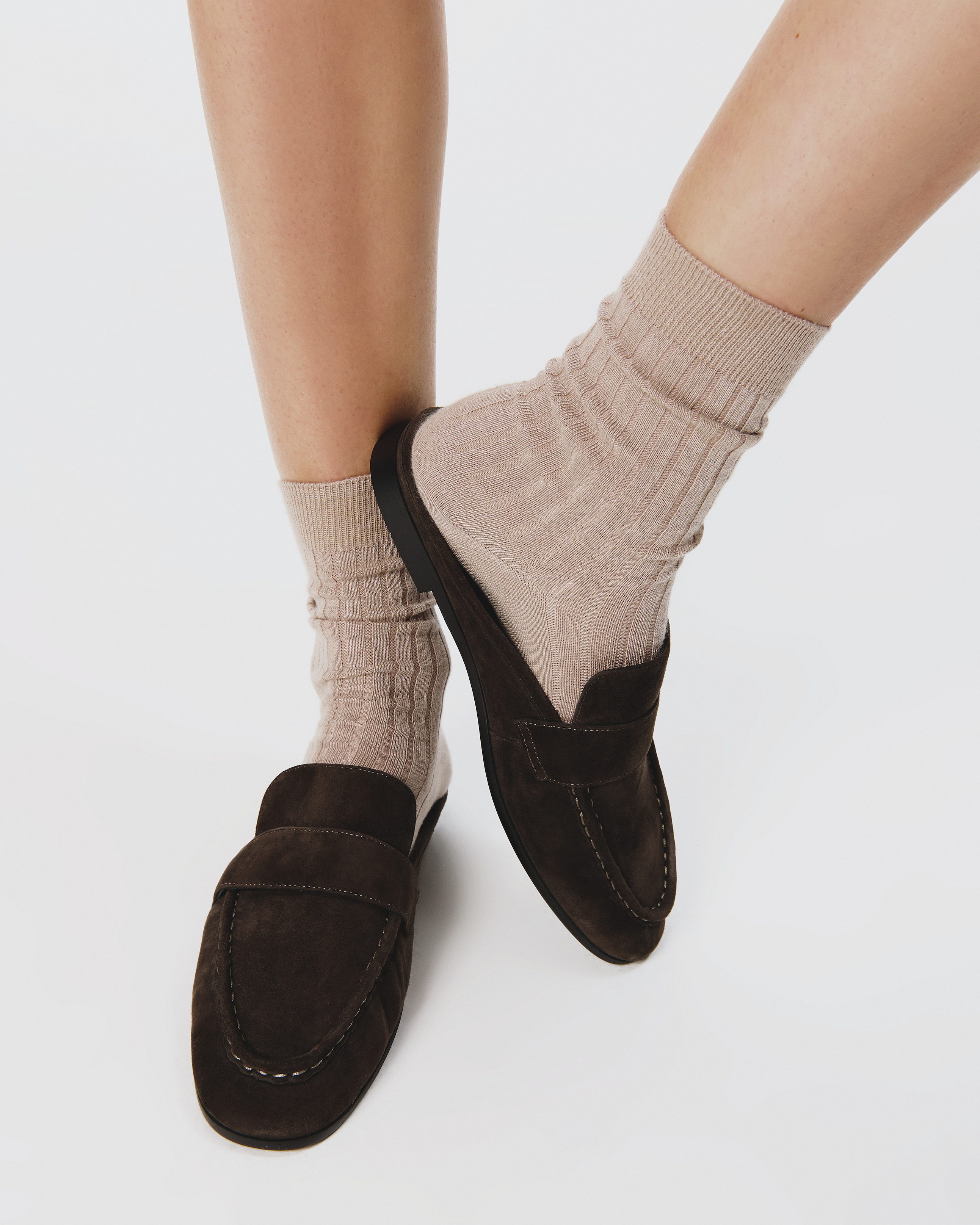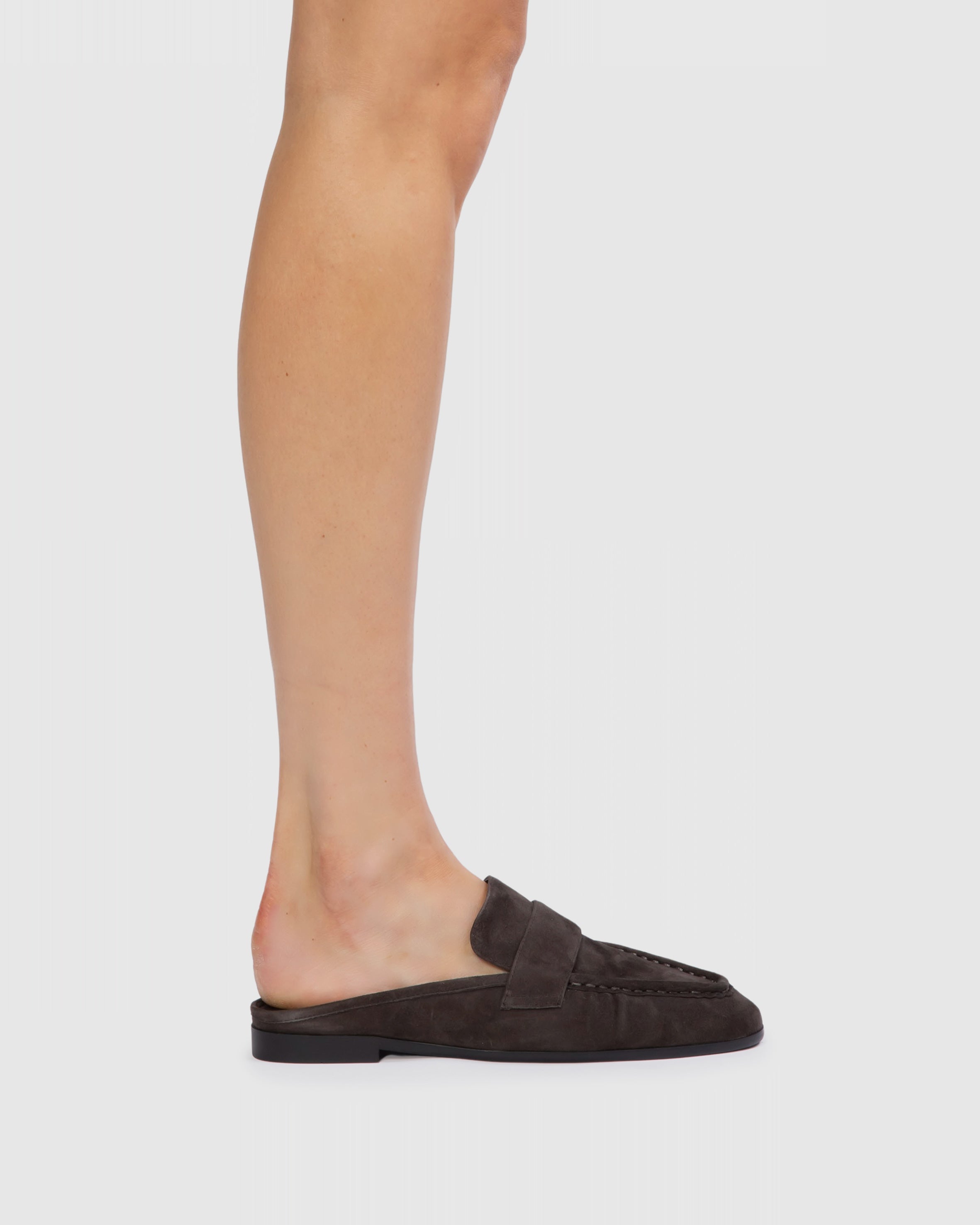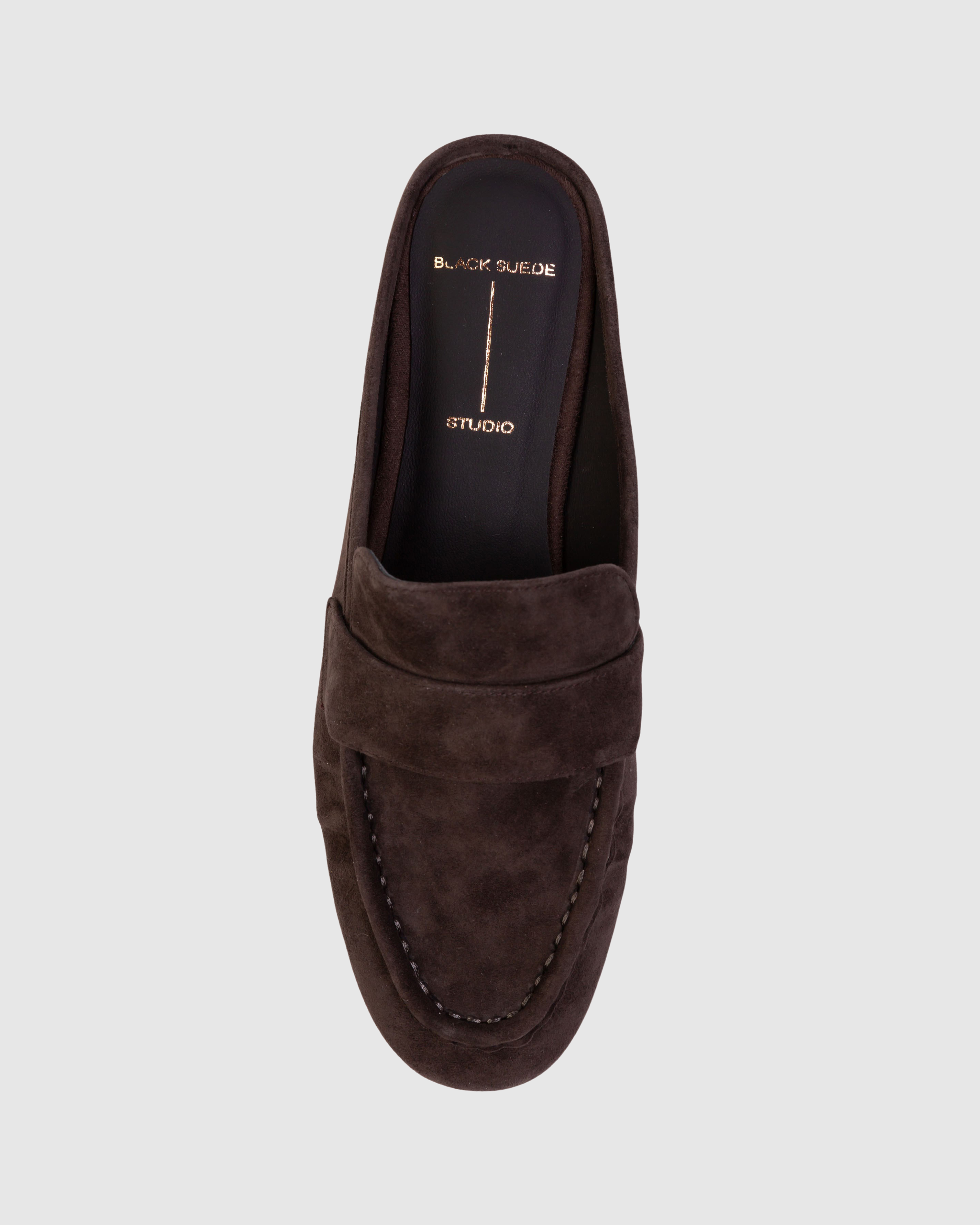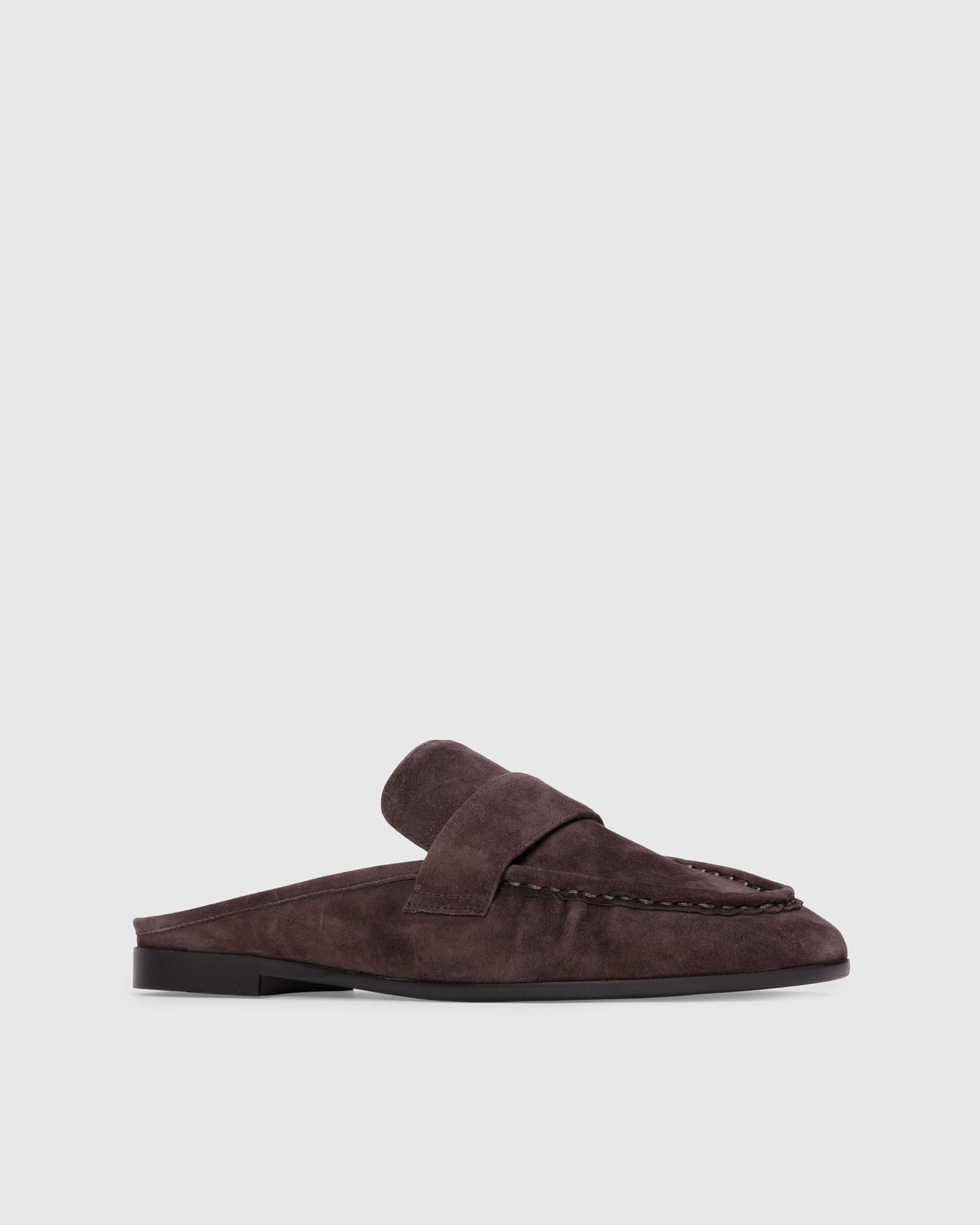 Round toe slip on loafer mule. Made with brushed kid suede.