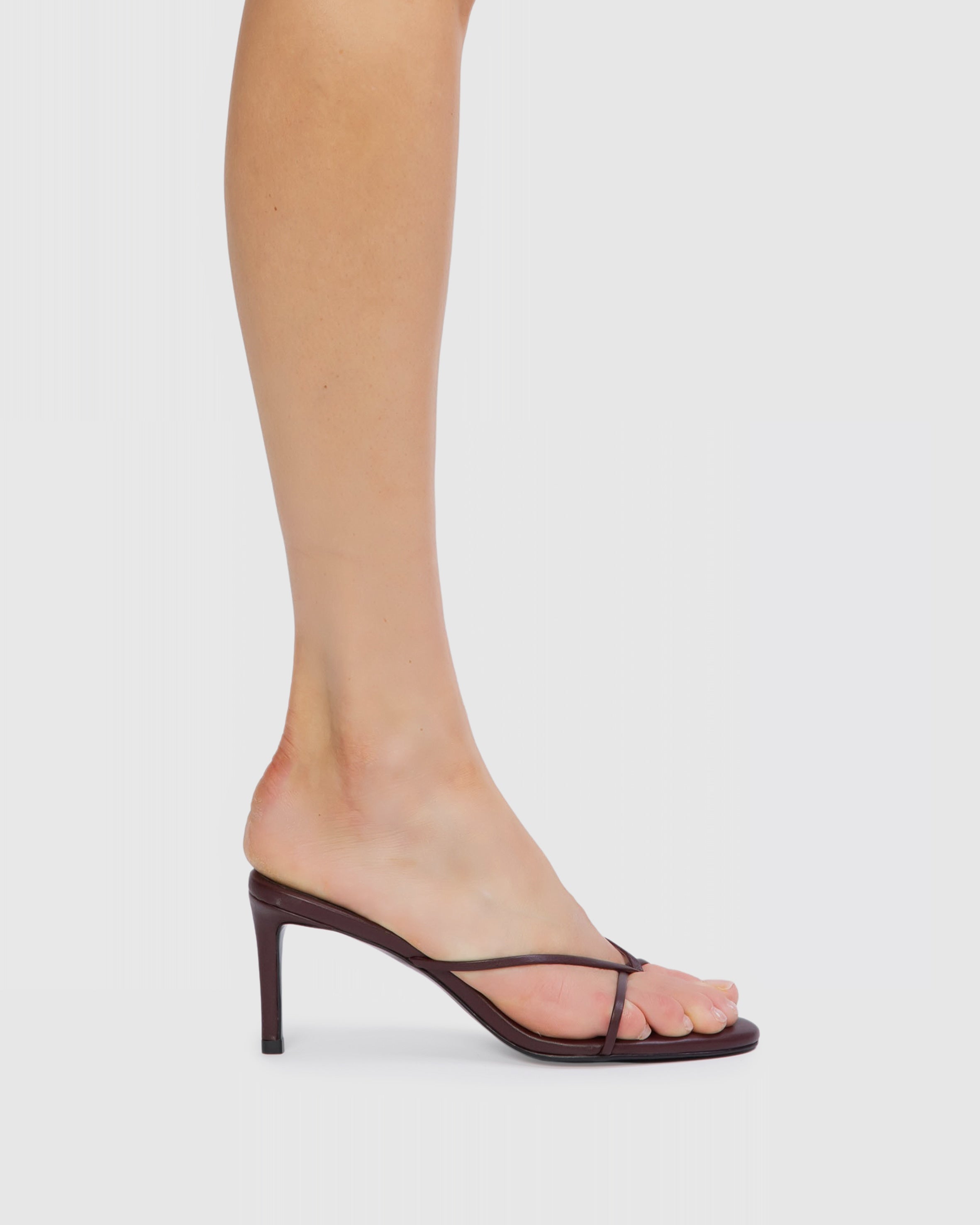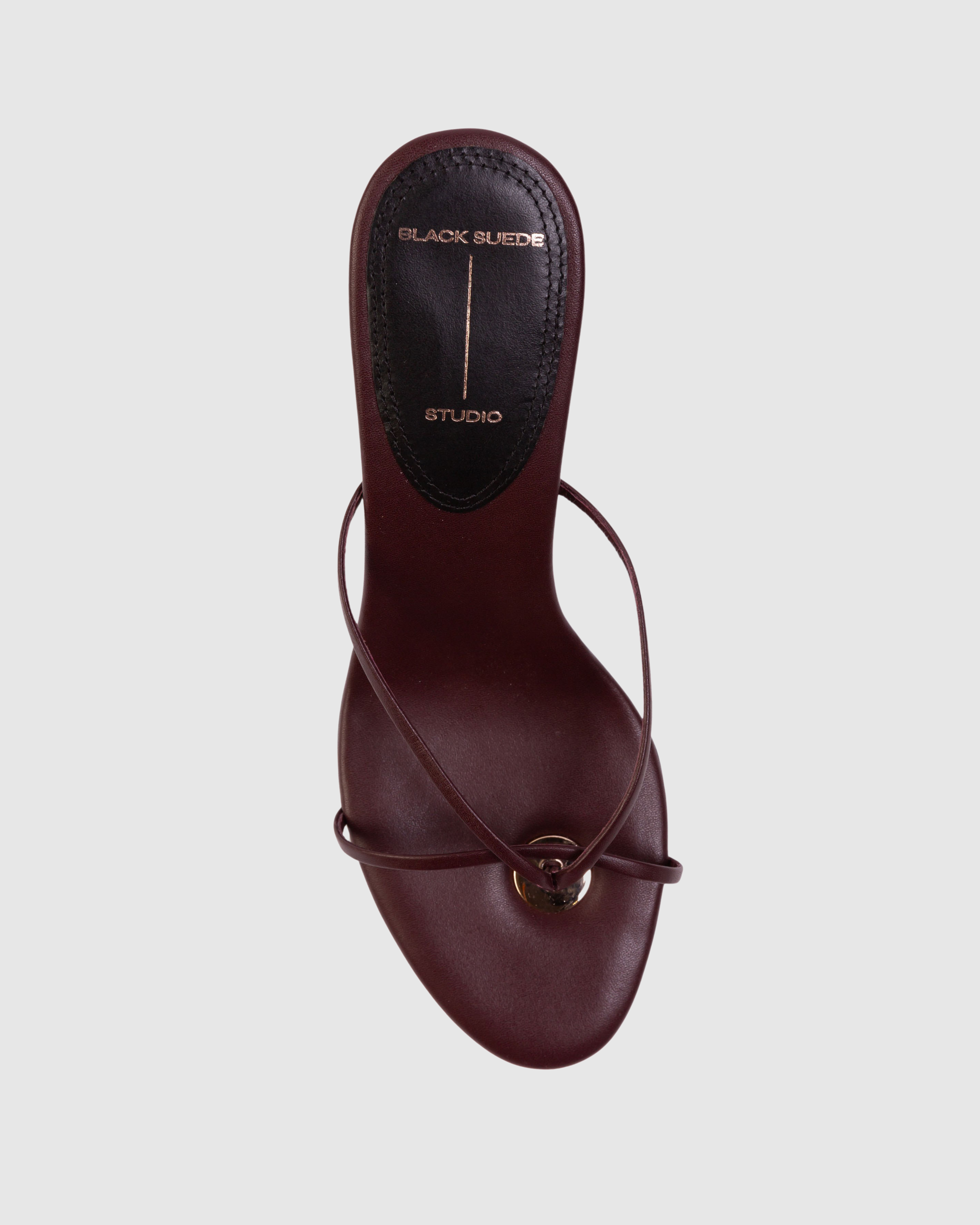 round toe thong slipper mule with a gold medallion around the toe post, set on a straight mid heel. made with smooth buffed leather.