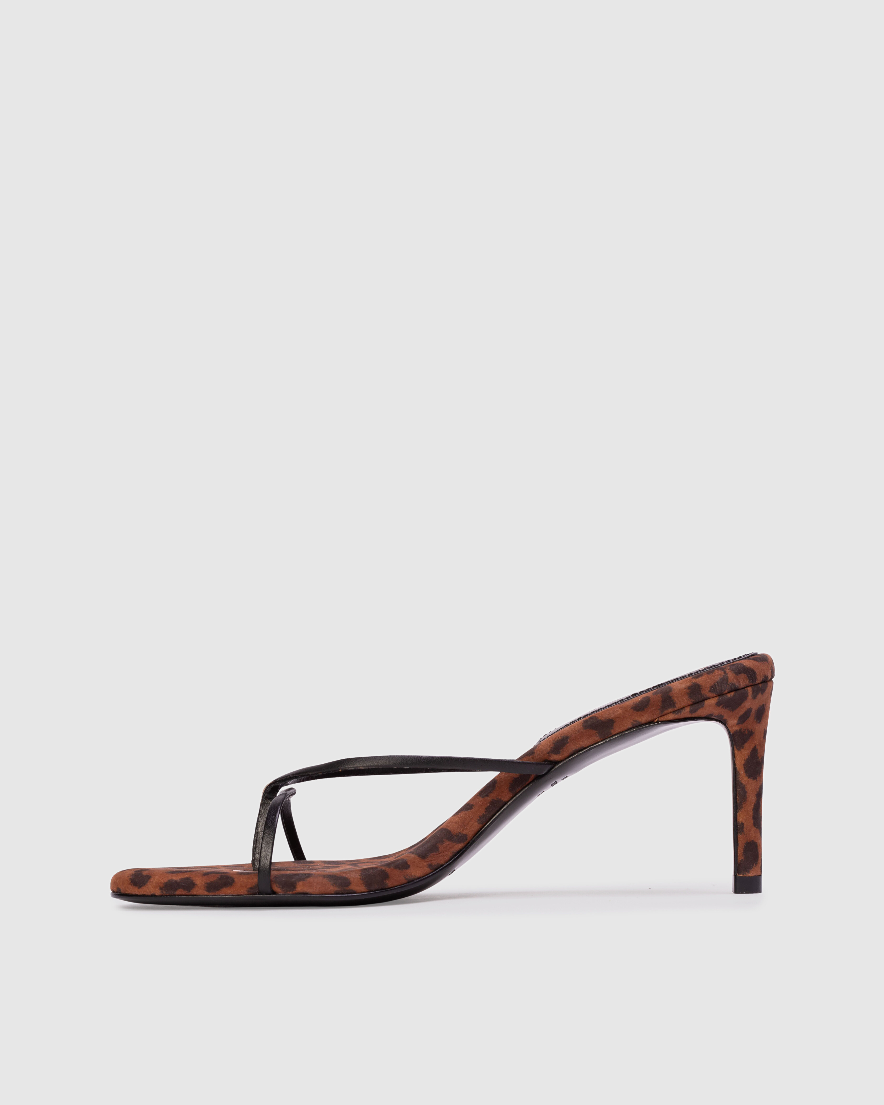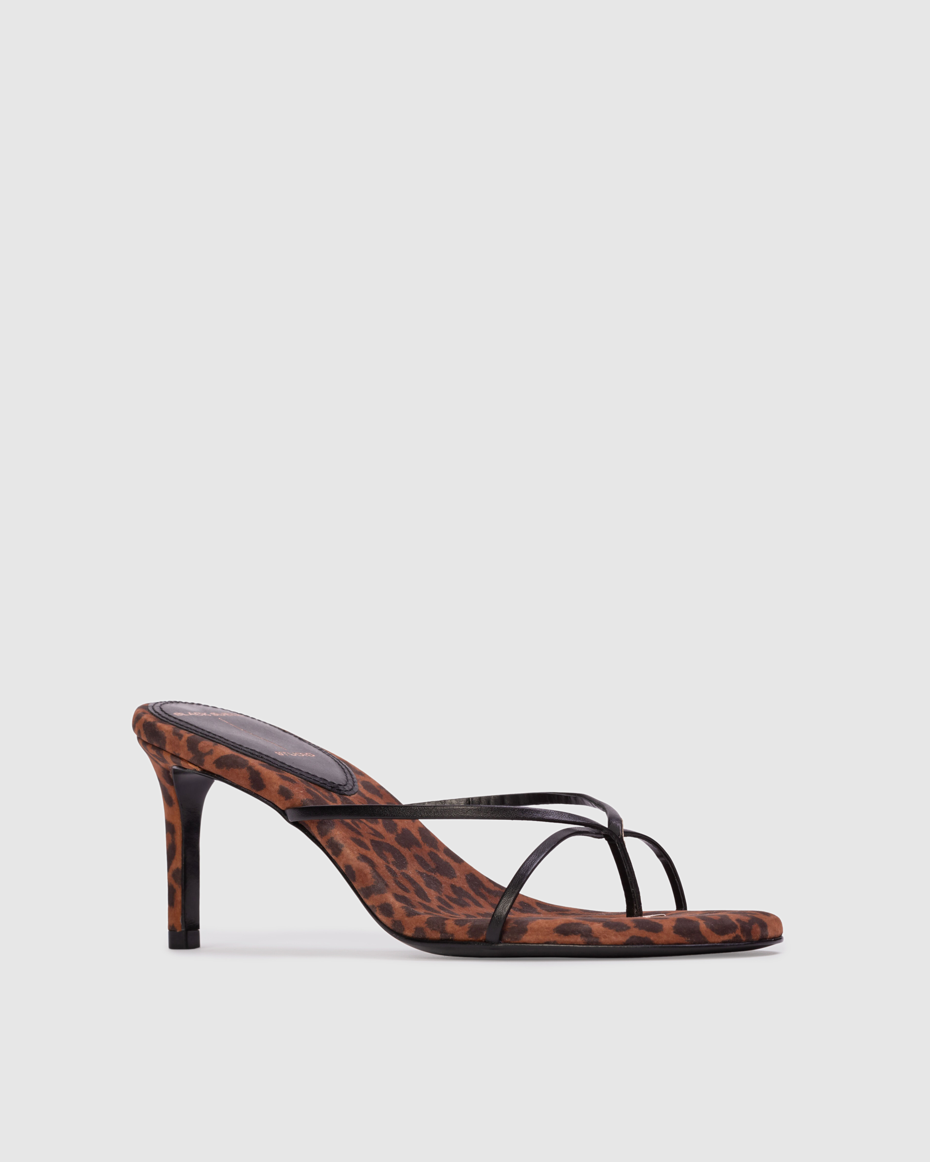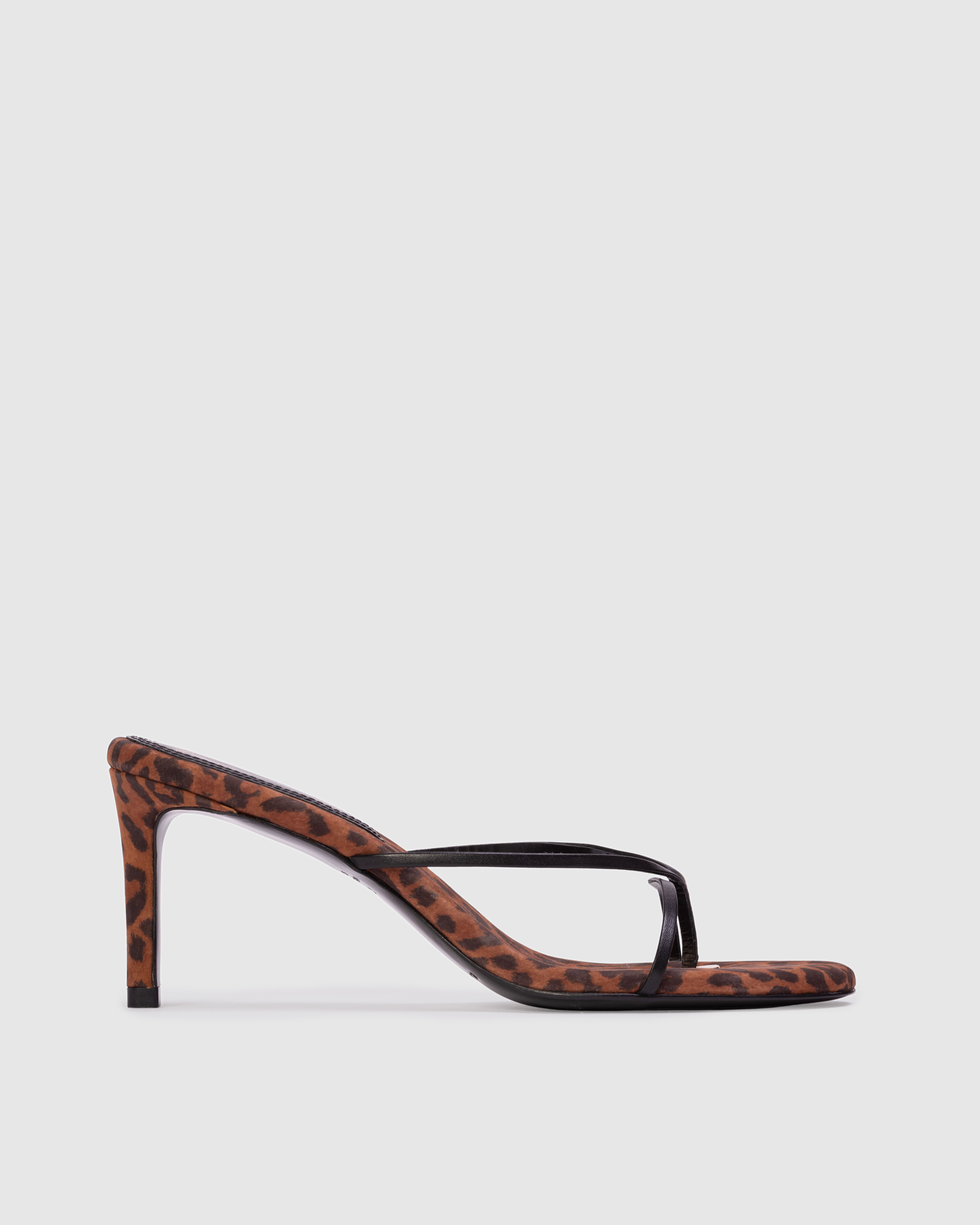 round toe thong slipper mule with a gold medallion around the toe post, set on a straight mid heel. made with nubuck and smooth buffed leather.