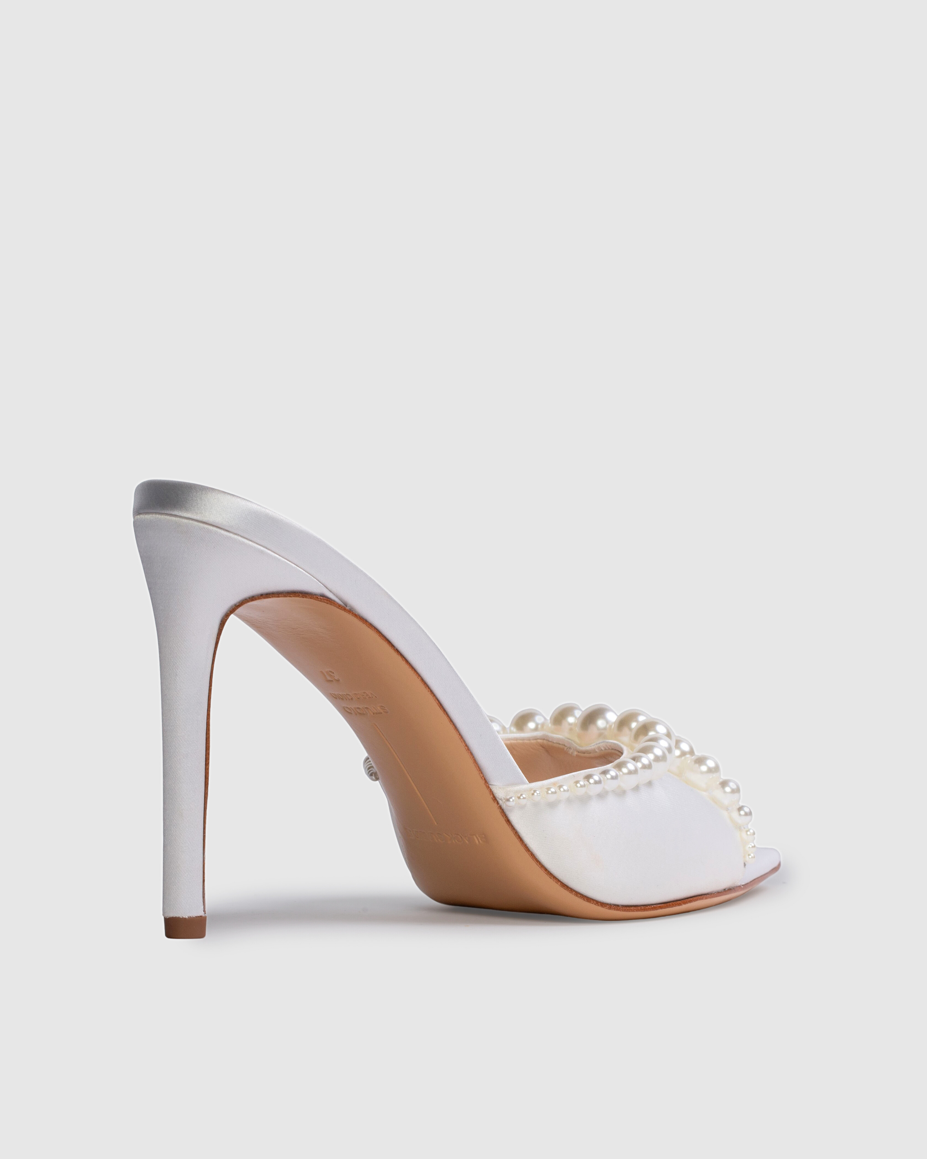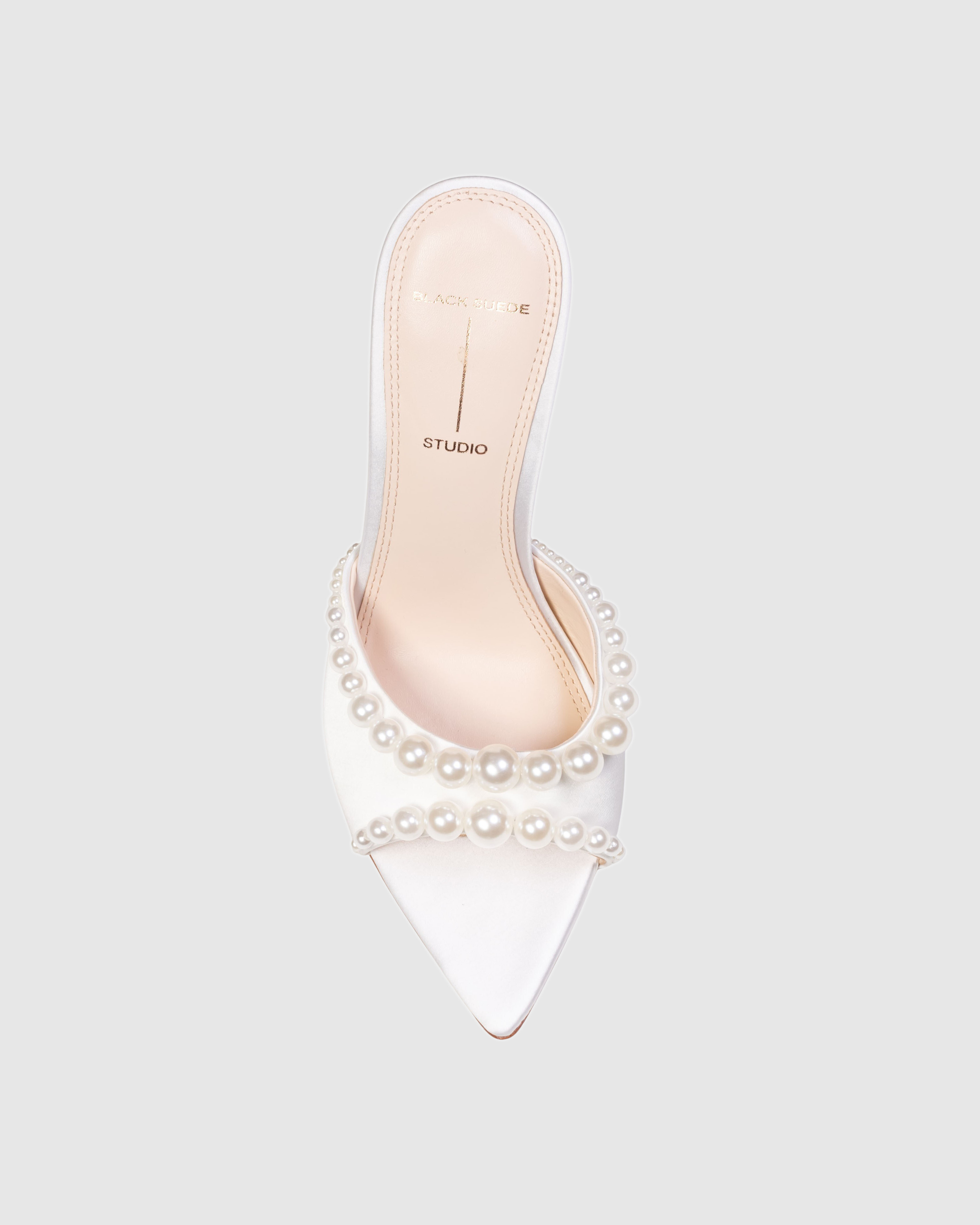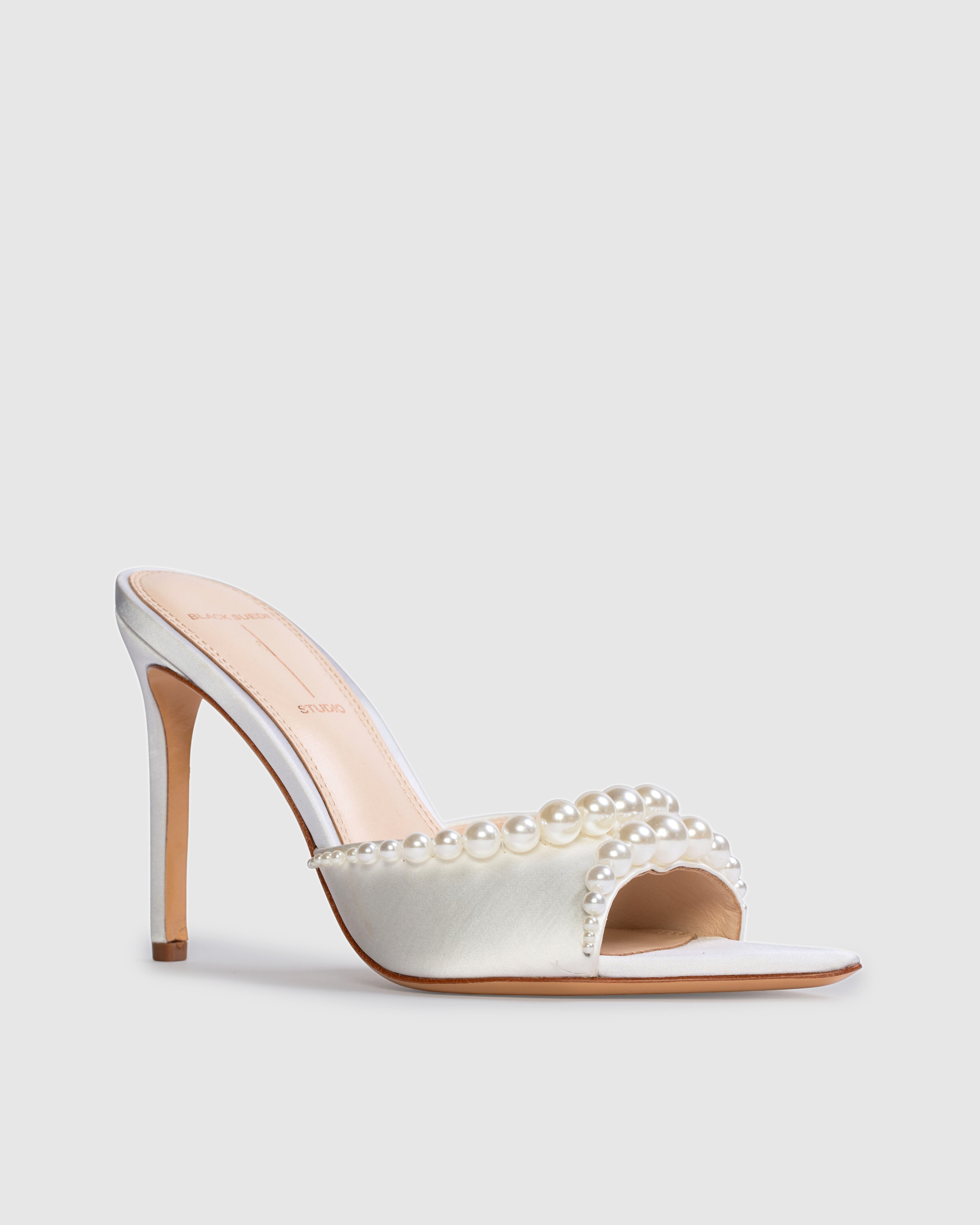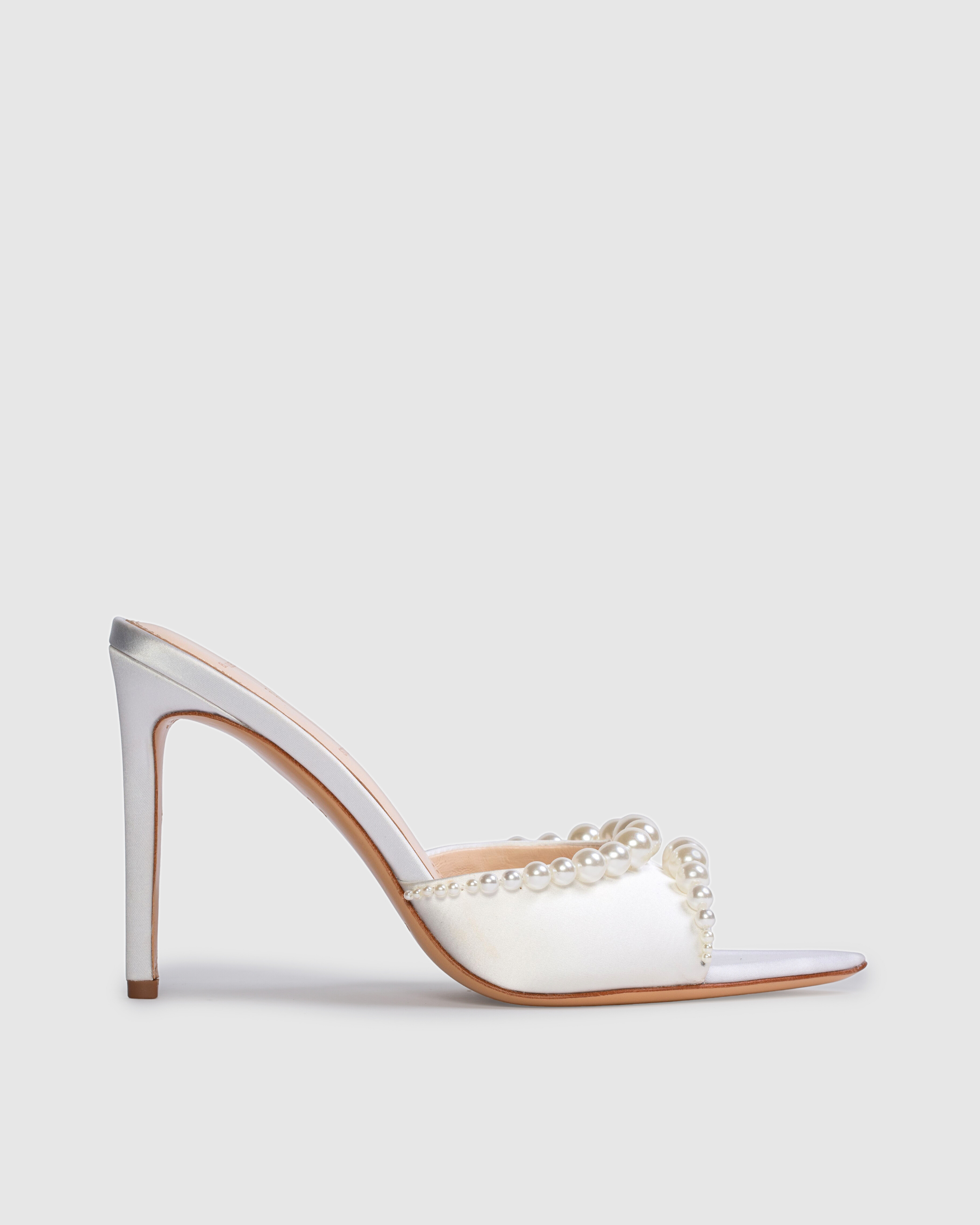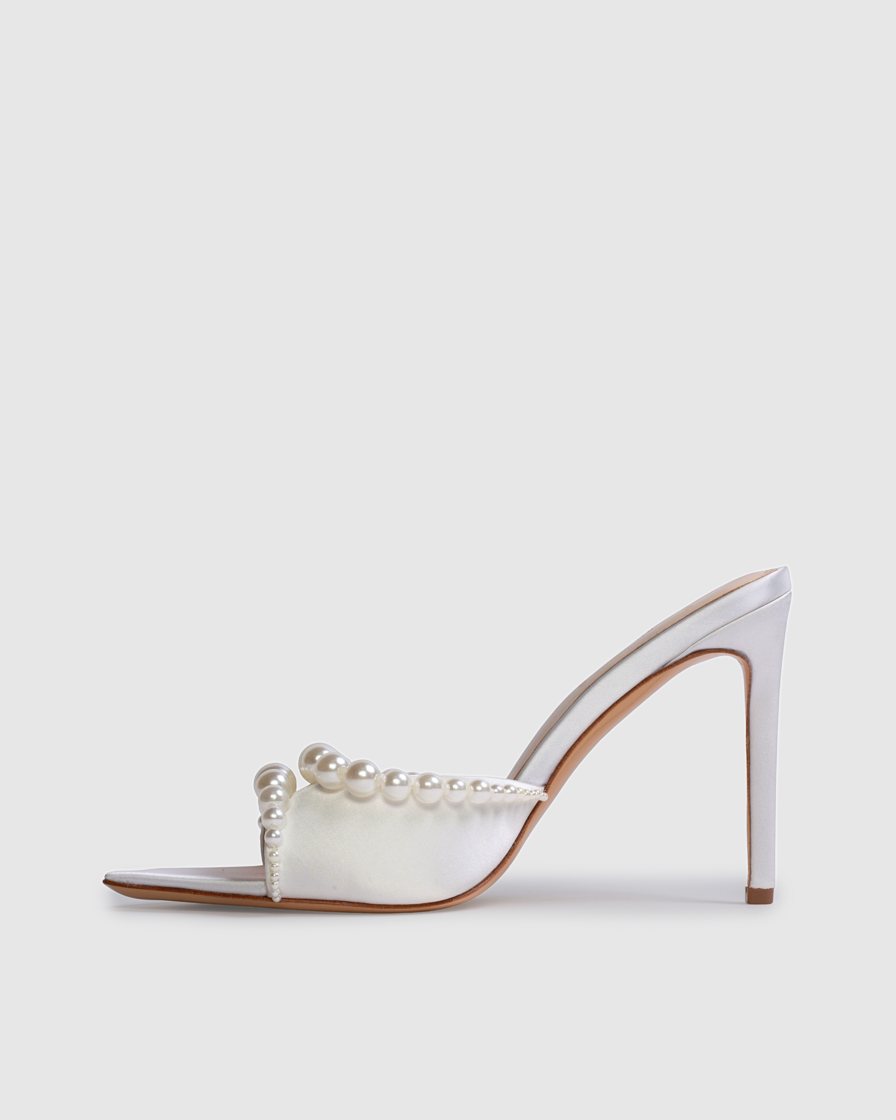 Pointy toe slipper mule with pearl detailing, set on a straight stiletto heel. Made with satin crepe.